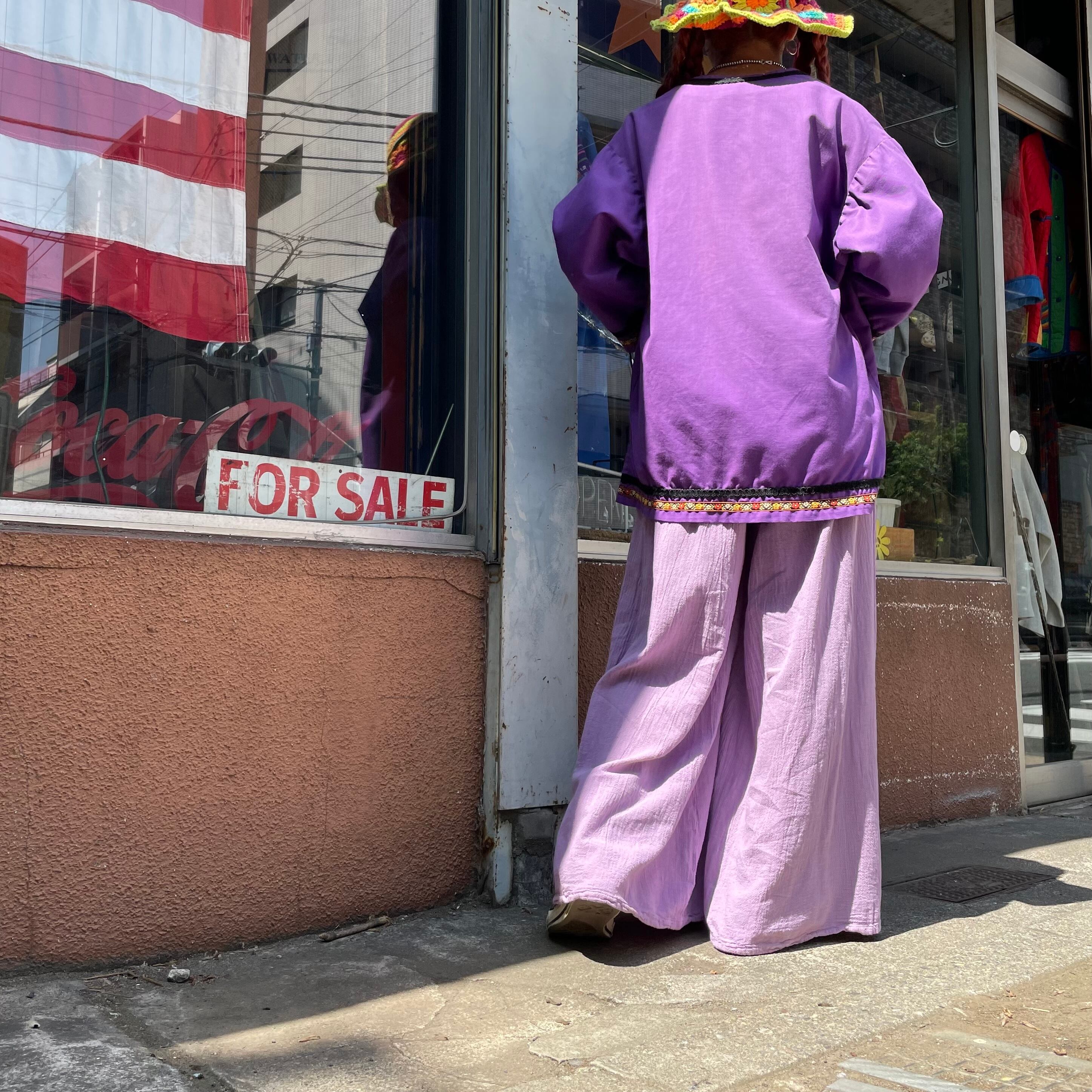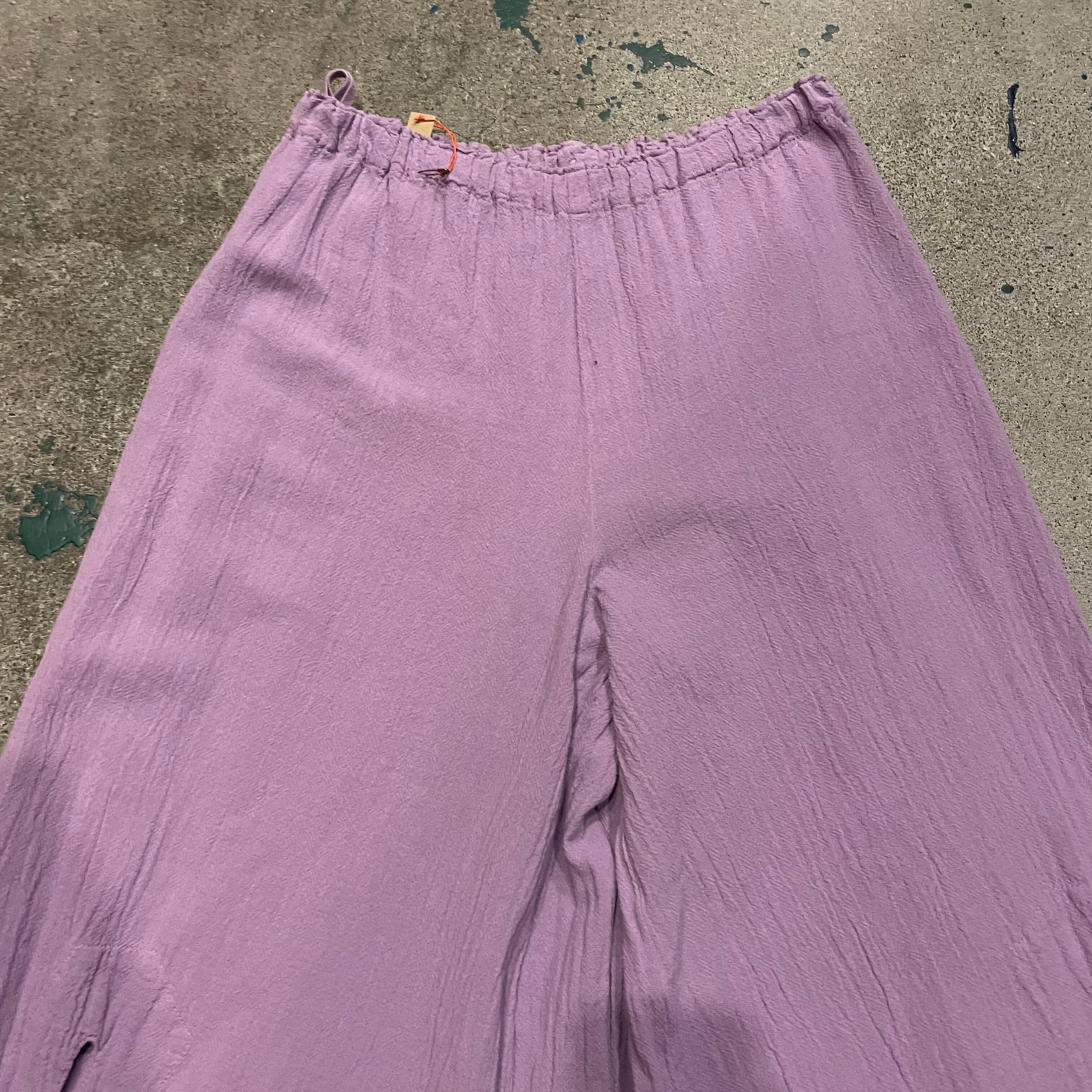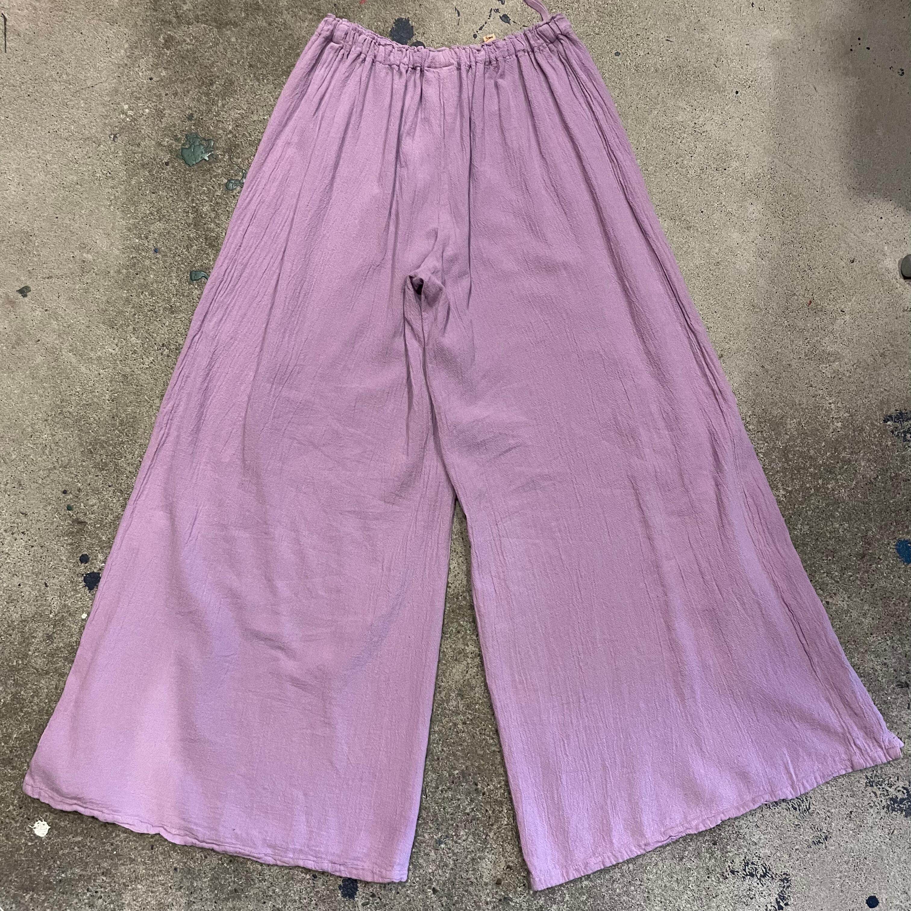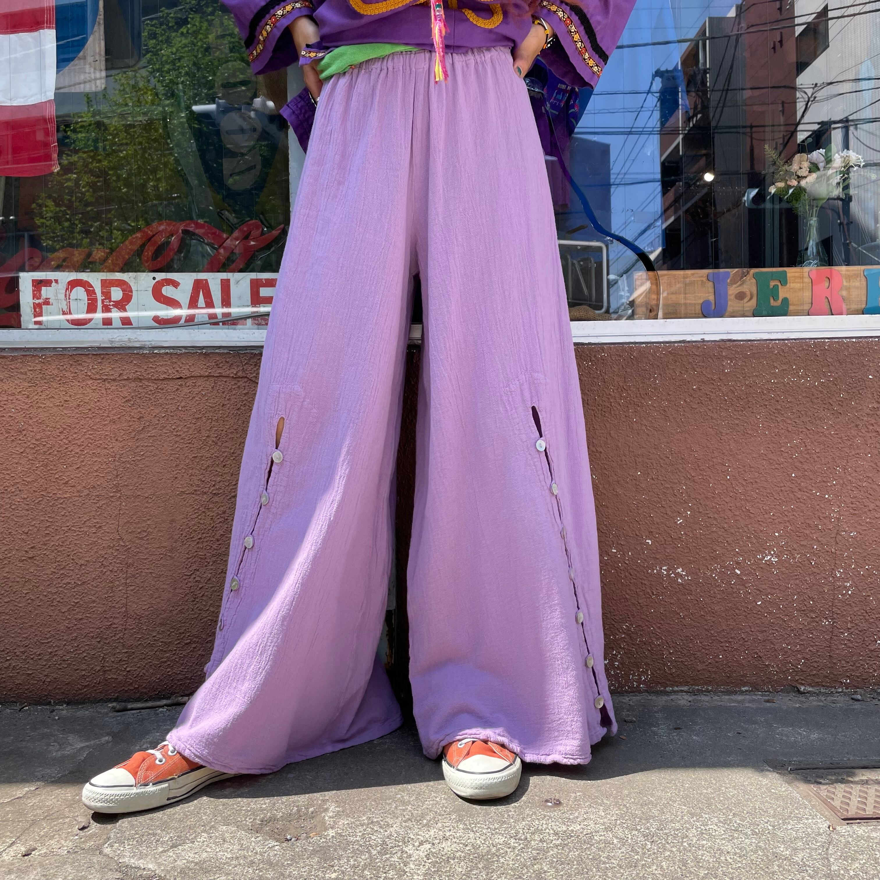 ラベンダーカラーがかわいい、コットンガーゼのワイドパンツです。スカート並みのフレアのボリューム感が存在感があって素敵です。