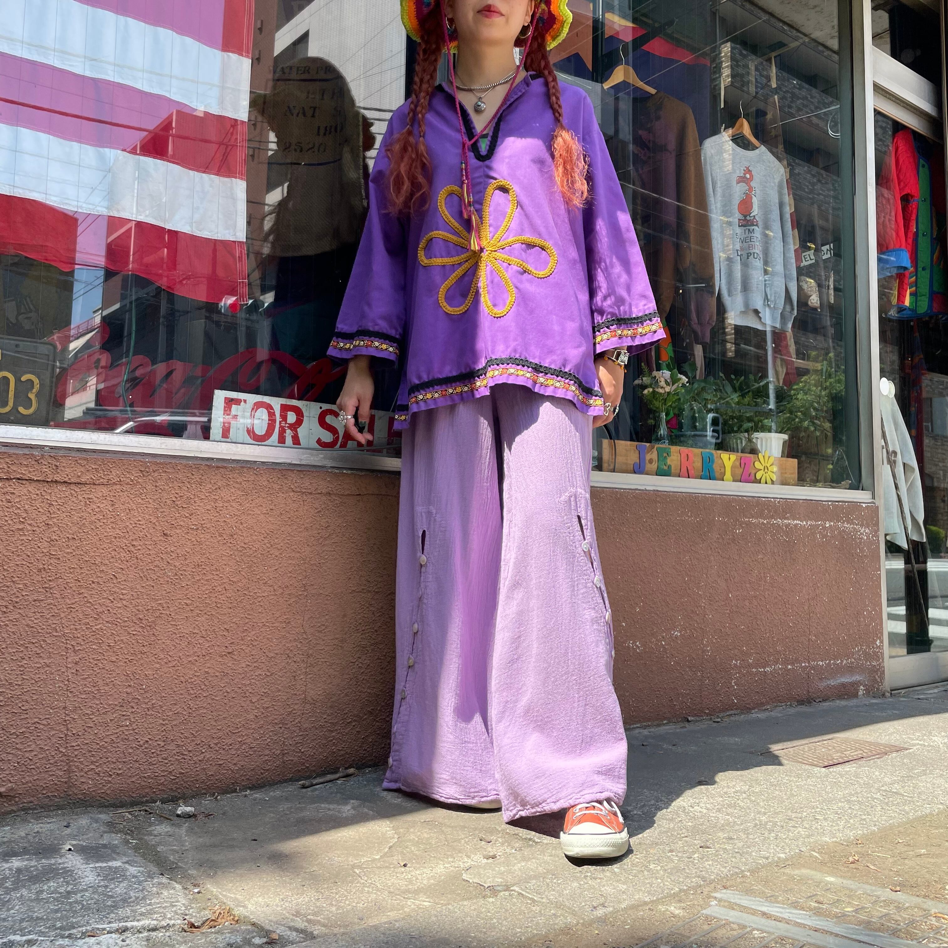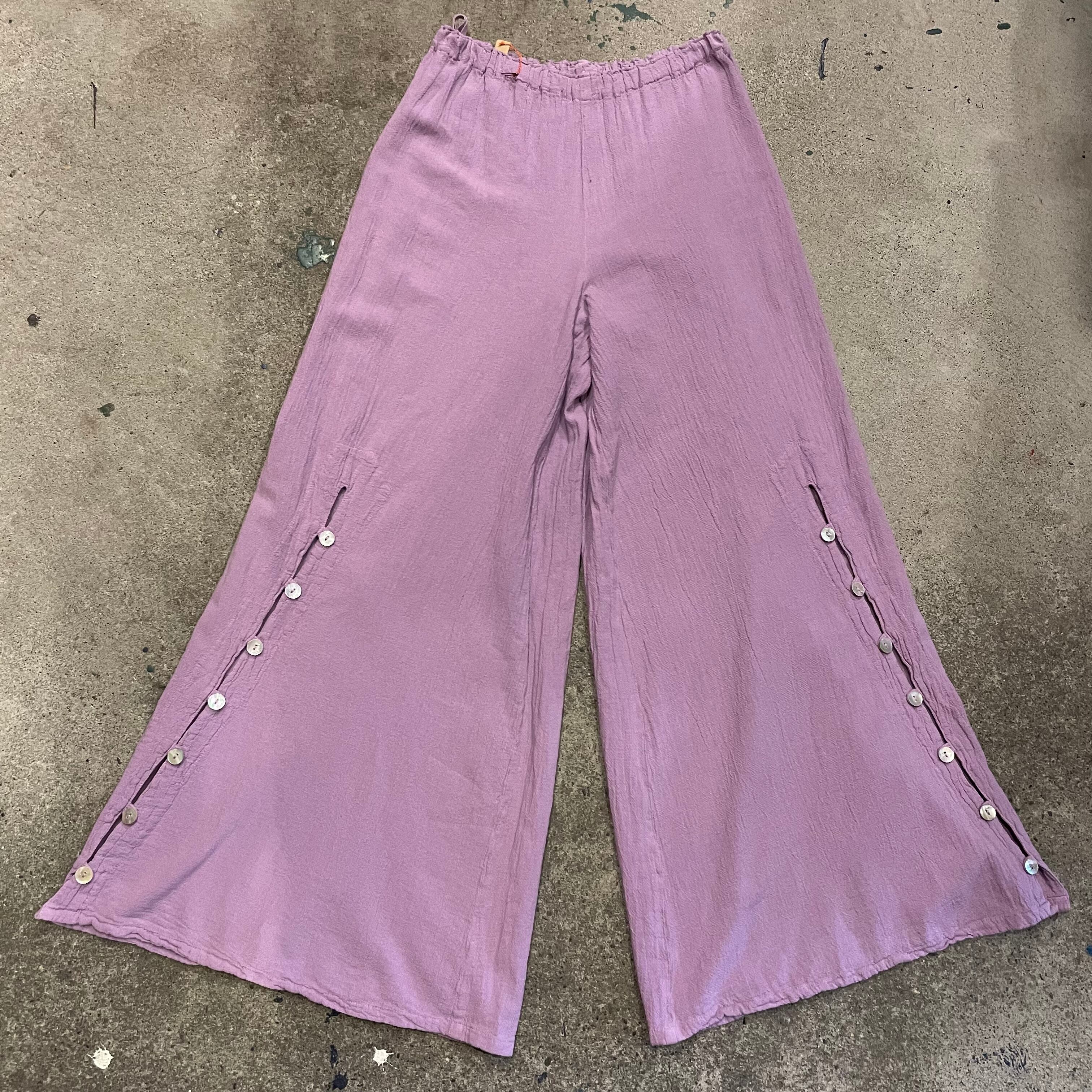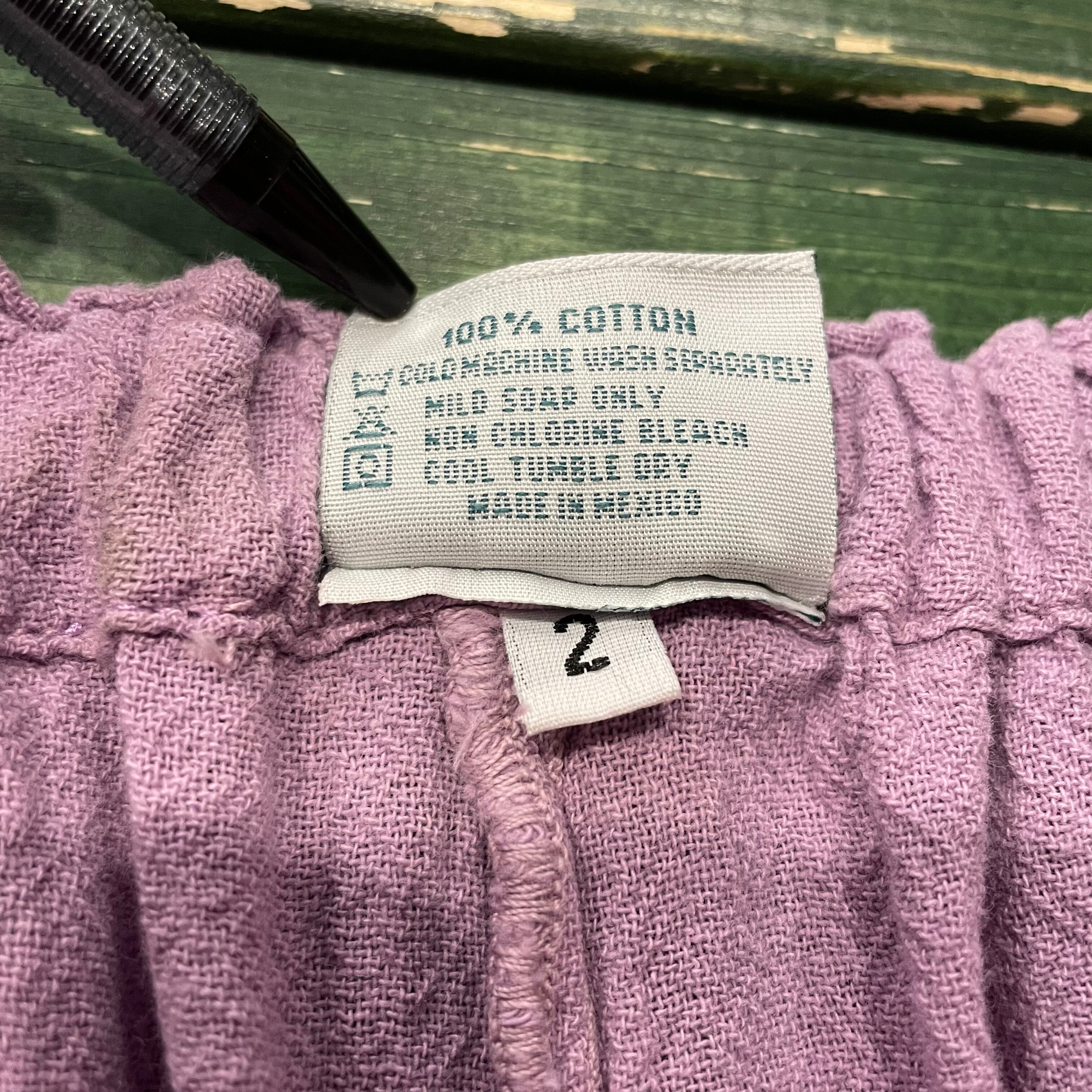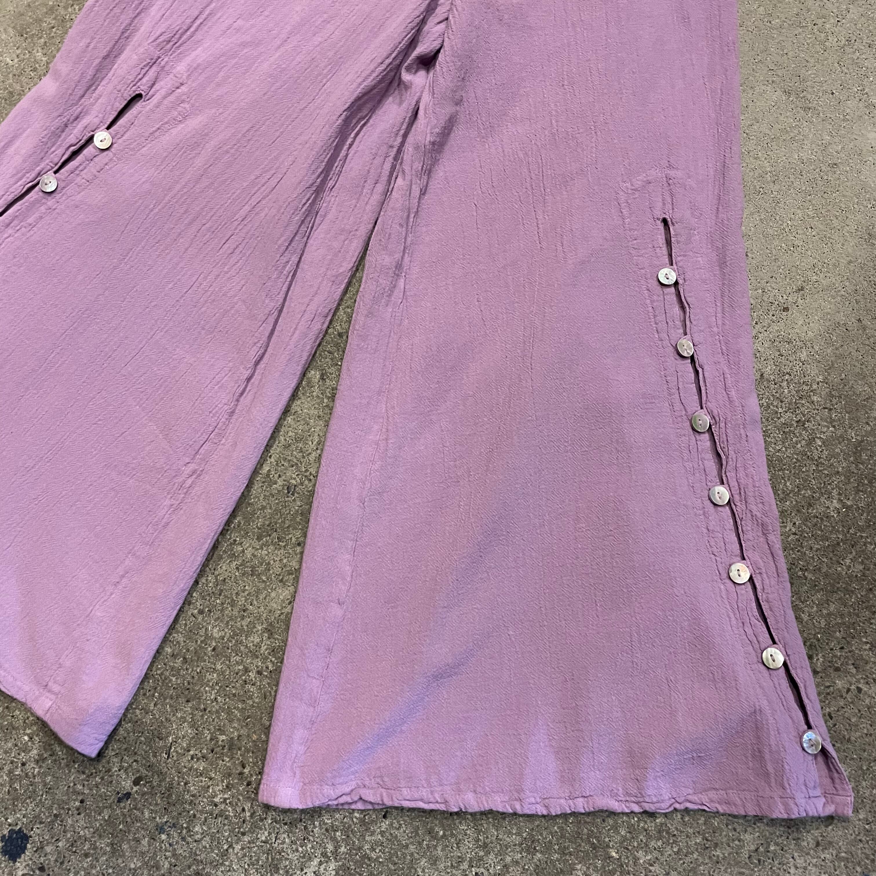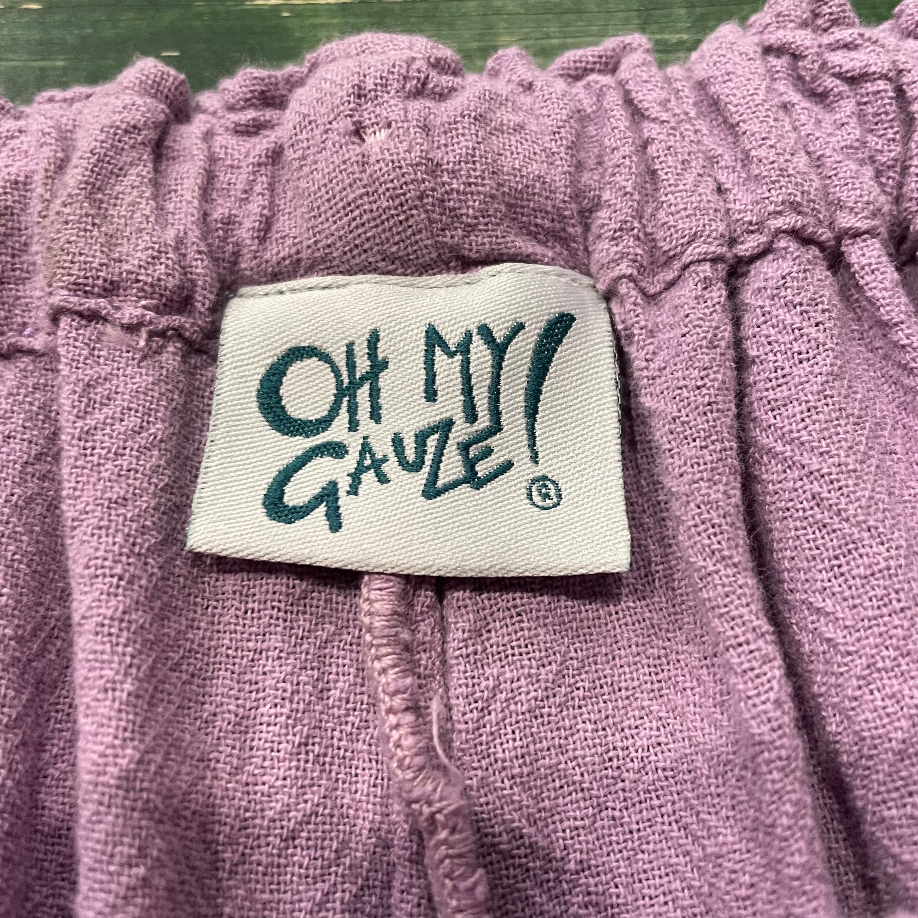 ラベンダーカラーがかわいい、コットンガーゼのワイドパンツです。スカート並みのフレアのボリューム感が存在感があって素敵です。
