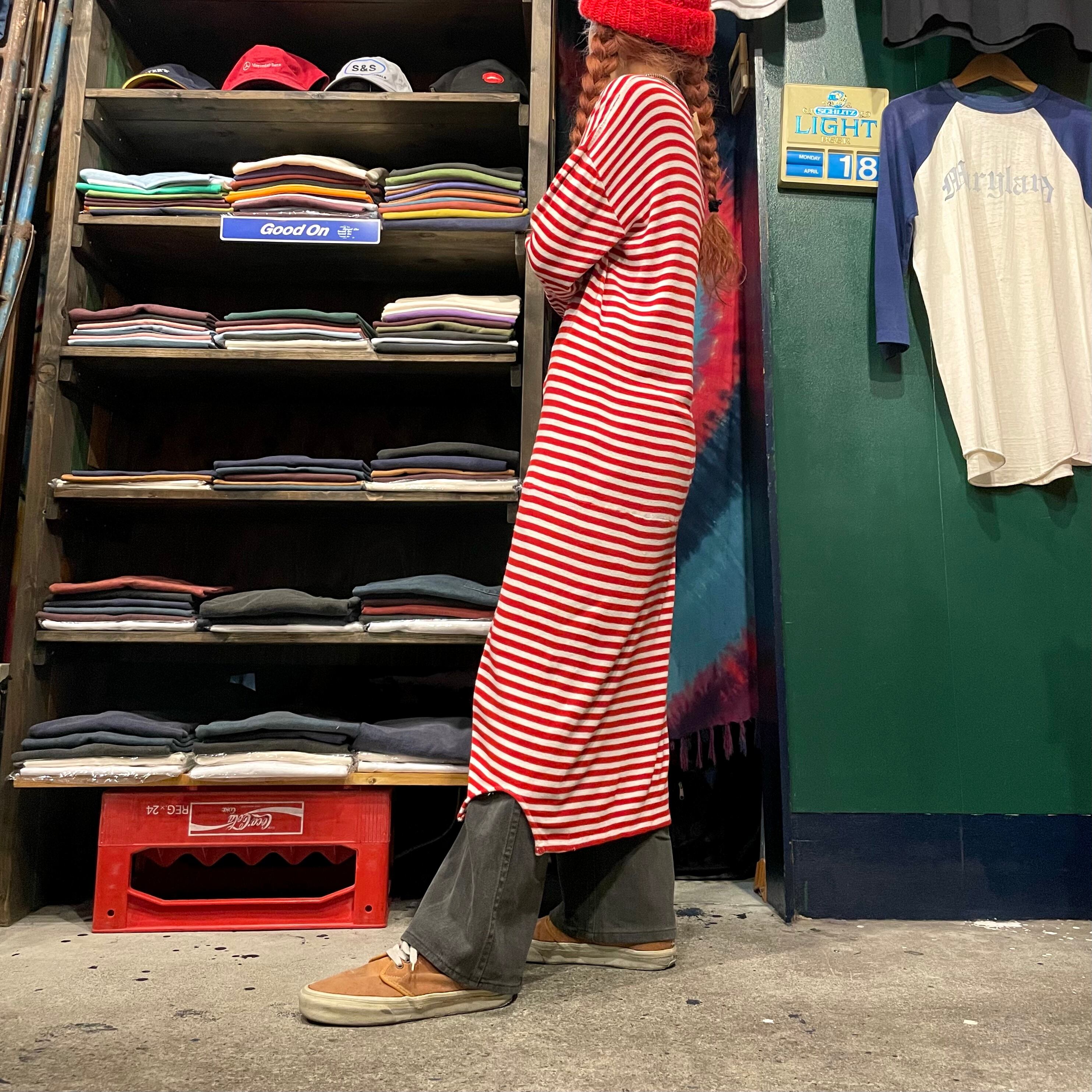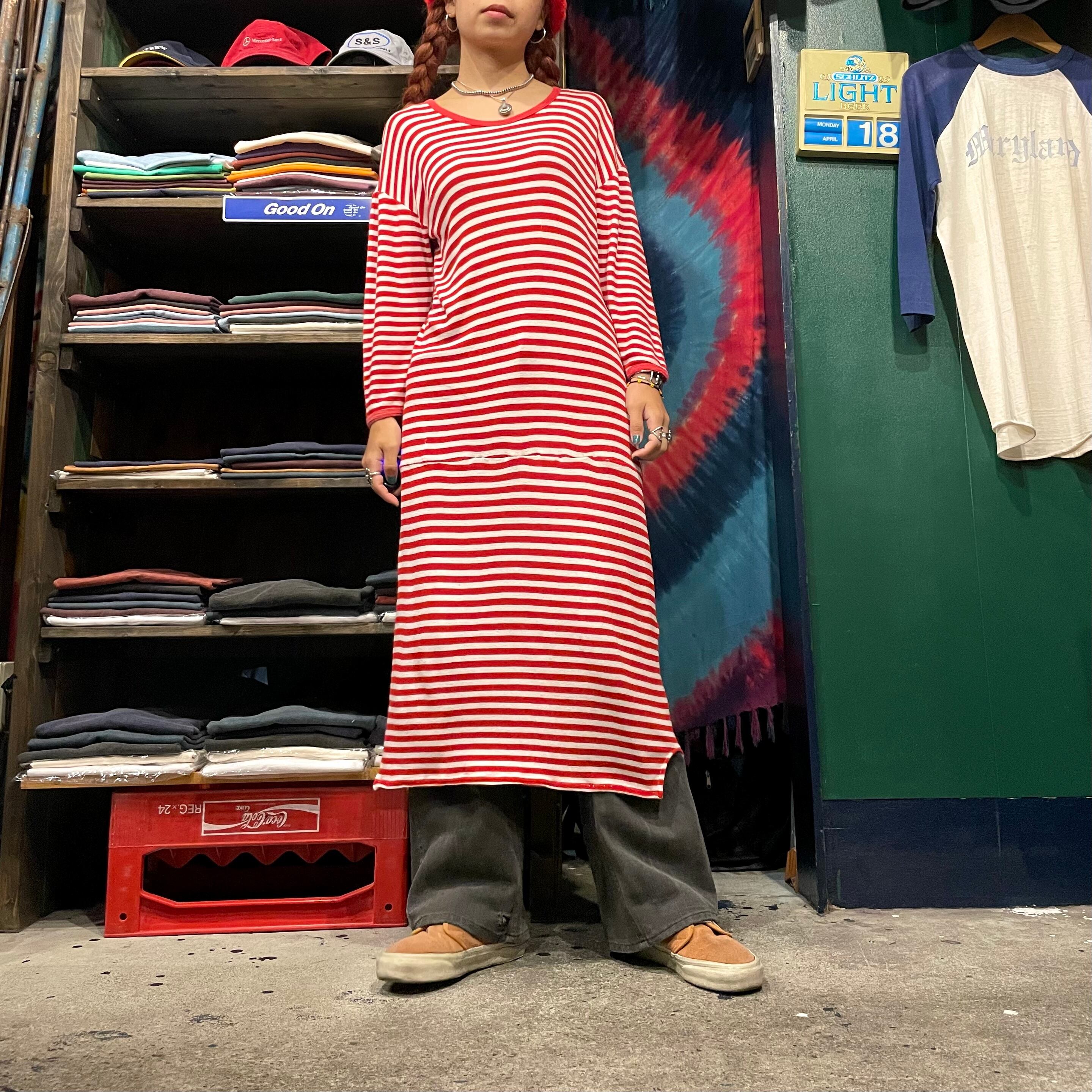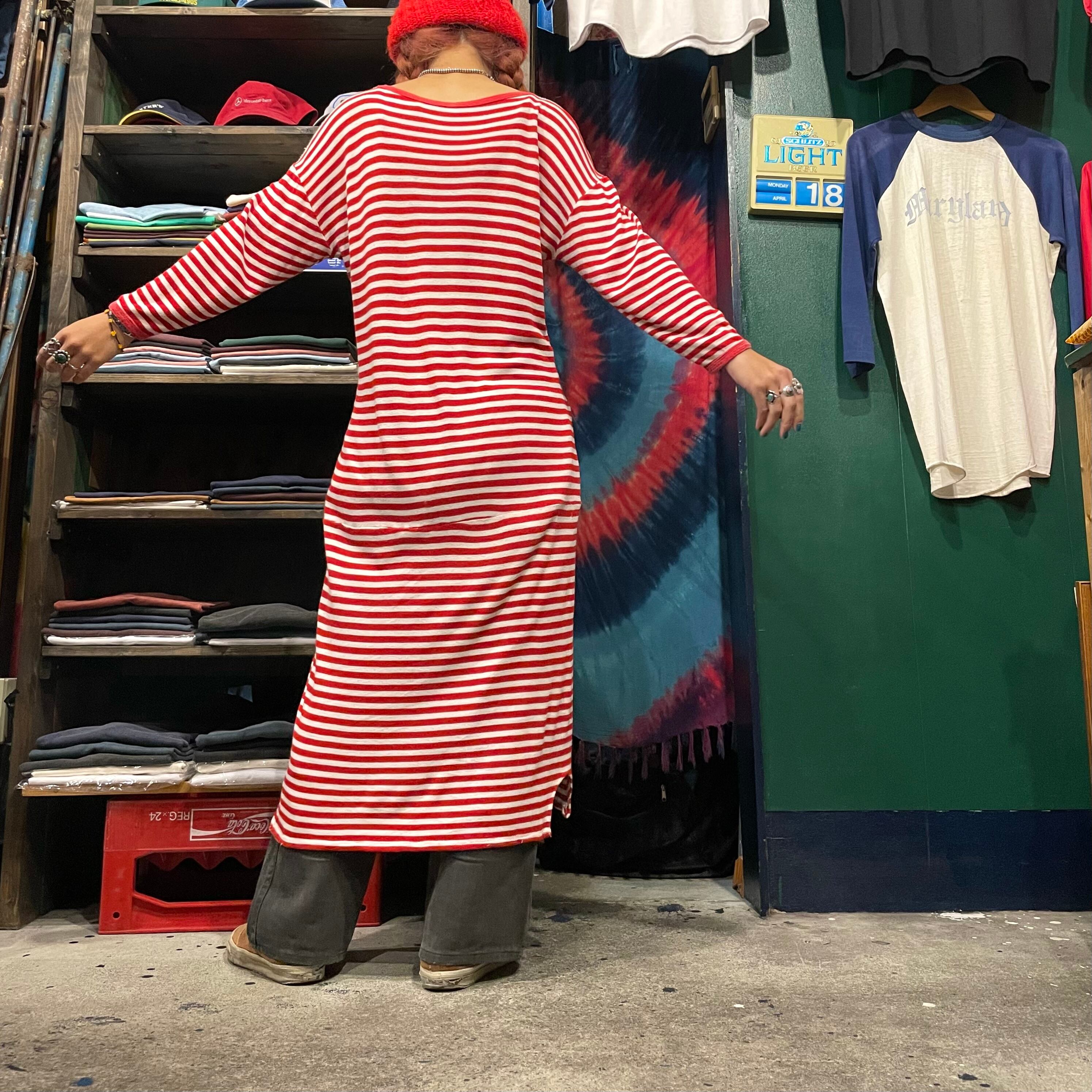 赤白のボーダーがかわいいカットソーワンピースです。柔らかくて伸縮性がありとても気持ち良い着心地と楽ちんさが良いですね。