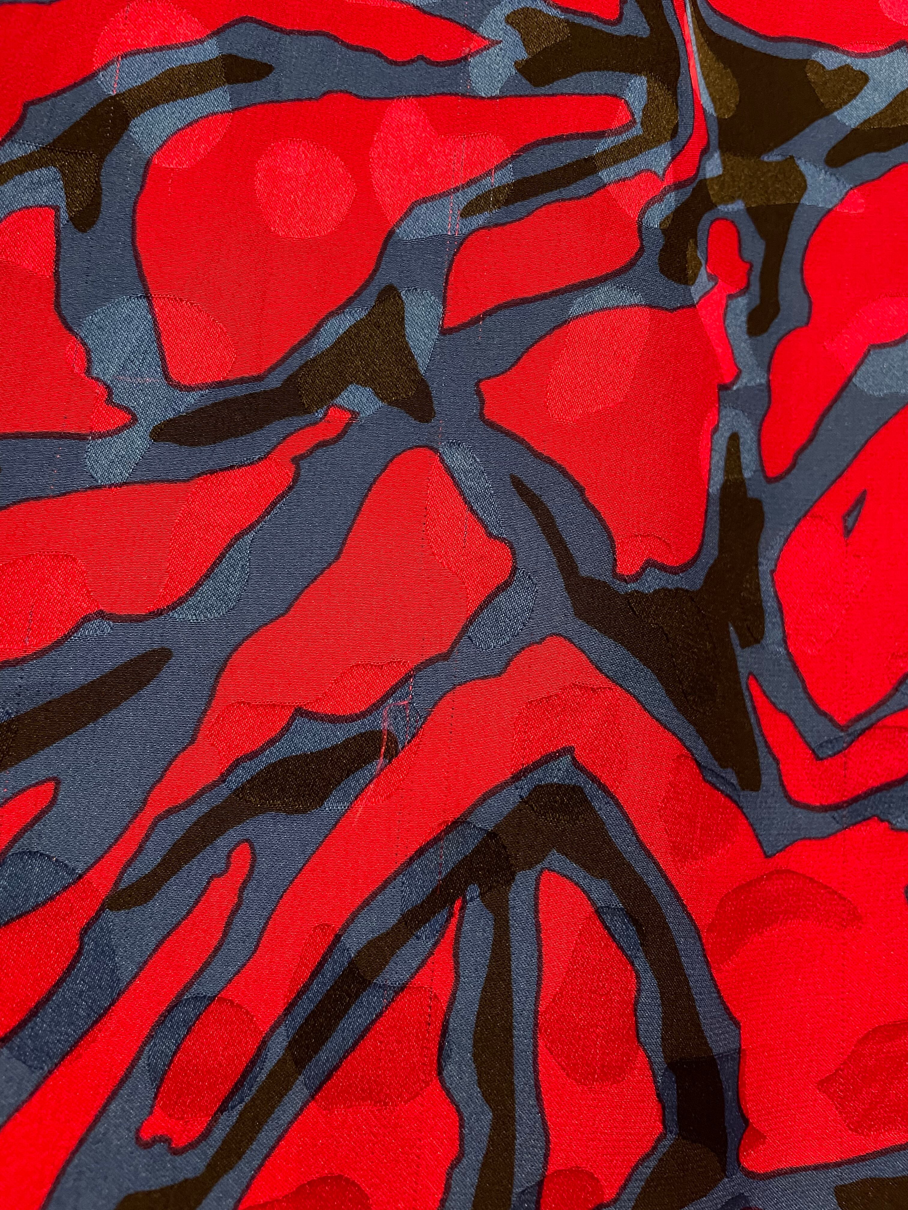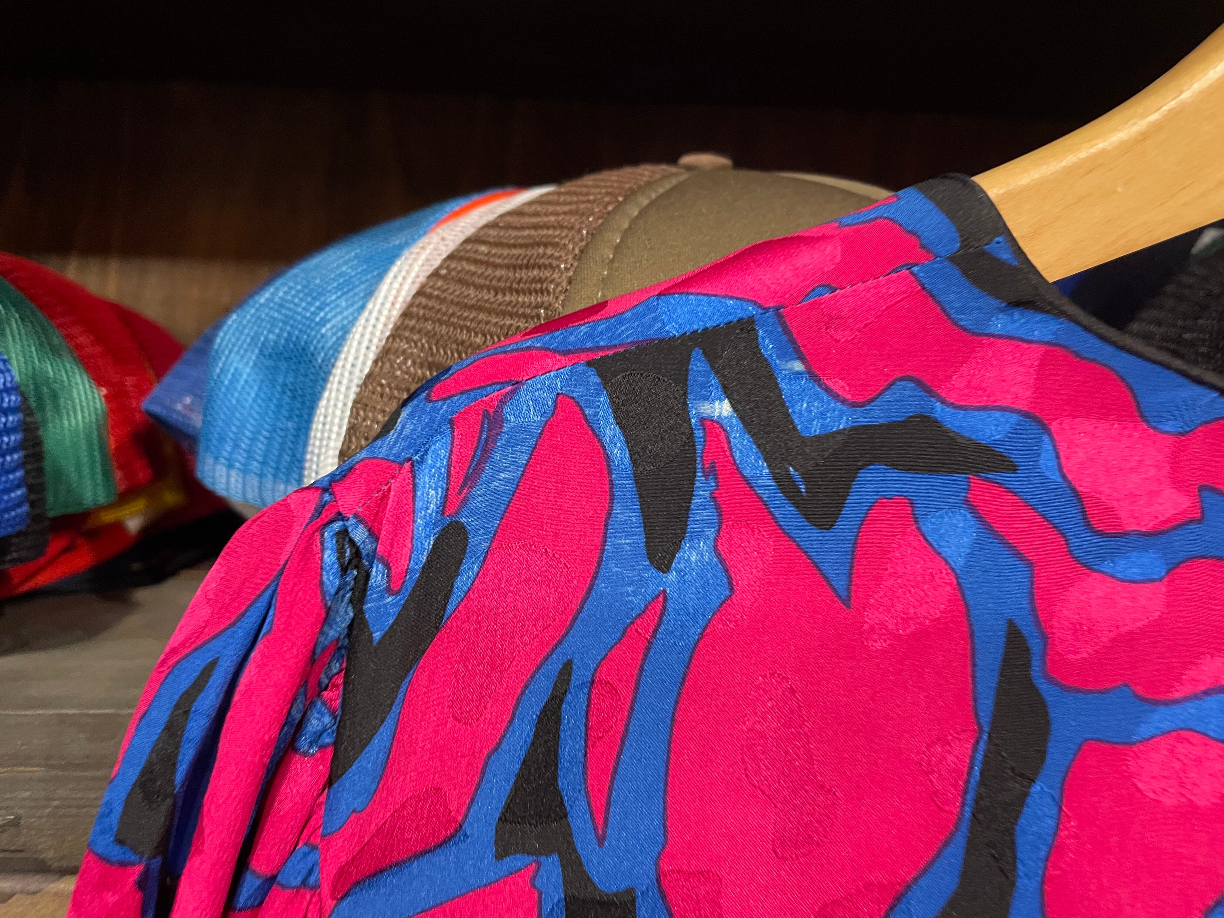 織りで作られた光沢のある模様に高級感がありますし、派手な柄ではありますが上品さがあって小物次第ではパーティーシーンにもお使いいただけそうな一着です。