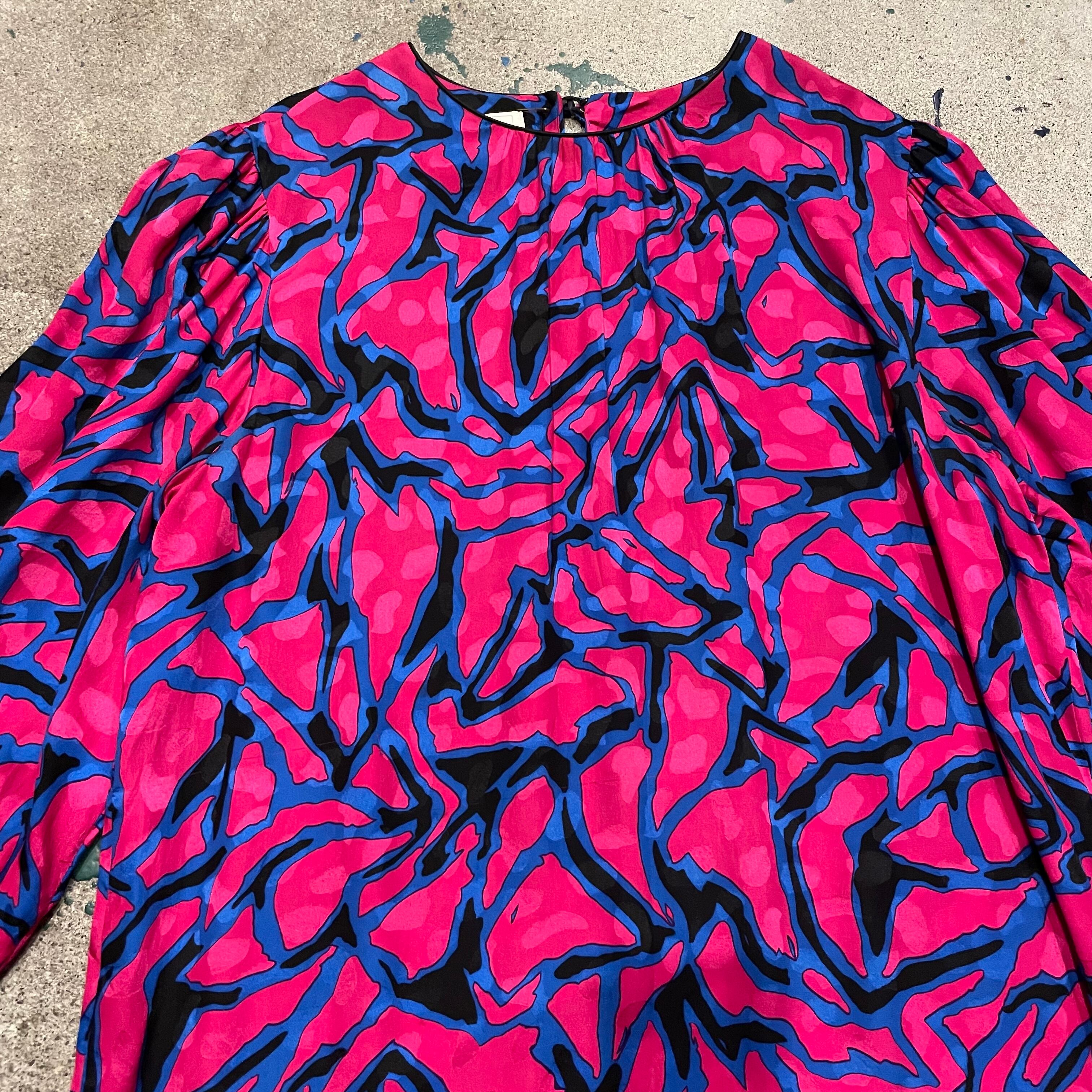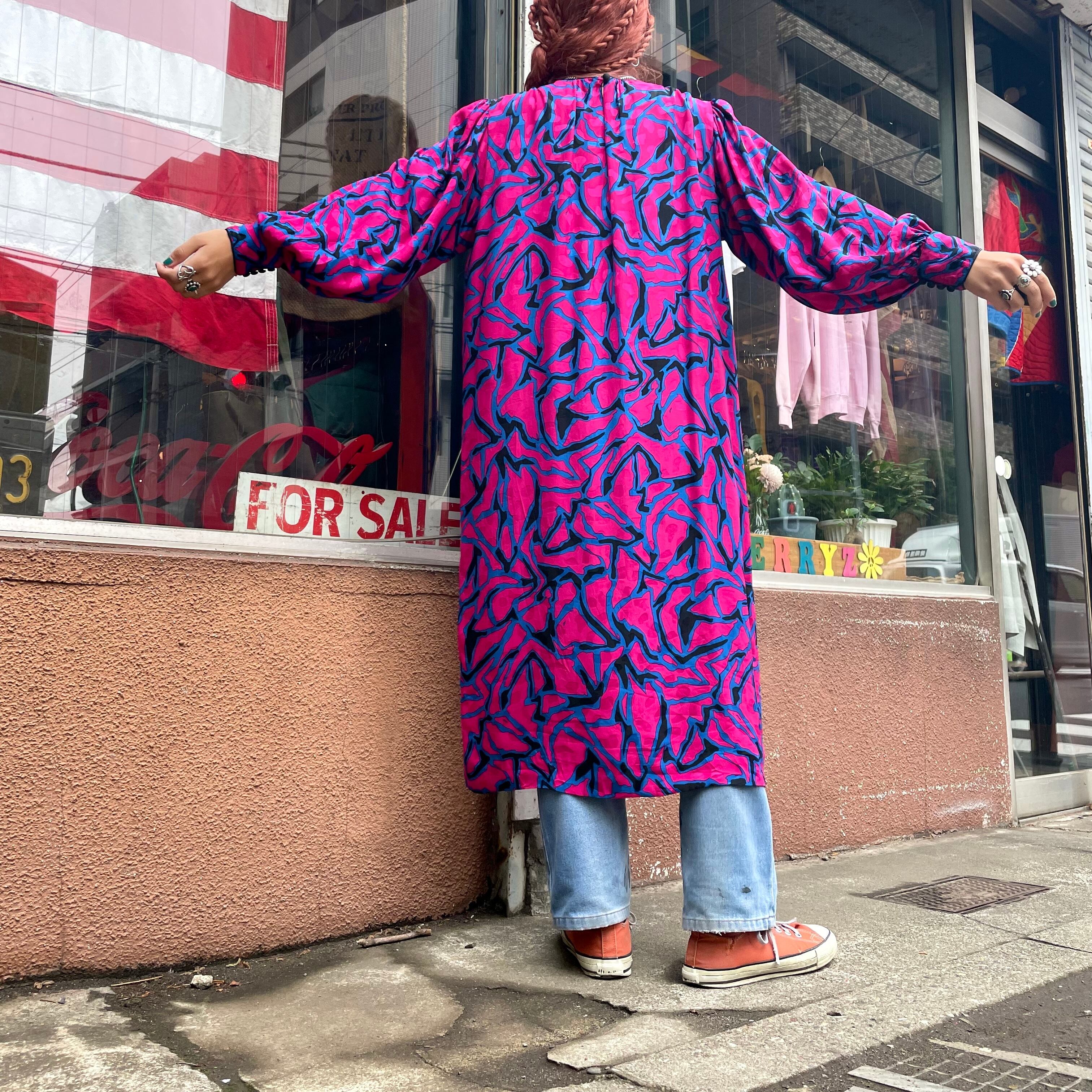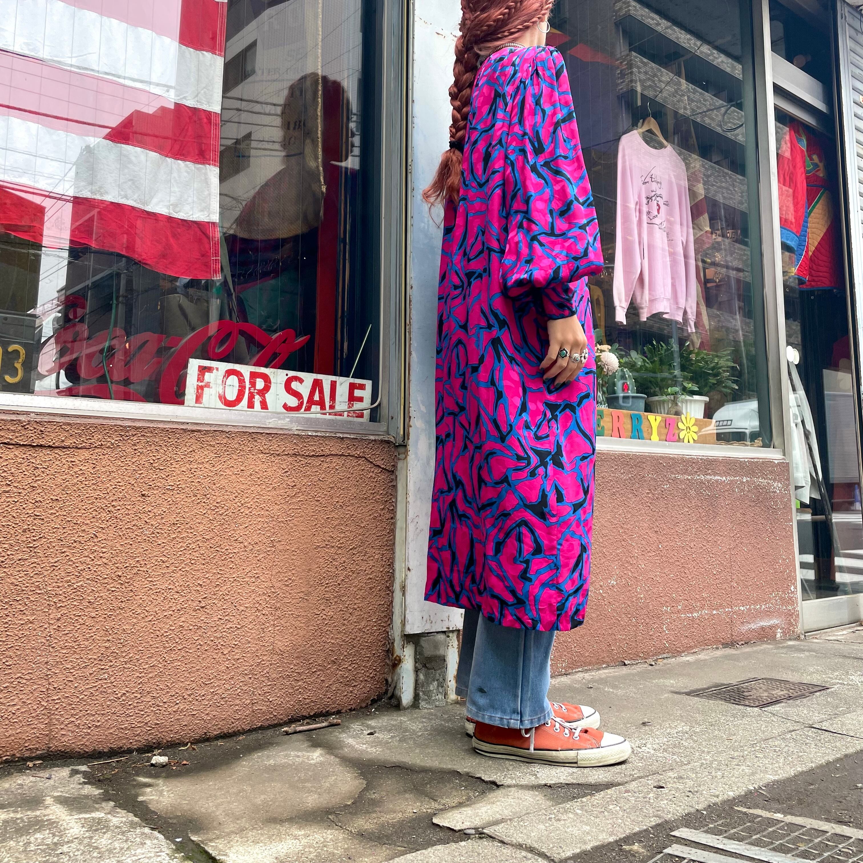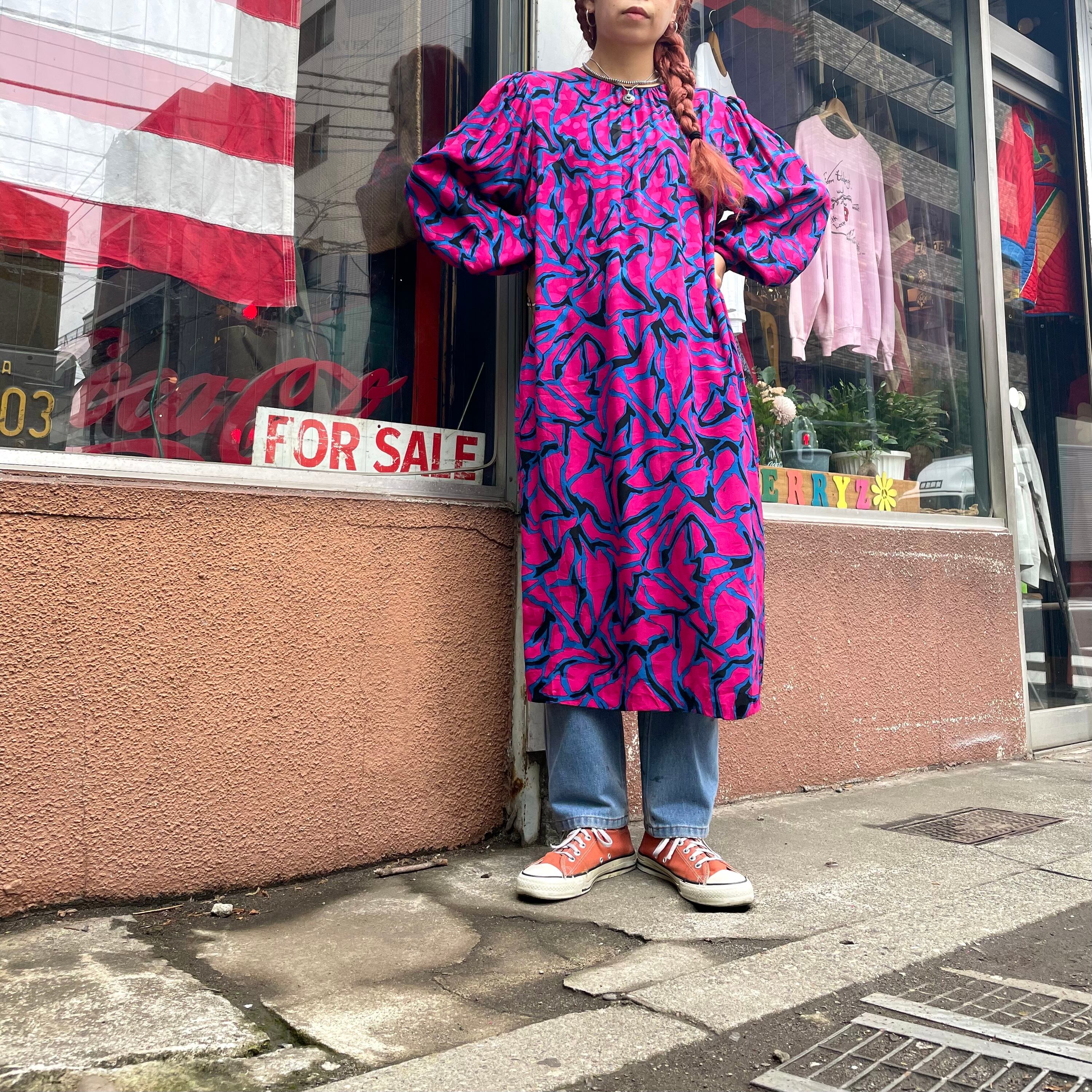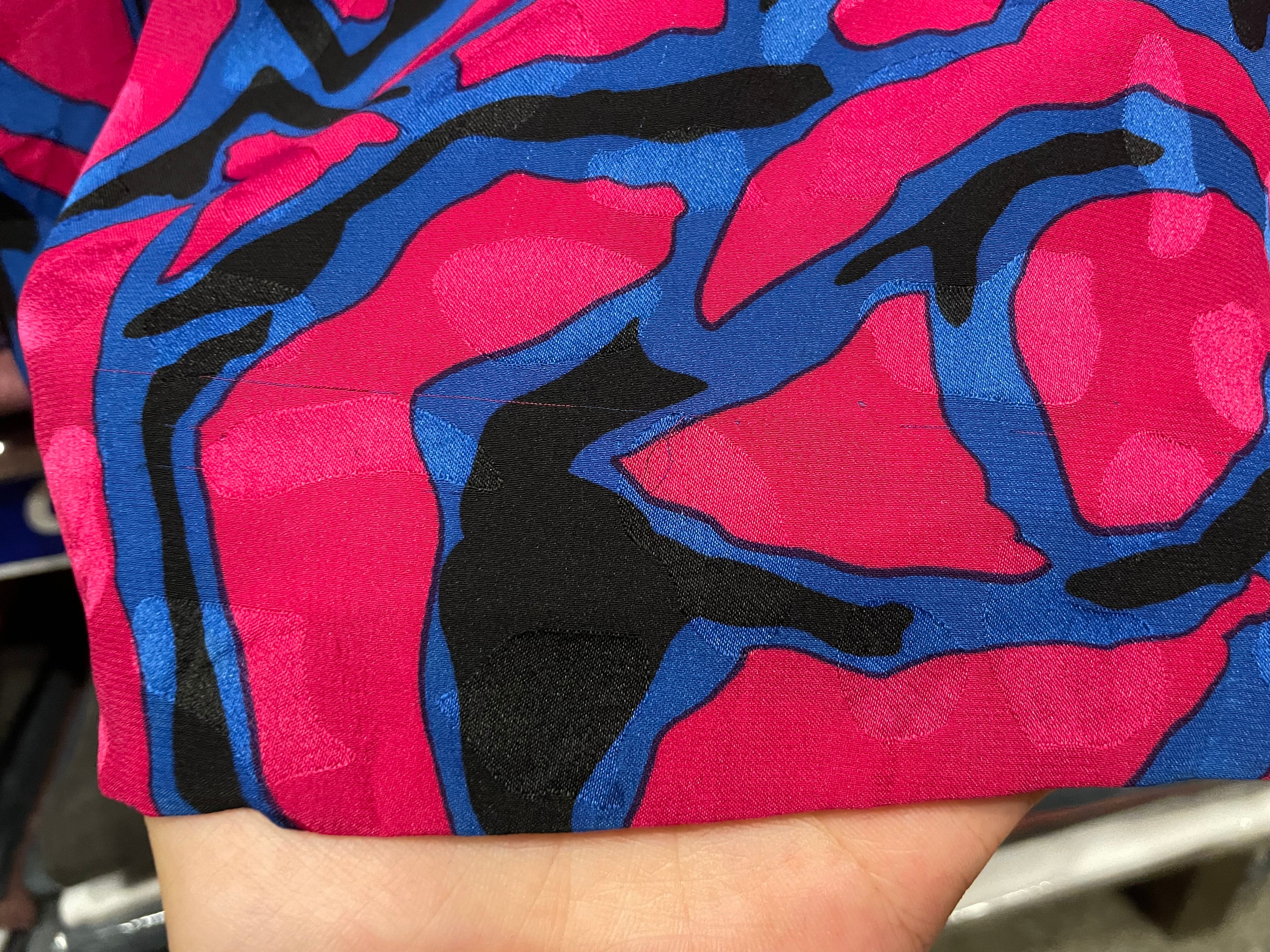ピンクに青×黒の激しい柄がかわいいシルク素材のワンピースです。
