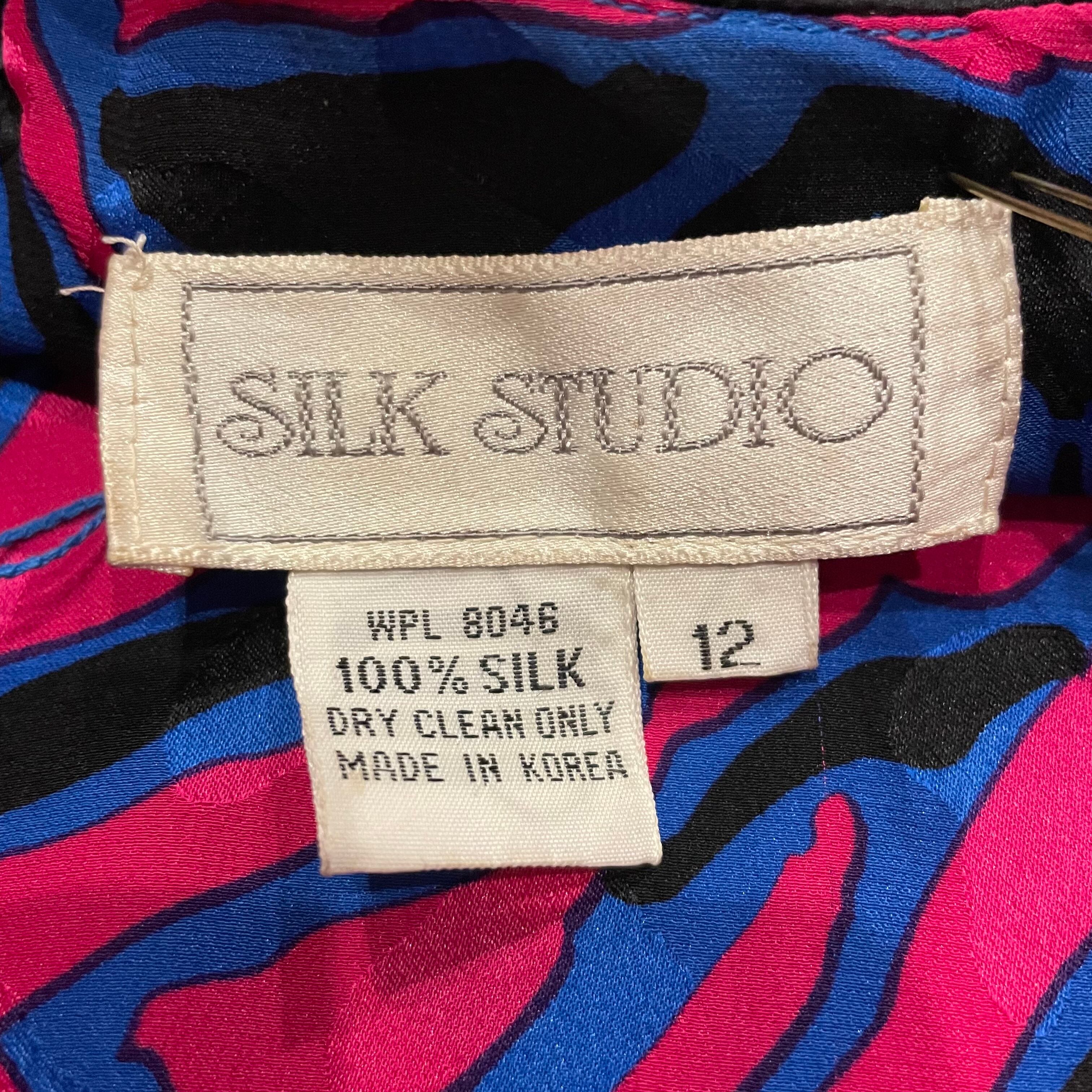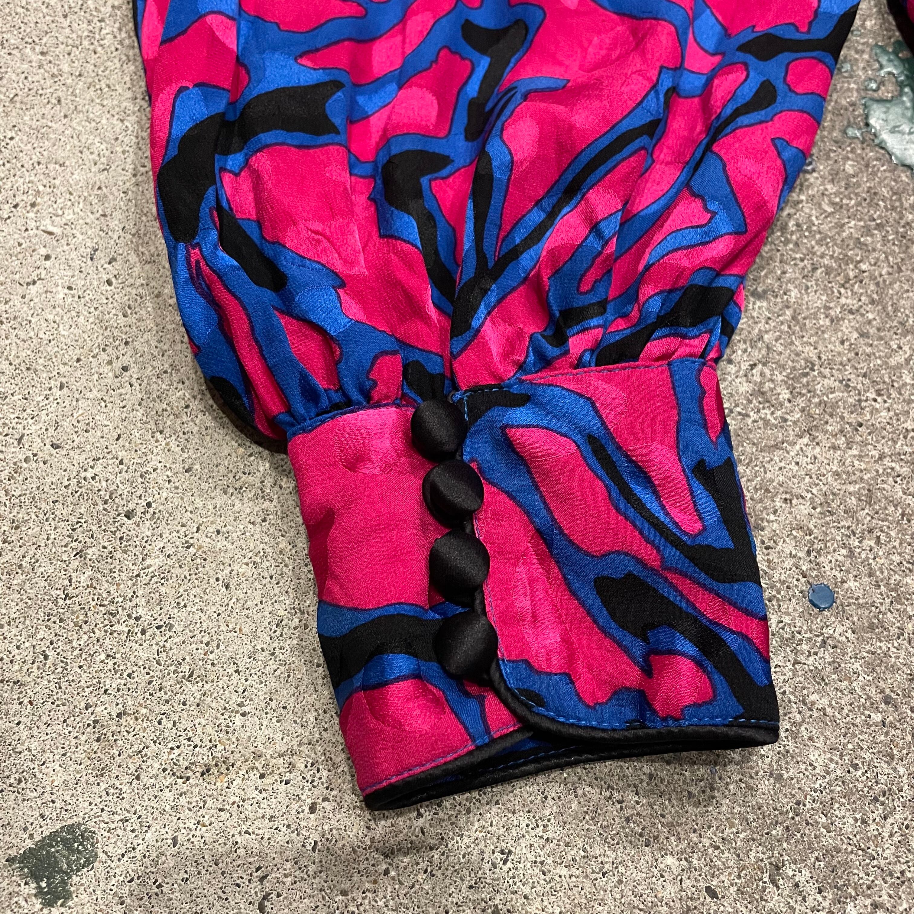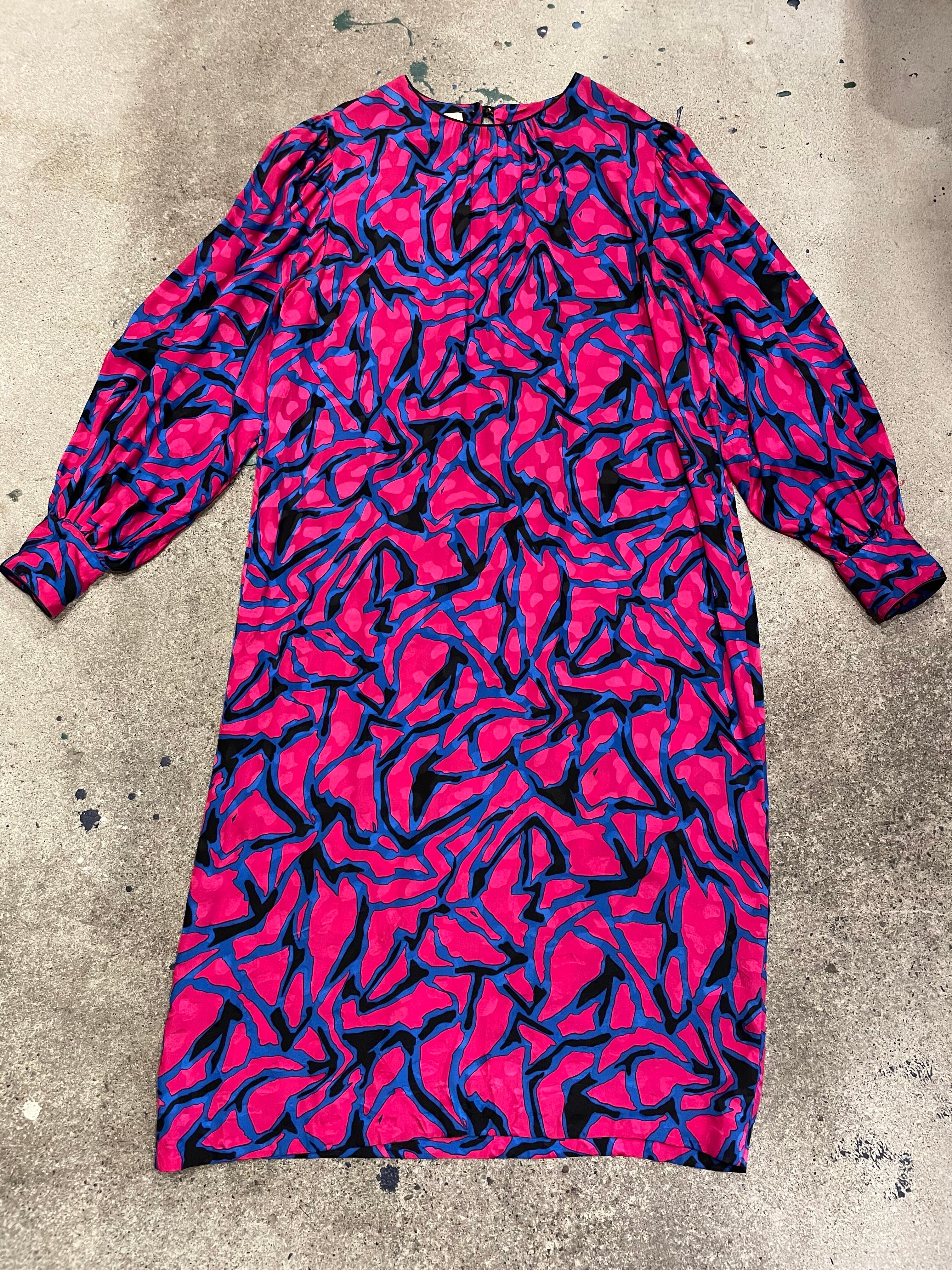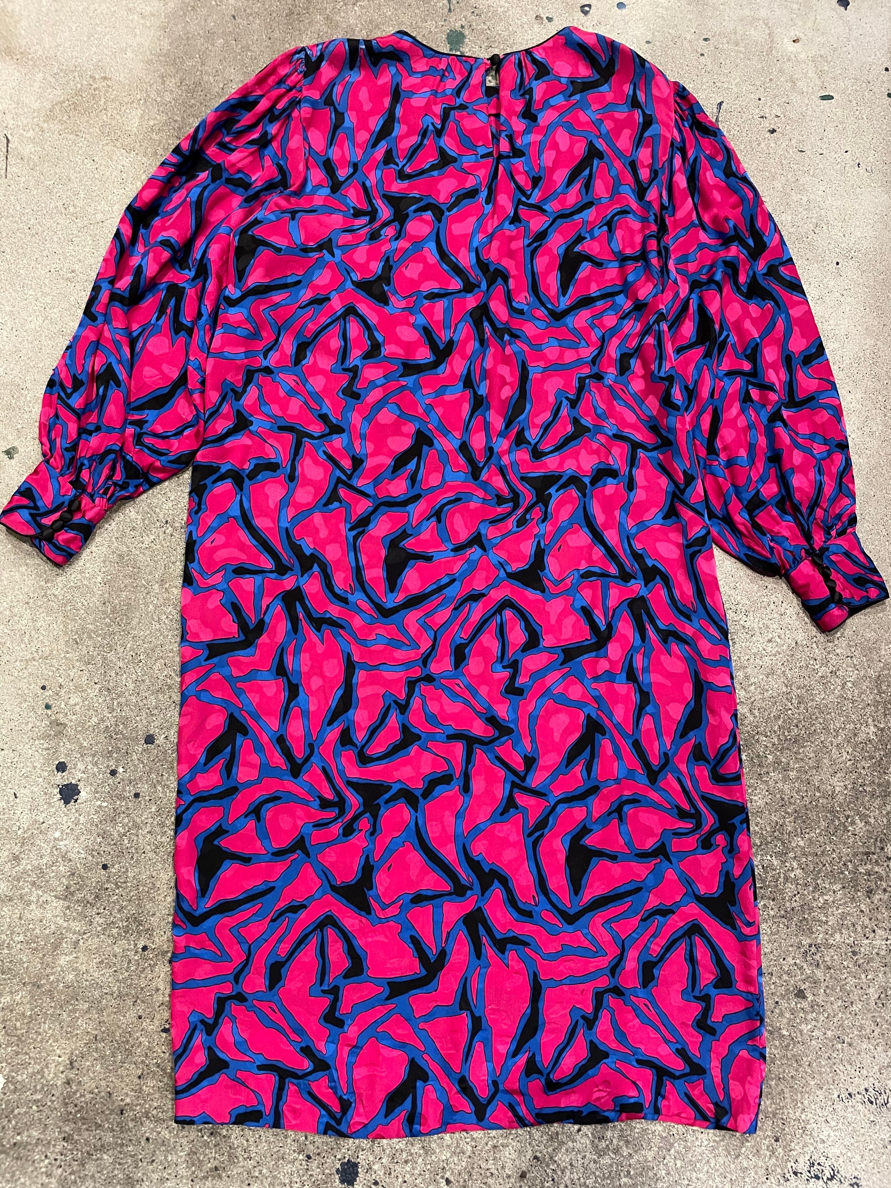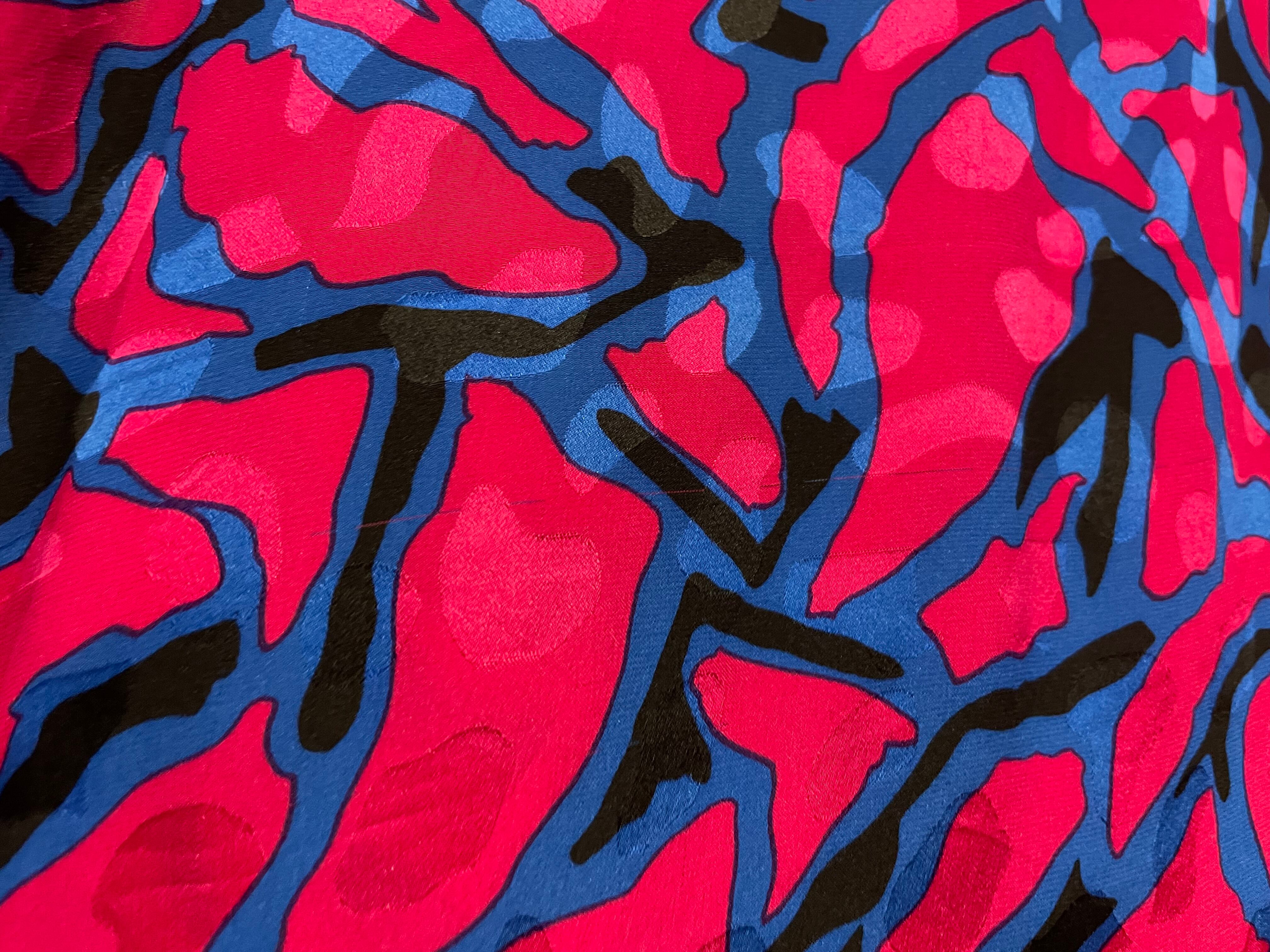 ピンクに青×黒の激しい柄がかわいいシルク素材のワンピースです。