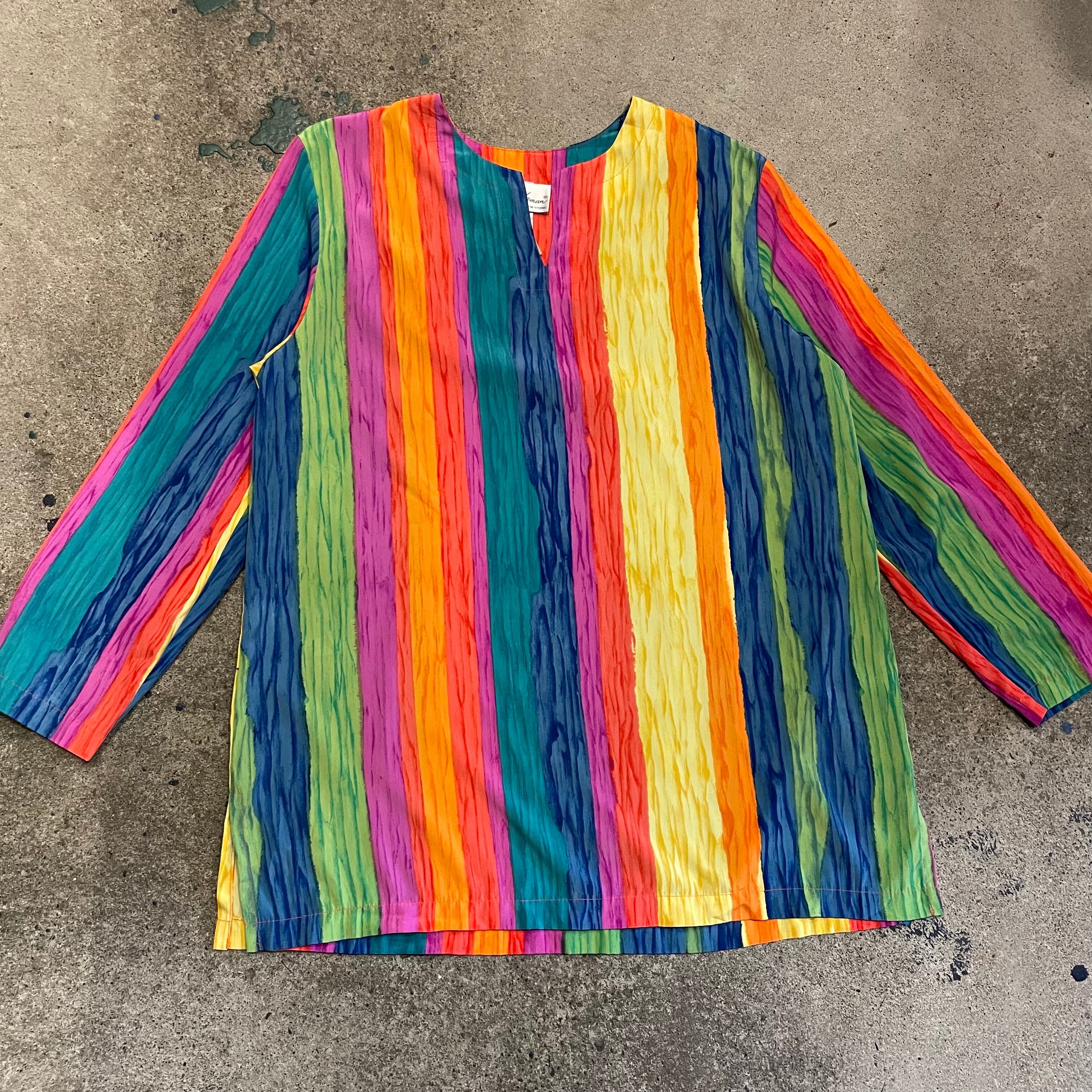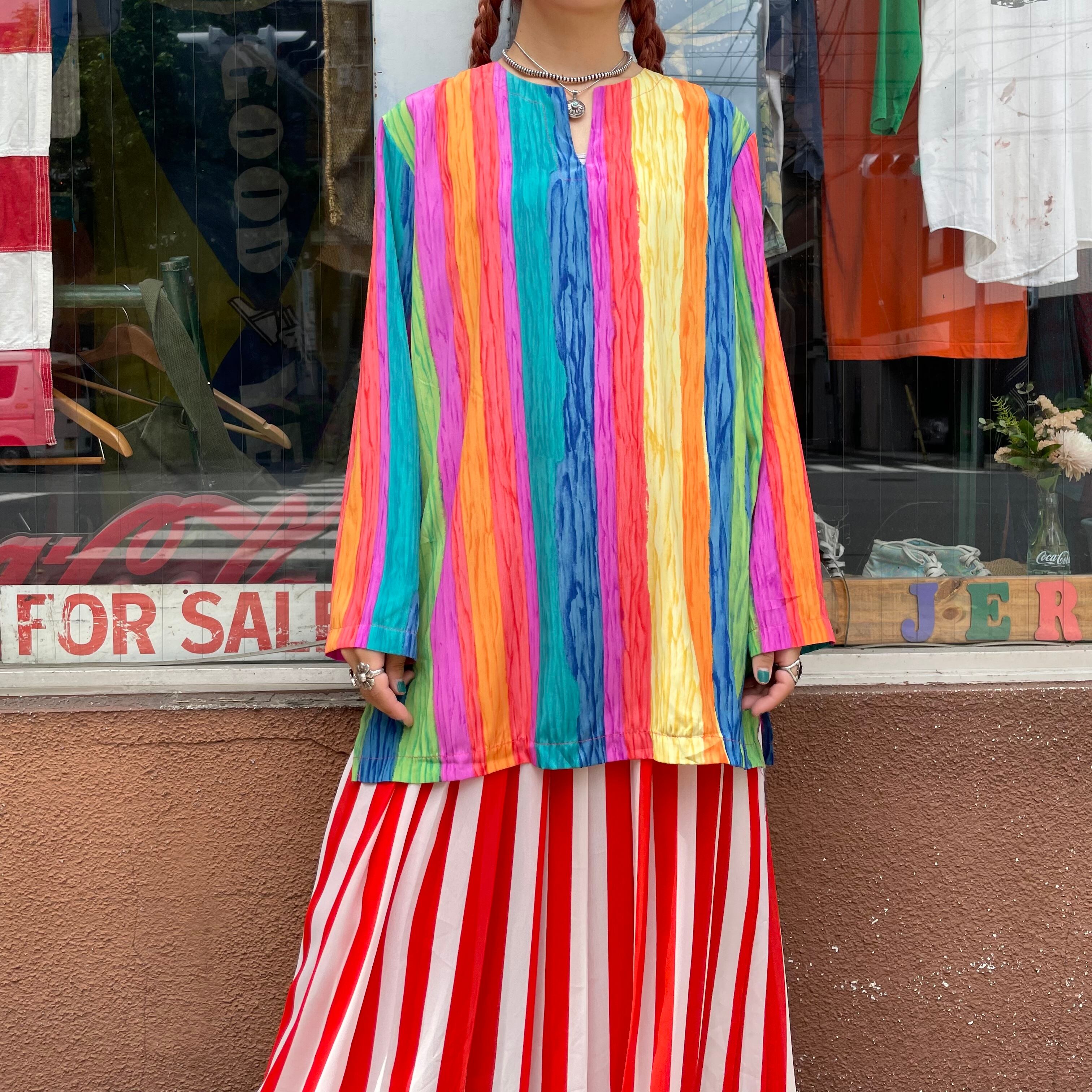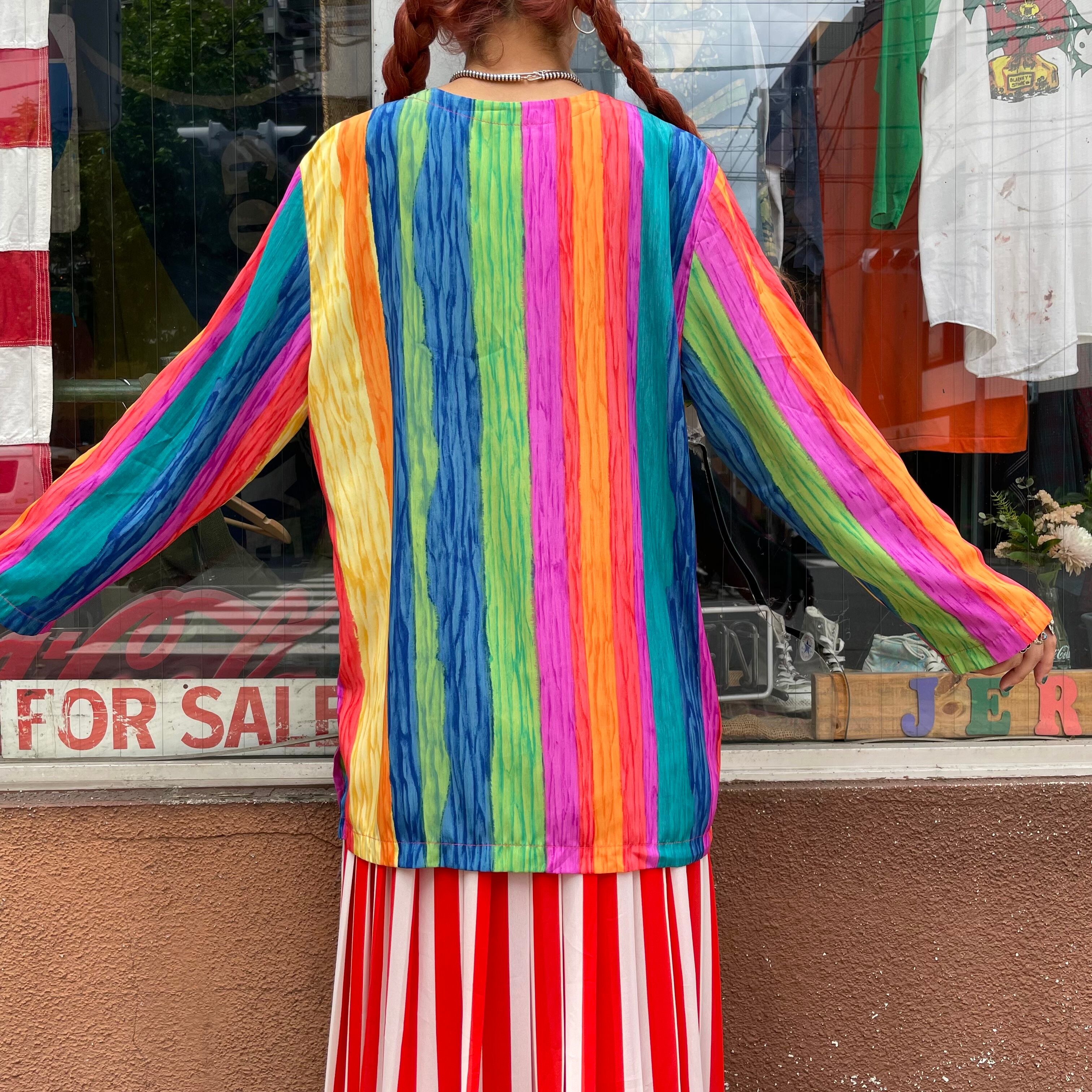木目っぽい雰囲気のカラフルなストライプがかわいいトップスです。