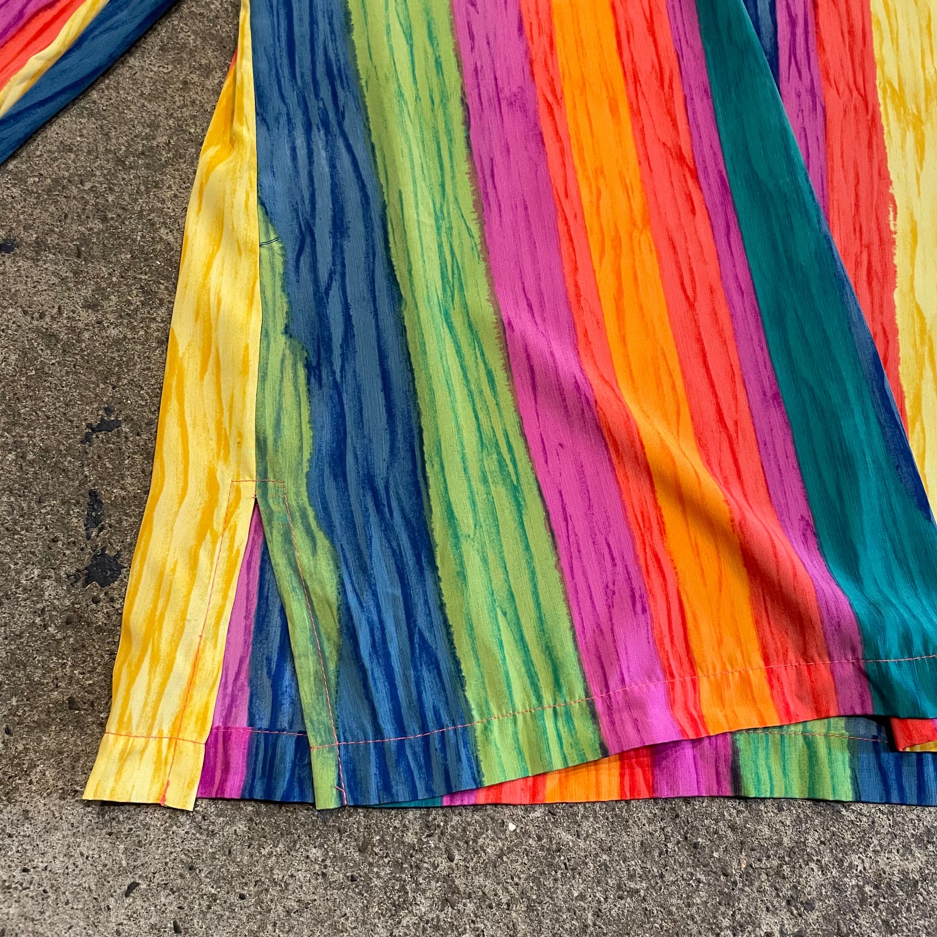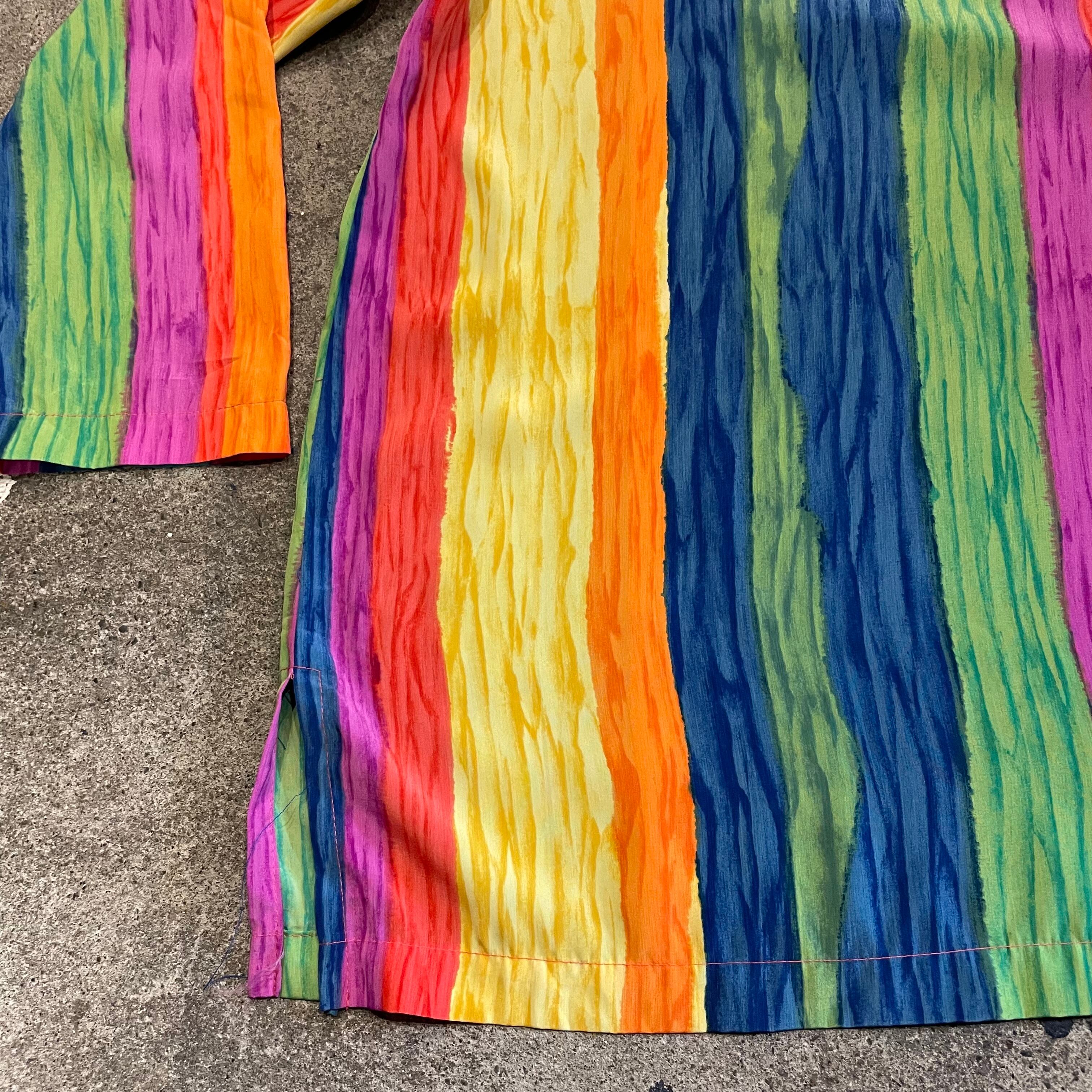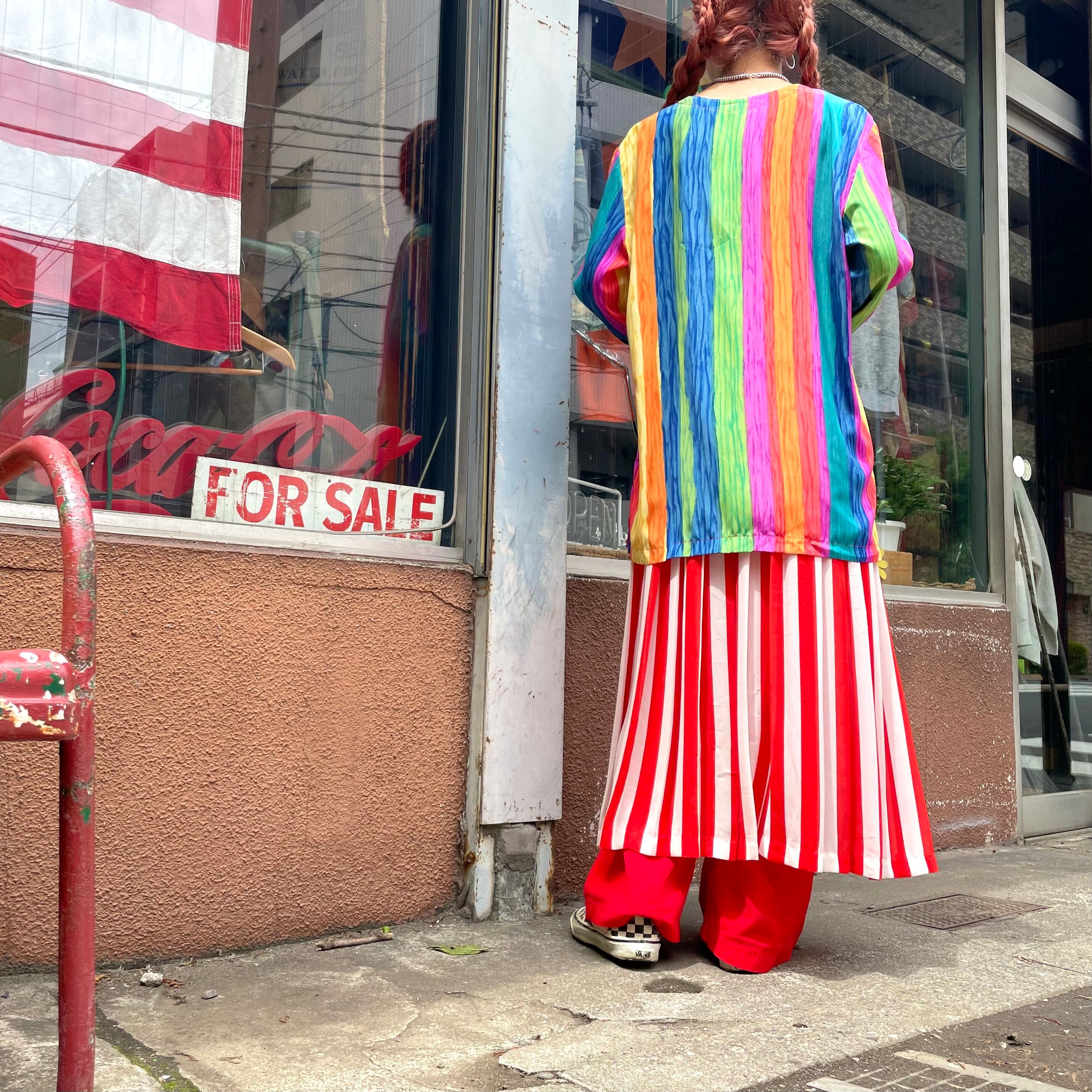 木目っぽい雰囲気のカラフルなストライプがかわいいトップスです。