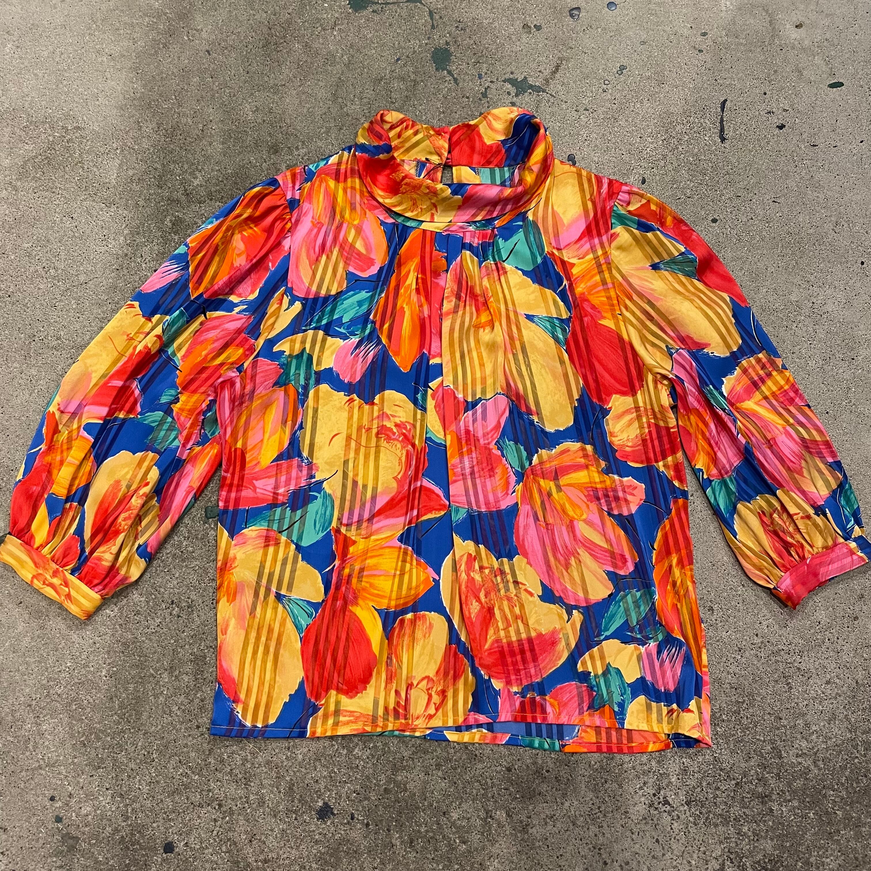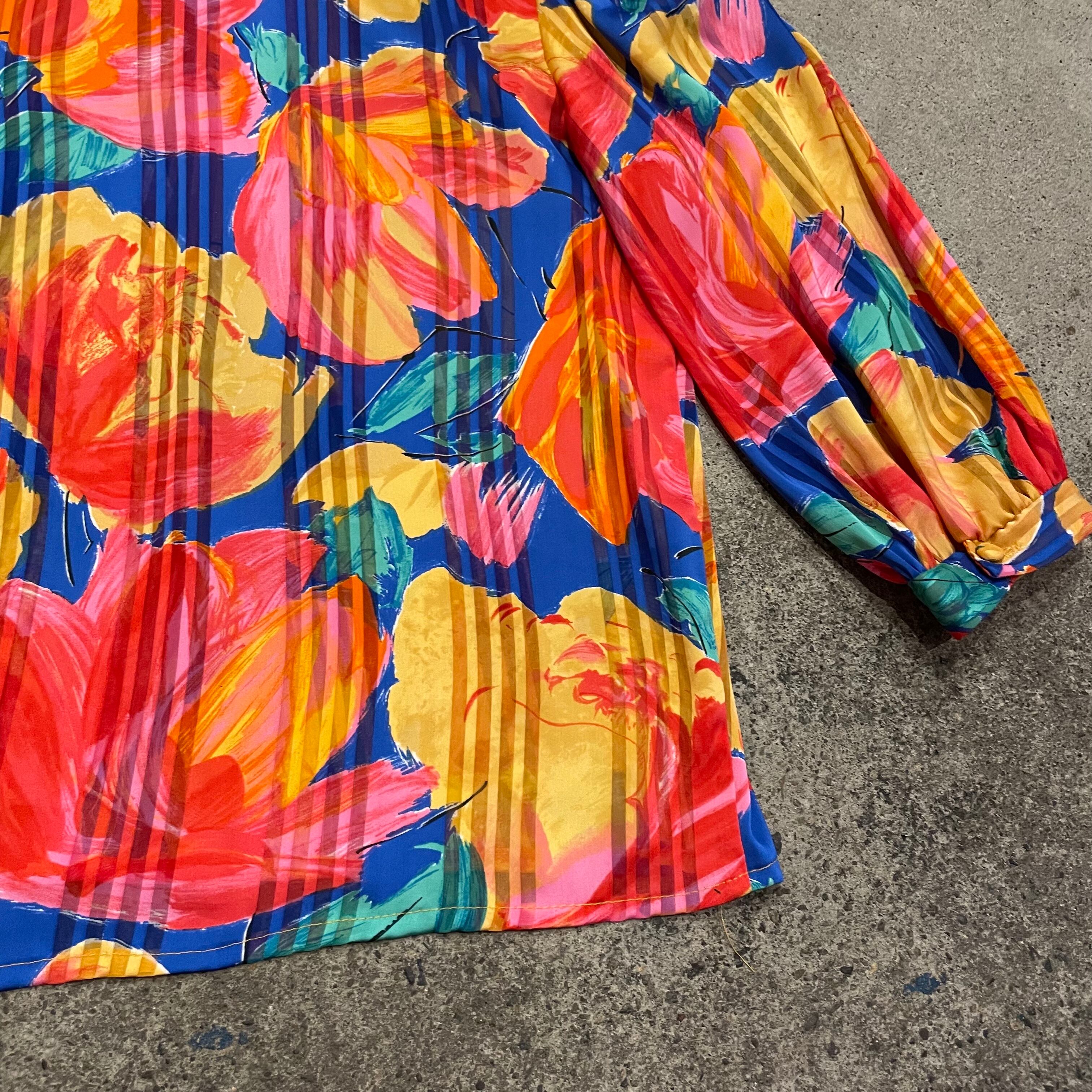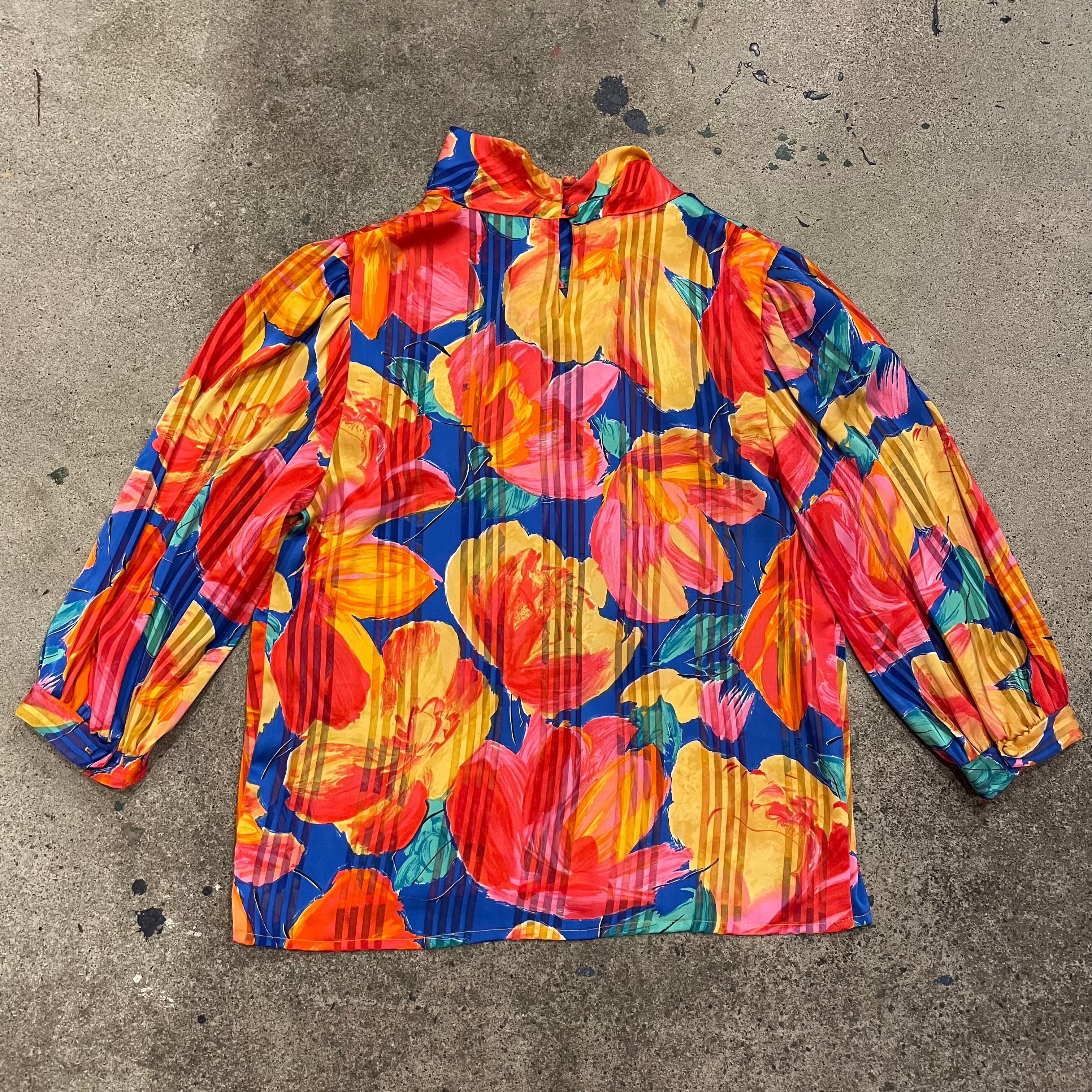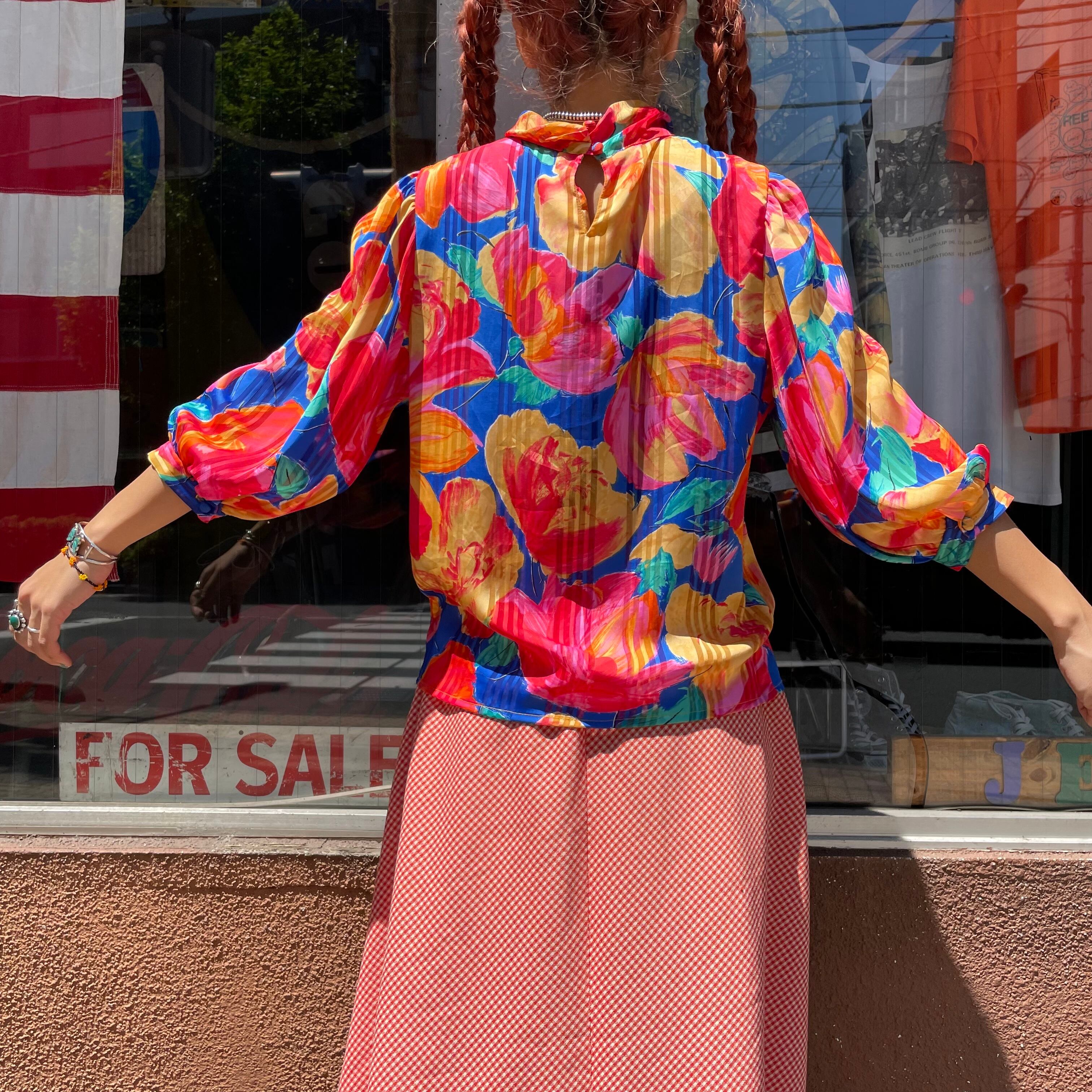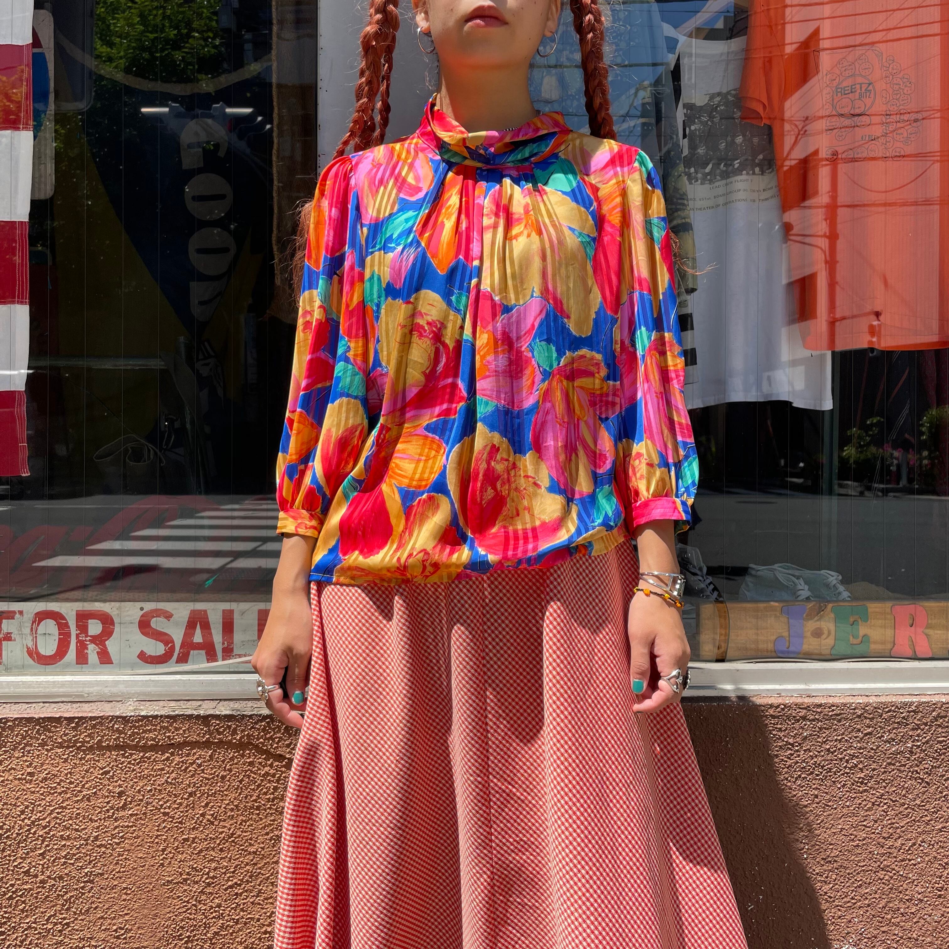 青地に大きな花柄が華やかでかわいいブラウスです。