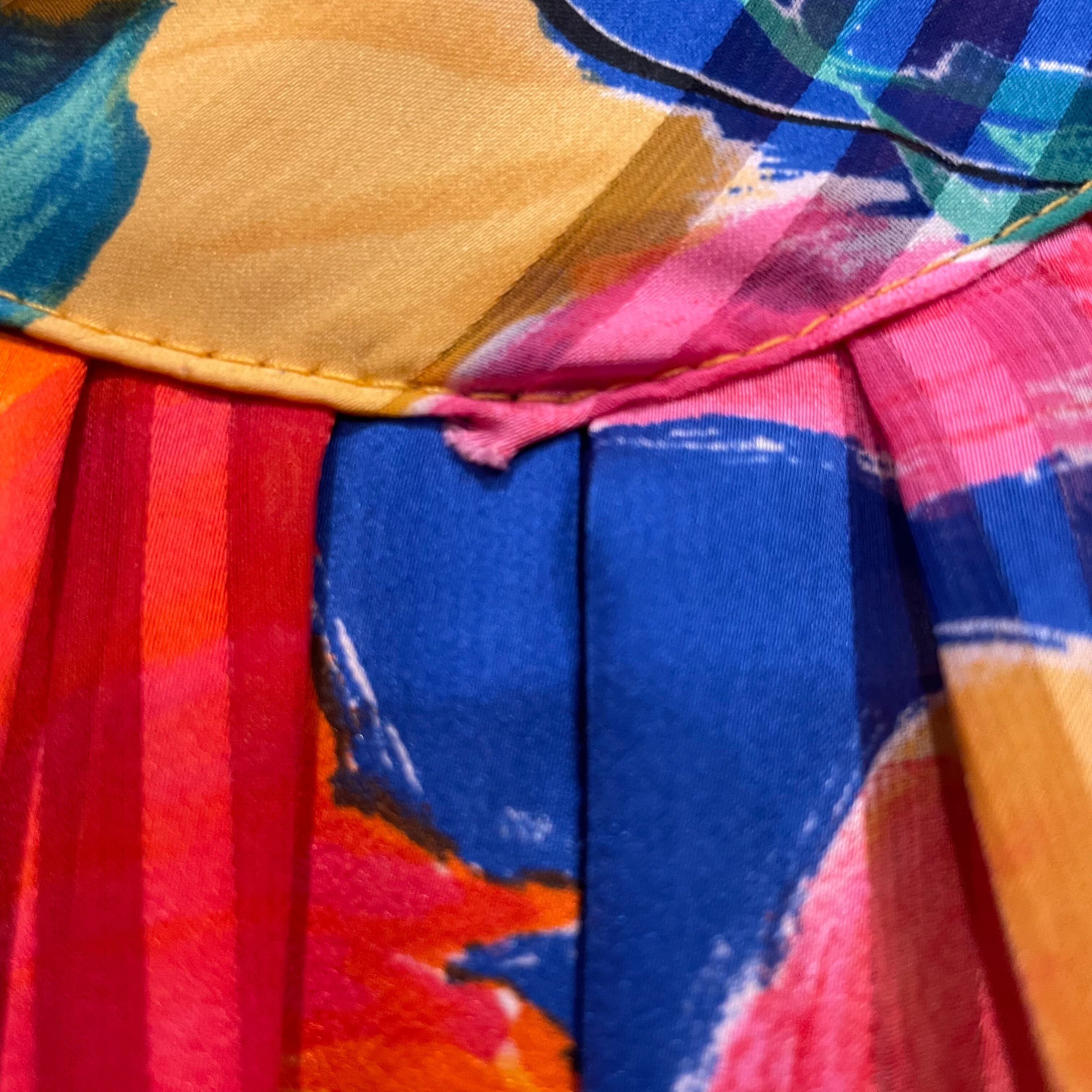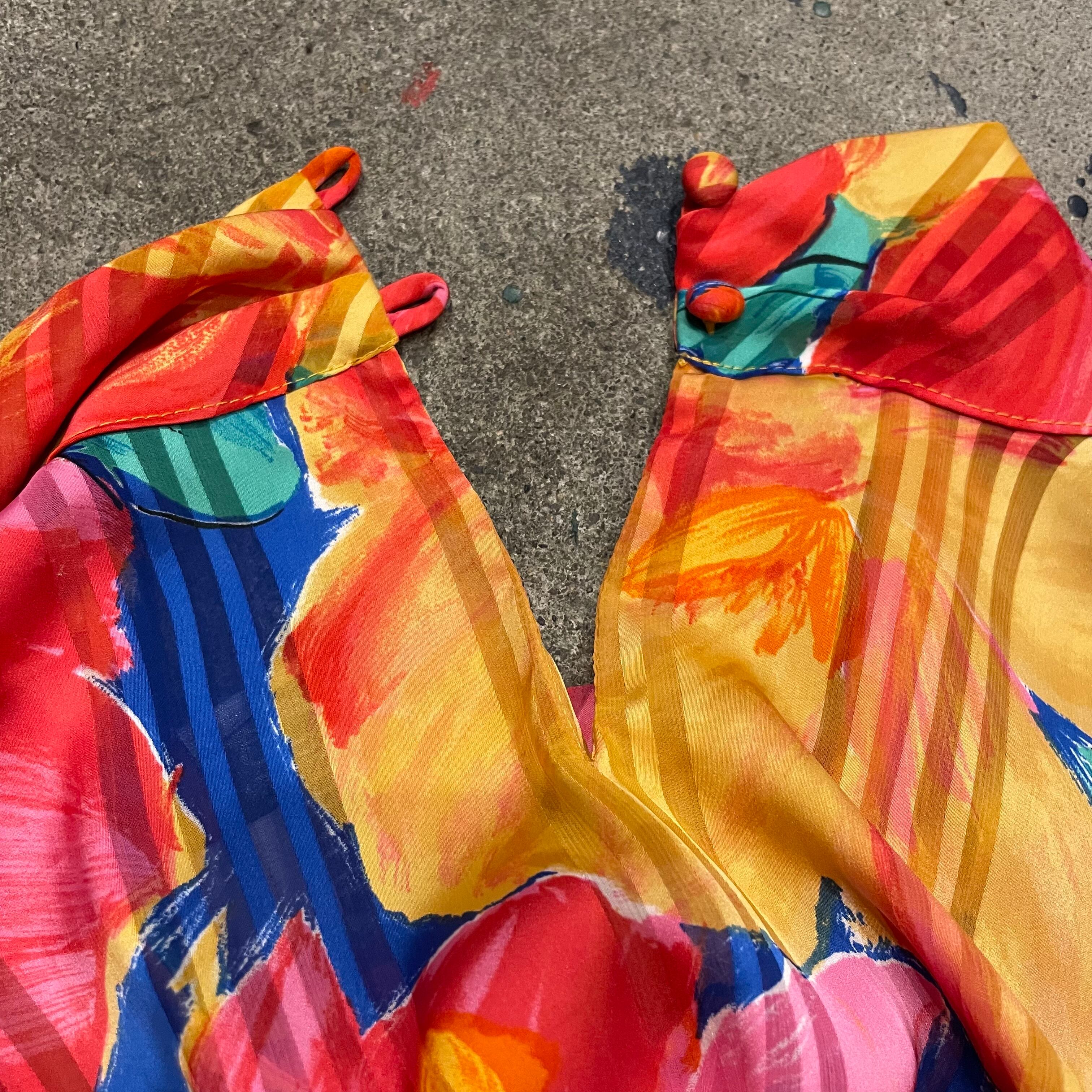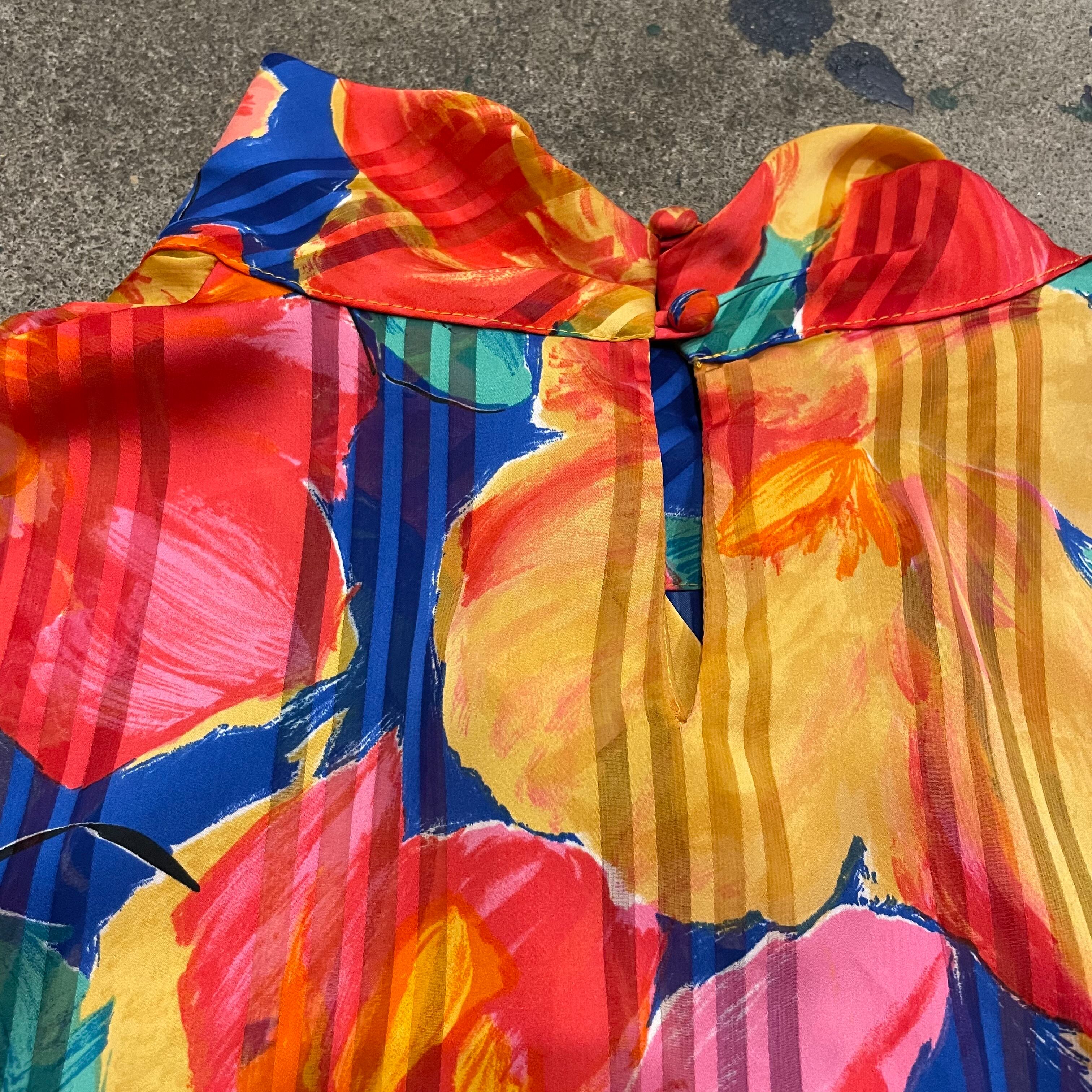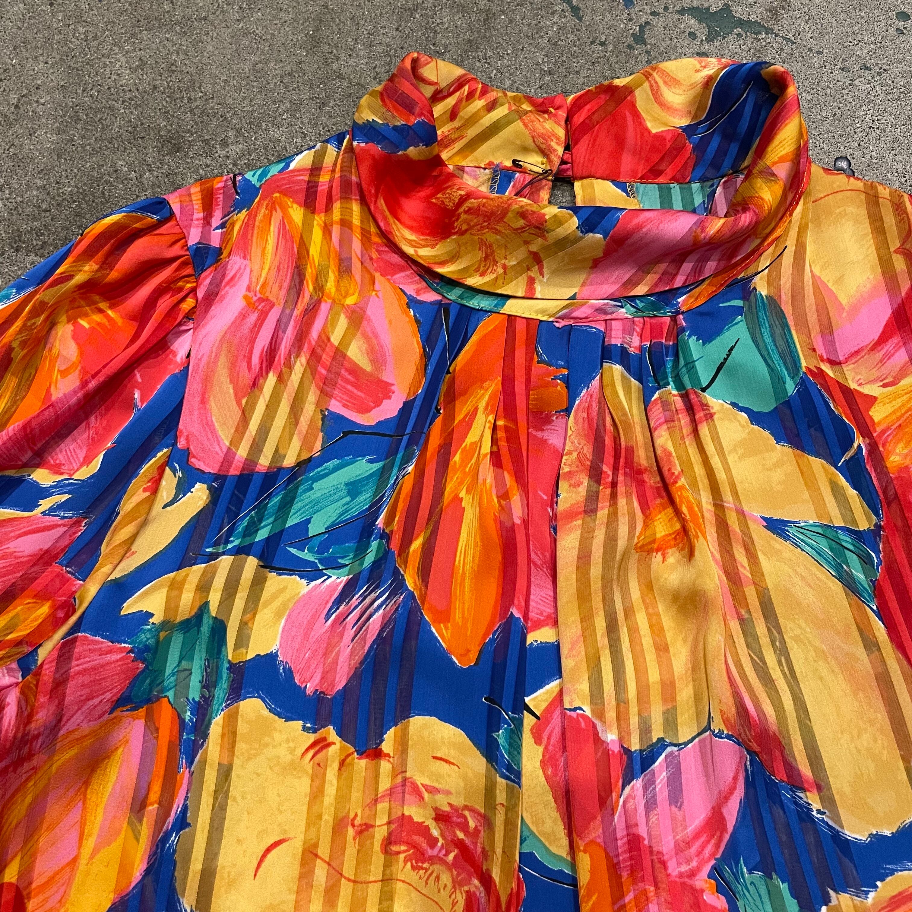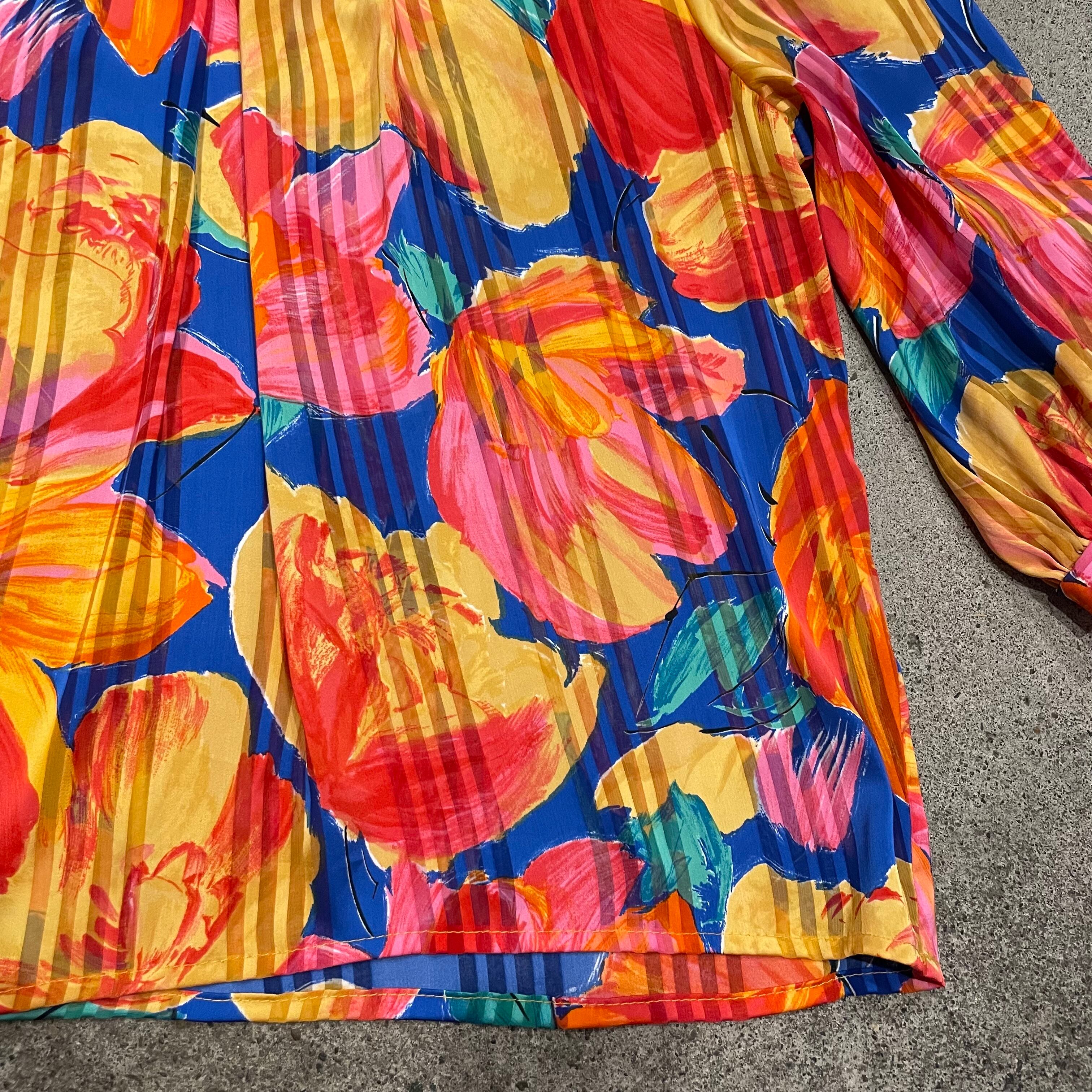 青地に大きな花柄が華やかでかわいいブラウスです。