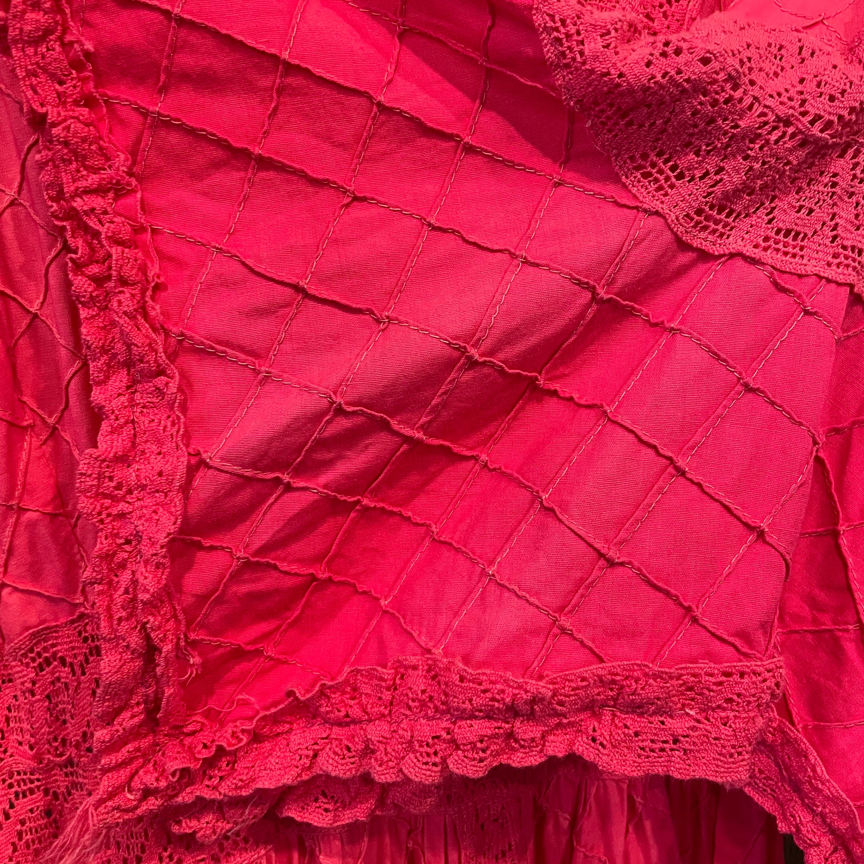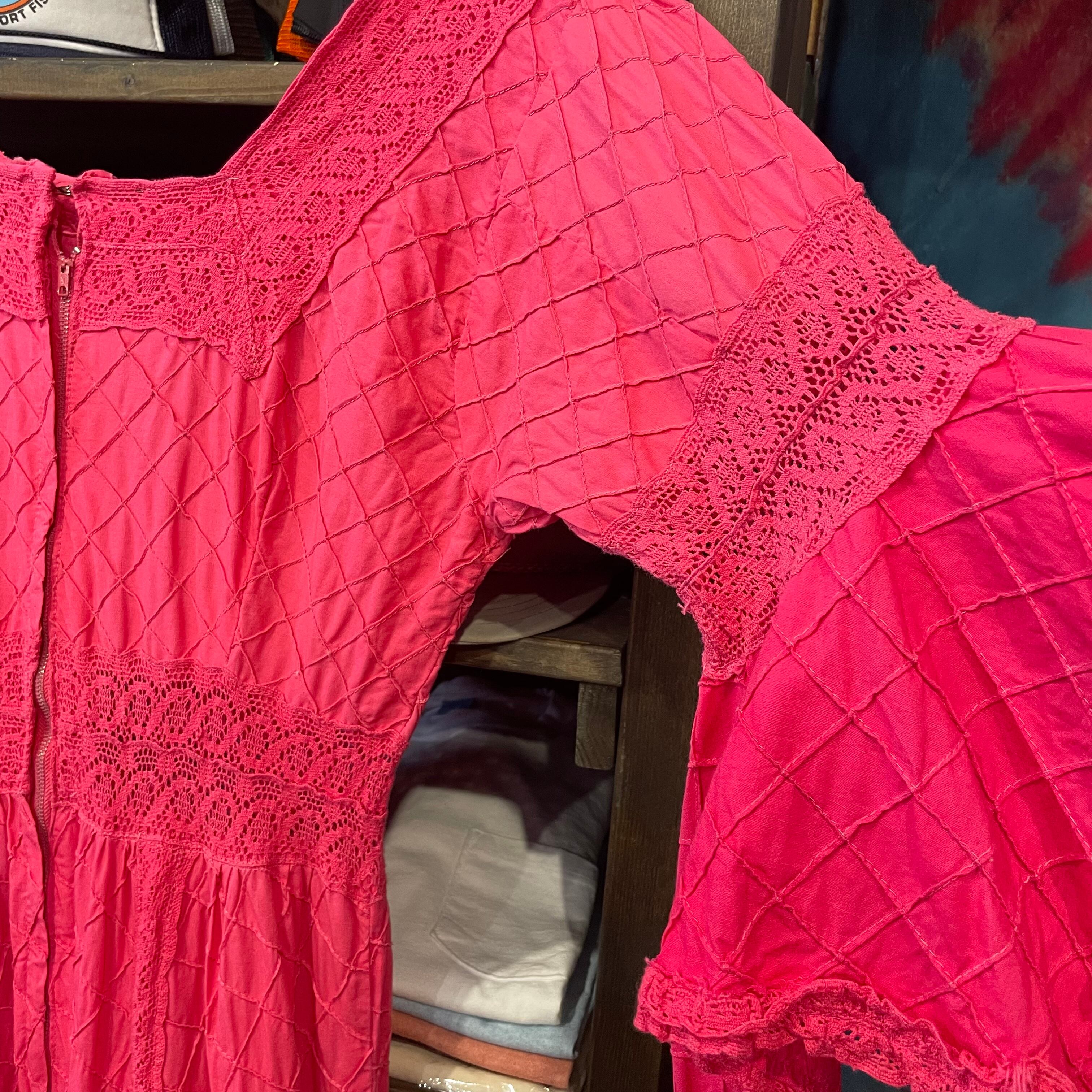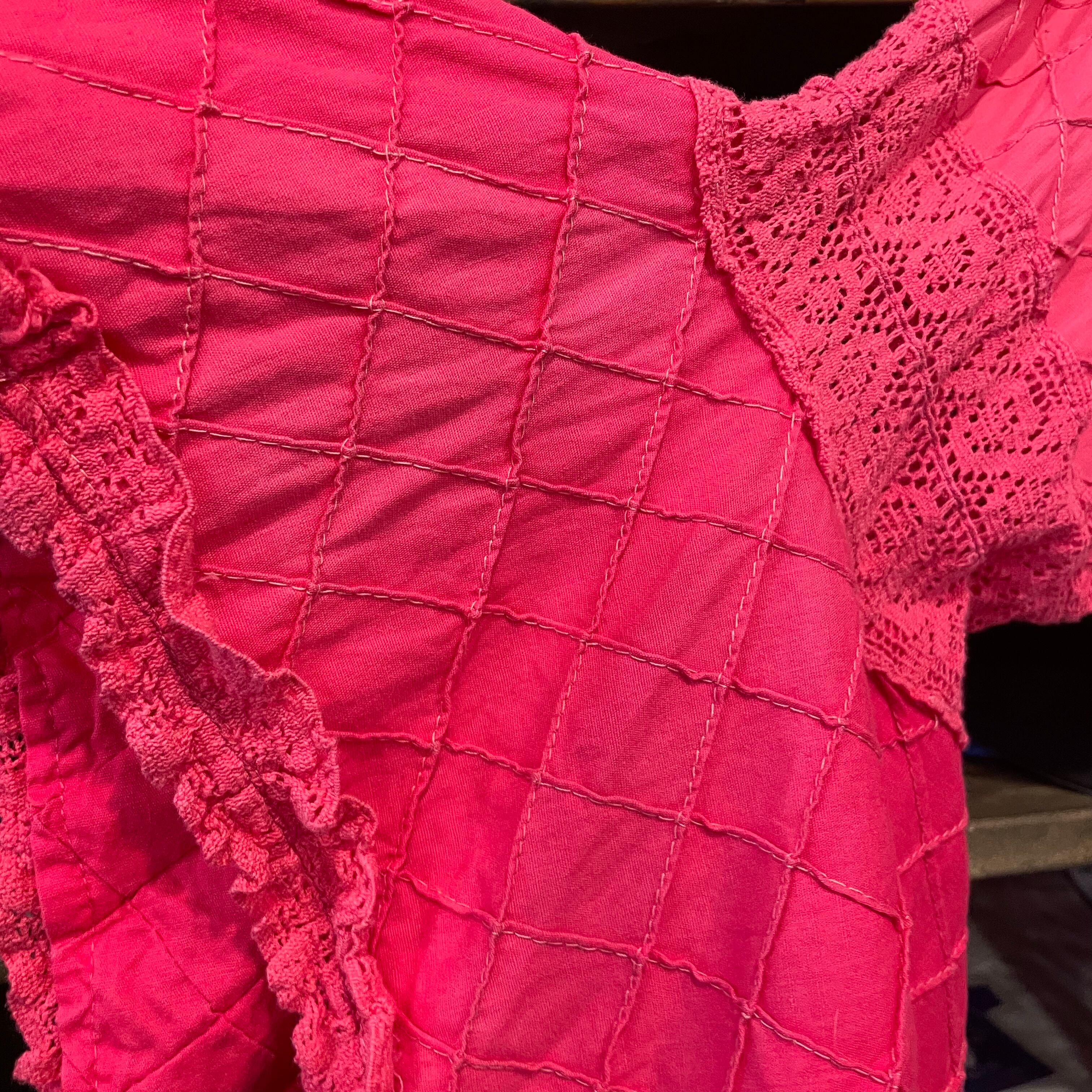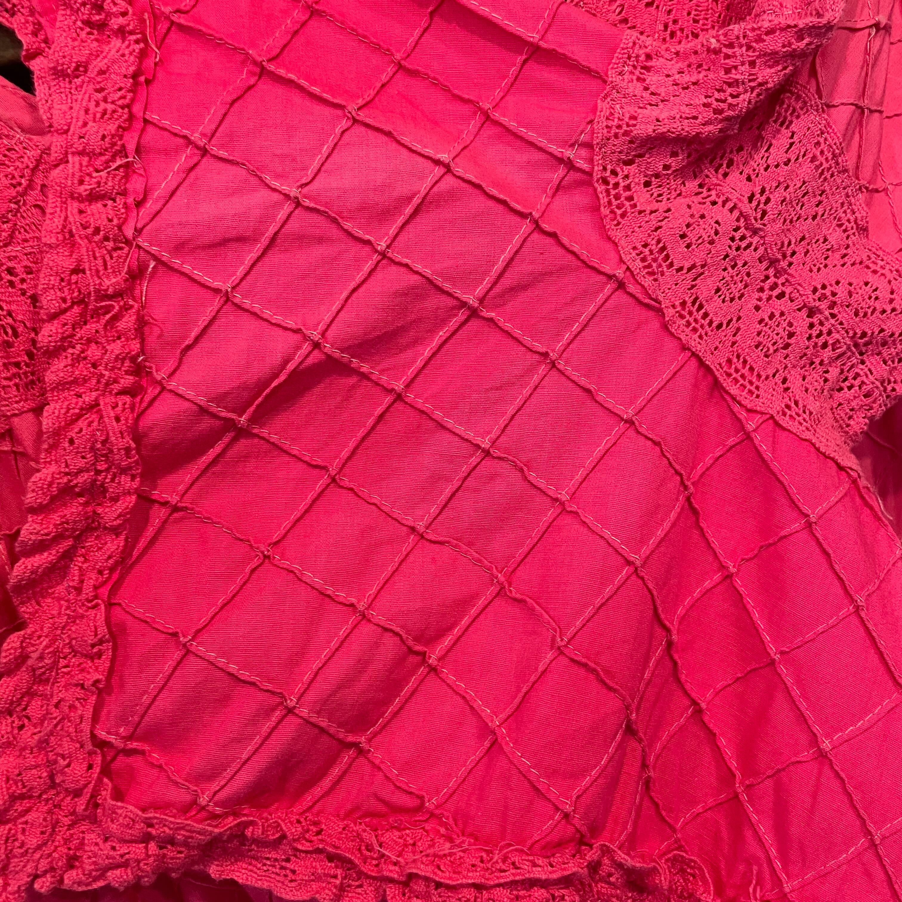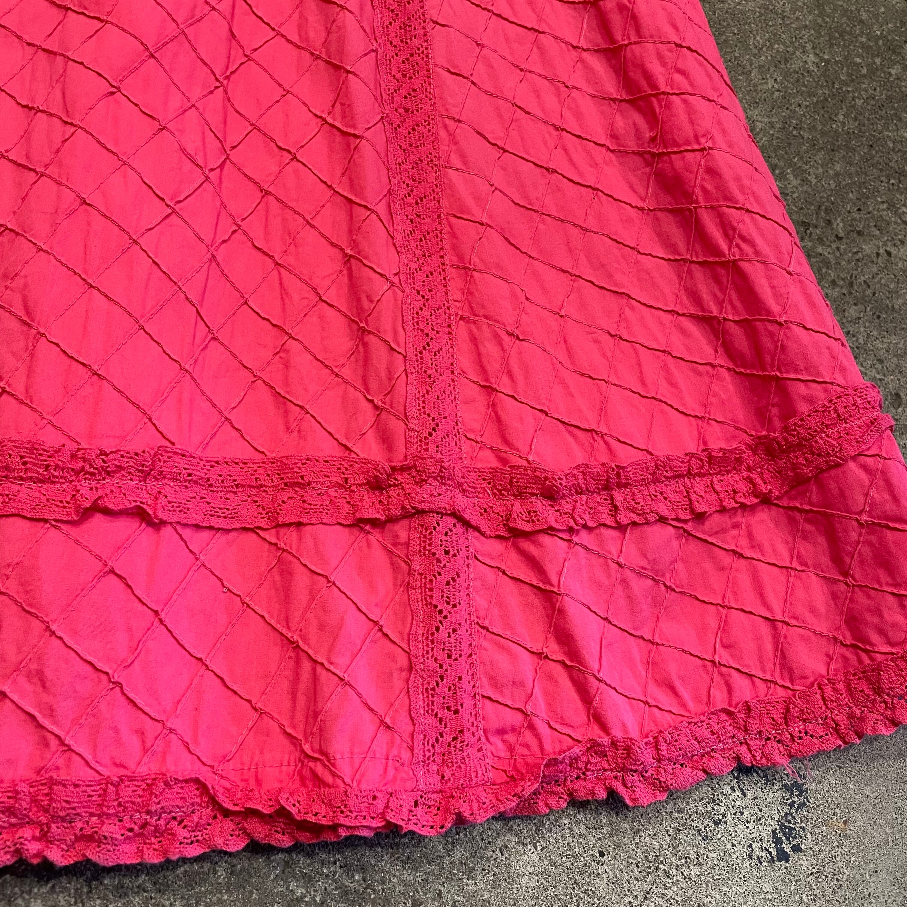 格子状に縫って模様になっている生地とコットンレースがとても素敵で大人っぽいのですが、鮮やかなピンクが弾けていてかわいらしく、着ているだけでテンションの上がるワンピースです。