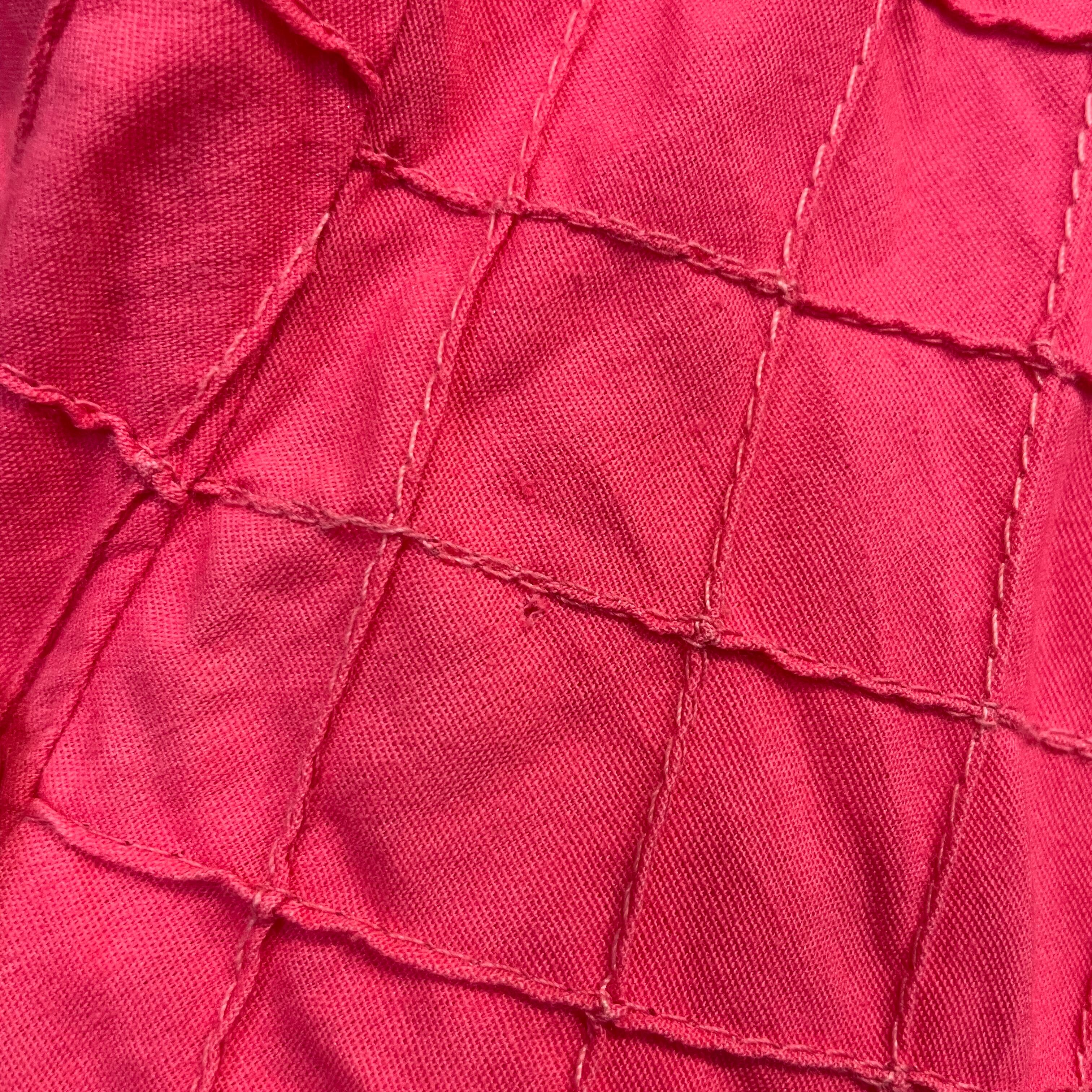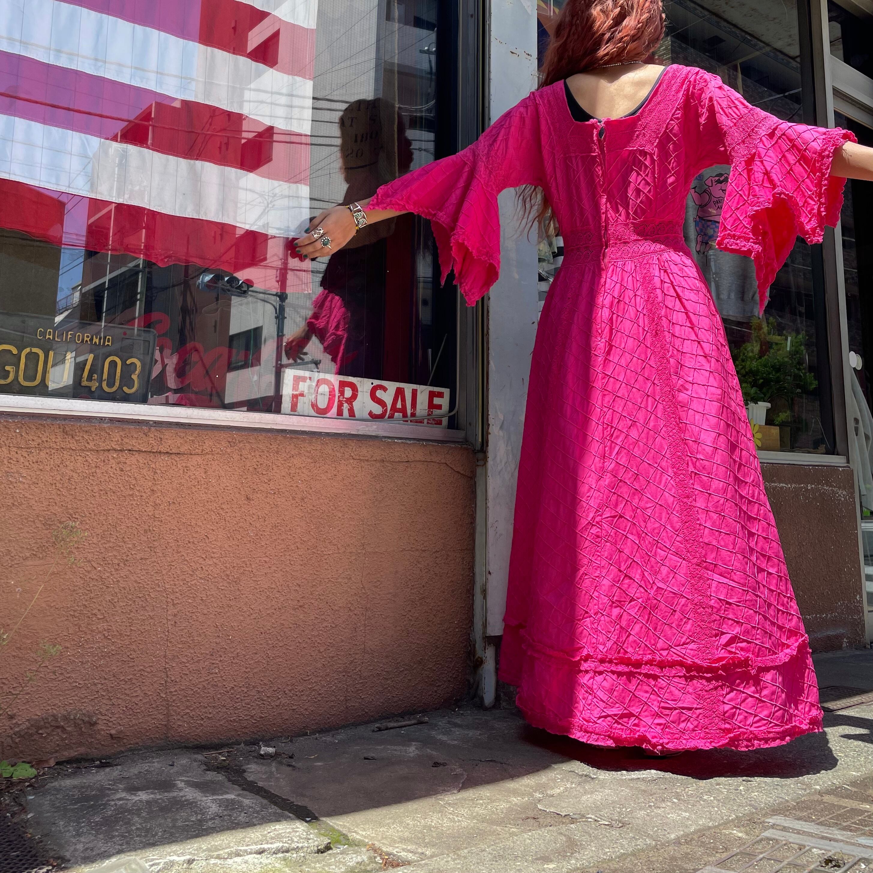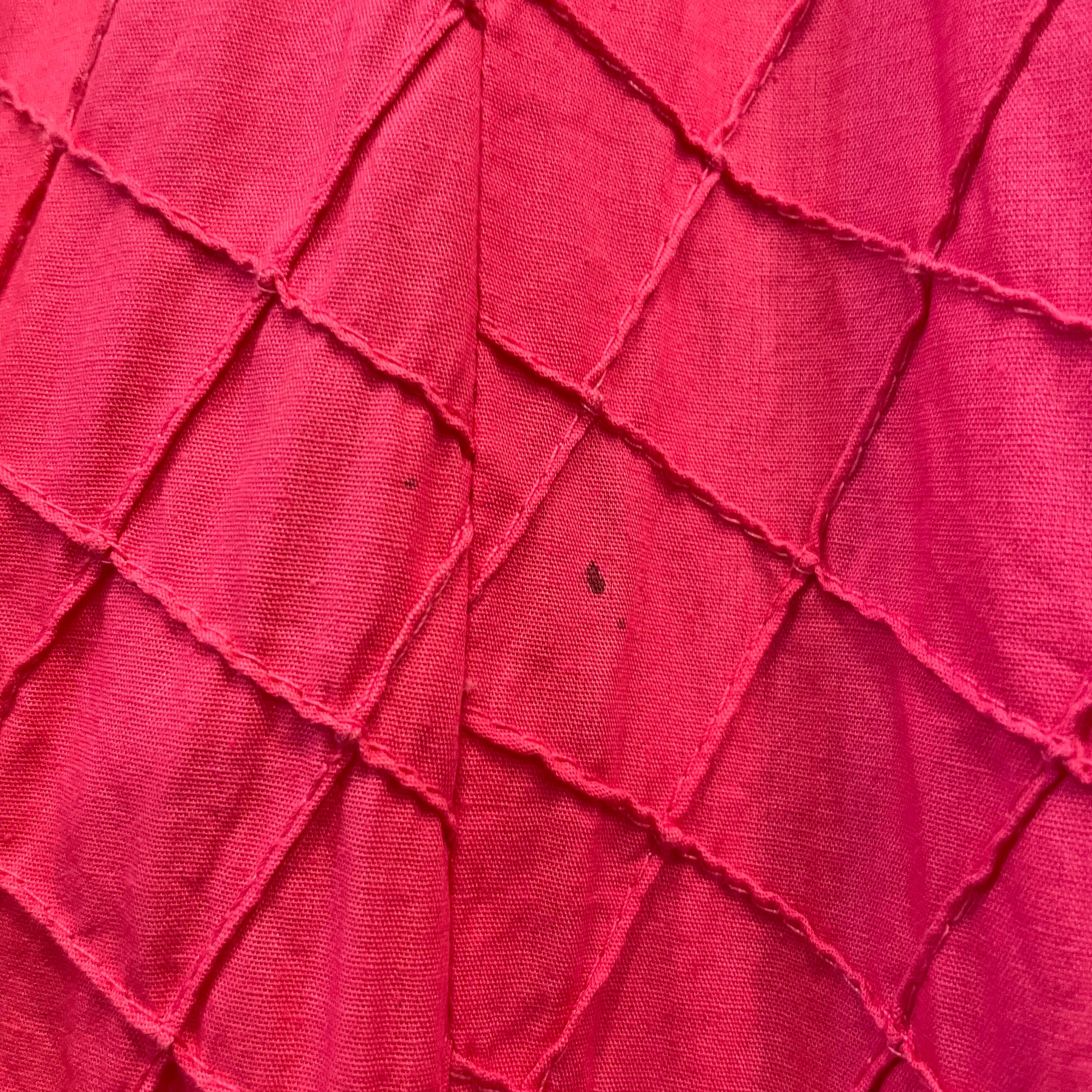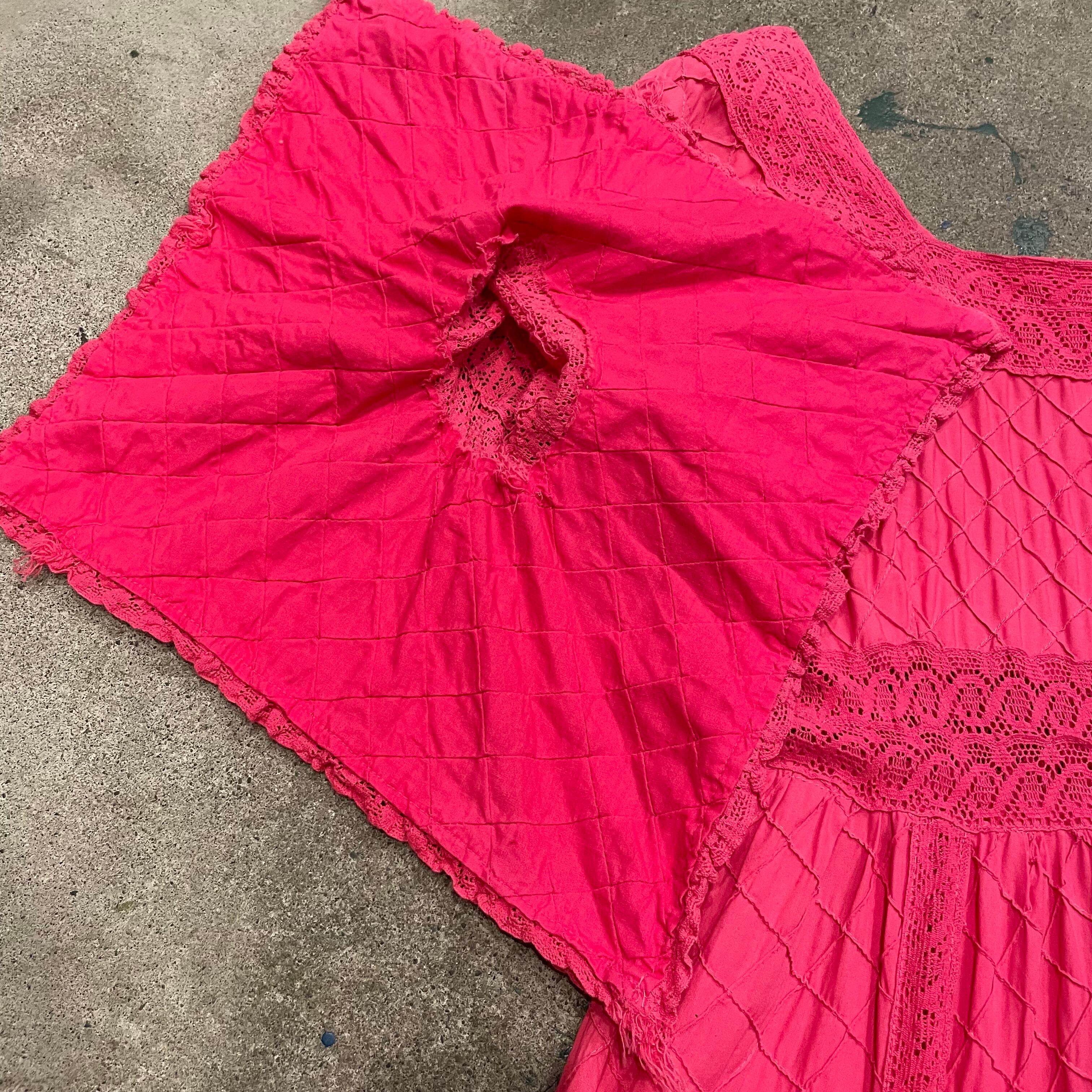 格子状に縫って模様になっている生地とコットンレースがとても素敵で大人っぽいのですが、鮮やかなピンクが弾けていてかわいらしく、着ているだけでテンションの上がるワンピースです。