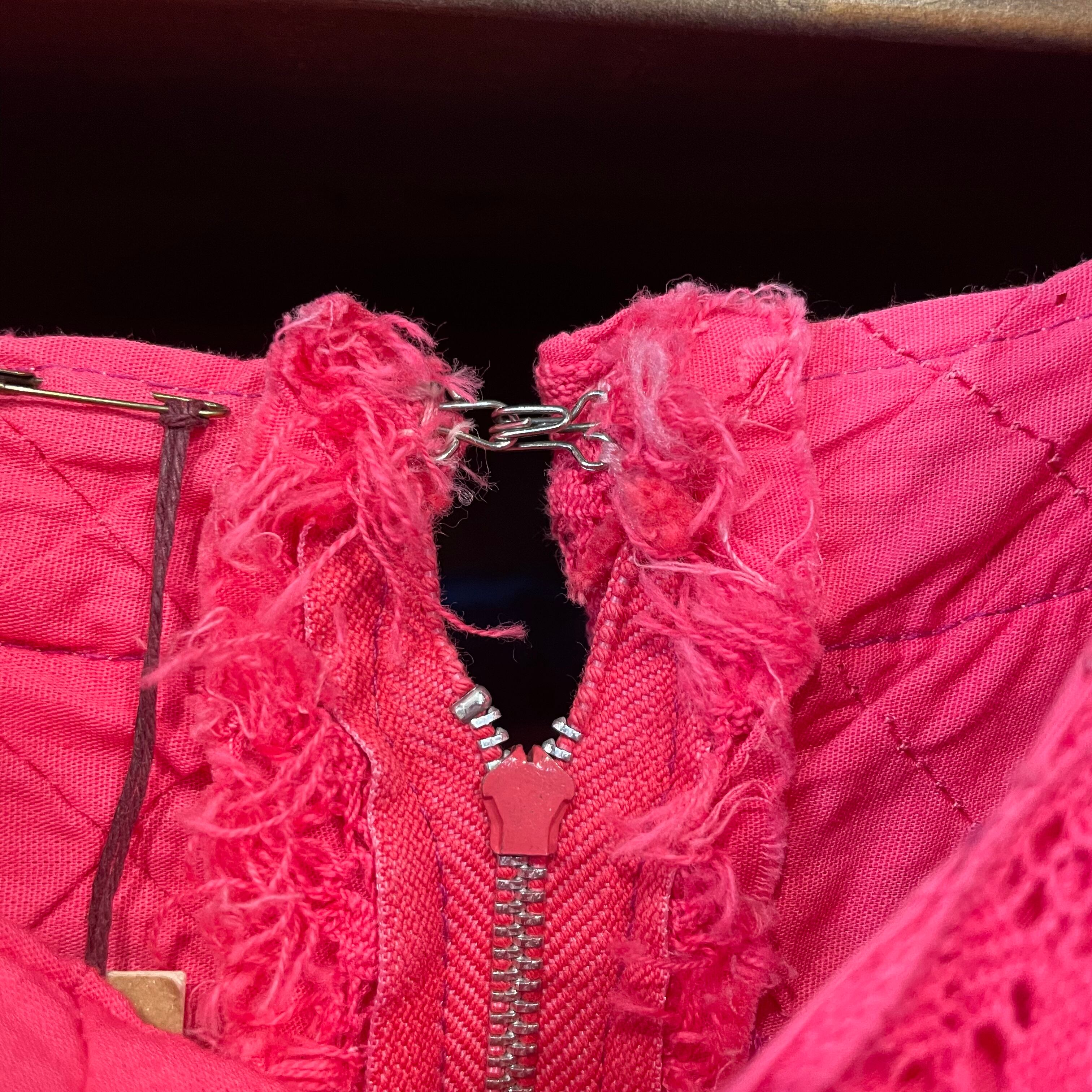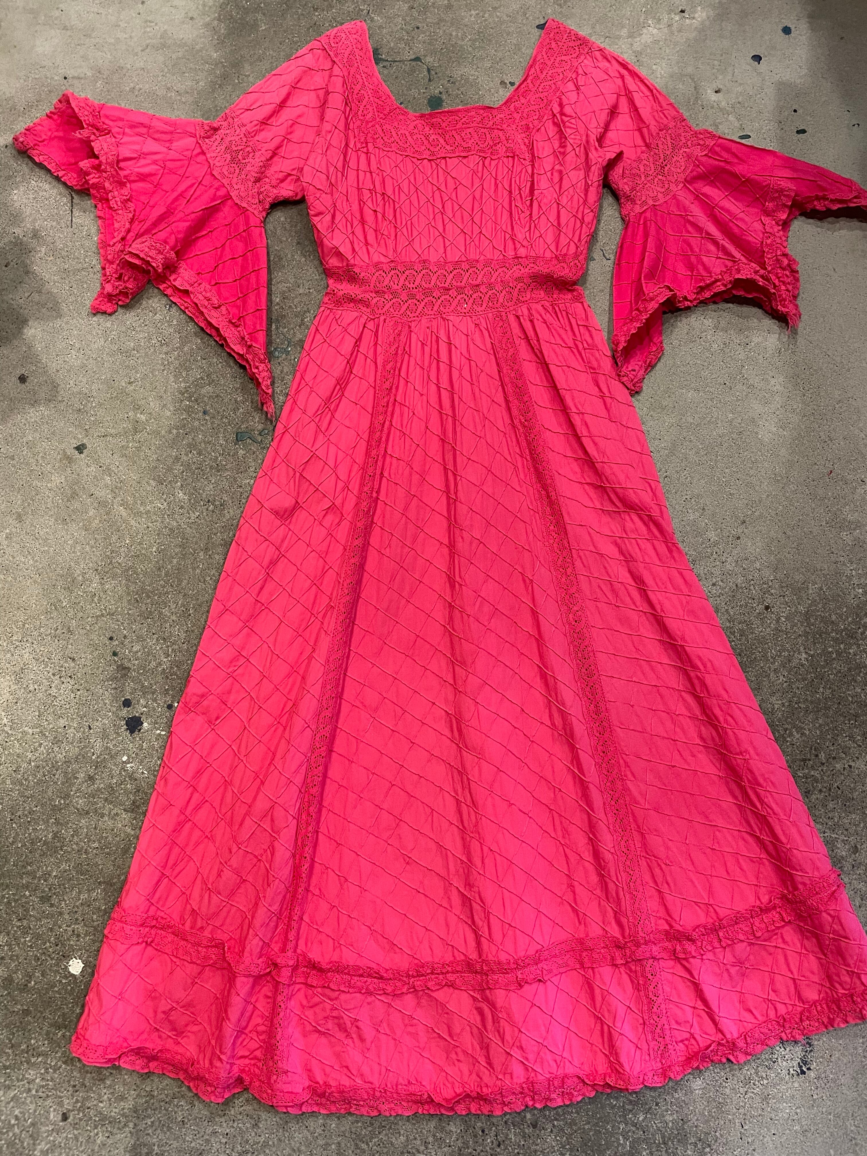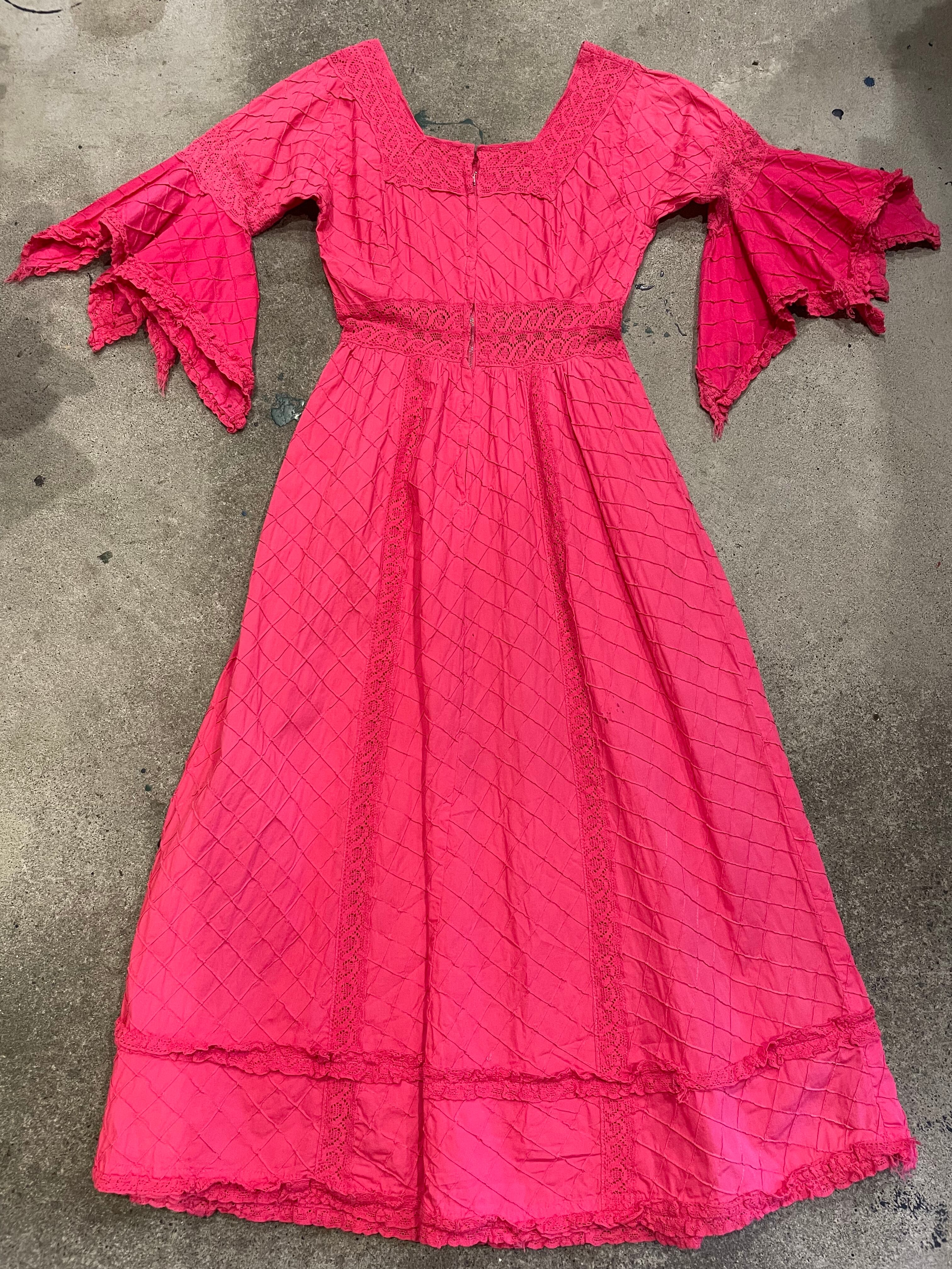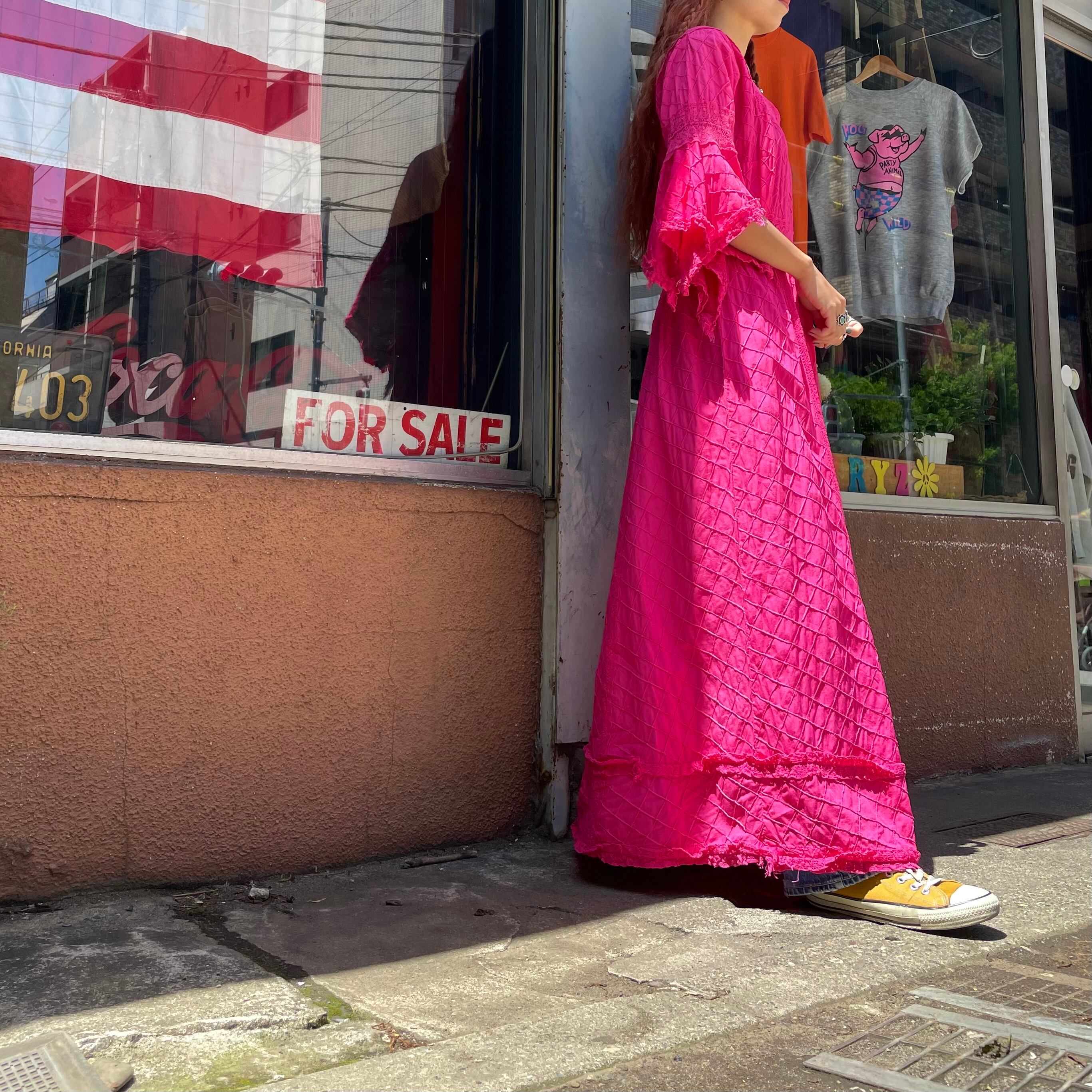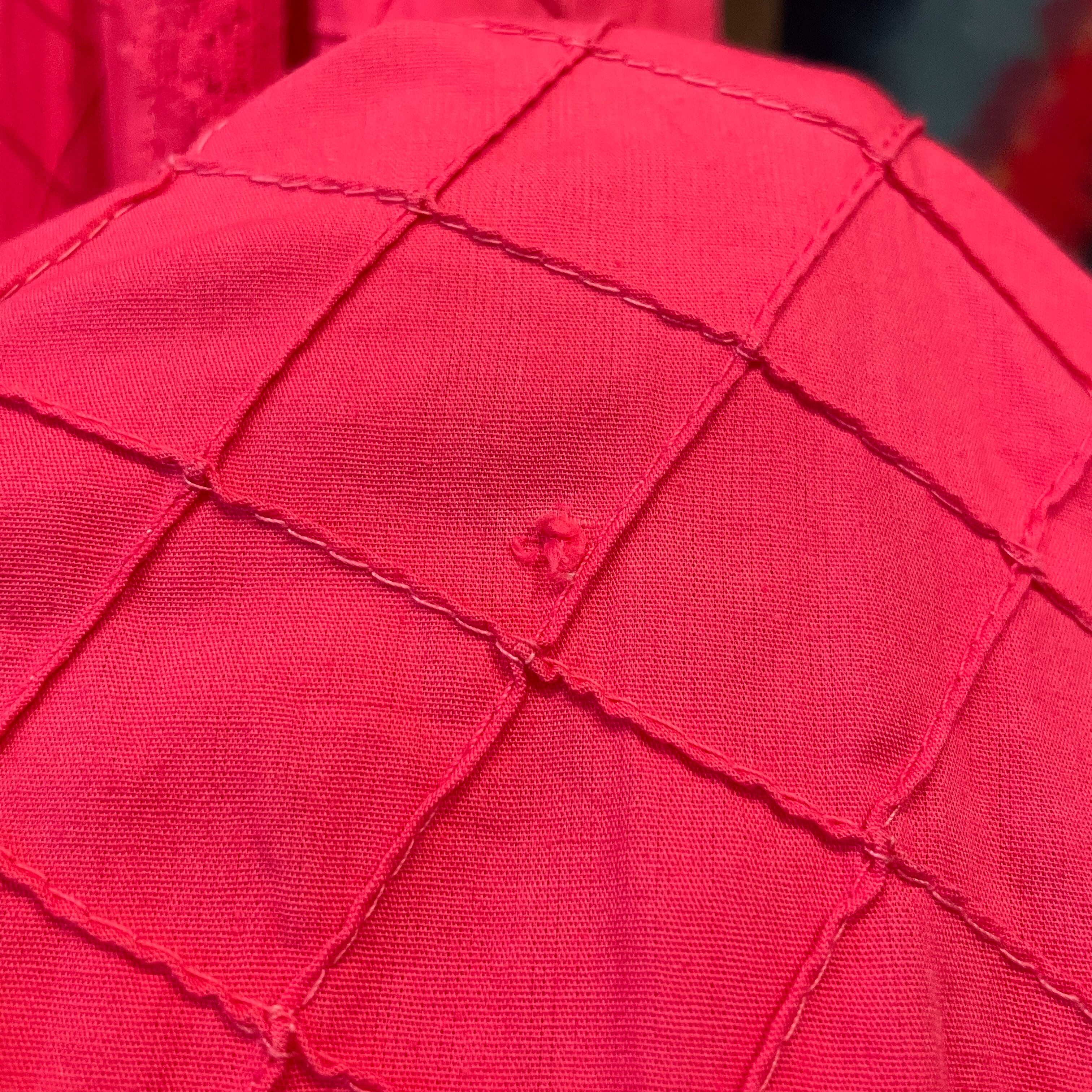 格子状に縫って模様になっている生地とコットンレースがとても素敵で大人っぽいのですが、鮮やかなピンクが弾けていてかわいらしく、着ているだけでテンションの上がるワンピースです。