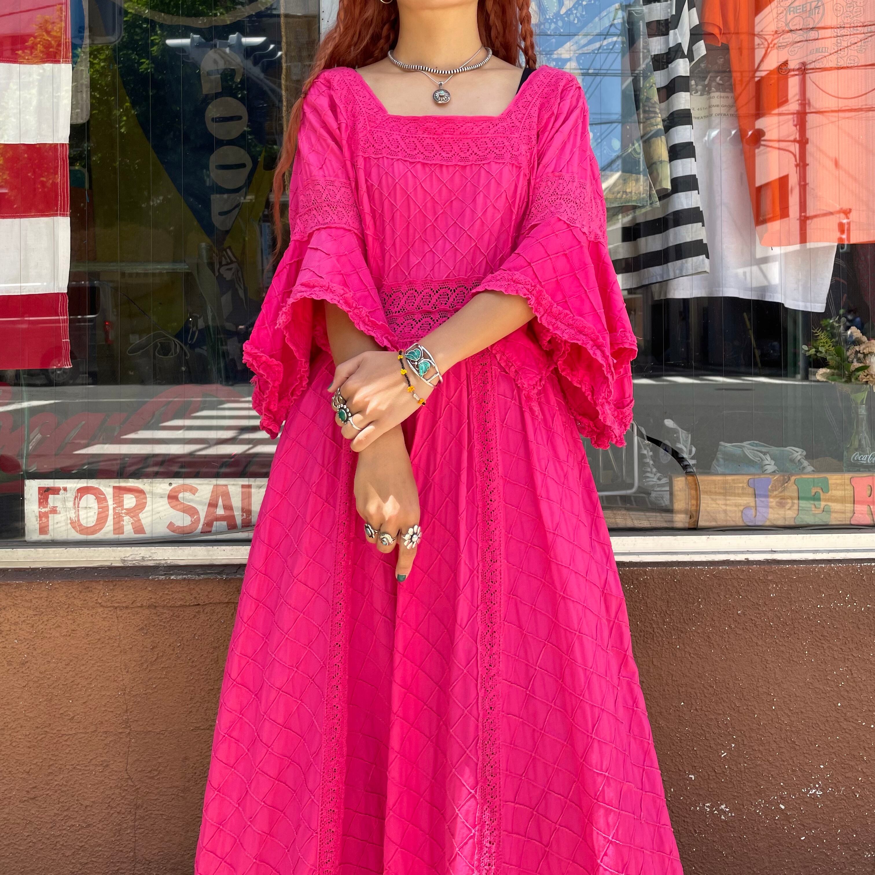 おそらく60年代柄のメキシコ製のワンピースです。広めのスクエアネックに形が素敵なアンブレラスリーブ、きれいなシルエットでとても美しい一着です。
