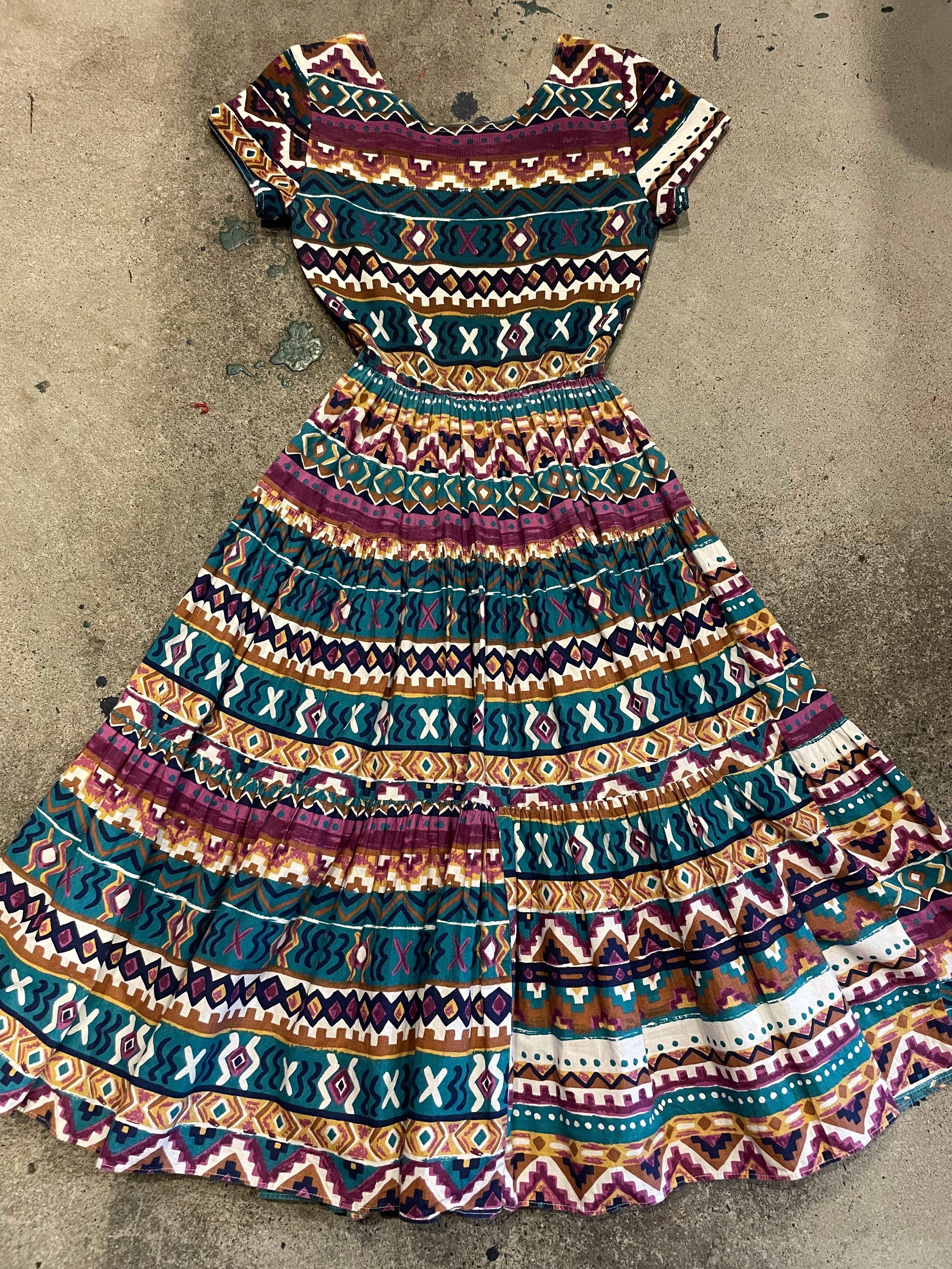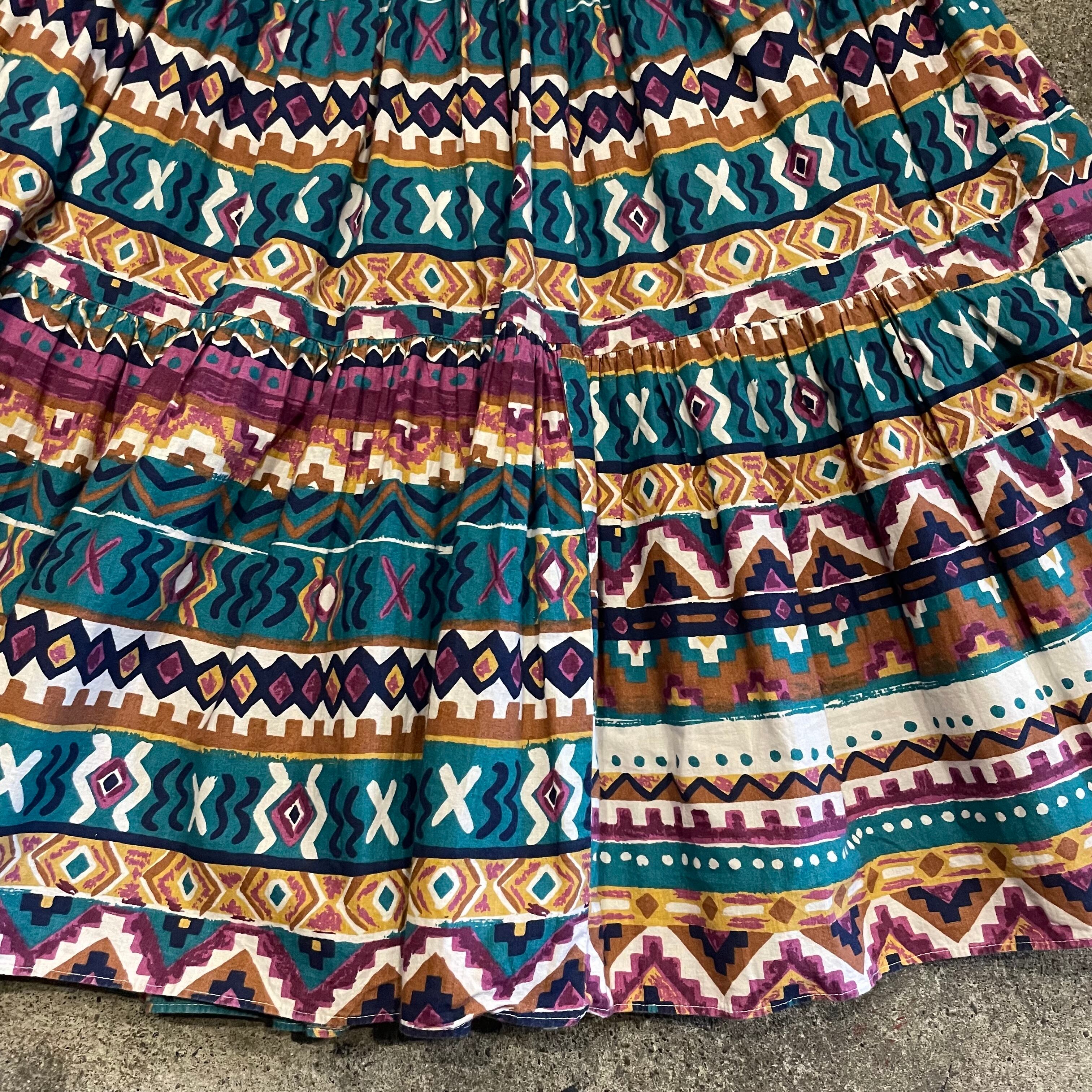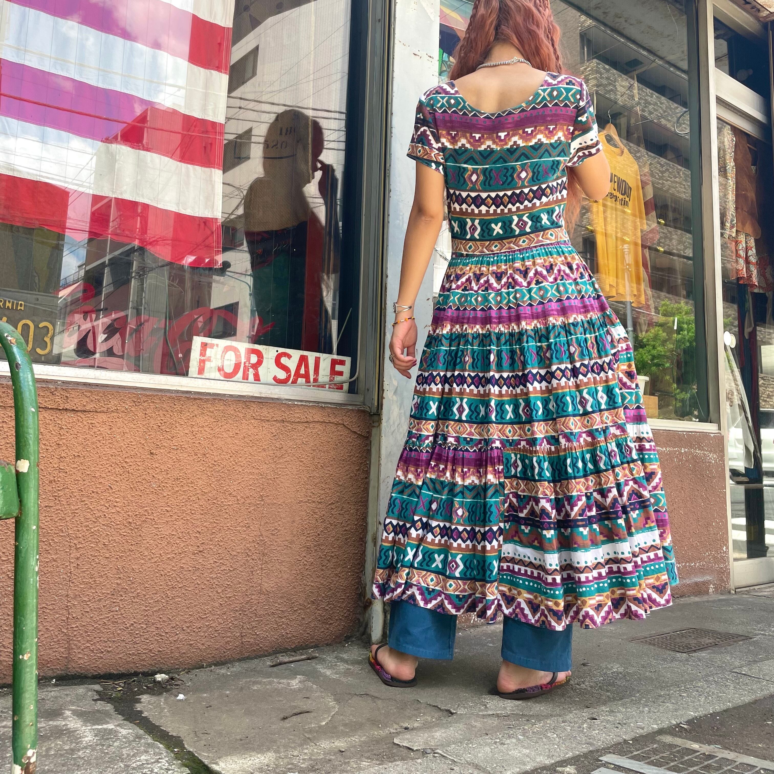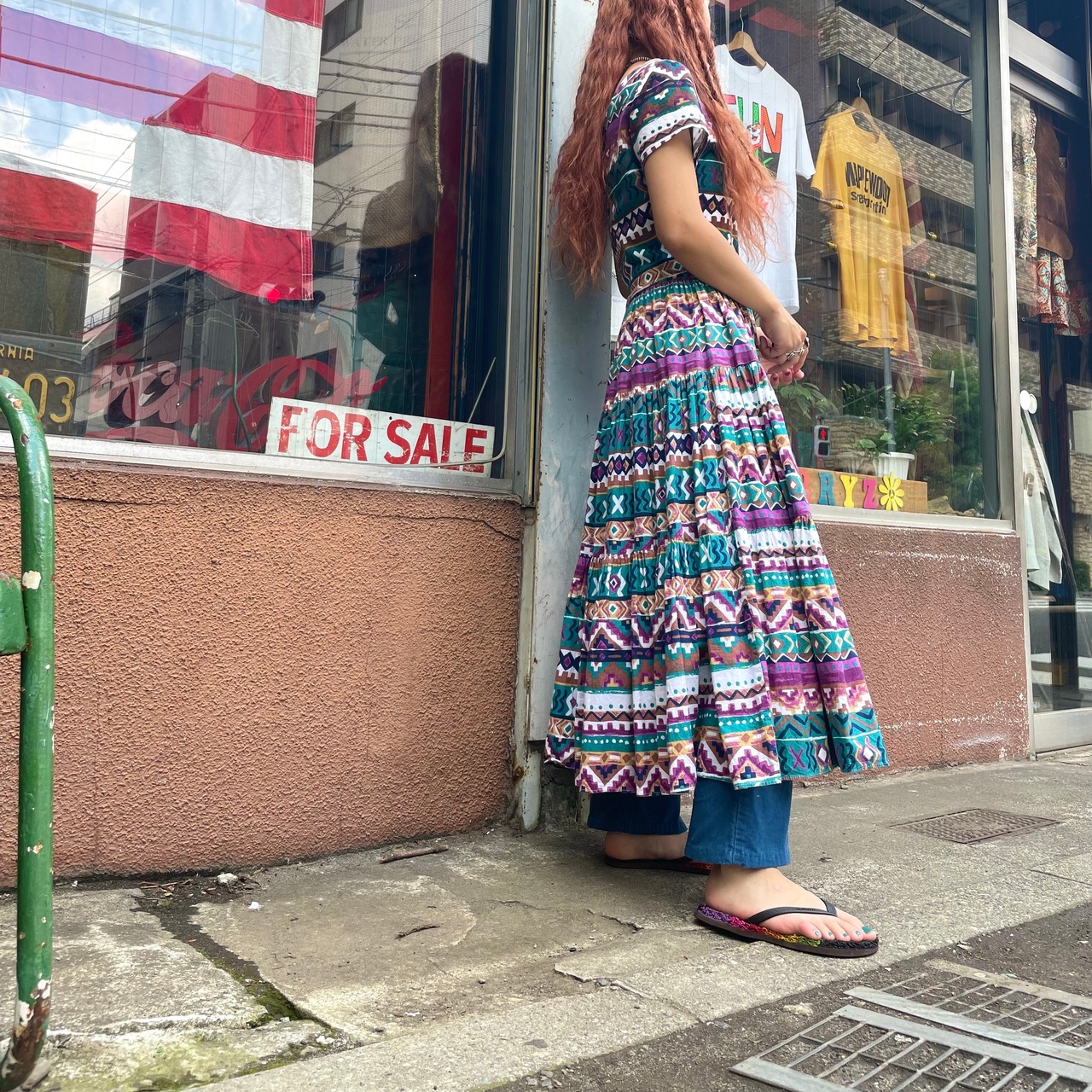 ネイティブ柄っぽい総柄も弾けていてかわいいですし、ウエストきゅっからのスカート部分のボリューム感がたまらないかわいさです。踊り出したくなるようなシルエットでトキメキます。