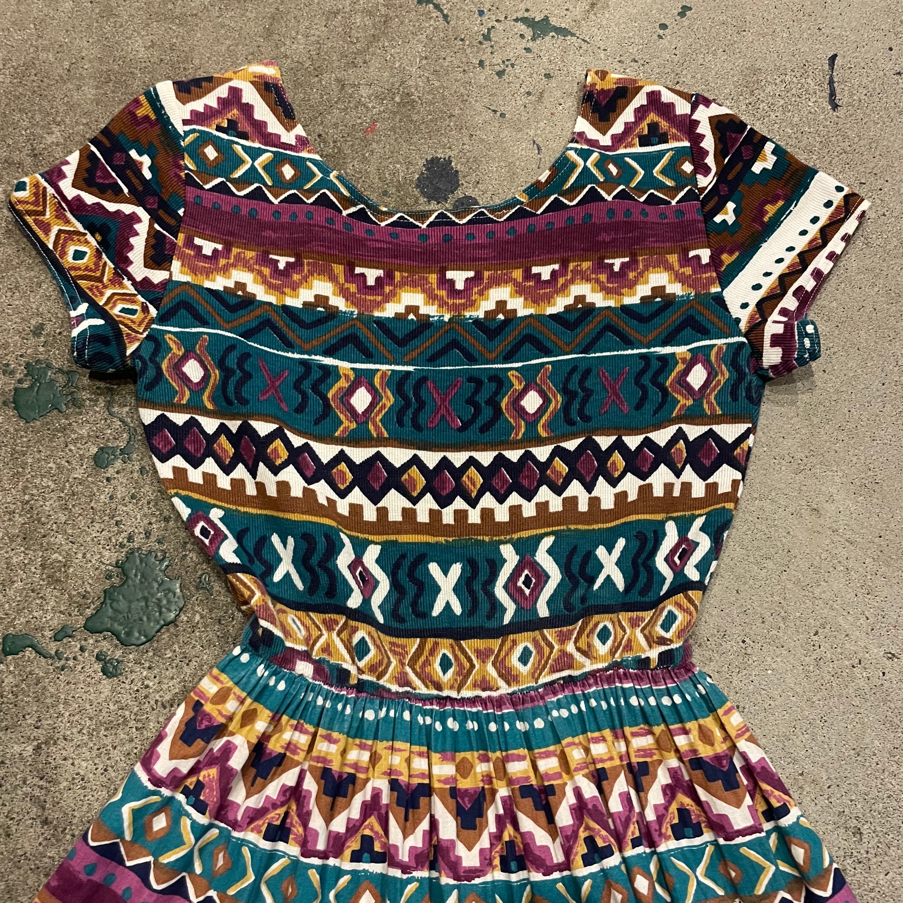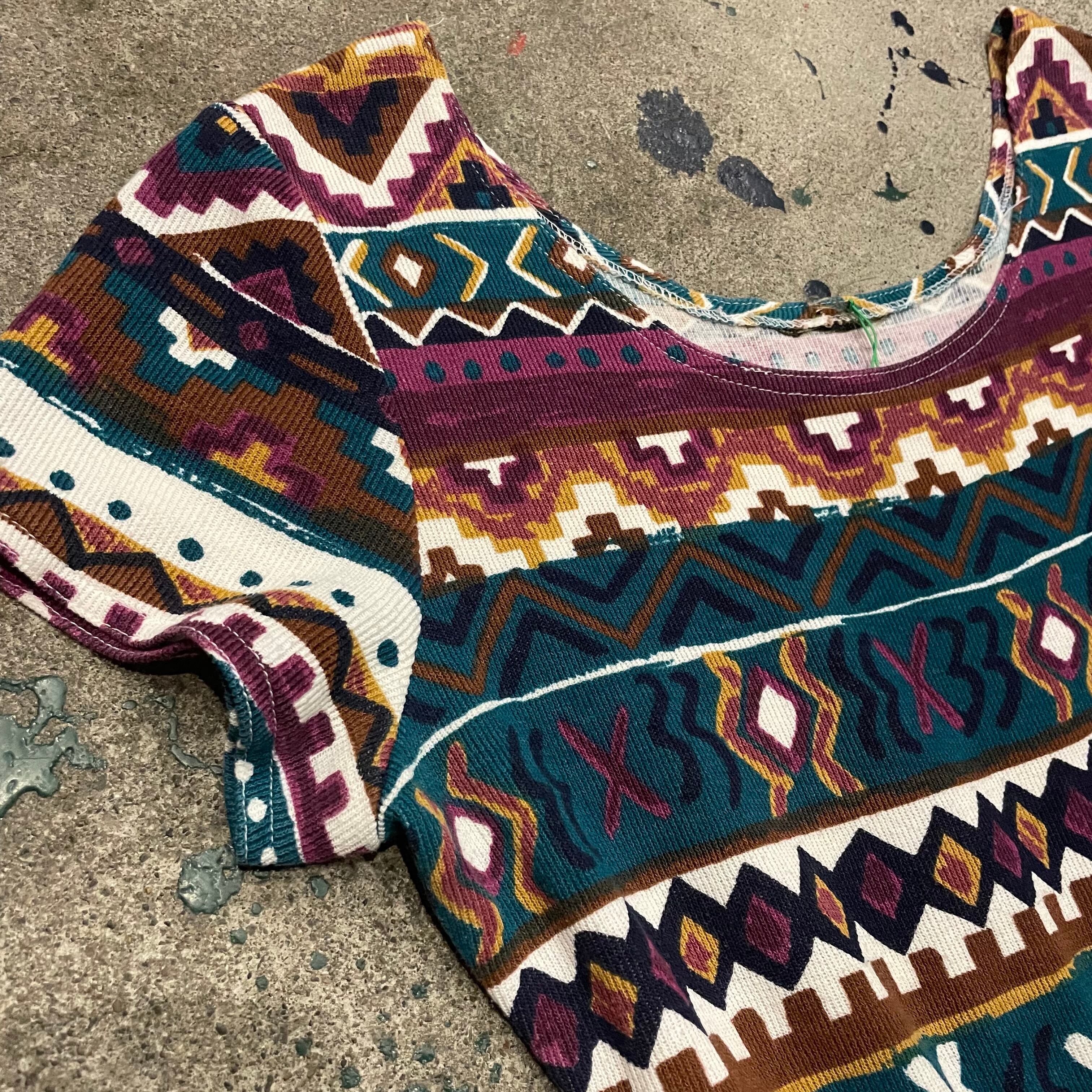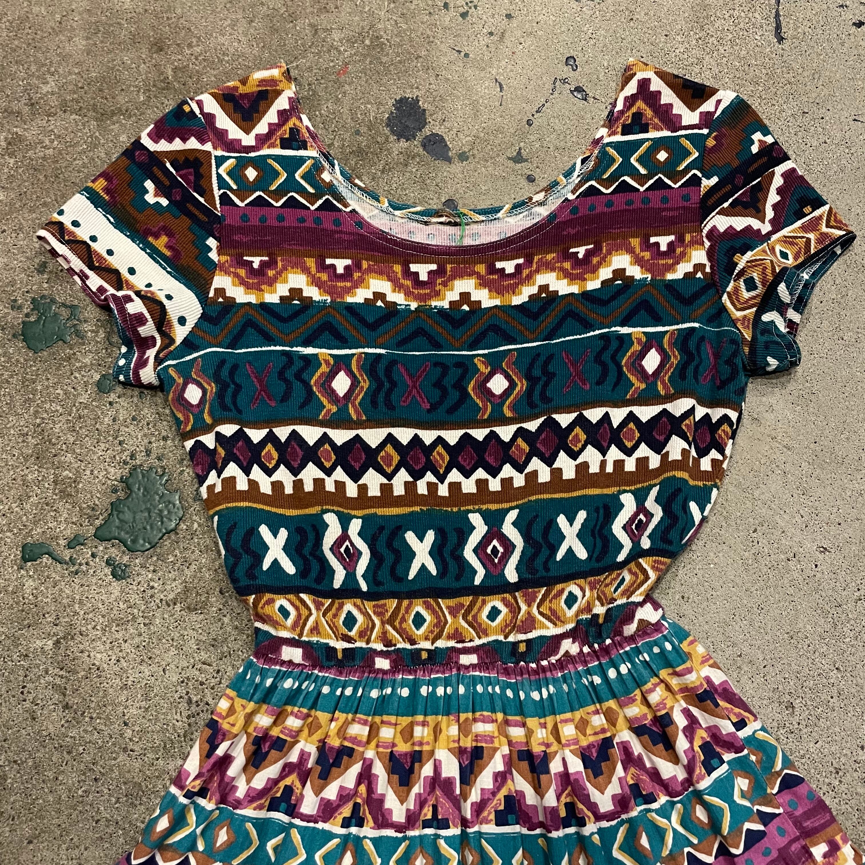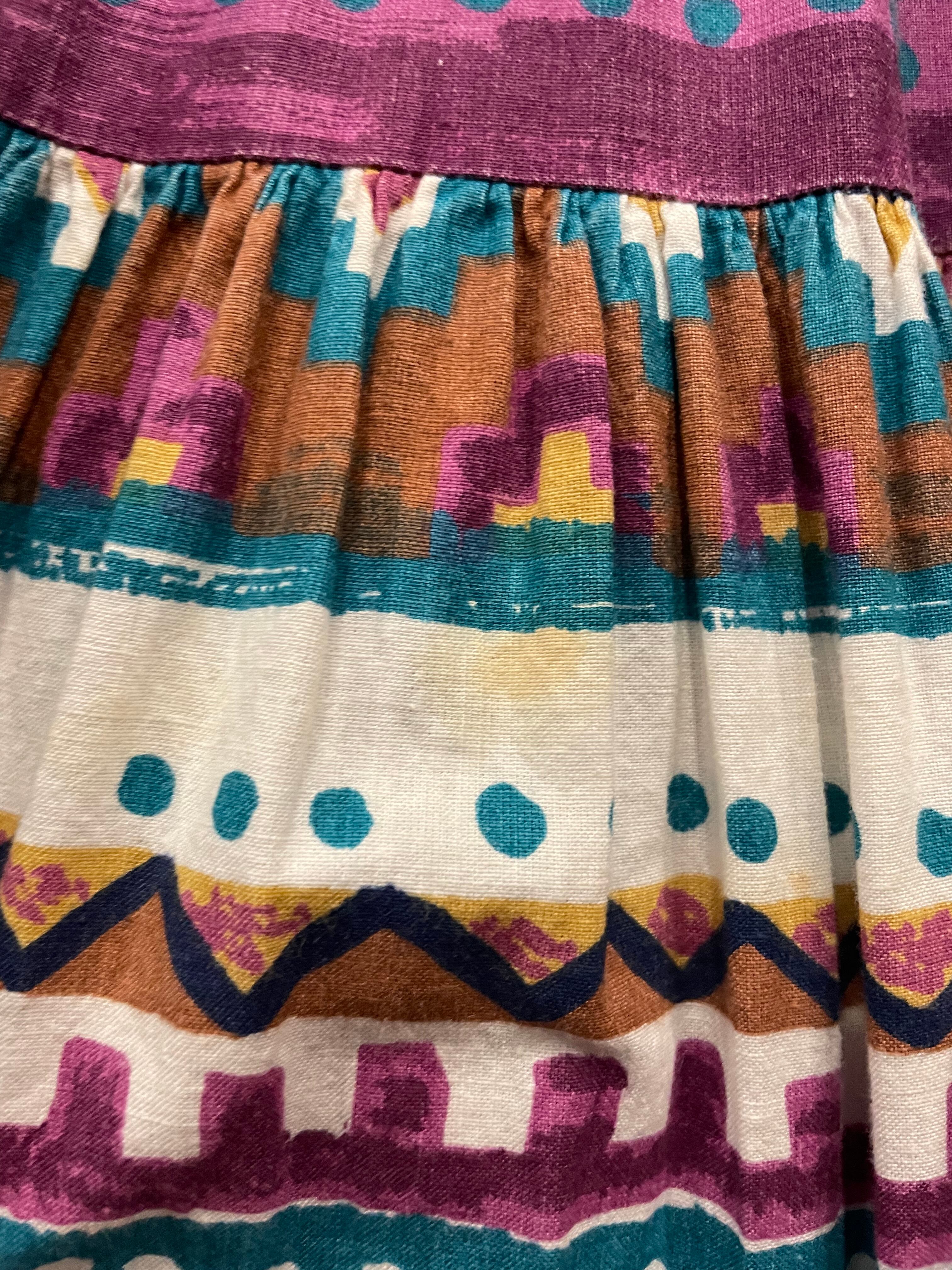 ネイティブ柄っぽい総柄も弾けていてかわいいですし、ウエストきゅっからのスカート部分のボリューム感がたまらないかわいさです。踊り出したくなるようなシルエットでトキメキます。