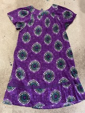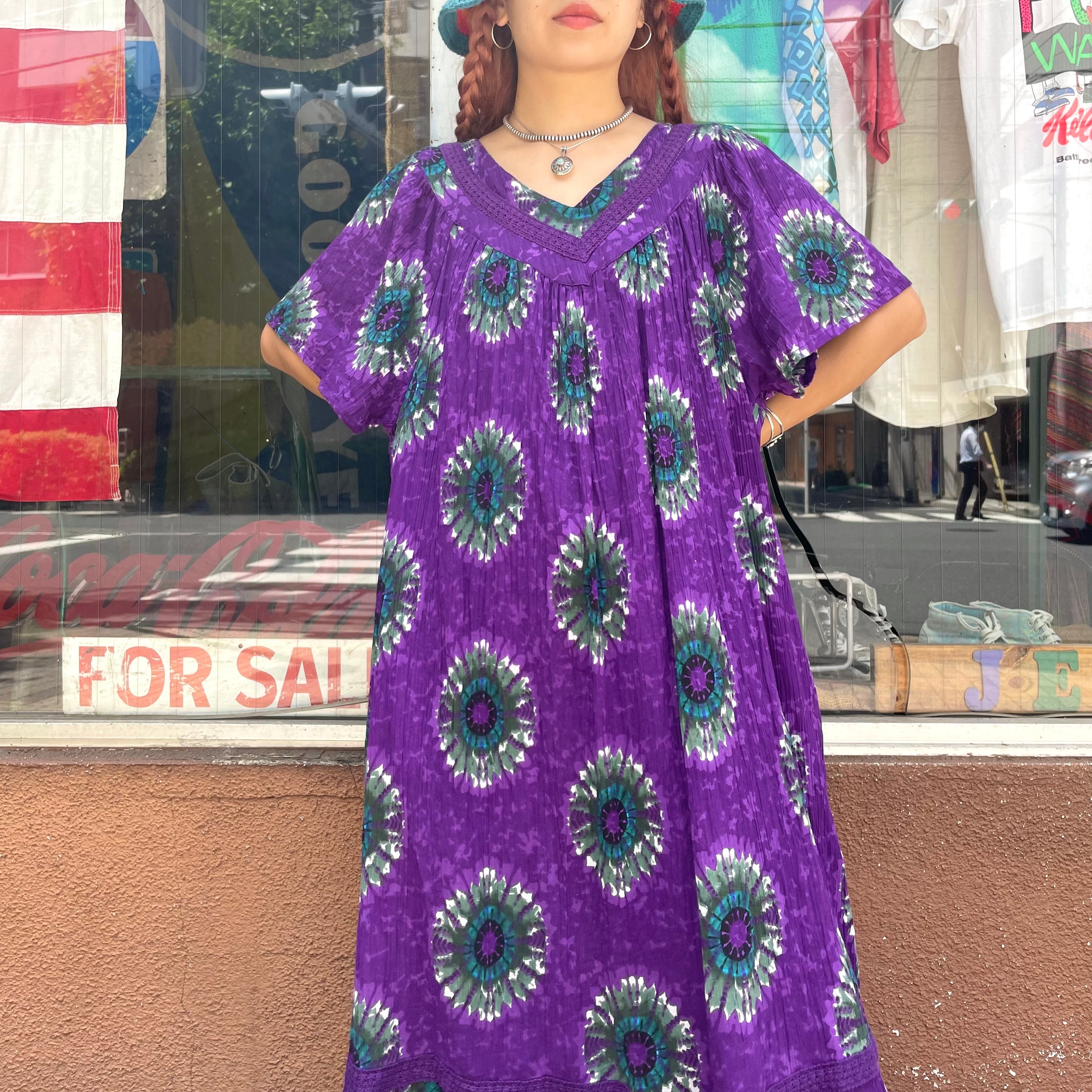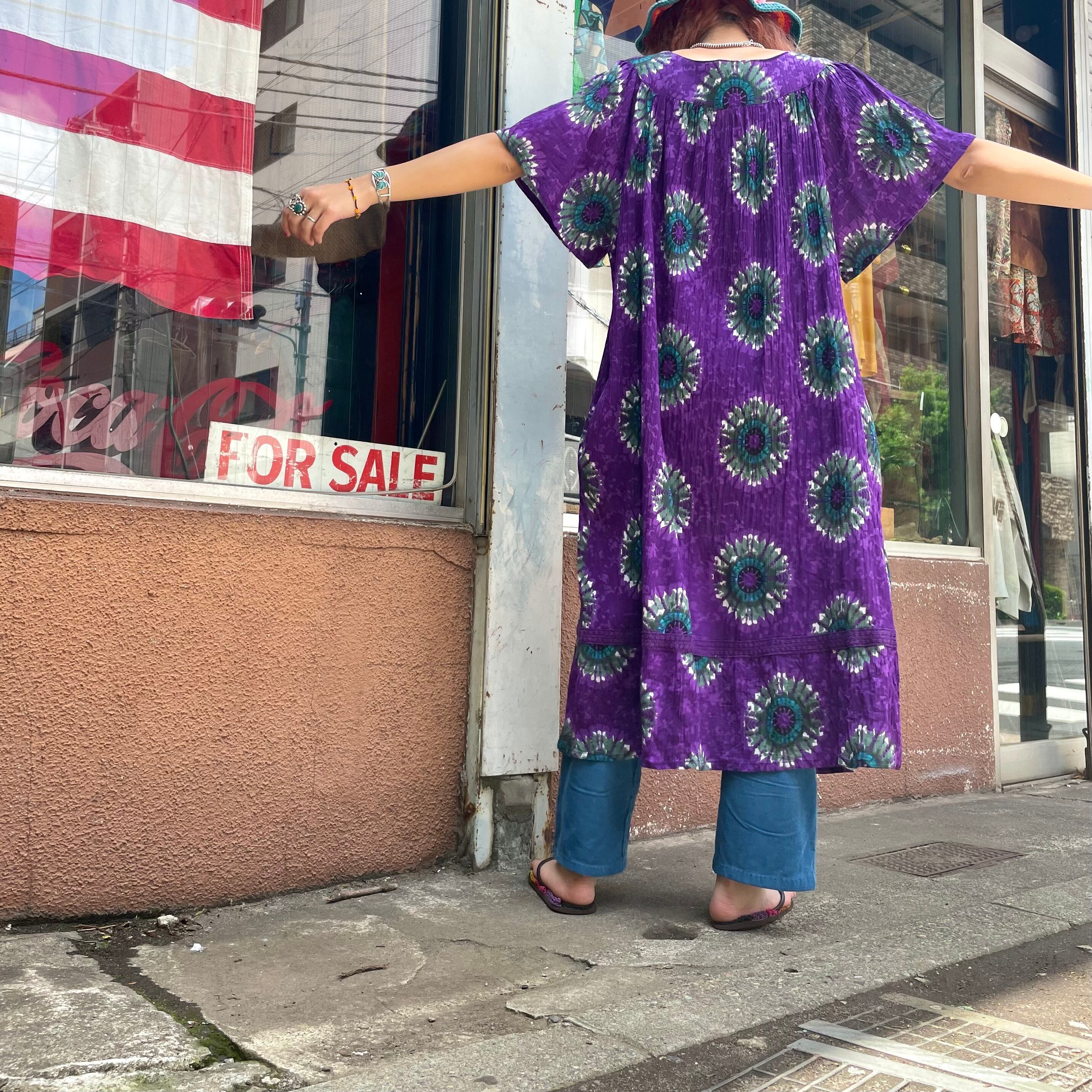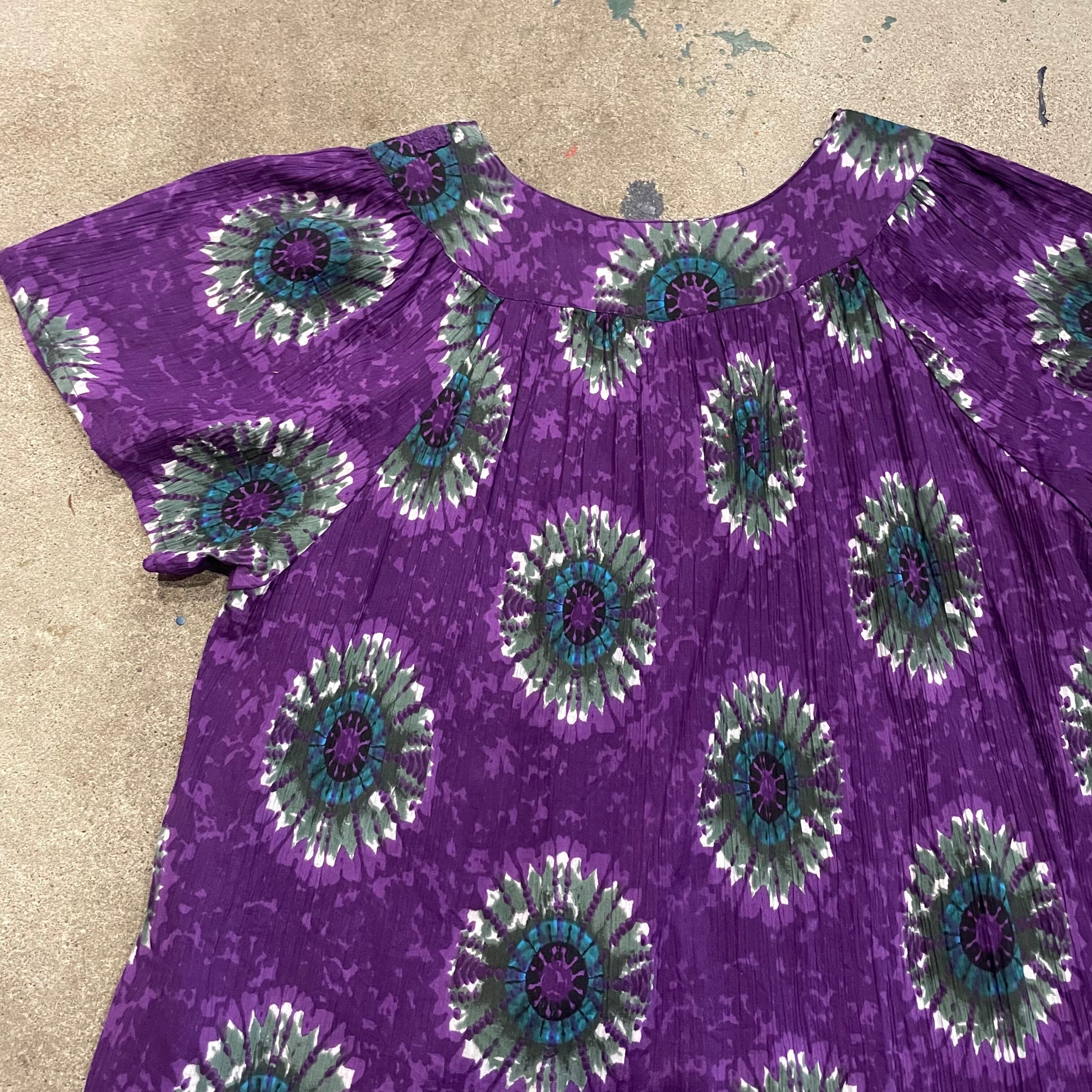 紫地に絶妙なグリーンとブルーのお花の模様がかわいいワンピースです。とても綺麗で素敵な色の組み合わせです。