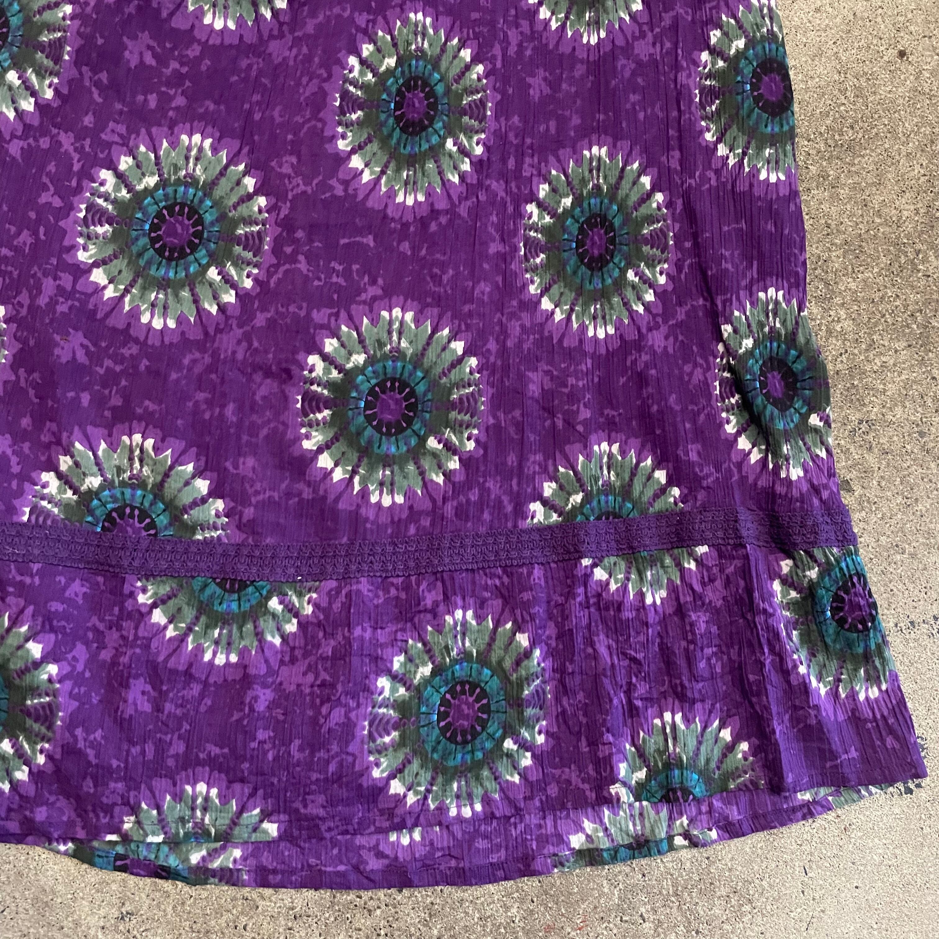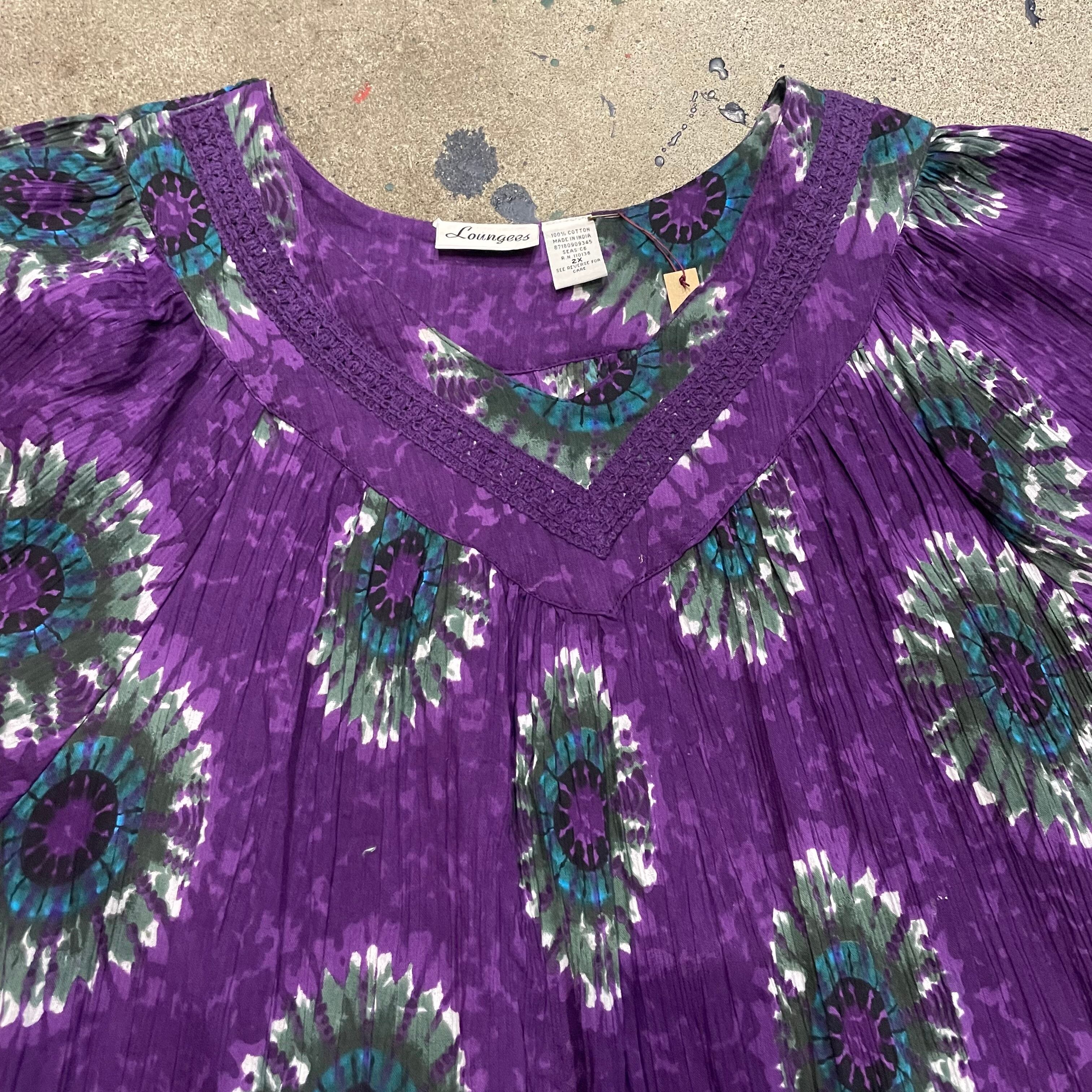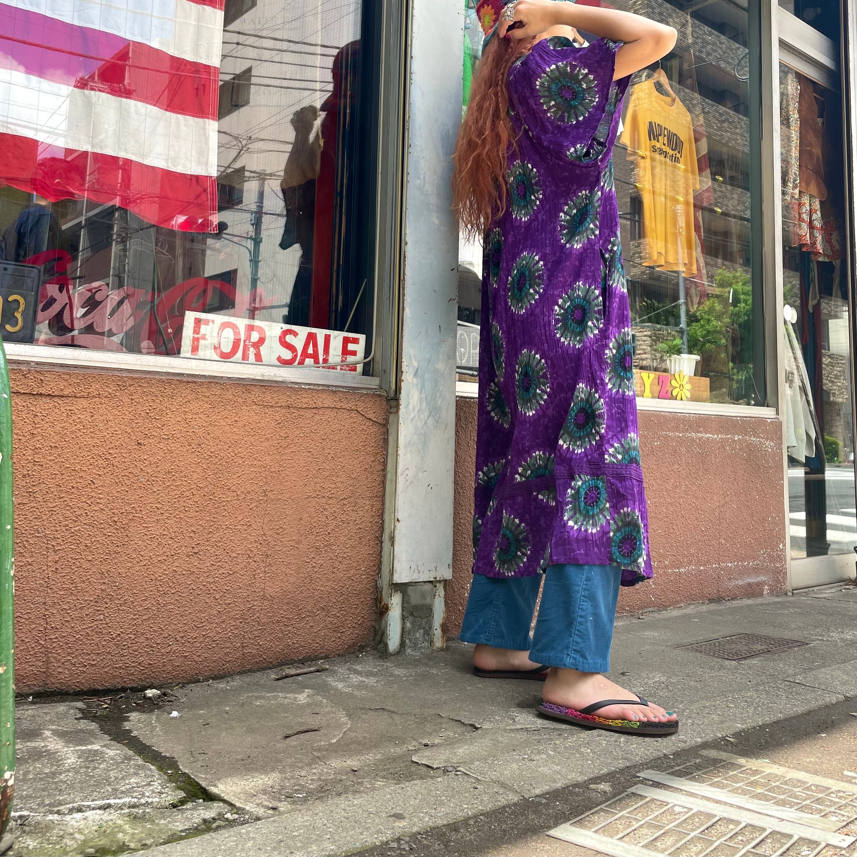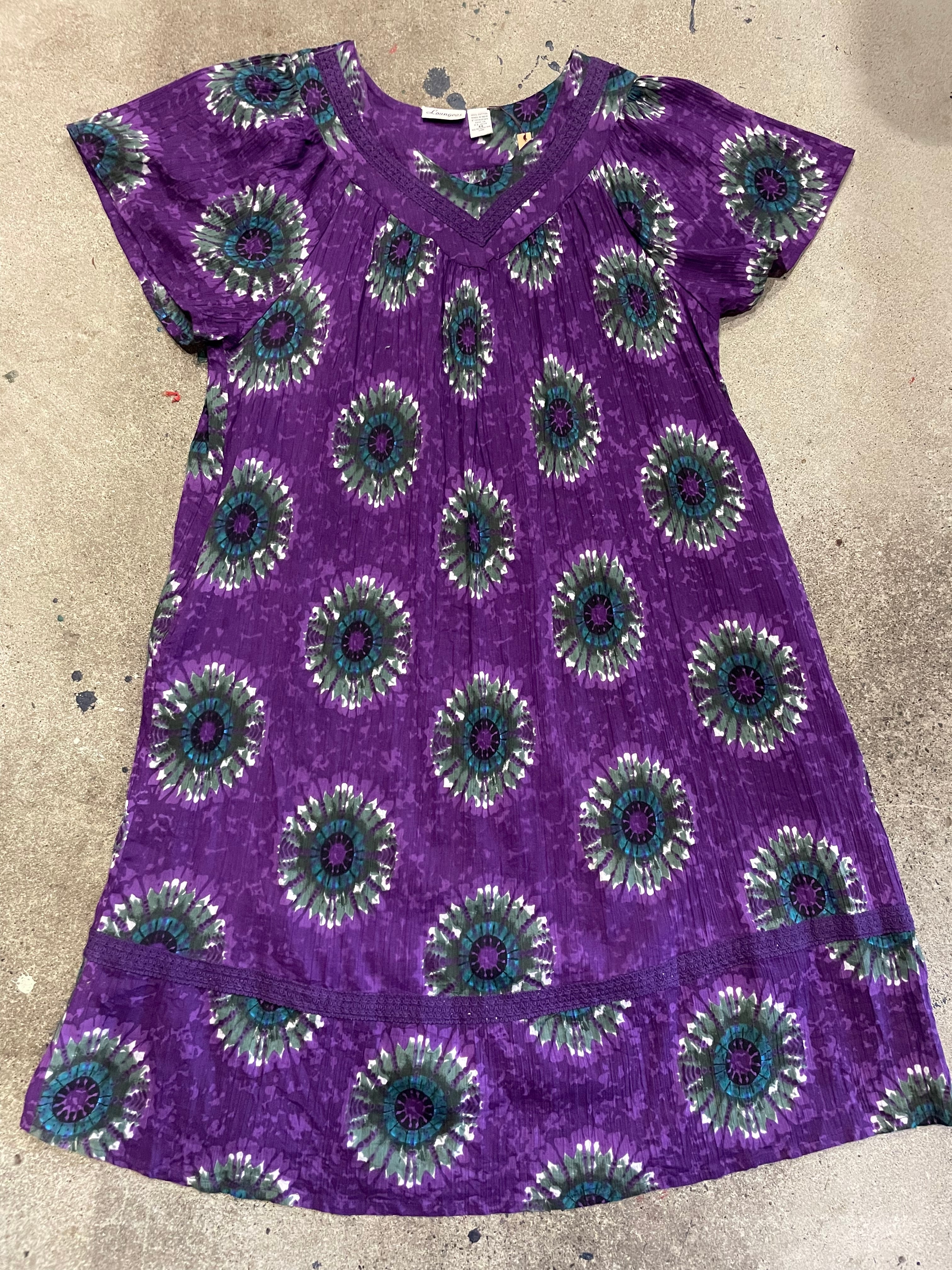 紫地に絶妙なグリーンとブルーのお花の模様がかわいいワンピースです。とても綺麗で素敵な色の組み合わせです。