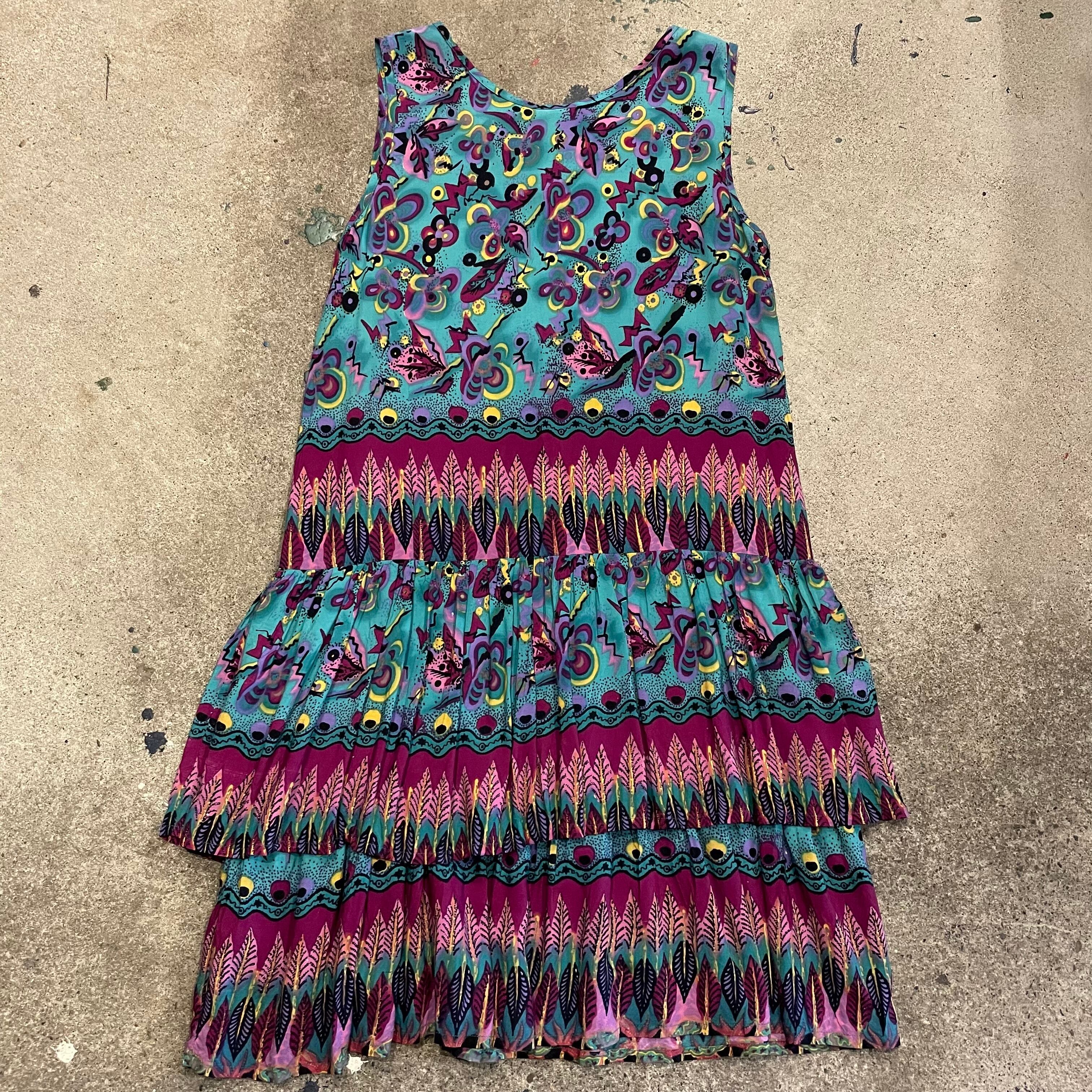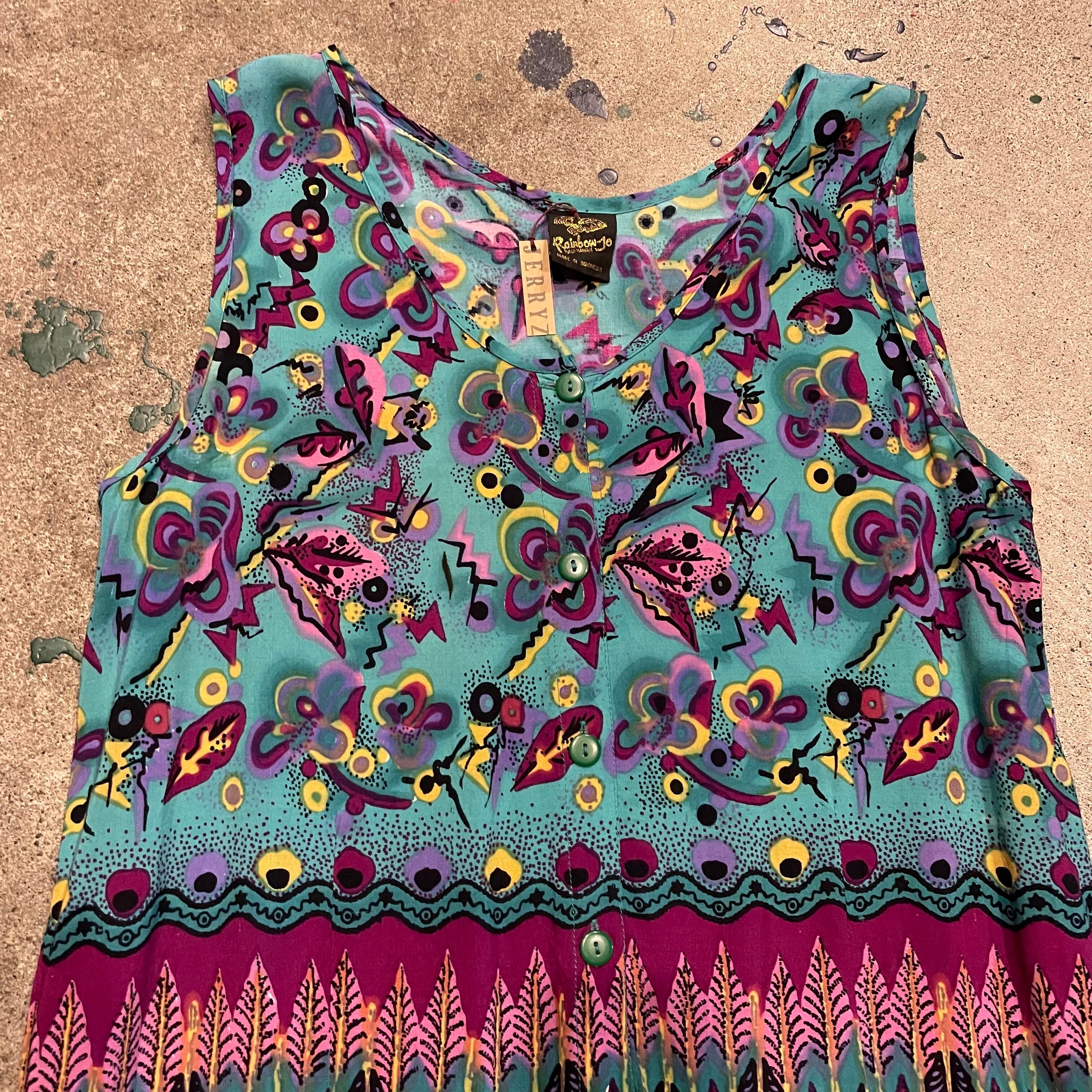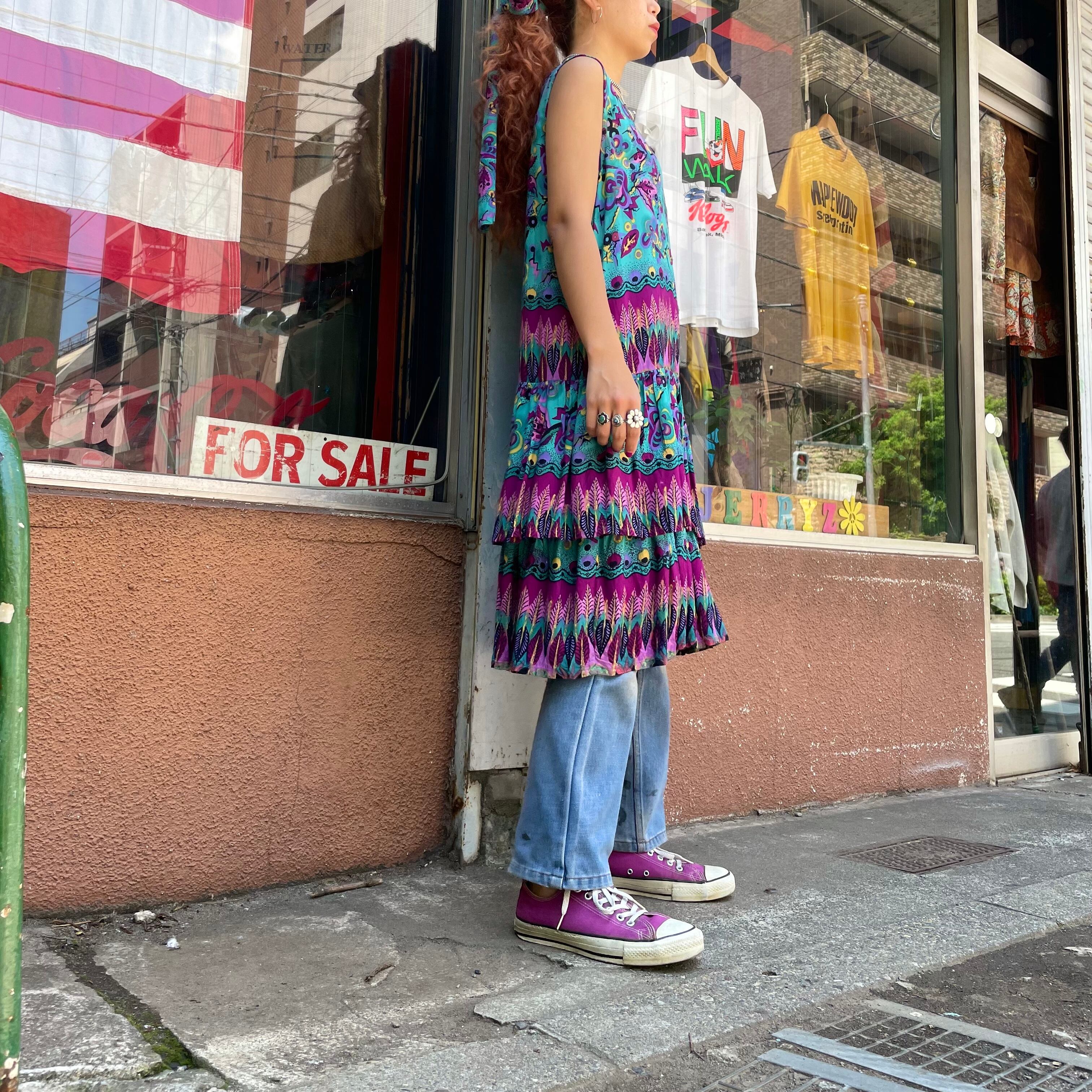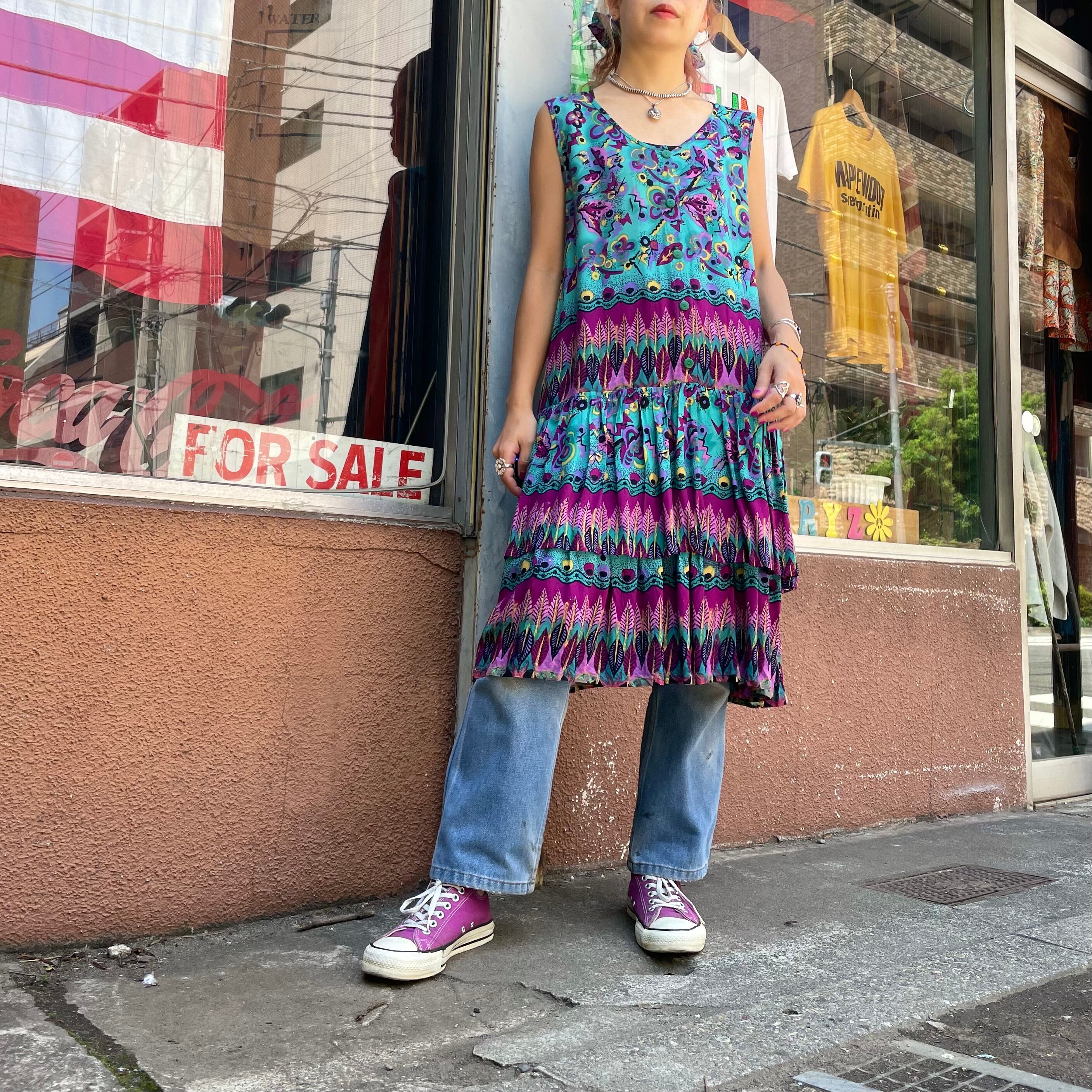 エメラルドグリーン×赤紫な色味がかわいいレーヨン素材のワンピースです。