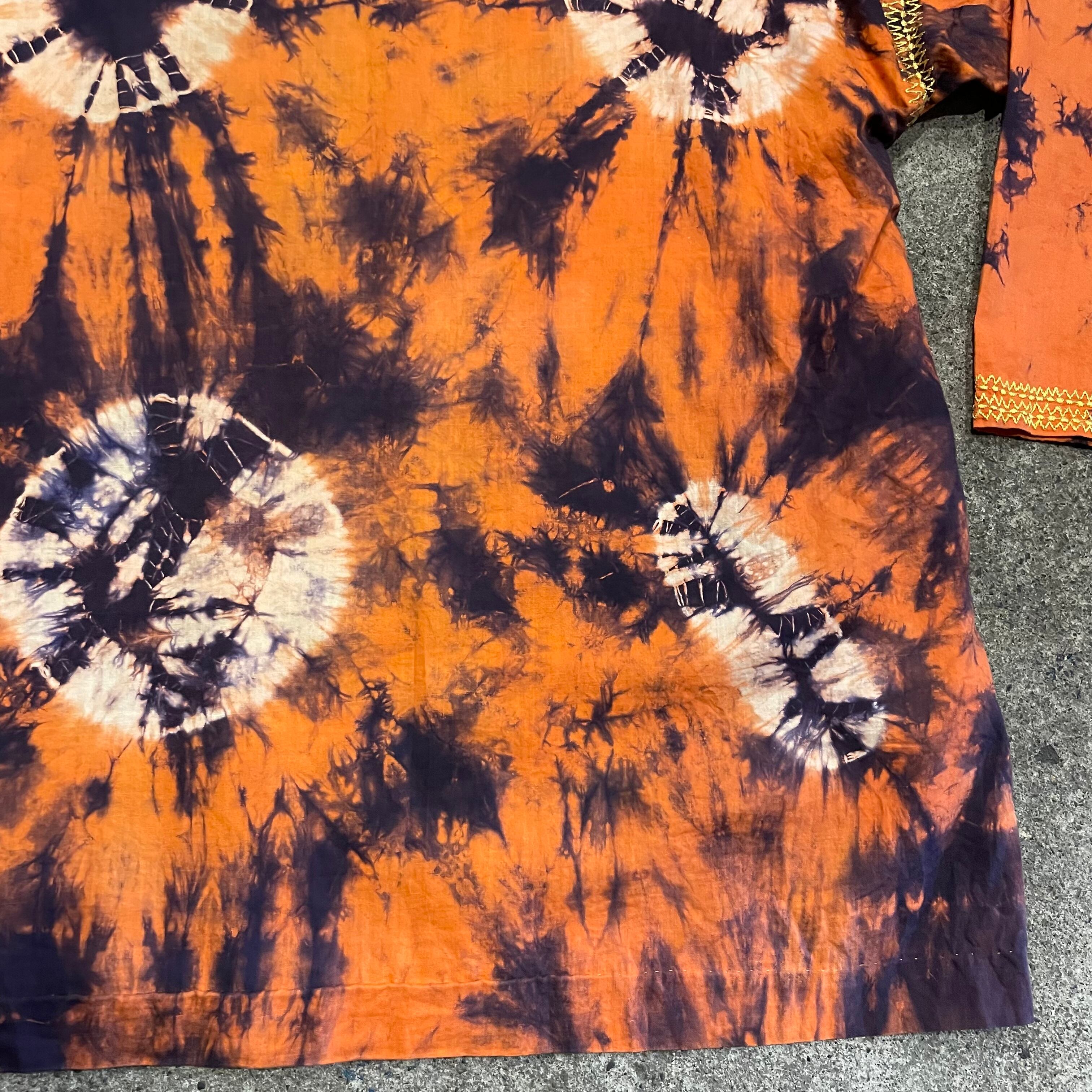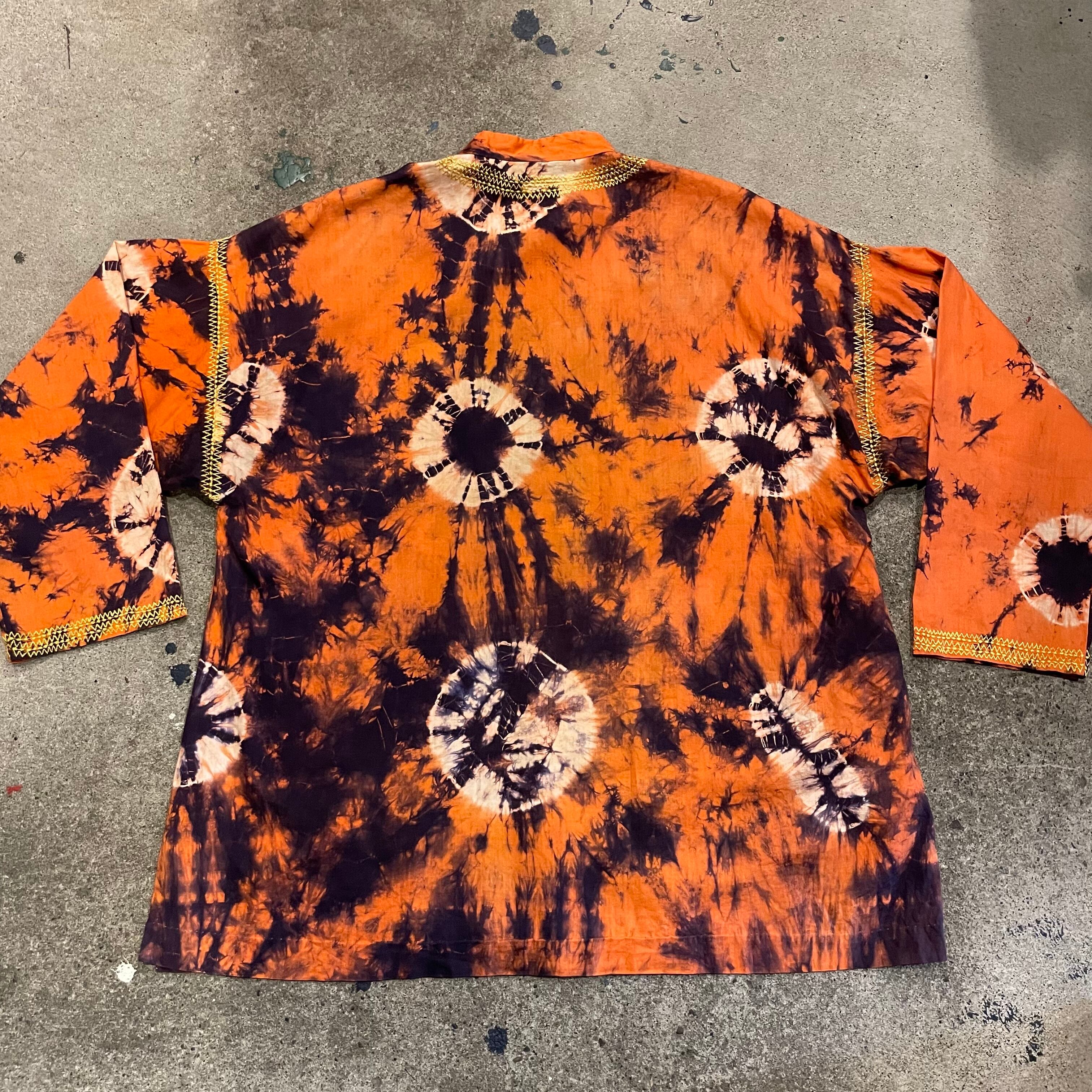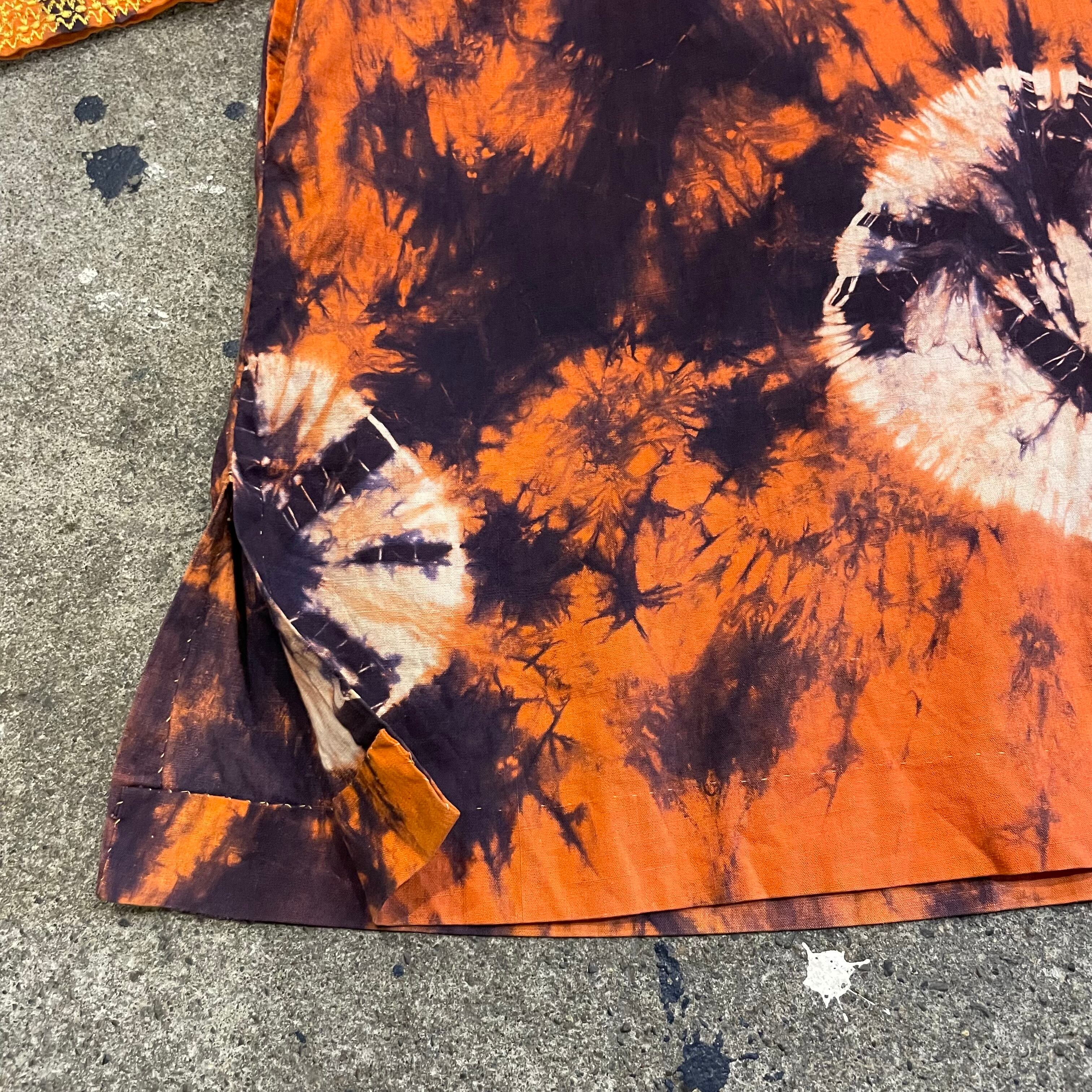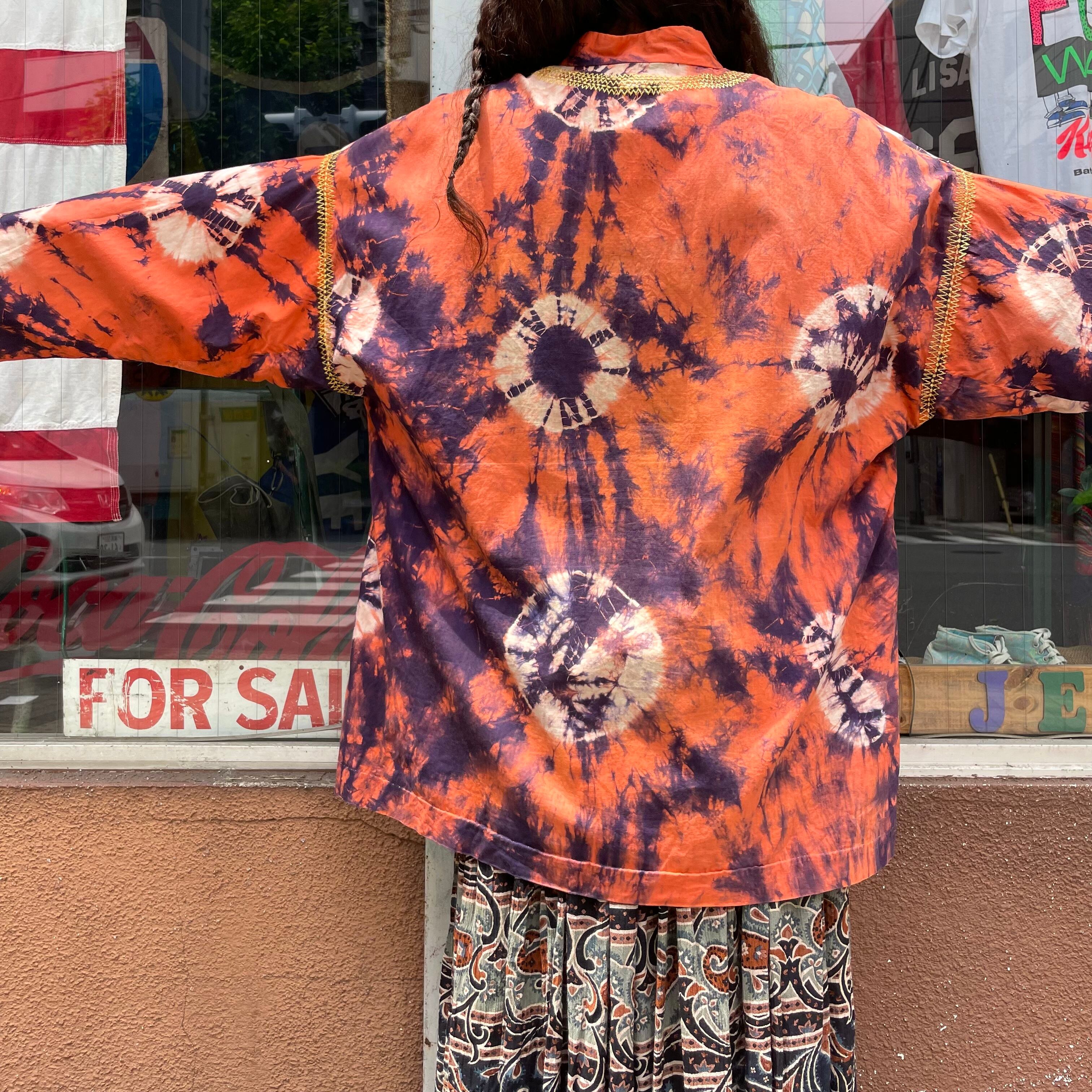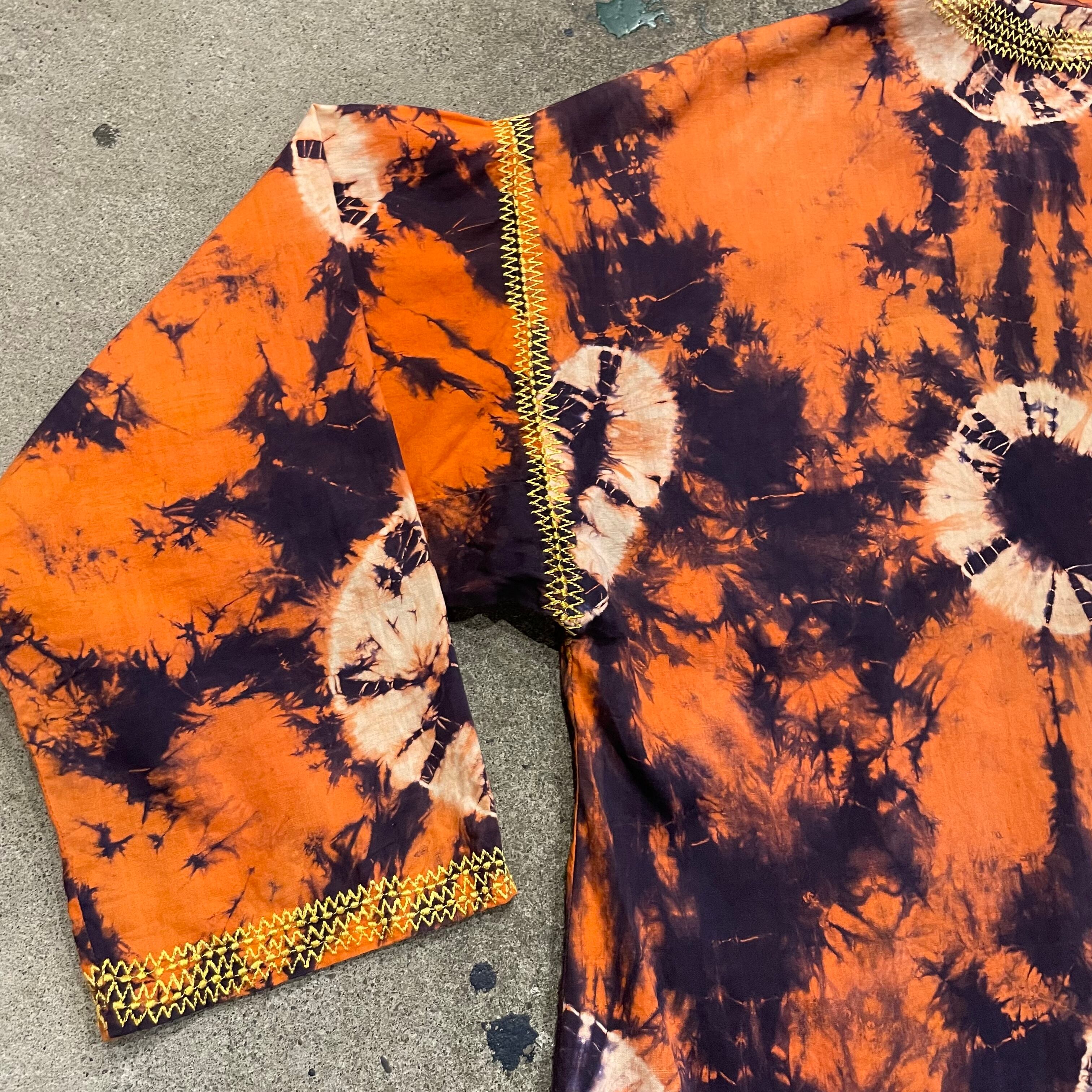 オレンジ×濃い紫の激しいタイダイがかわいいスタンドカラーのプルオーバーシャツです。