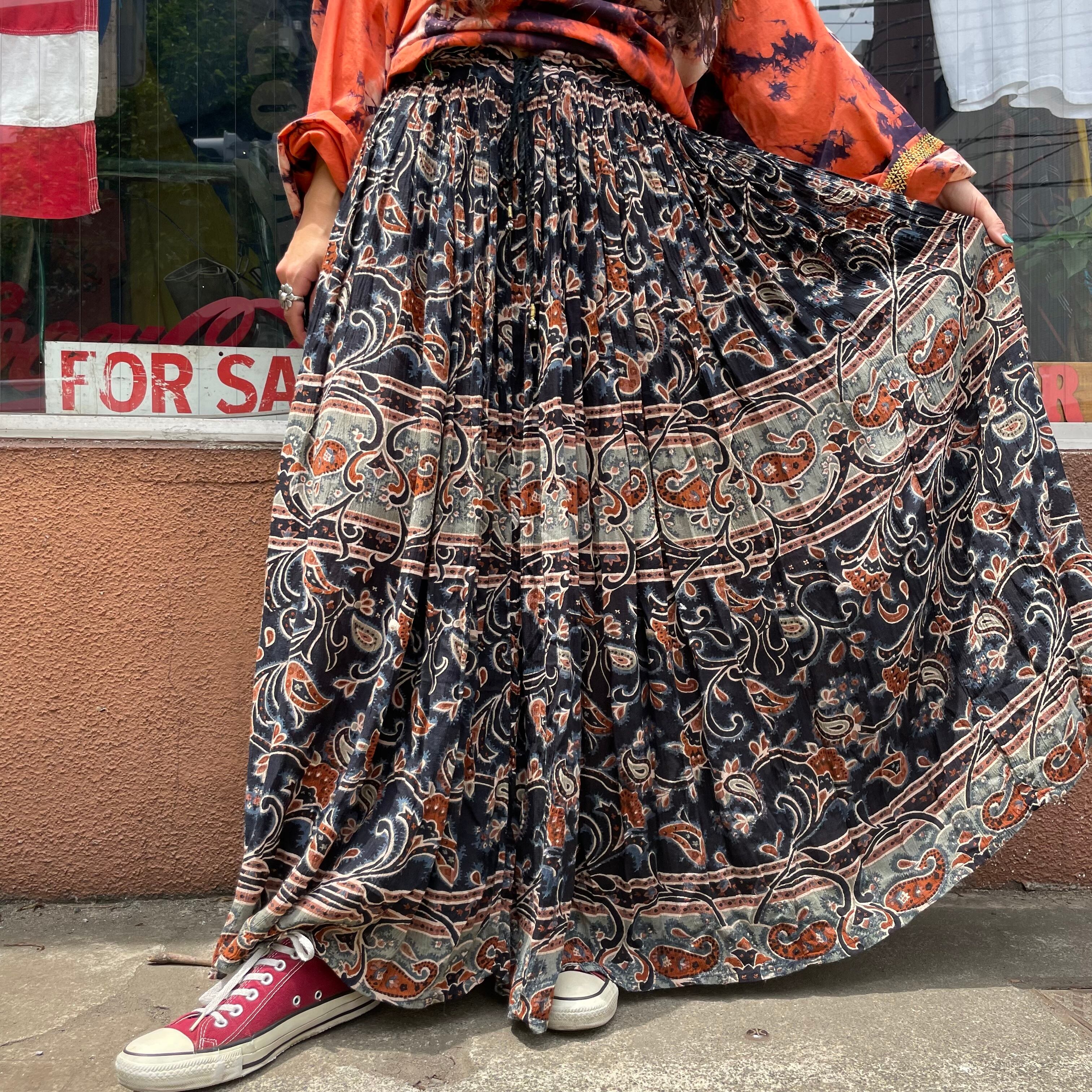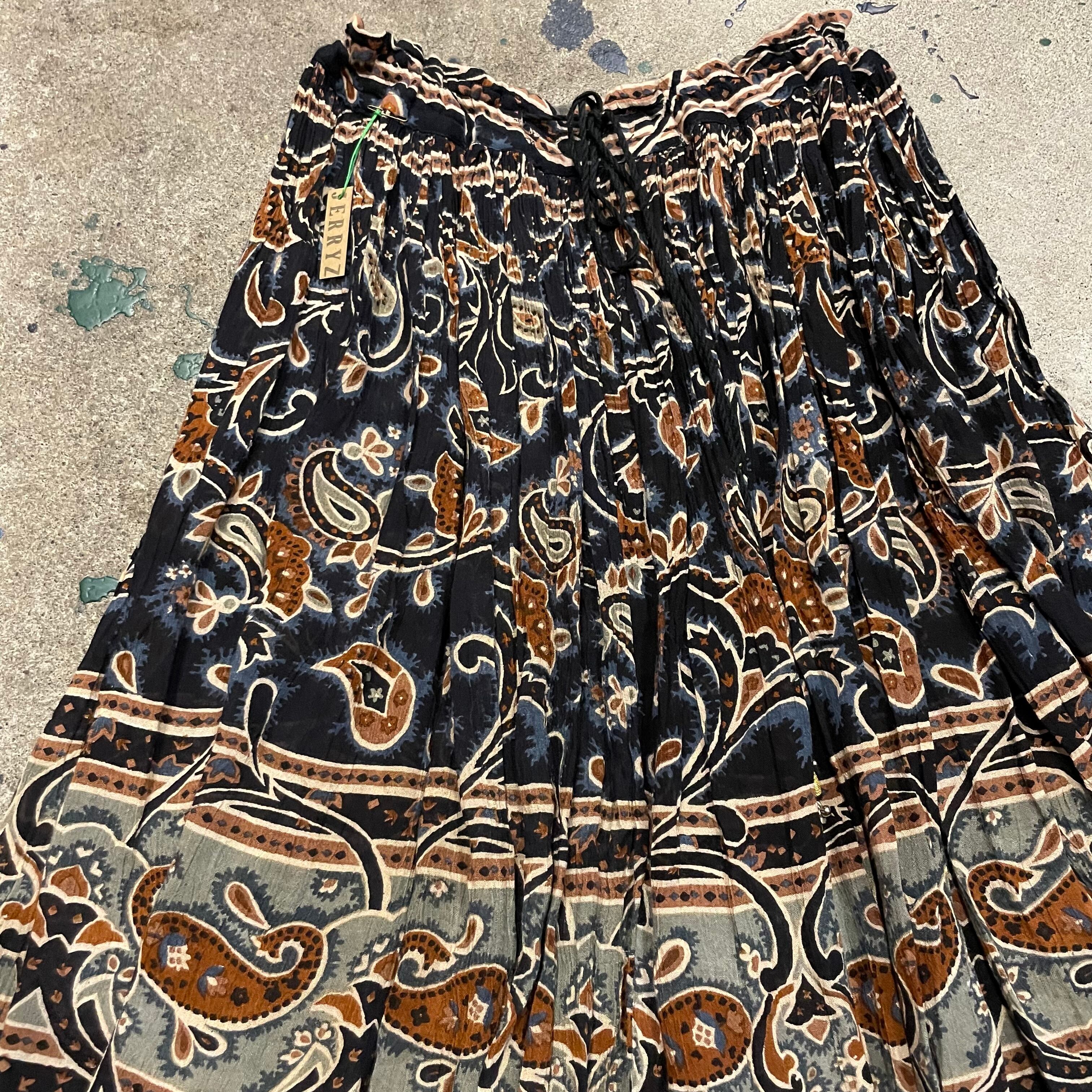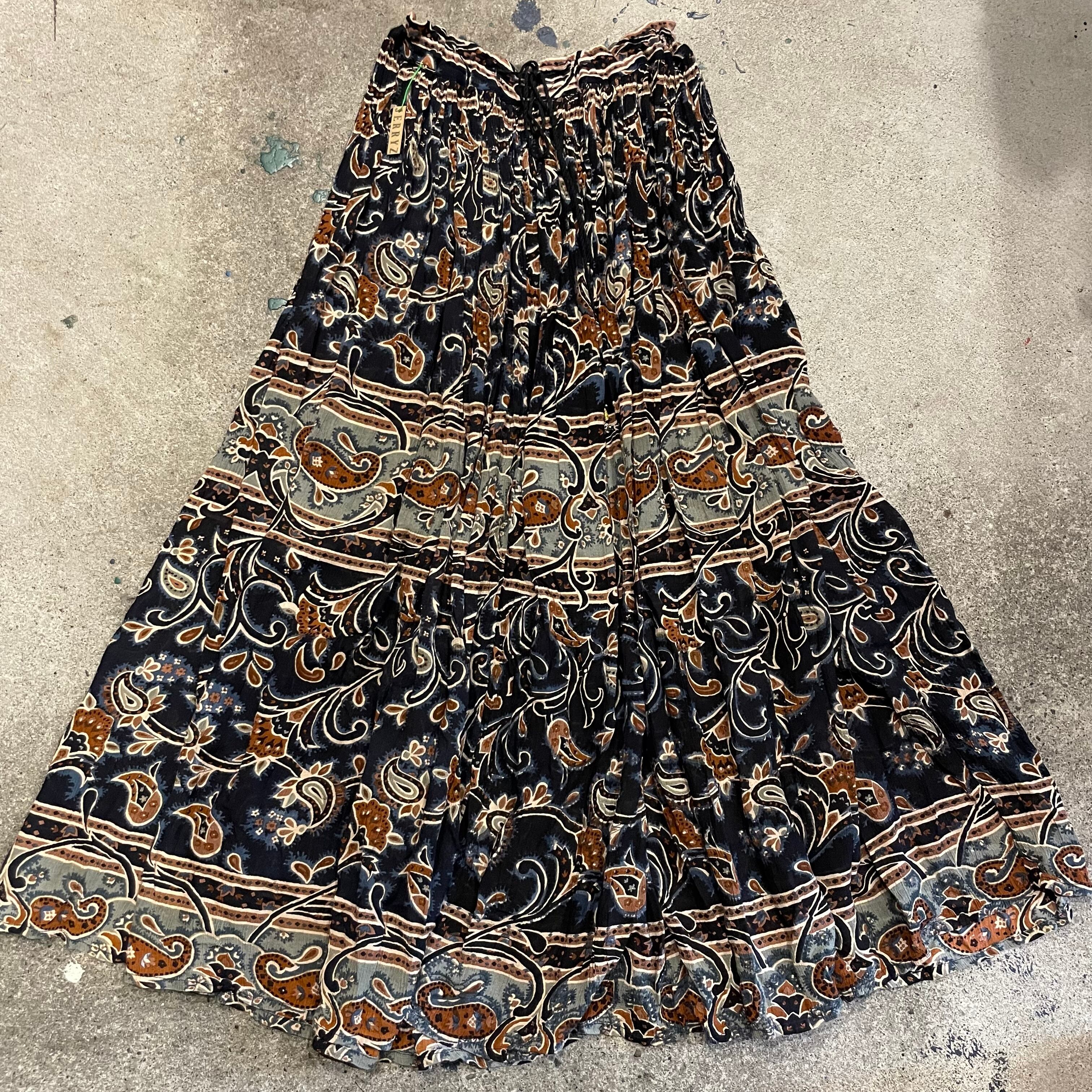 渋めなカラーリングが大人っぽいインド製のレーヨンスカートです。薄手のレーヨン素材で涼しいのはもちろん、ボリュームたっぷりの布がきれいに揺れるので歩くたびに素敵です。