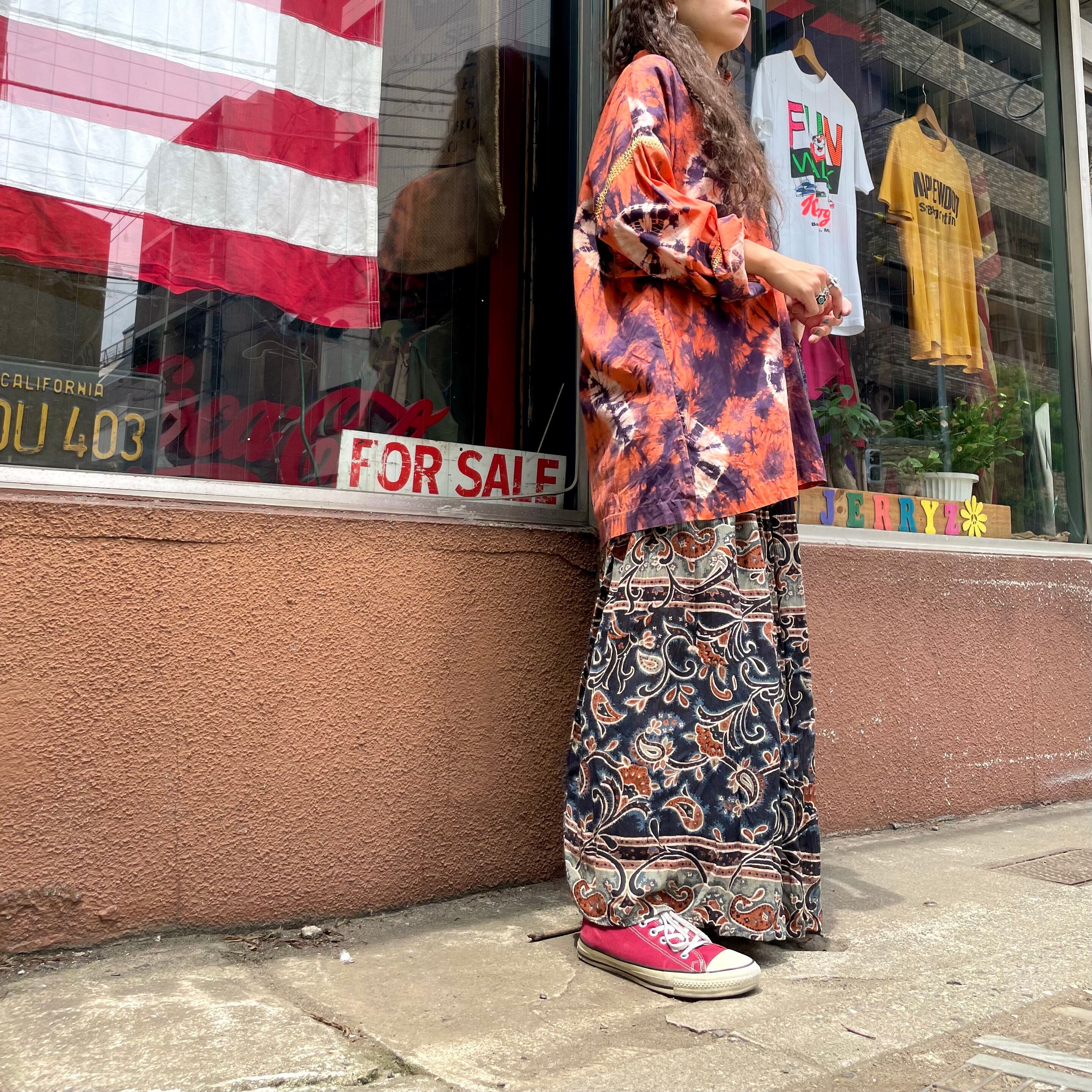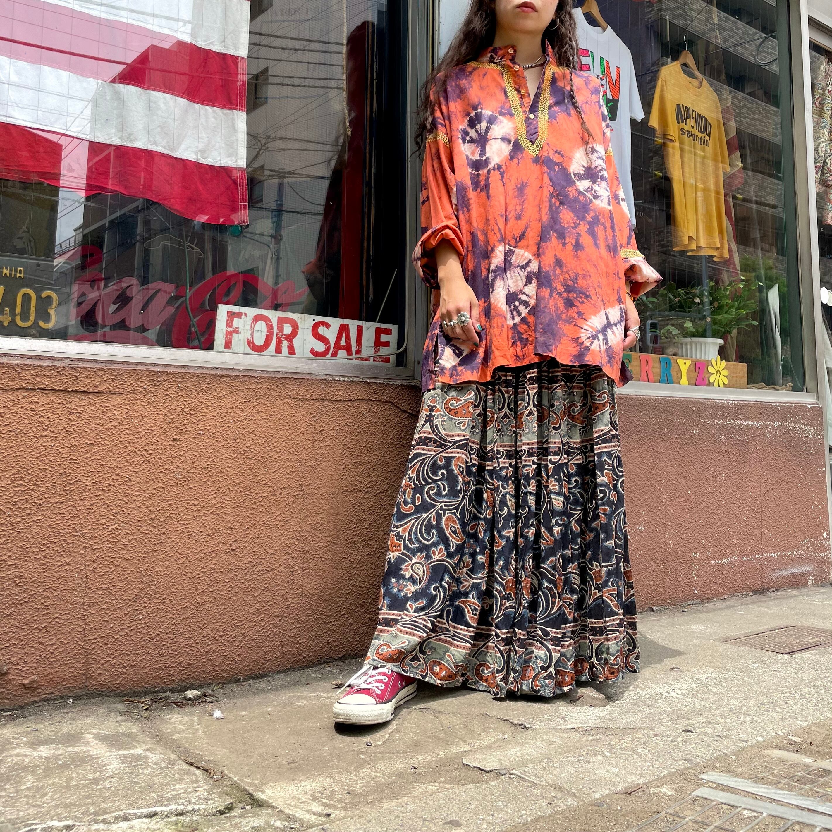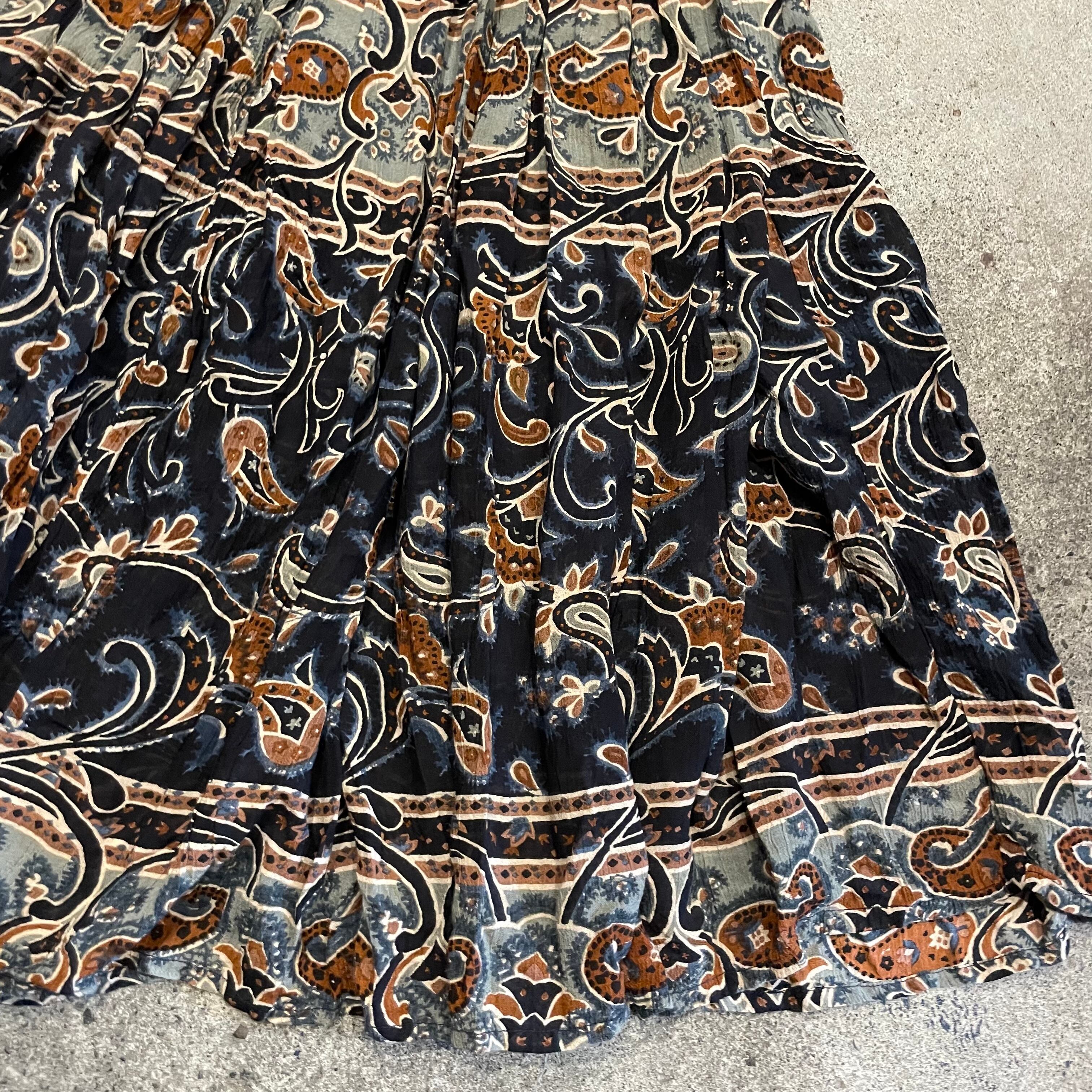 渋めなカラーリングが大人っぽいインド製のレーヨンスカートです。薄手のレーヨン素材で涼しいのはもちろん、ボリュームたっぷりの布がきれいに揺れるので歩くたびに素敵です。
