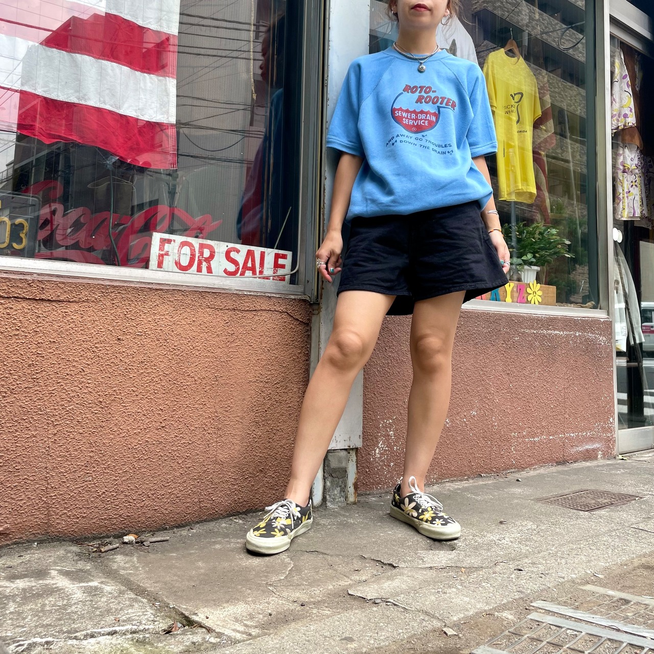 水色に赤のプリントがかわいい70年代アメリカ製の半袖スウェットです。