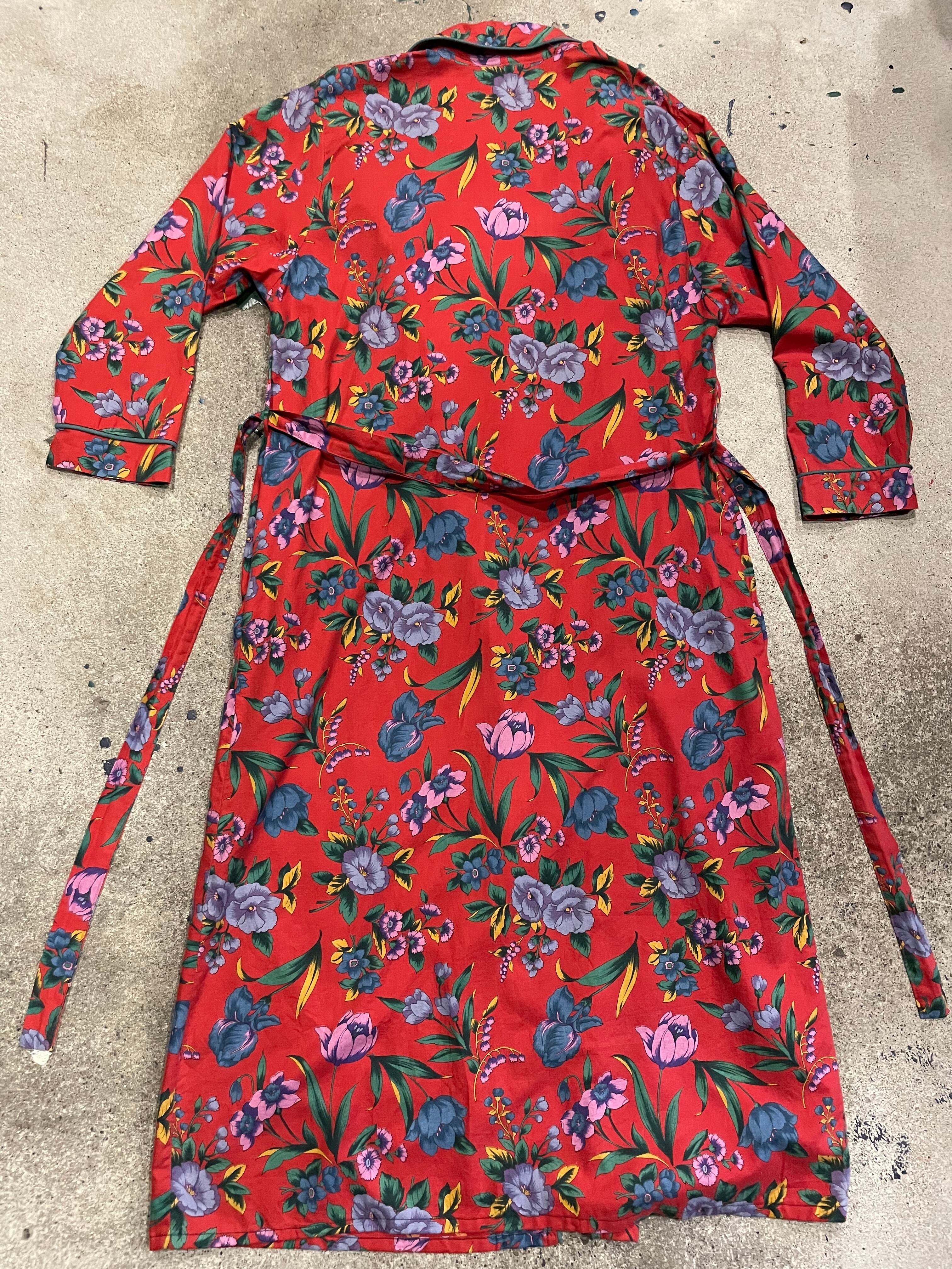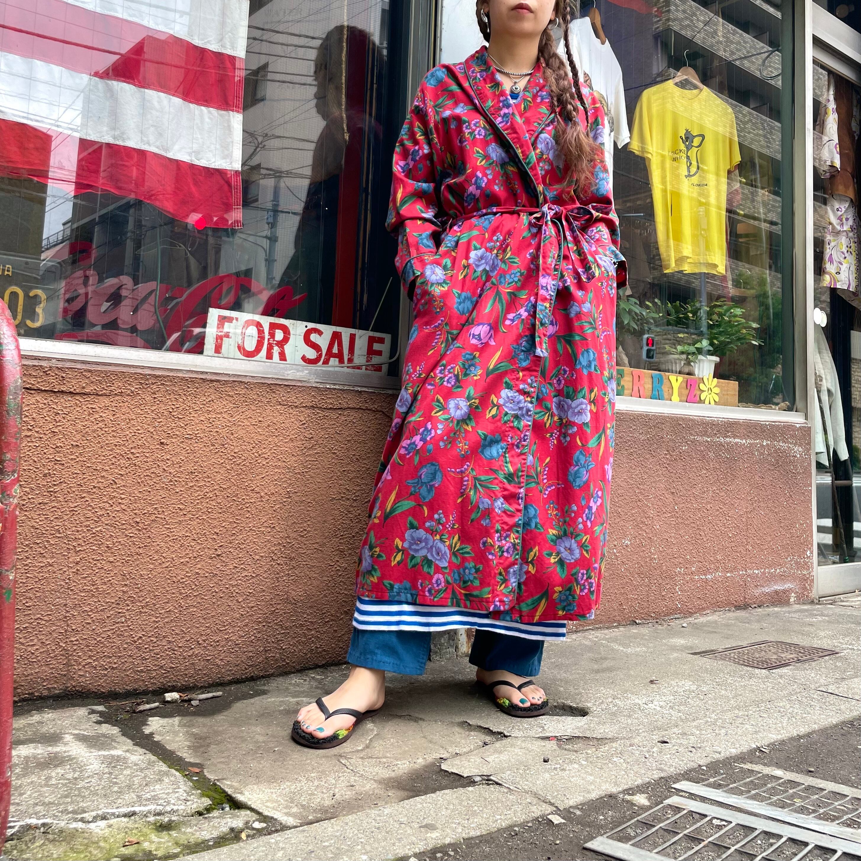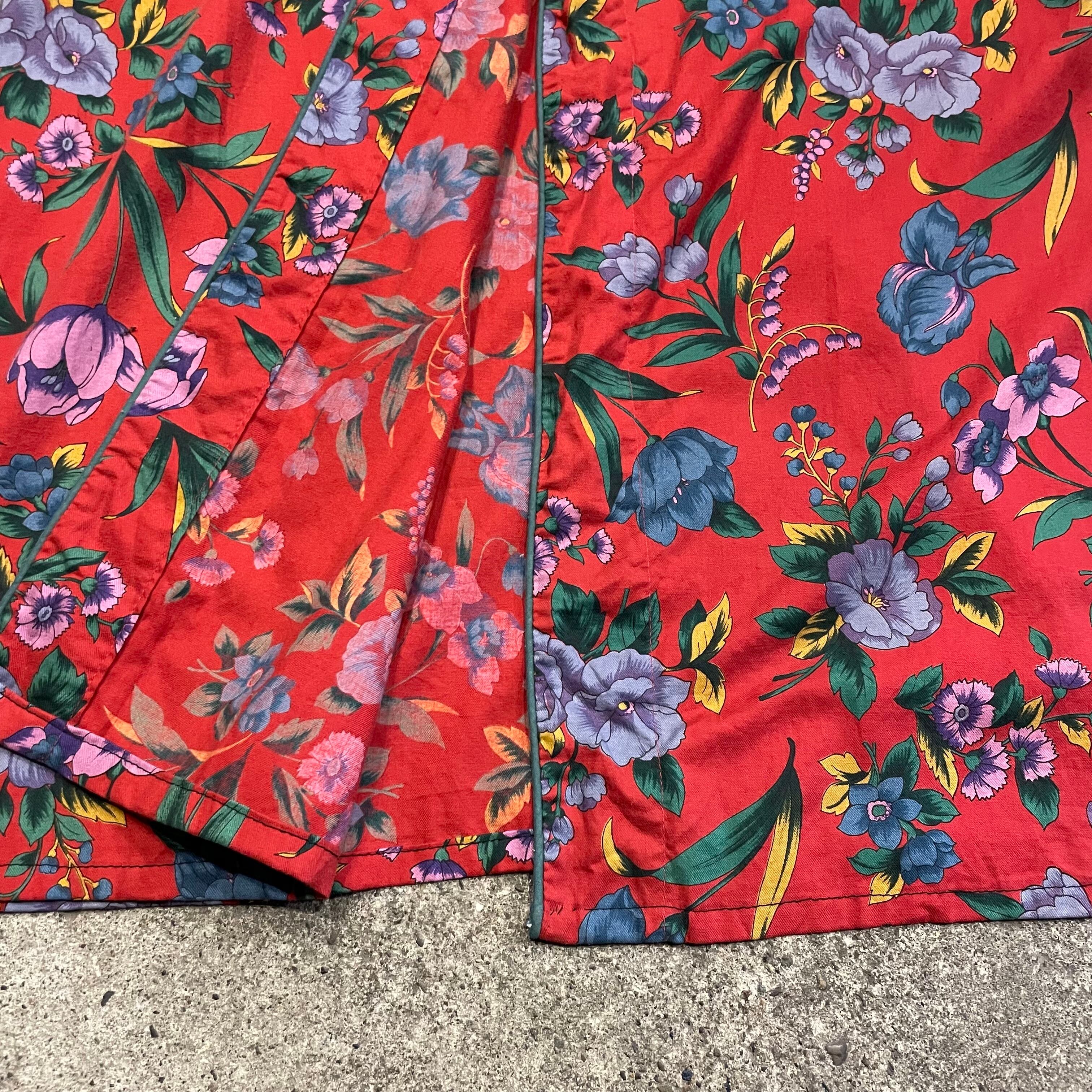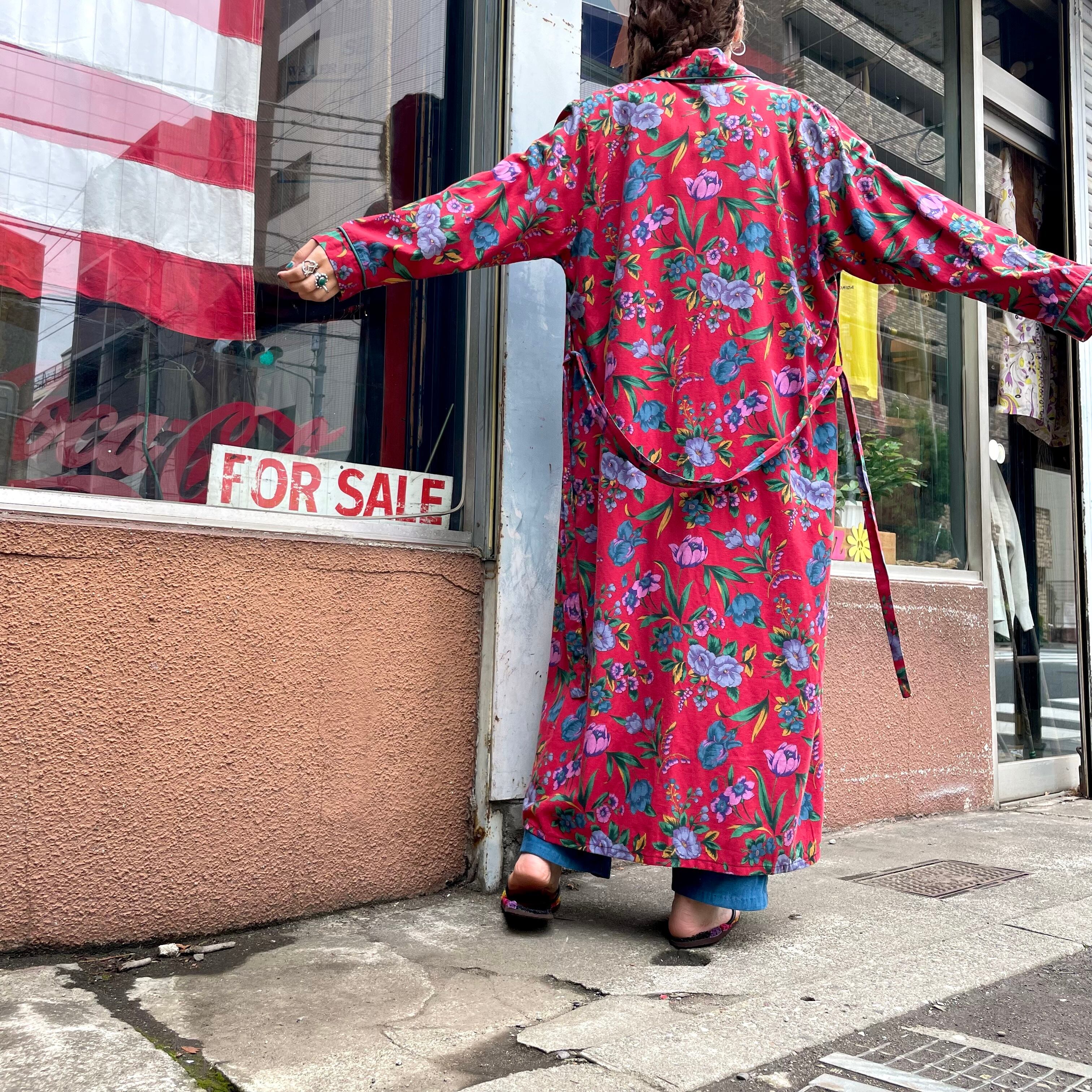赤地に青い花や緑の葉っぱの色味がとても素敵な雰囲気のあるガウンです。