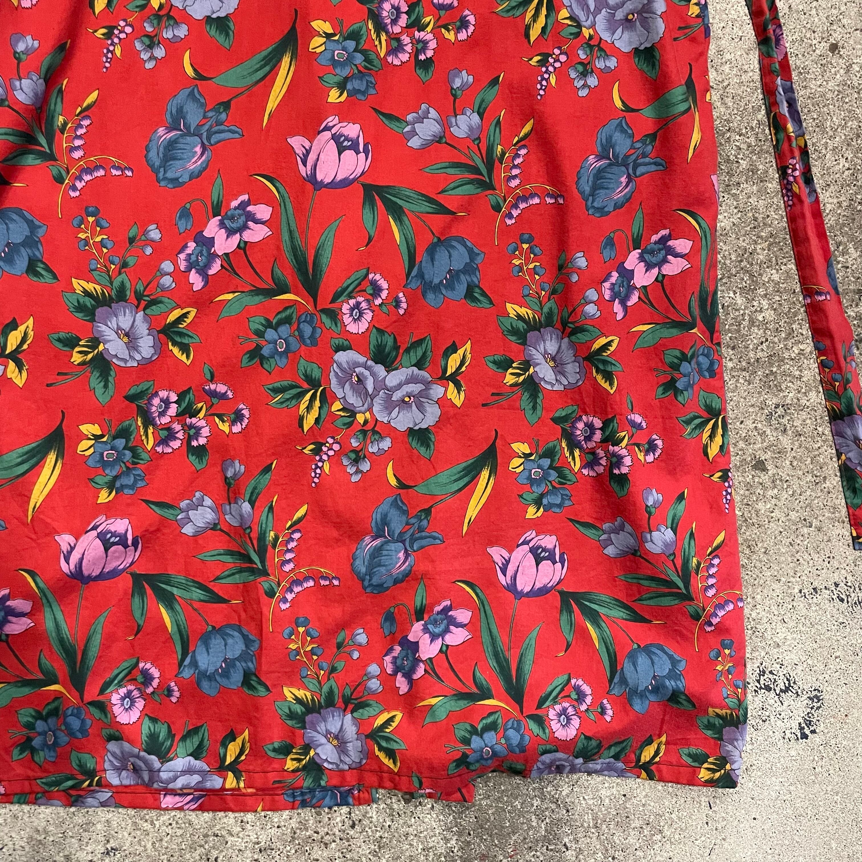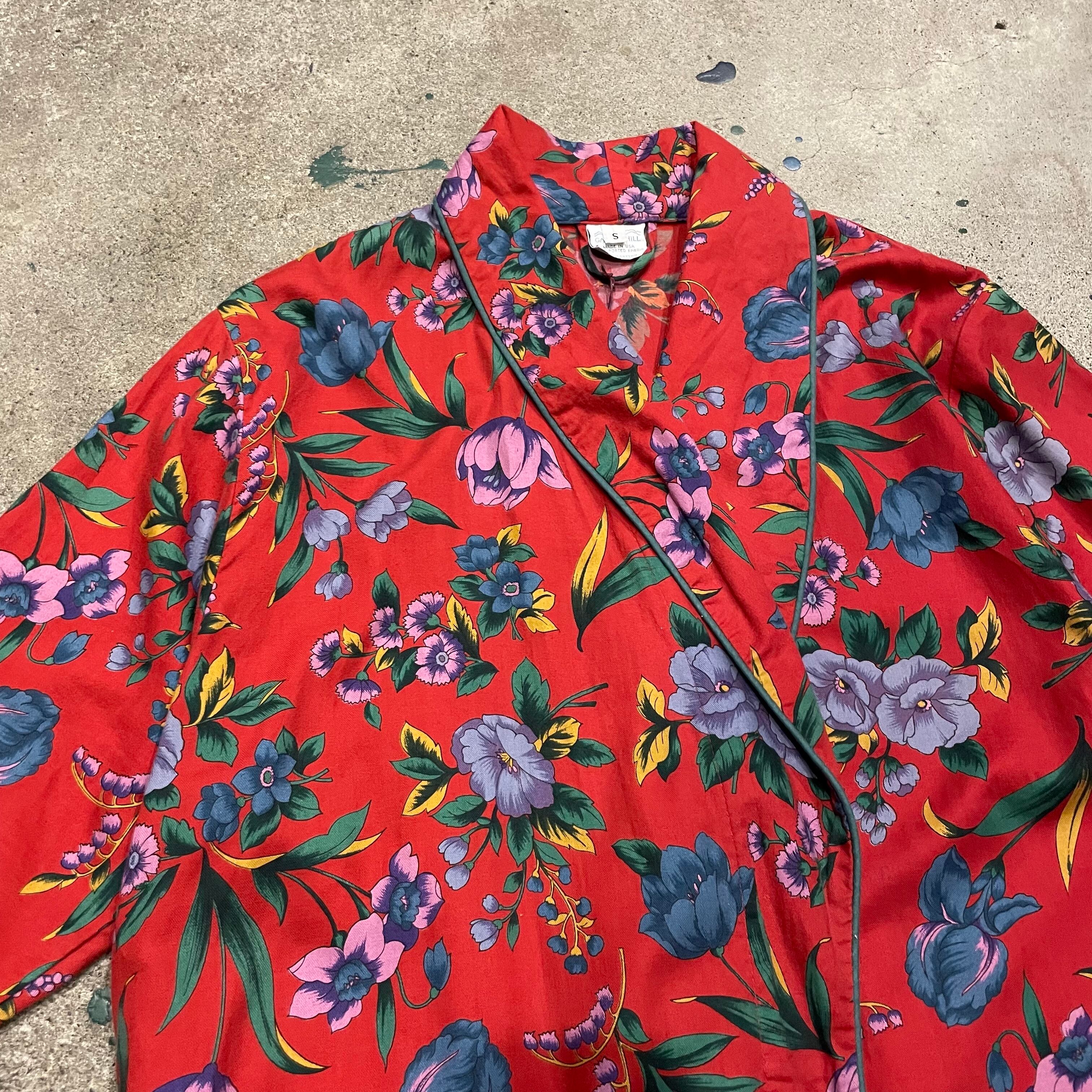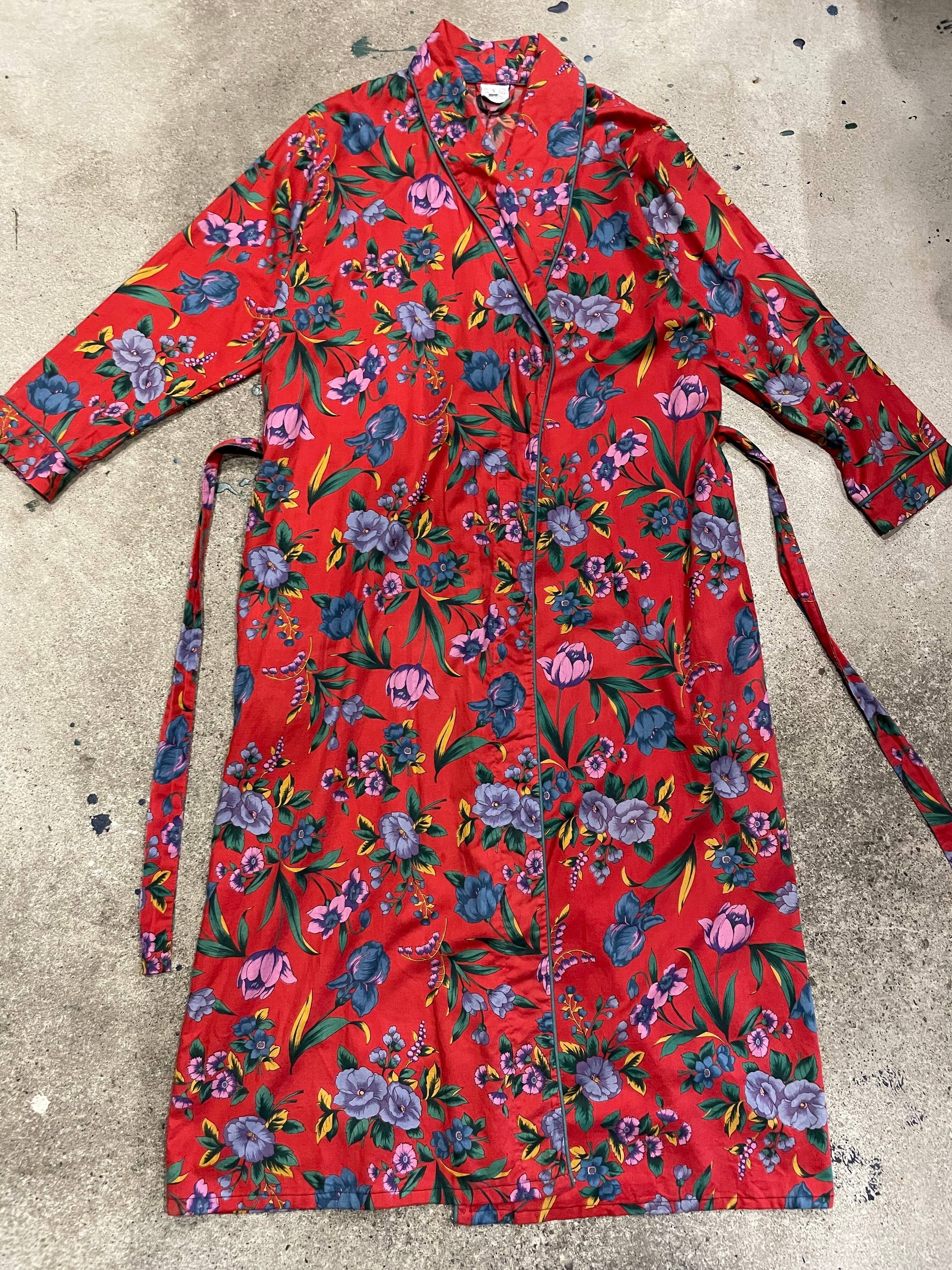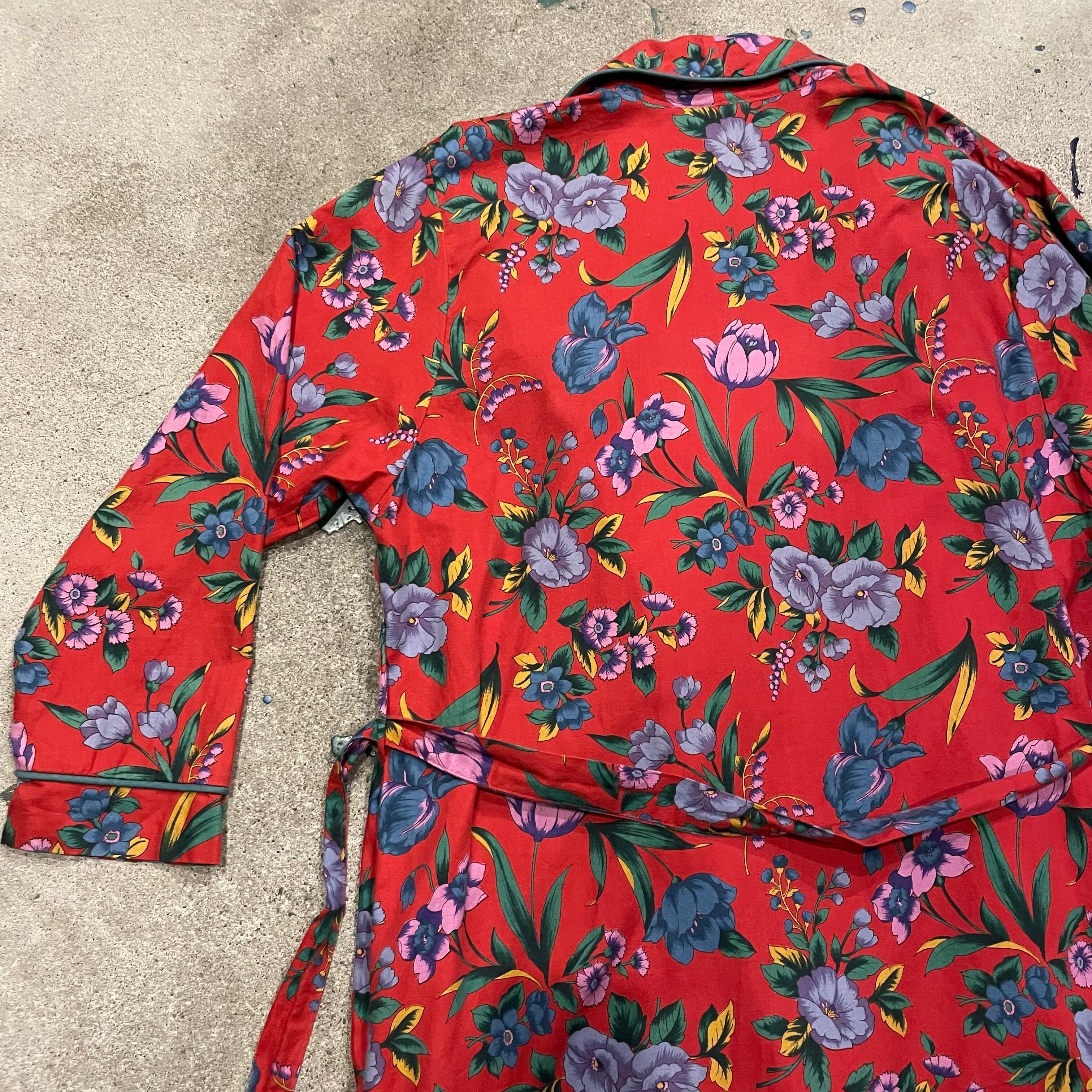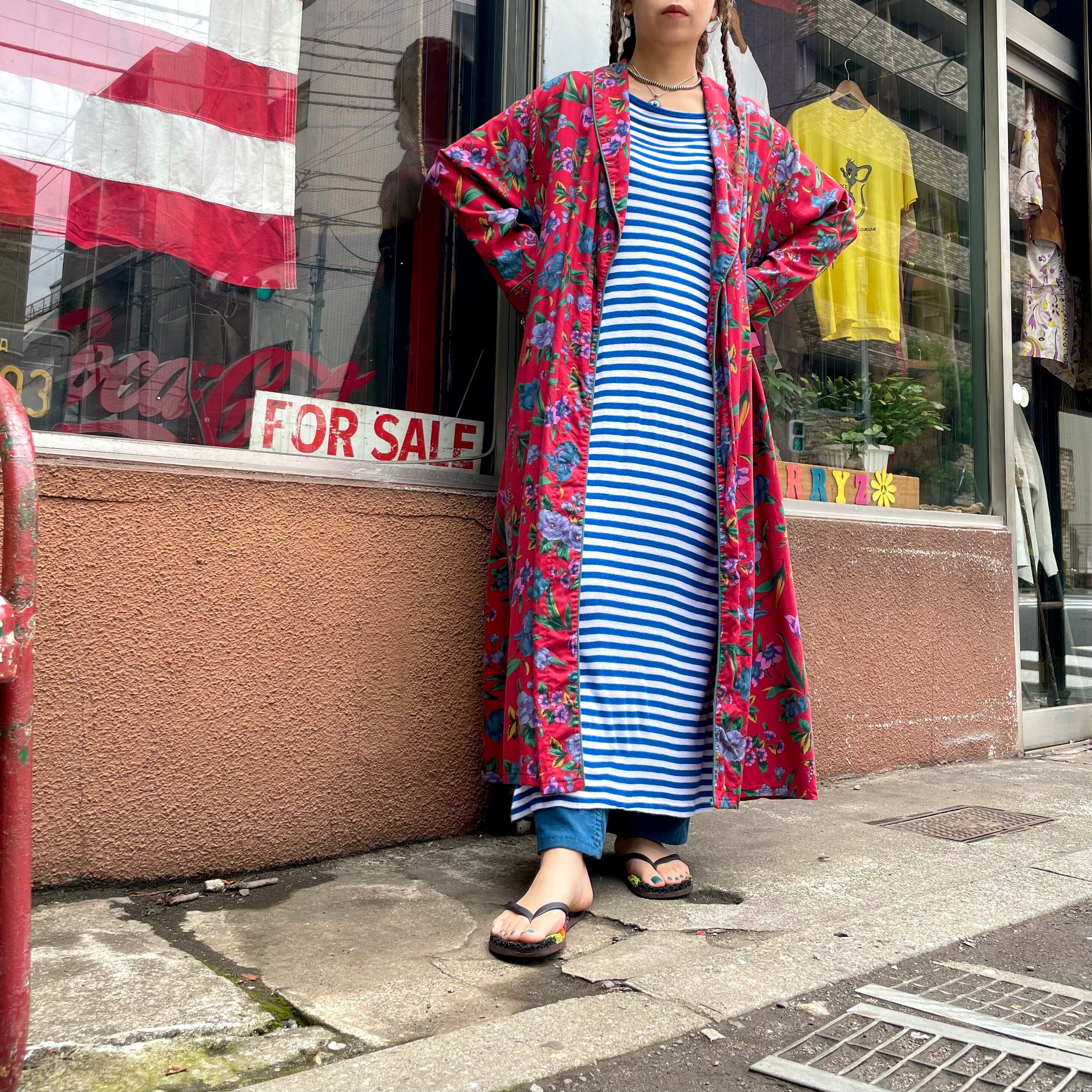 赤地に青い花や緑の葉っぱの色味がとても素敵な雰囲気のあるガウンです。
