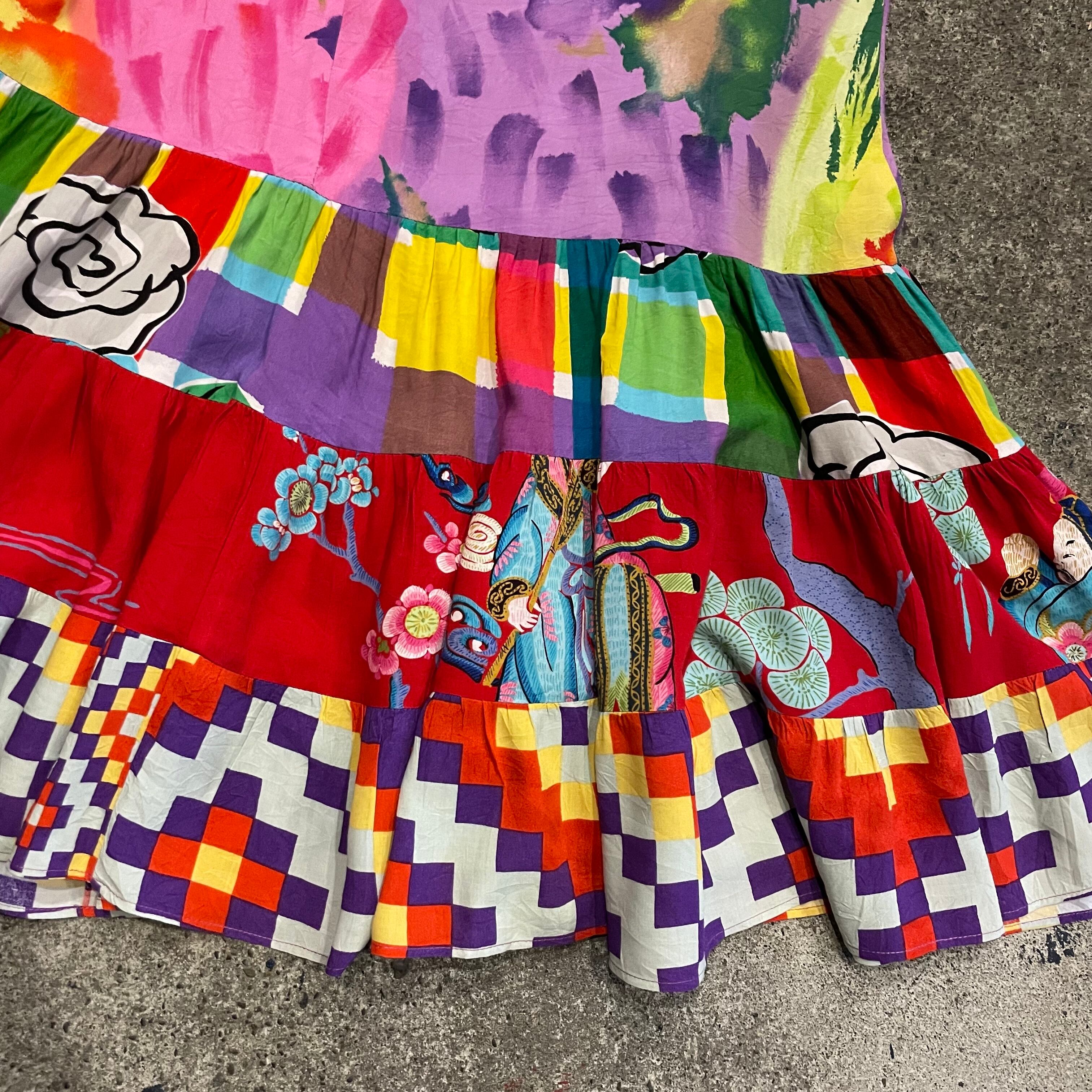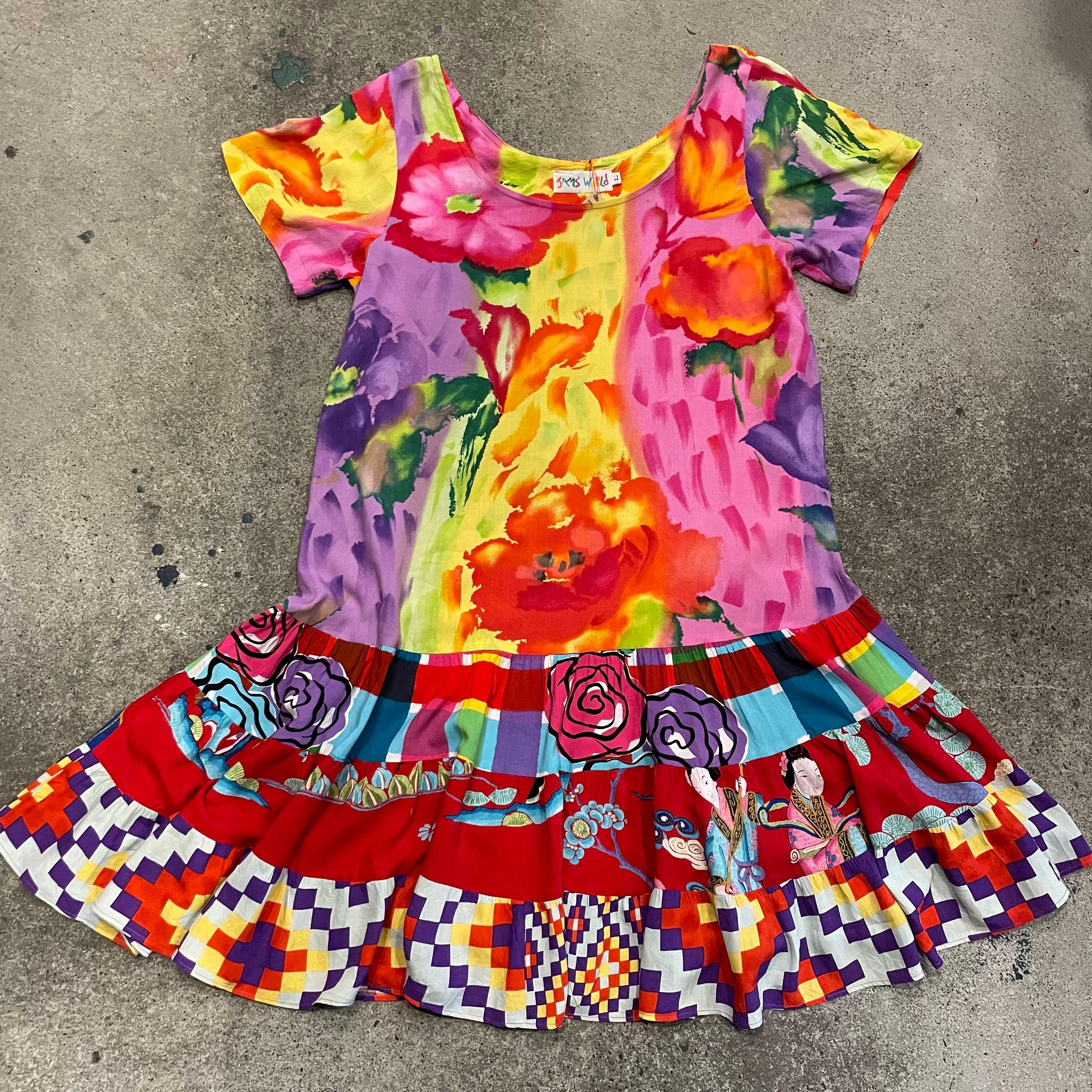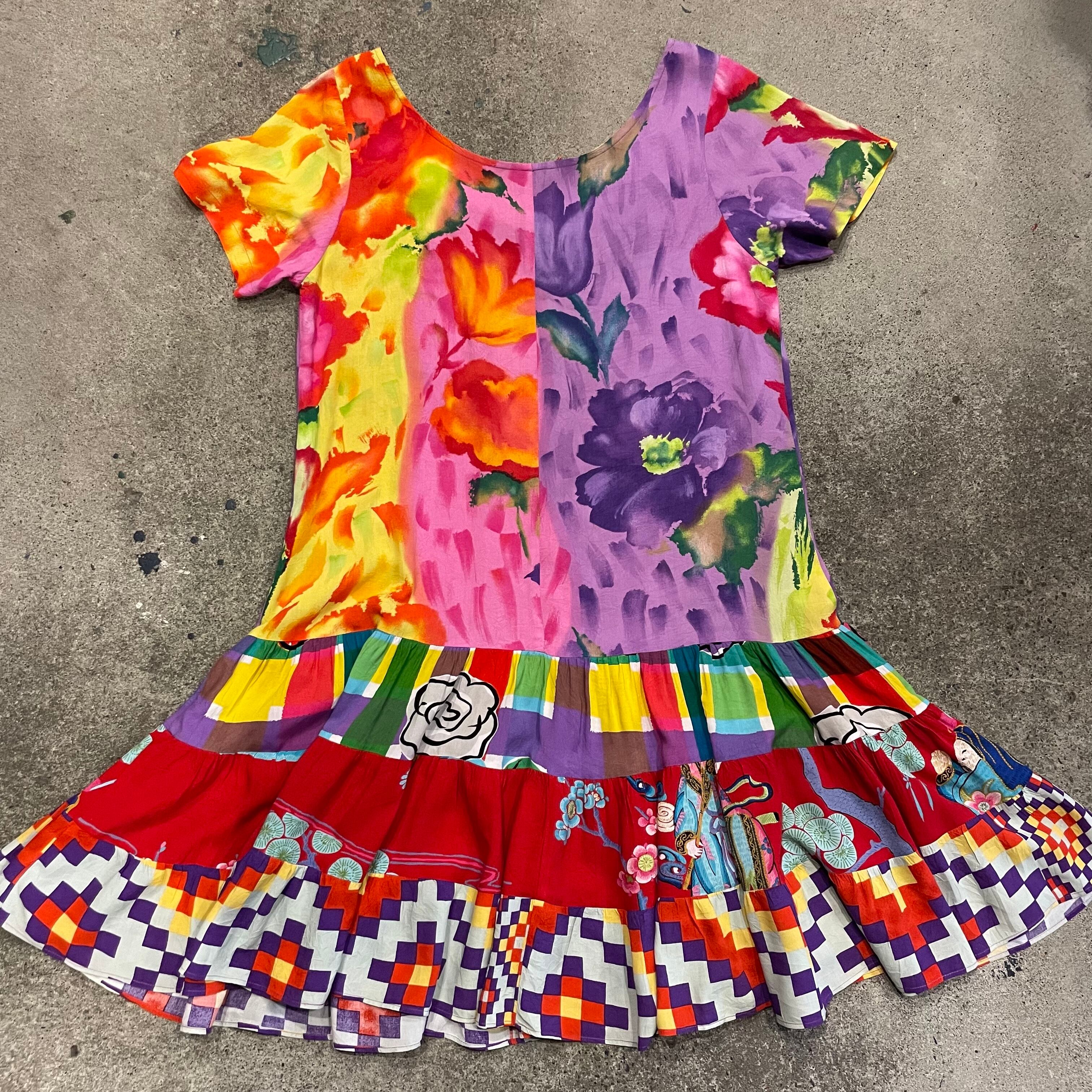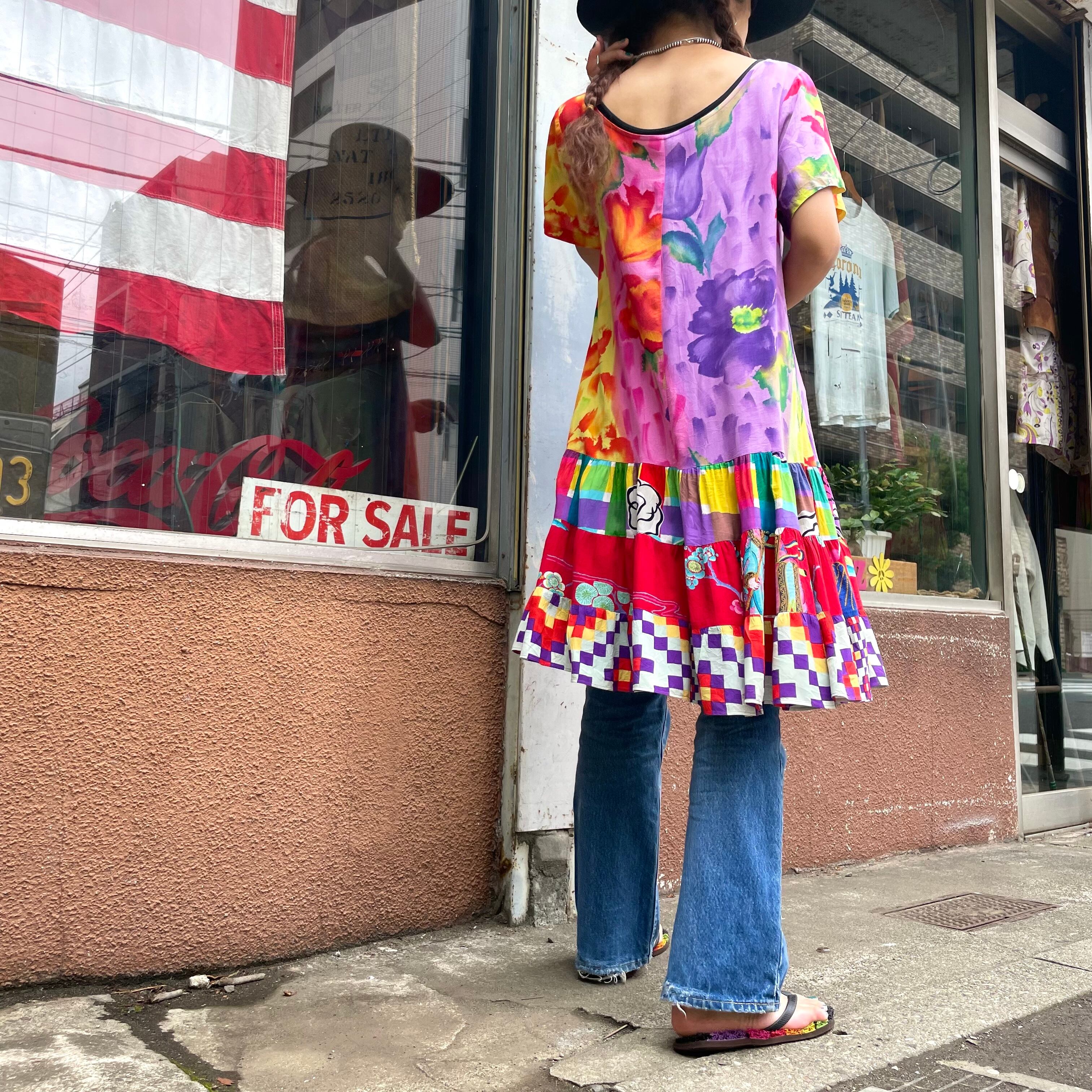 いろんな生地の切り替えがかわいいワンピースです。もや〜っとした大きな花柄にキッチュなチェックとバラ柄、中国っぽいオリエンタルな柄、ブロックチェックのような幾何学模様と、様々な柄の組み合わせがおもしろいです。
