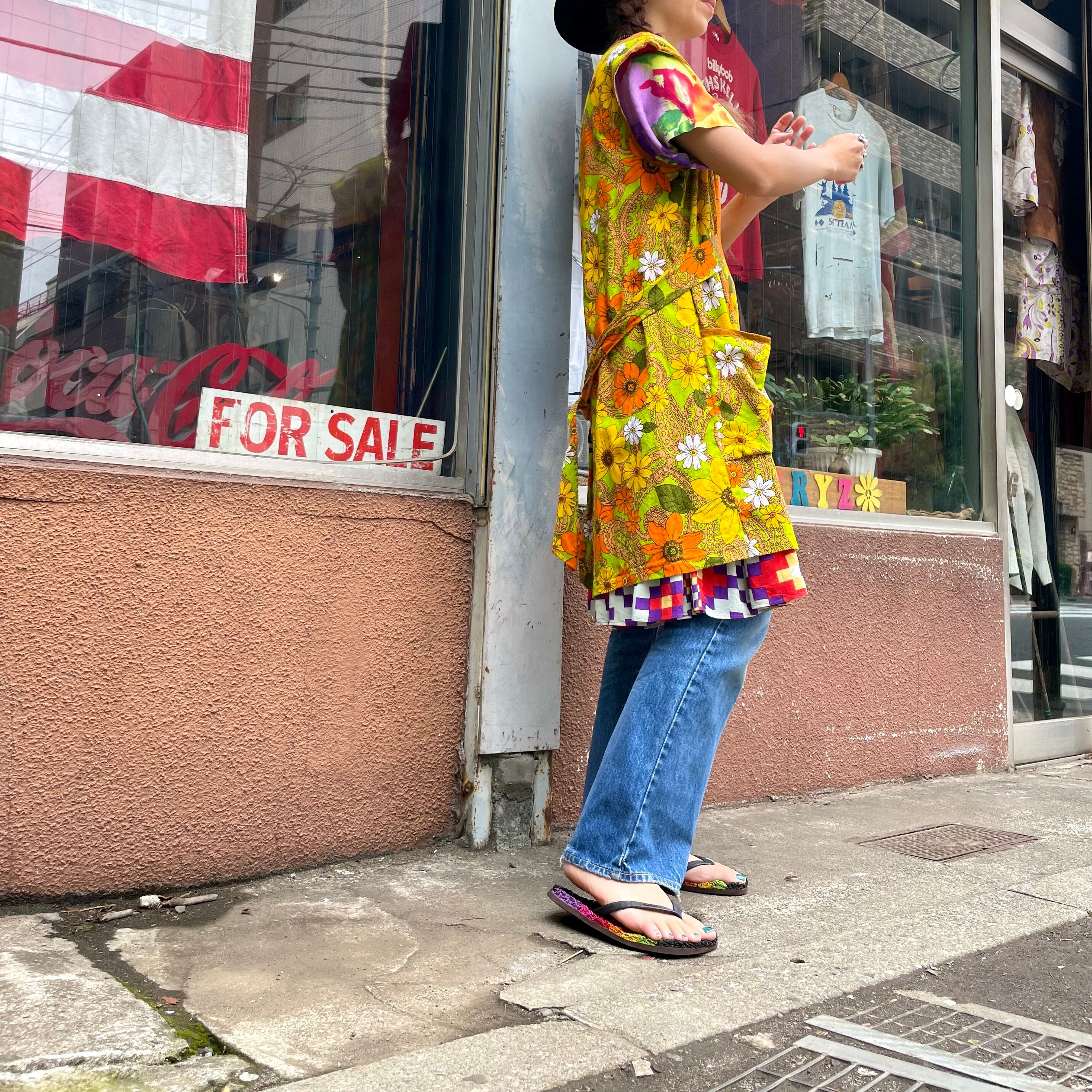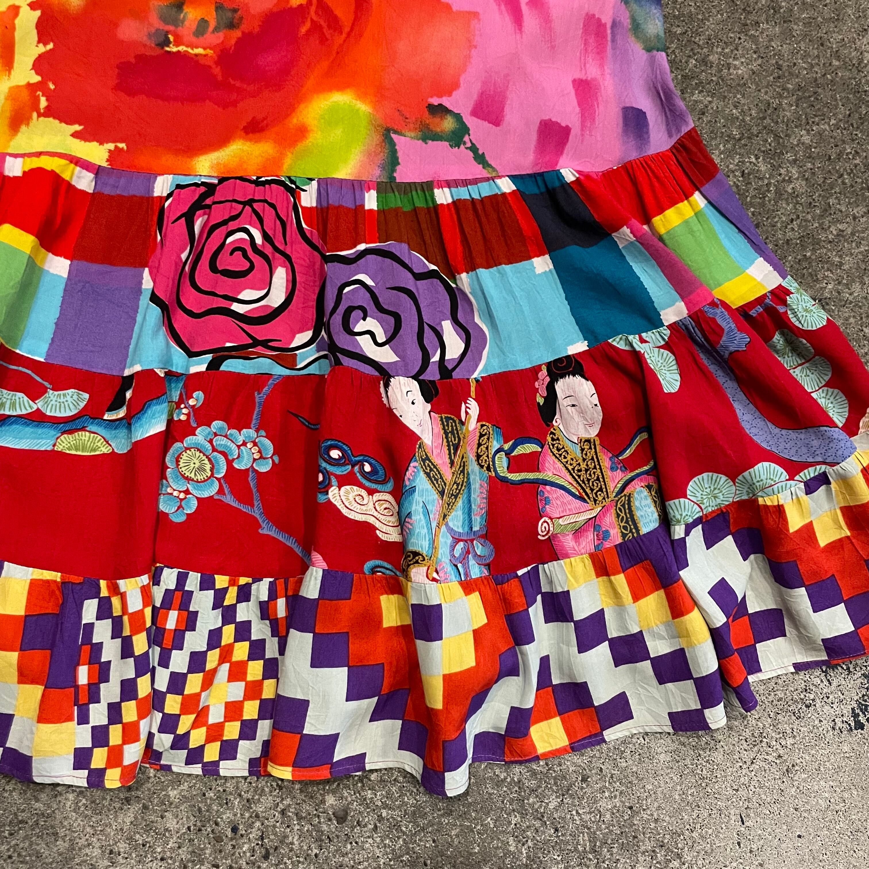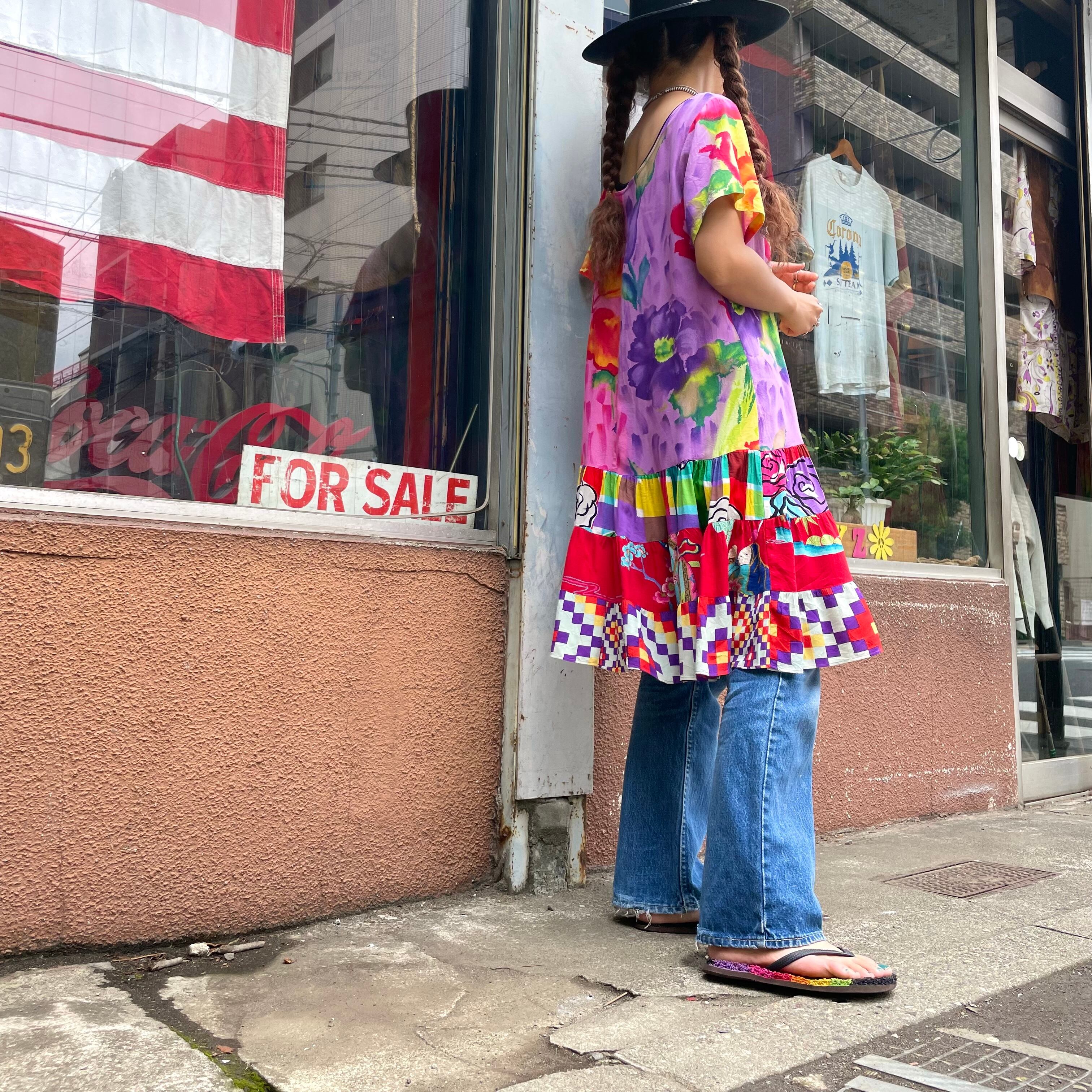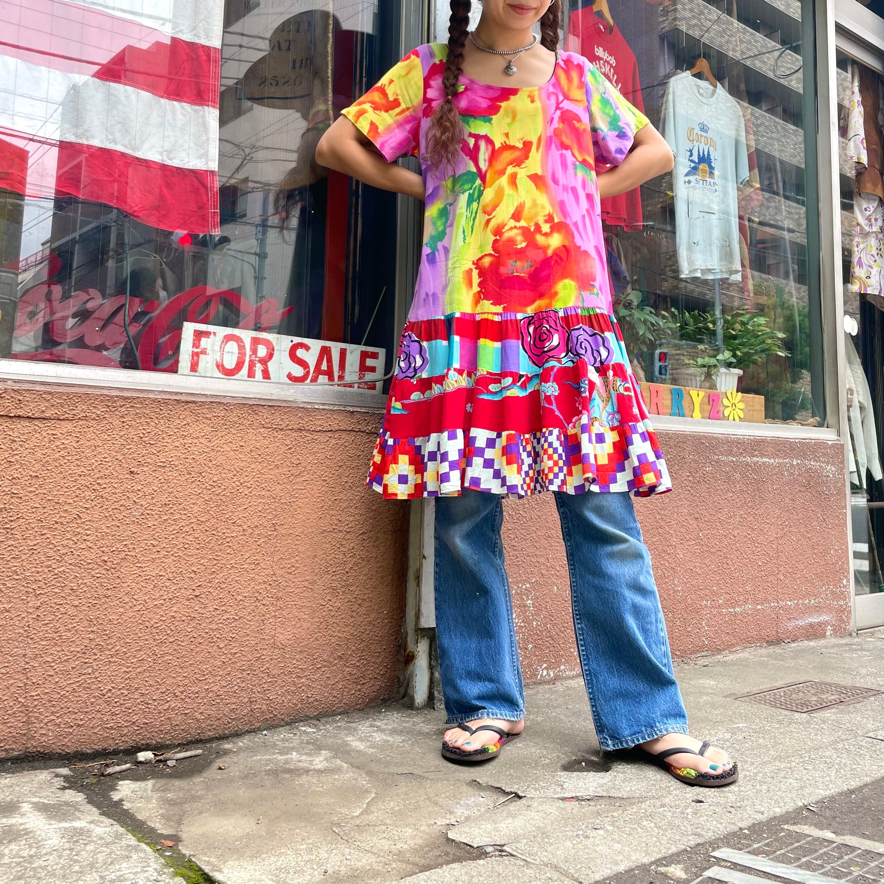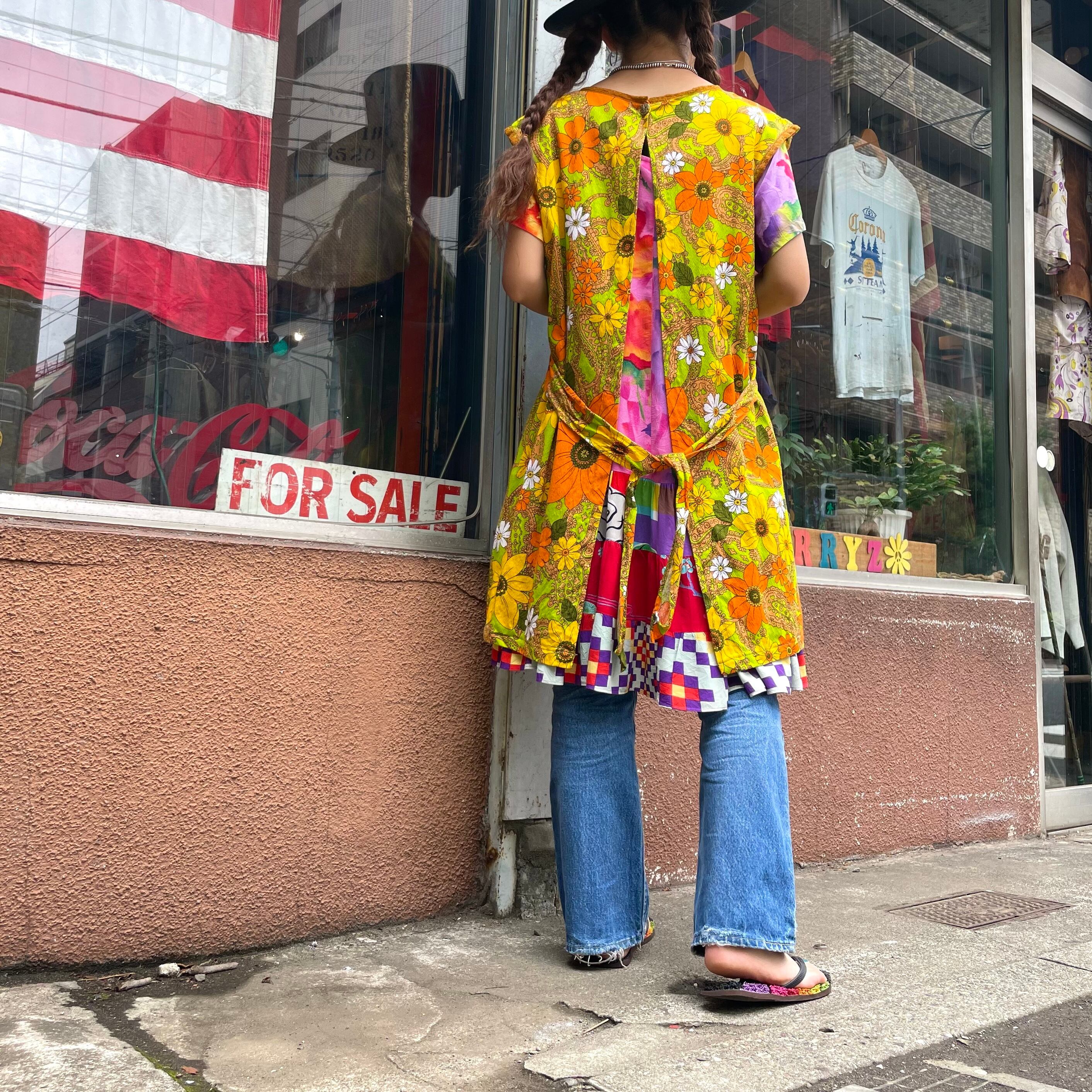 いろんな生地の切り替えがかわいいワンピースです。もや〜っとした大きな花柄にキッチュなチェックとバラ柄、中国っぽいオリエンタルな柄、ブロックチェックのような幾何学模様と、様々な柄の組み合わせがおもしろいです。