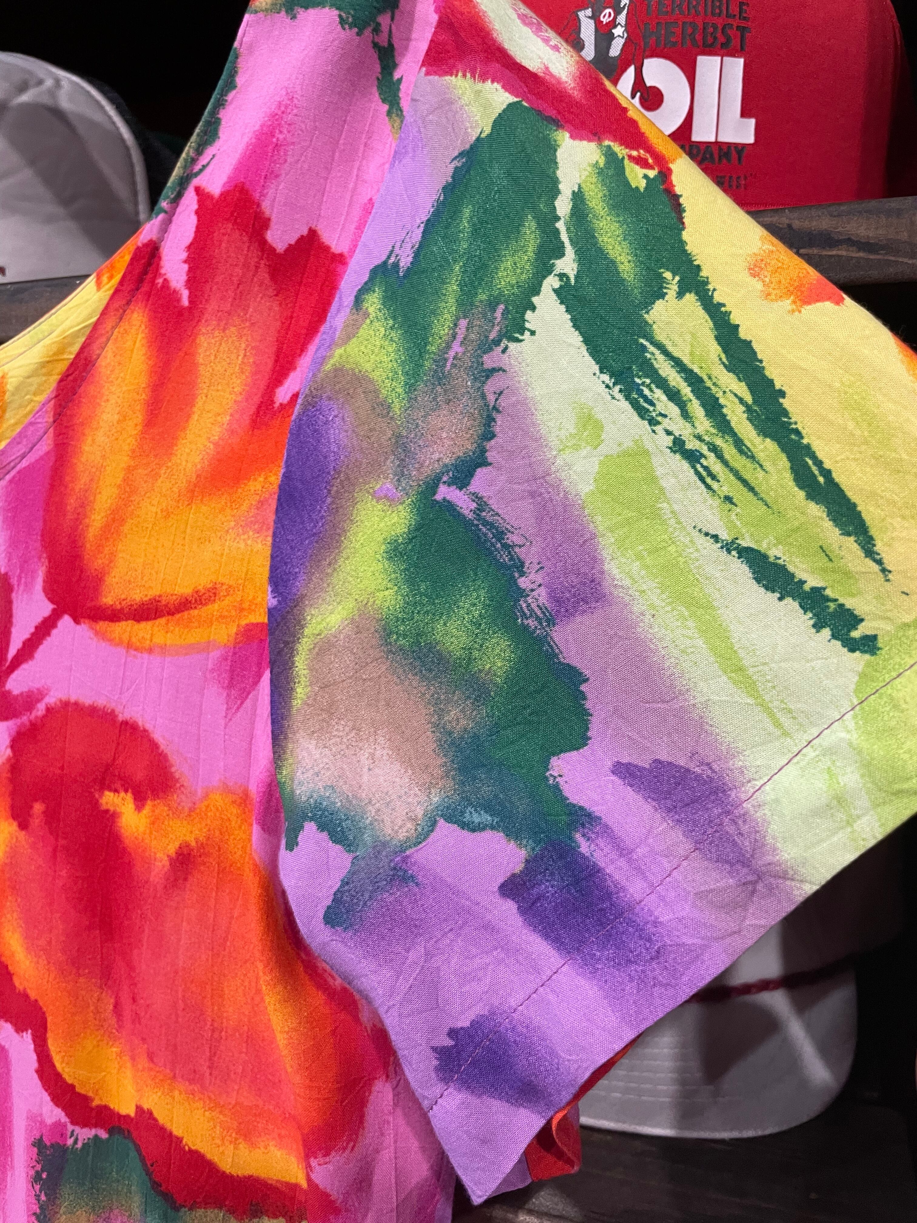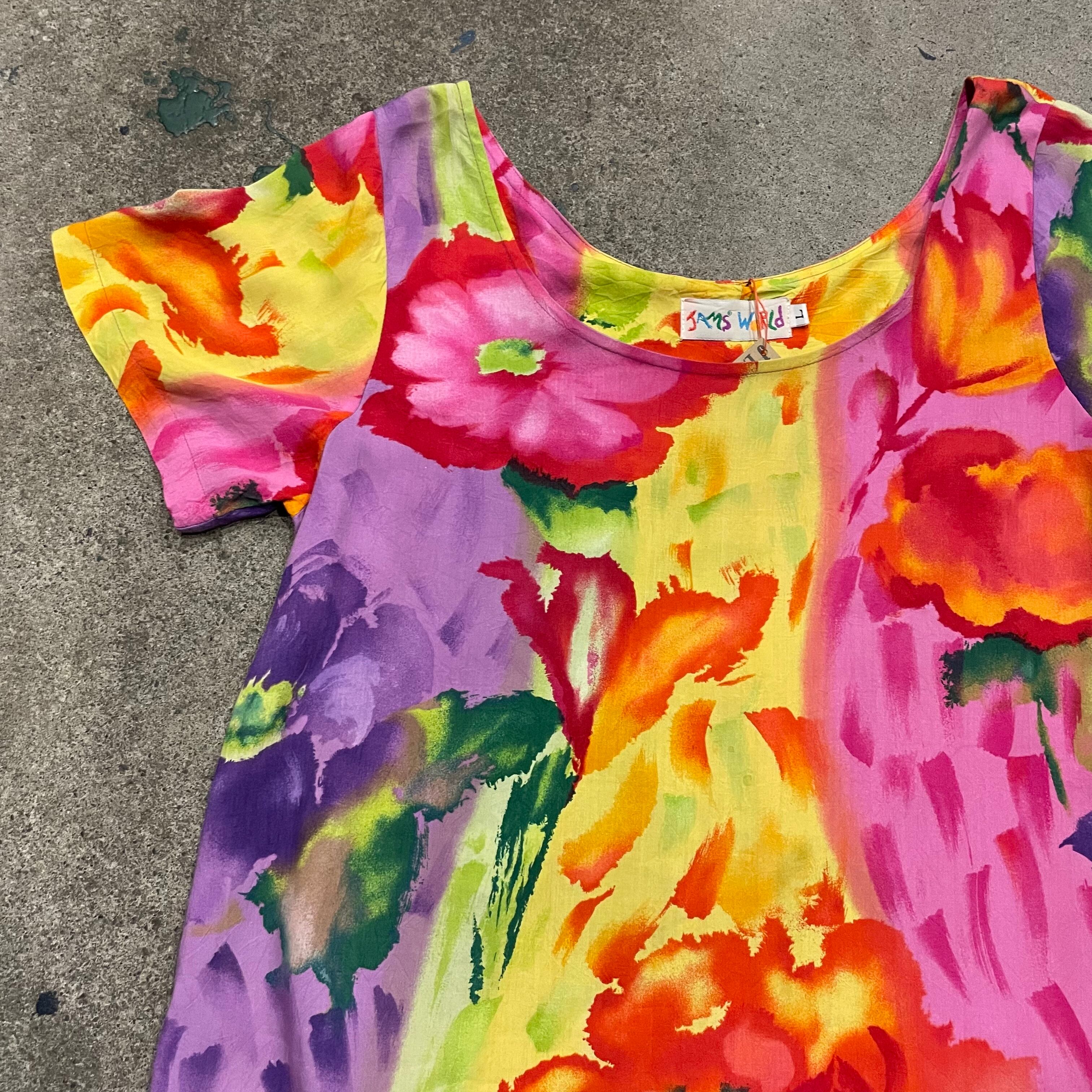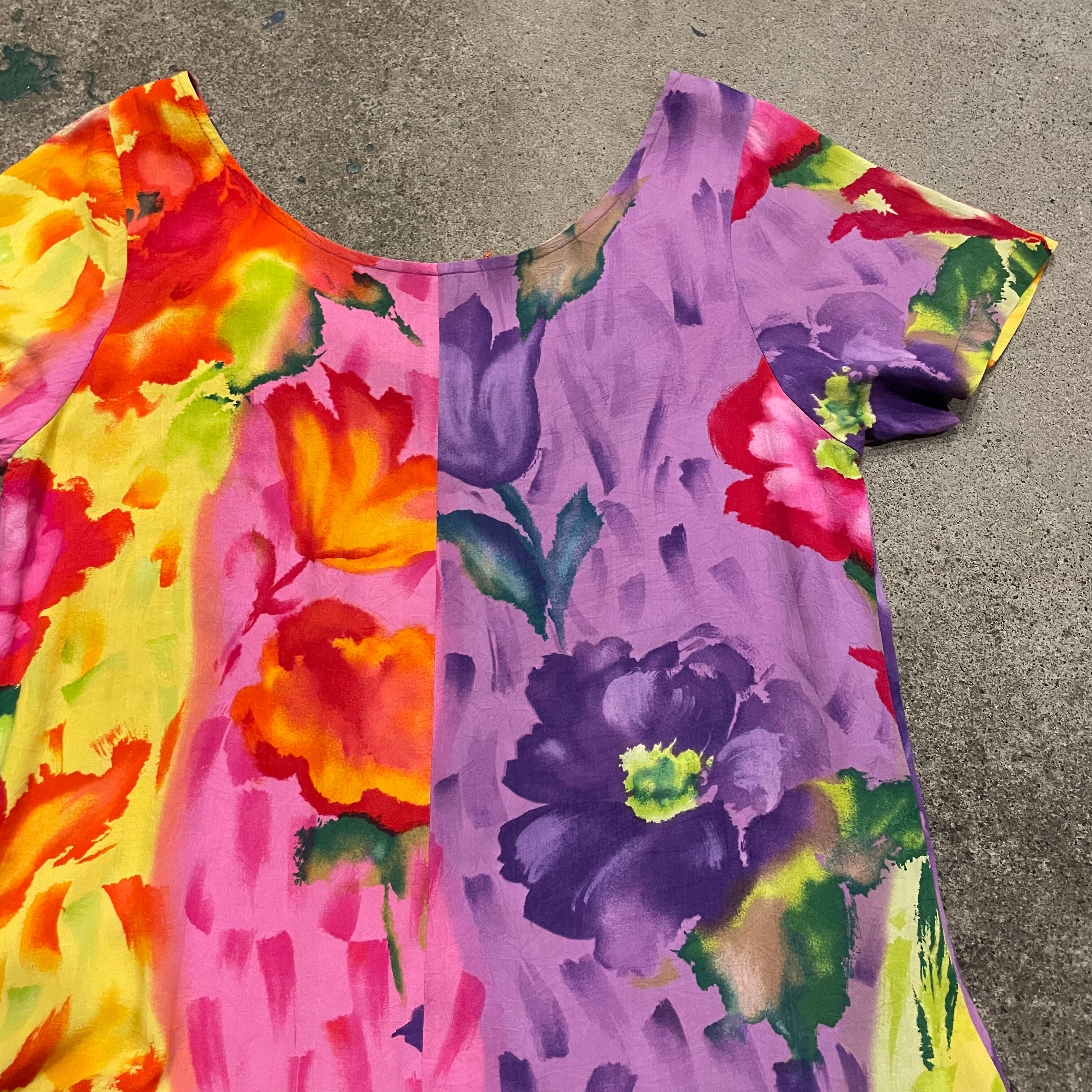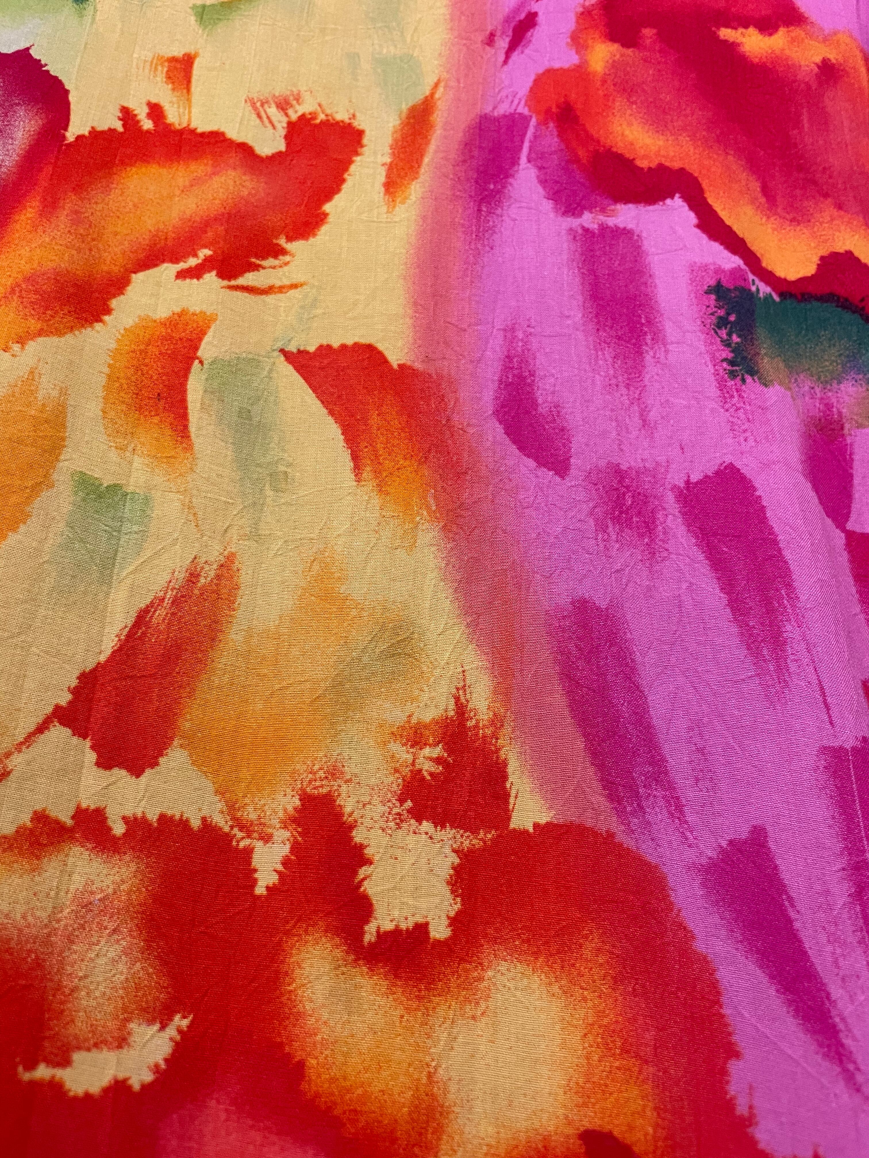 いろんな生地の切り替えがかわいいワンピースです。もや〜っとした大きな花柄にキッチュなチェックとバラ柄、中国っぽいオリエンタルな柄、ブロックチェックのような幾何学模様と、様々な柄の組み合わせがおもしろいです。