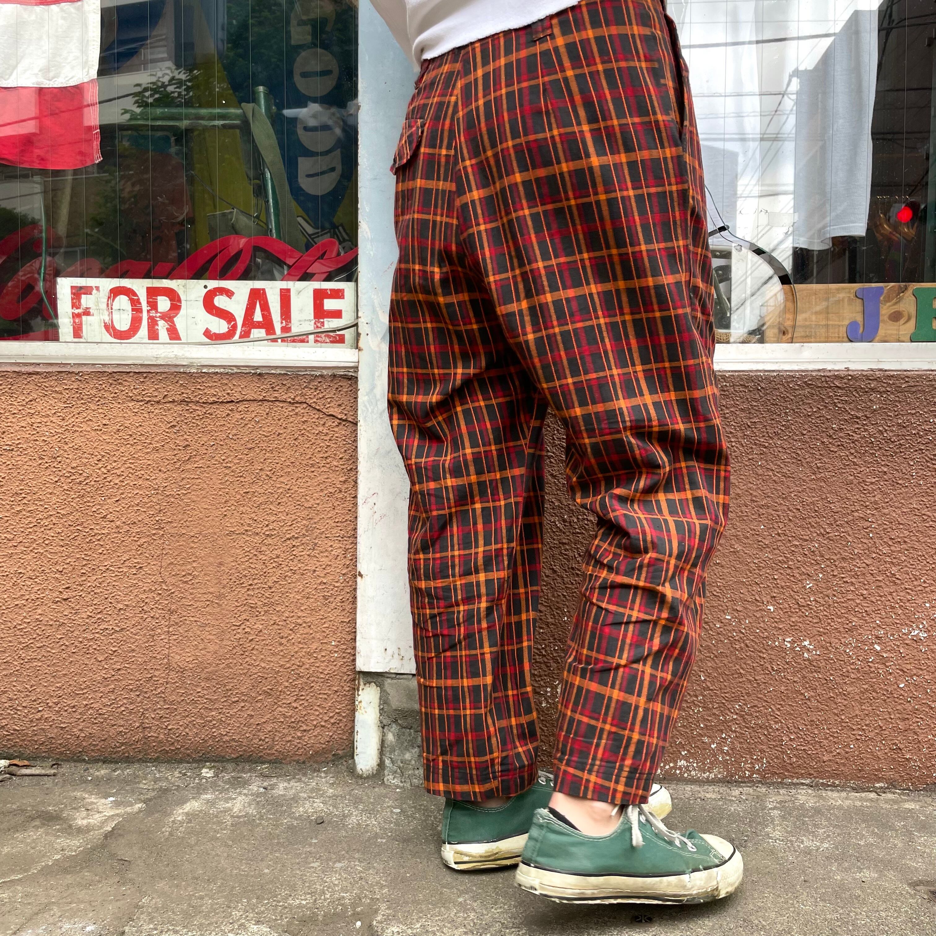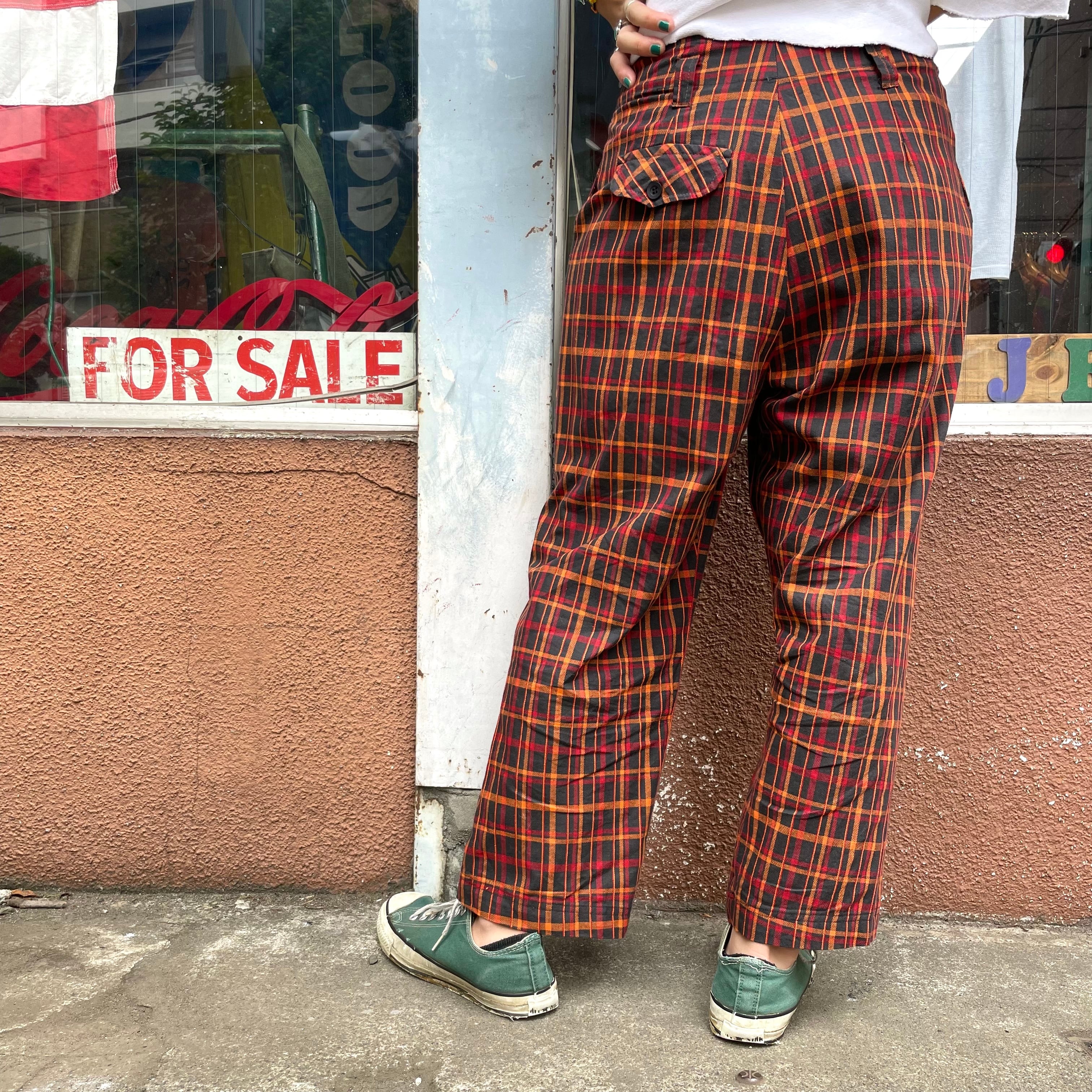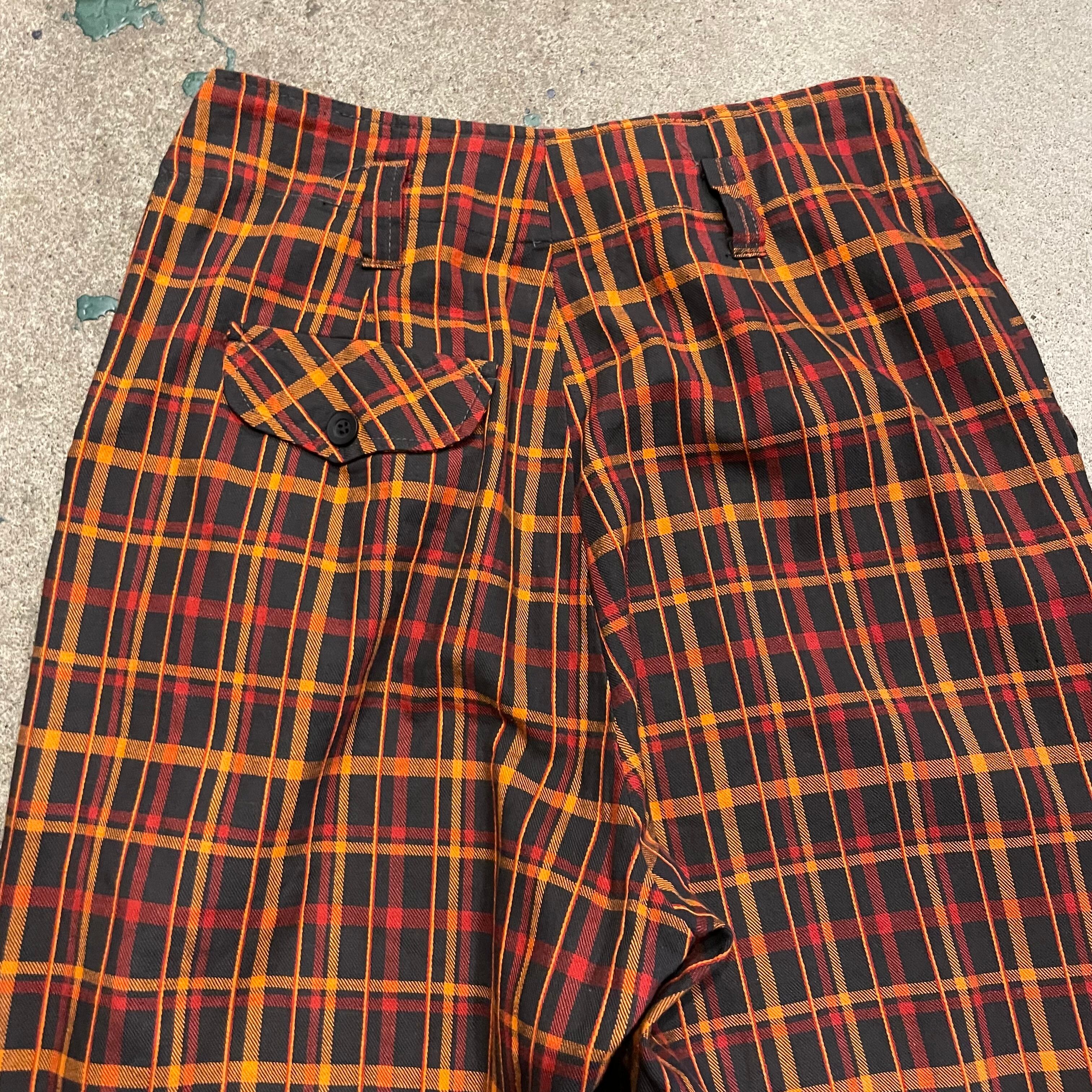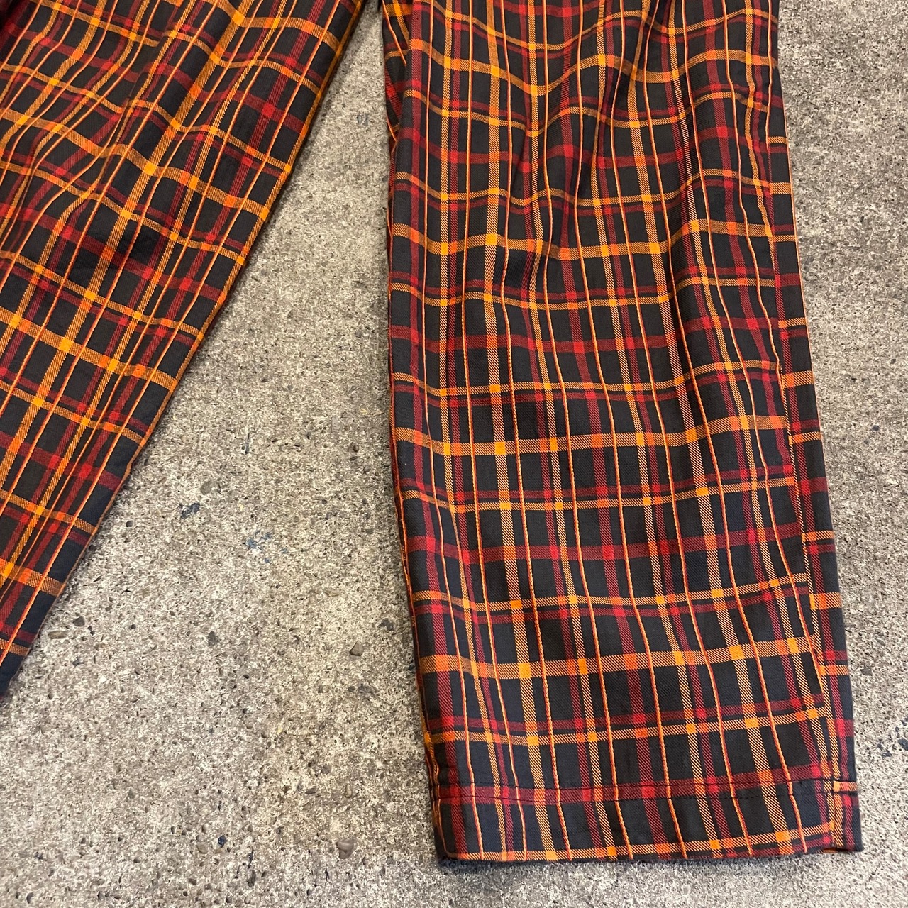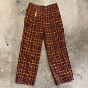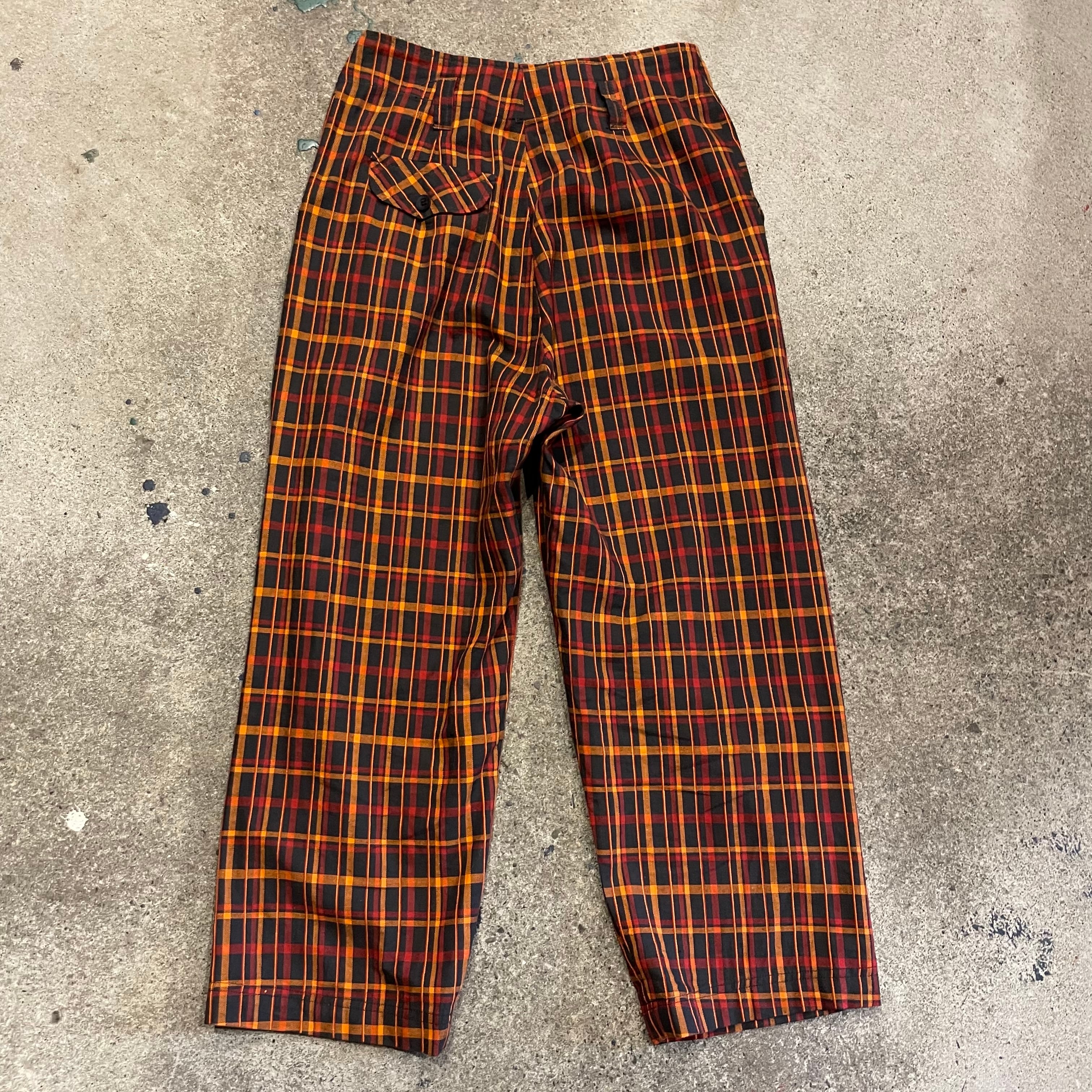焦茶っぽい黒っぽい色をベースにオレンジや赤のチェックがかわいいパンツです。