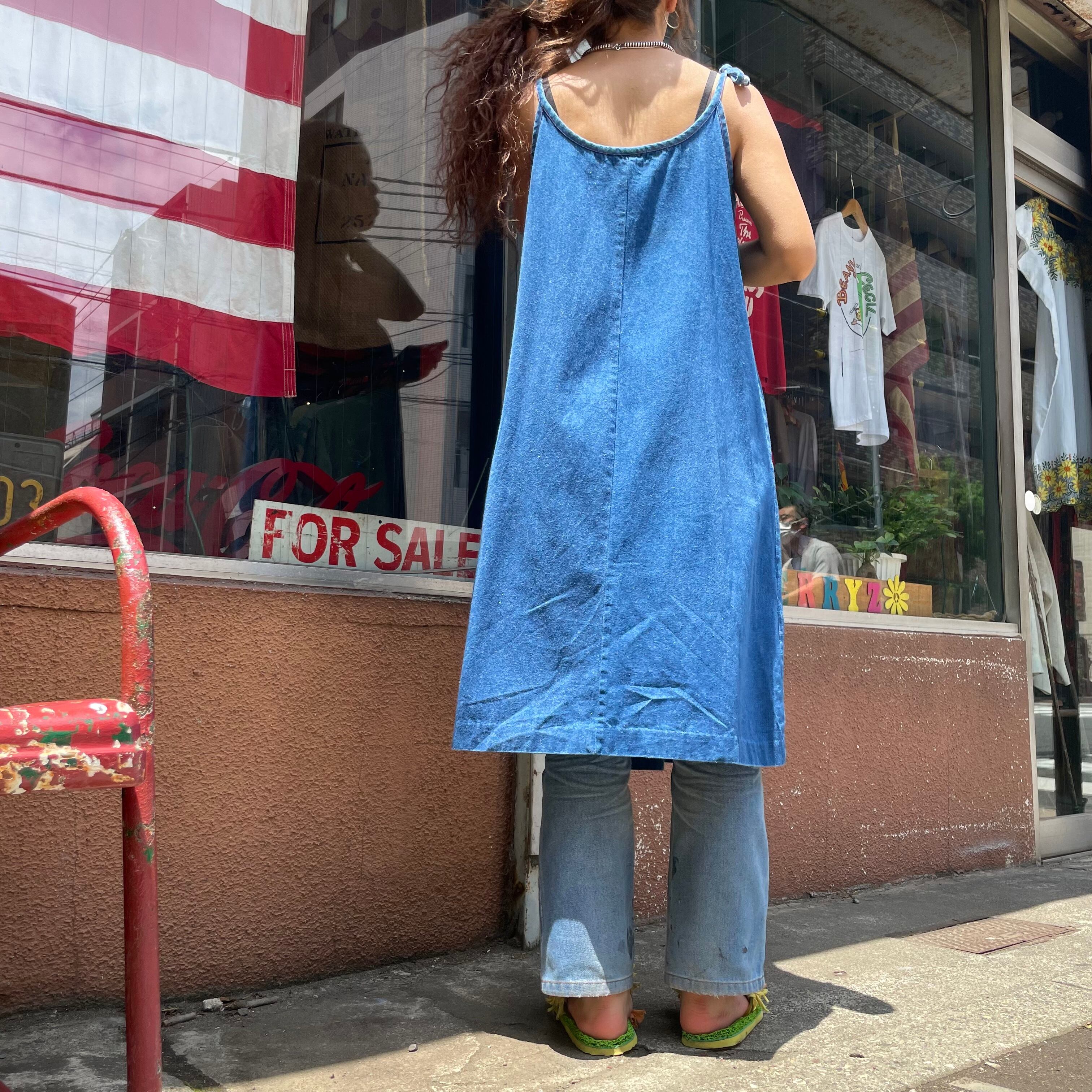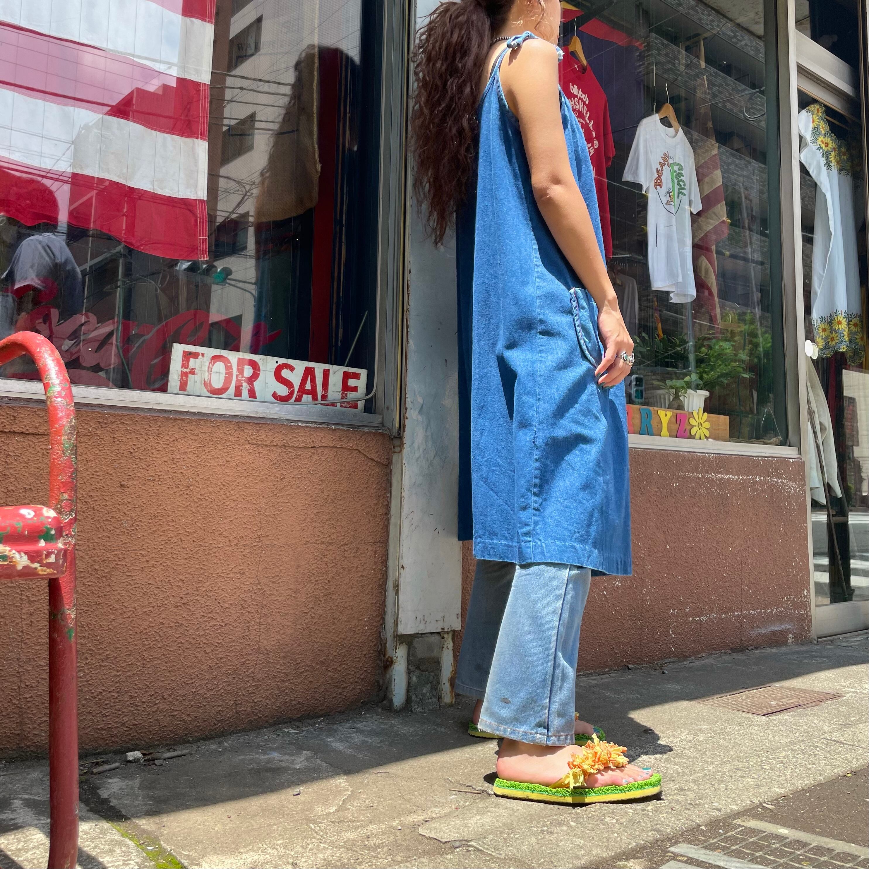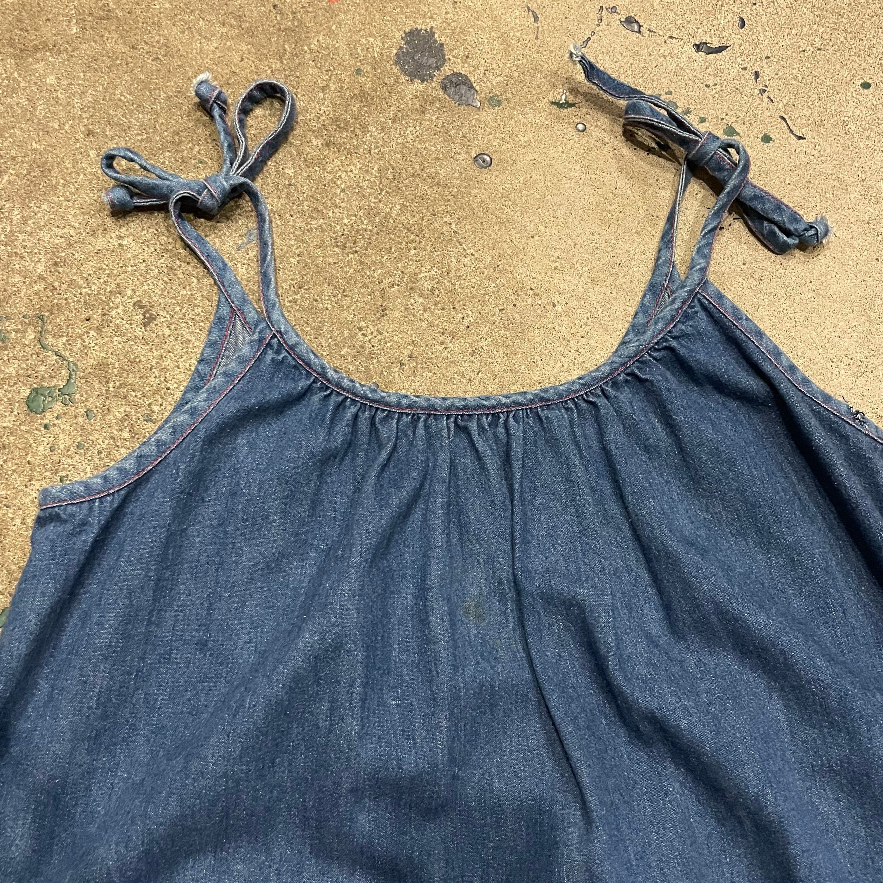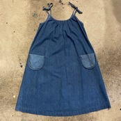 肩で結ぶタイプのキャミソールがかわいいデニム素材のワンピースです。