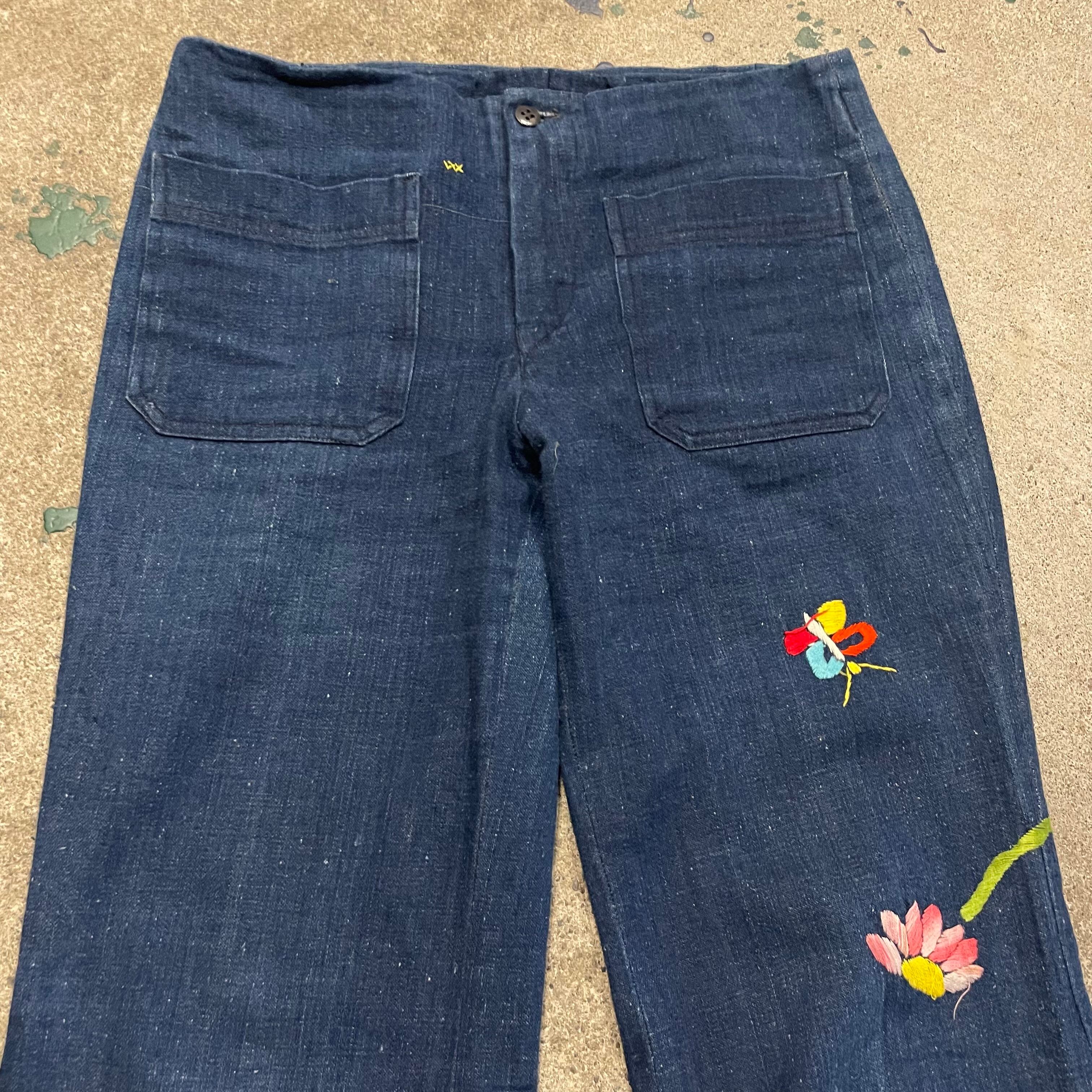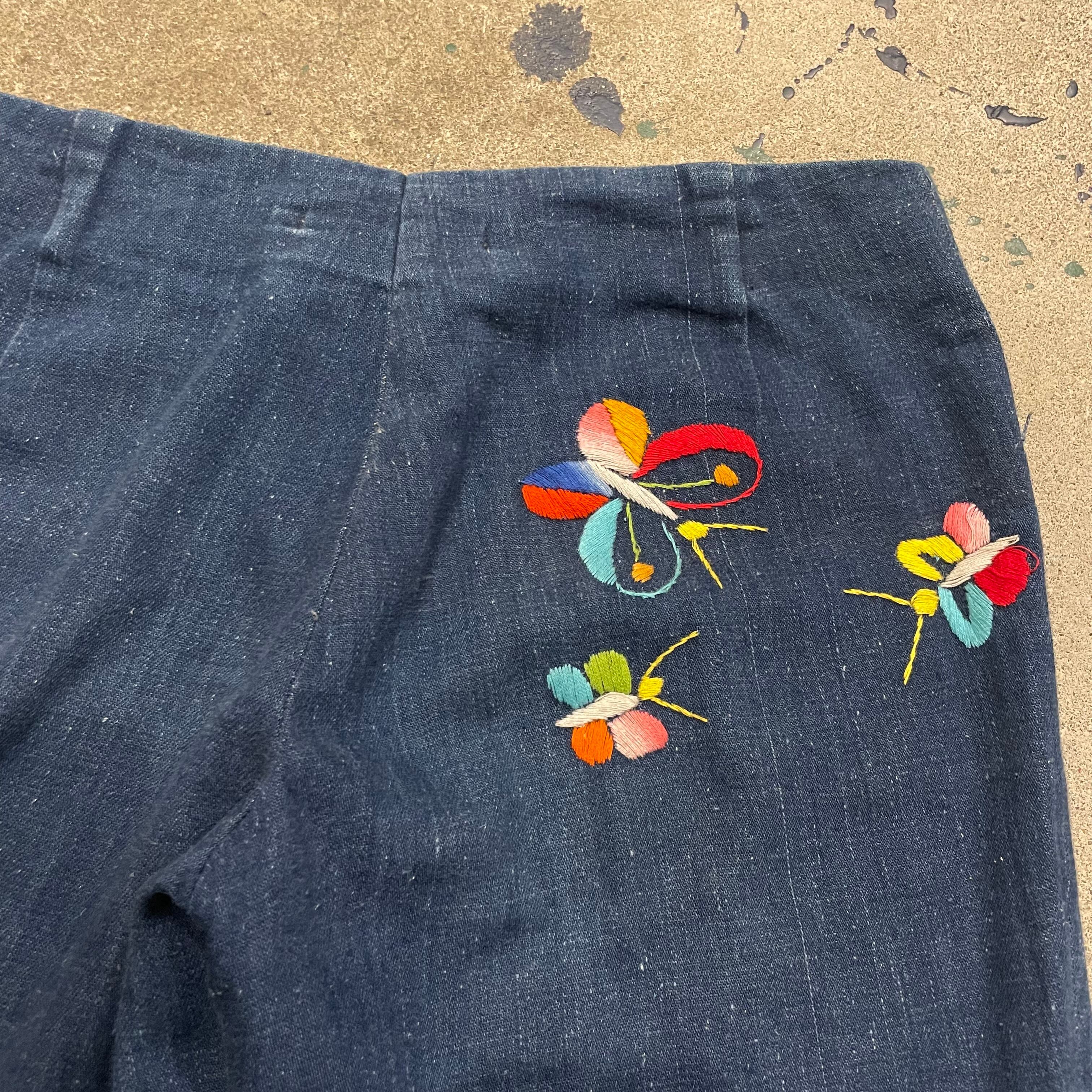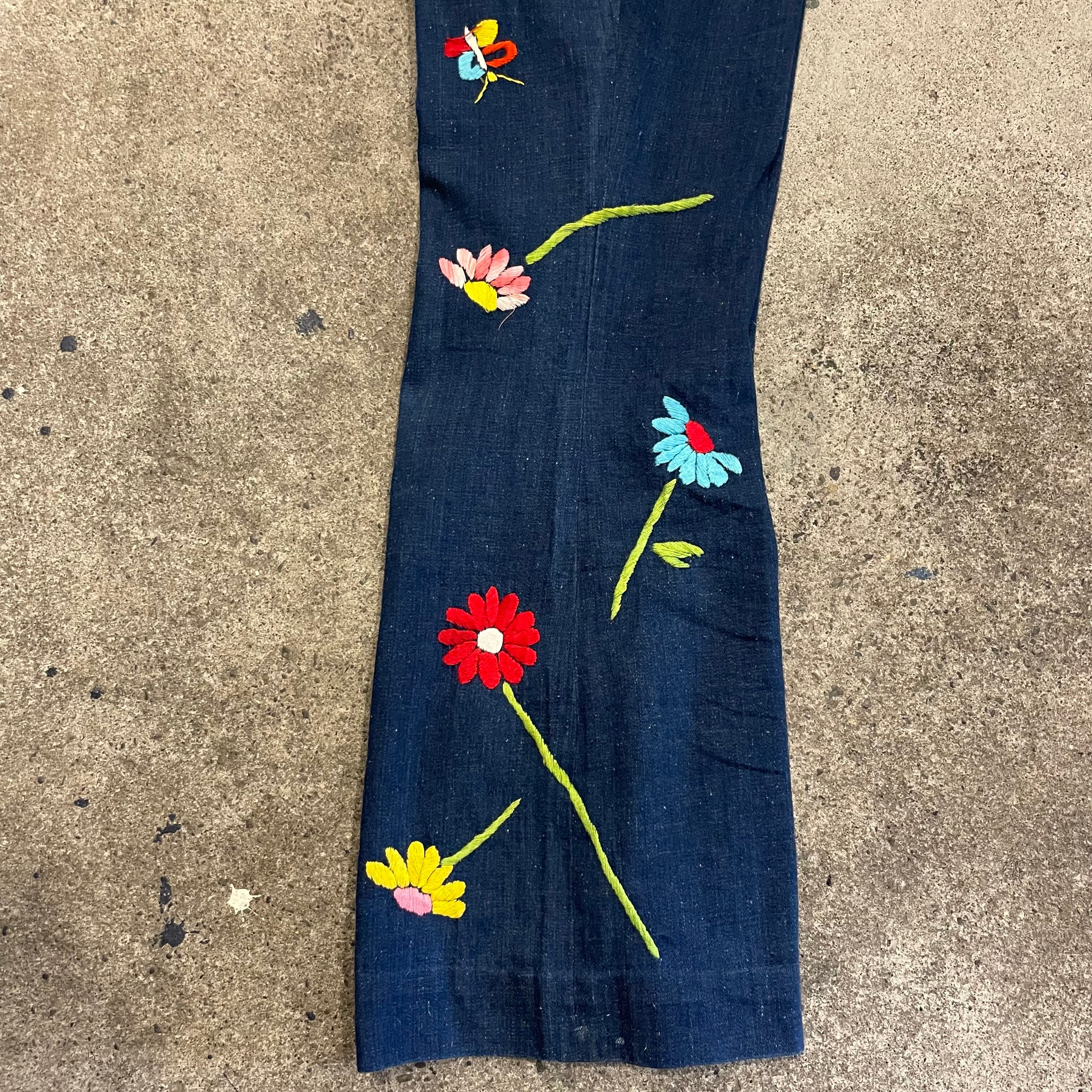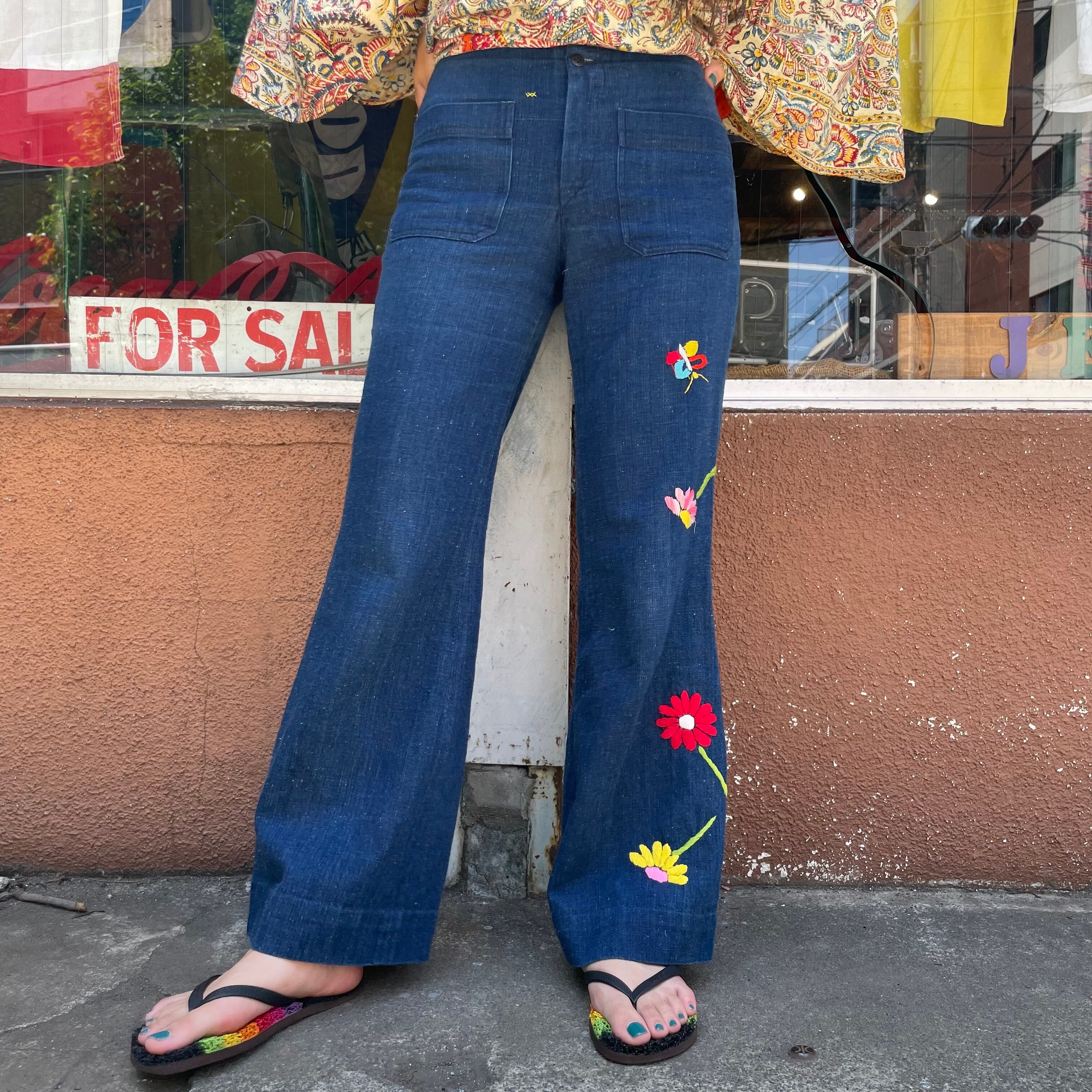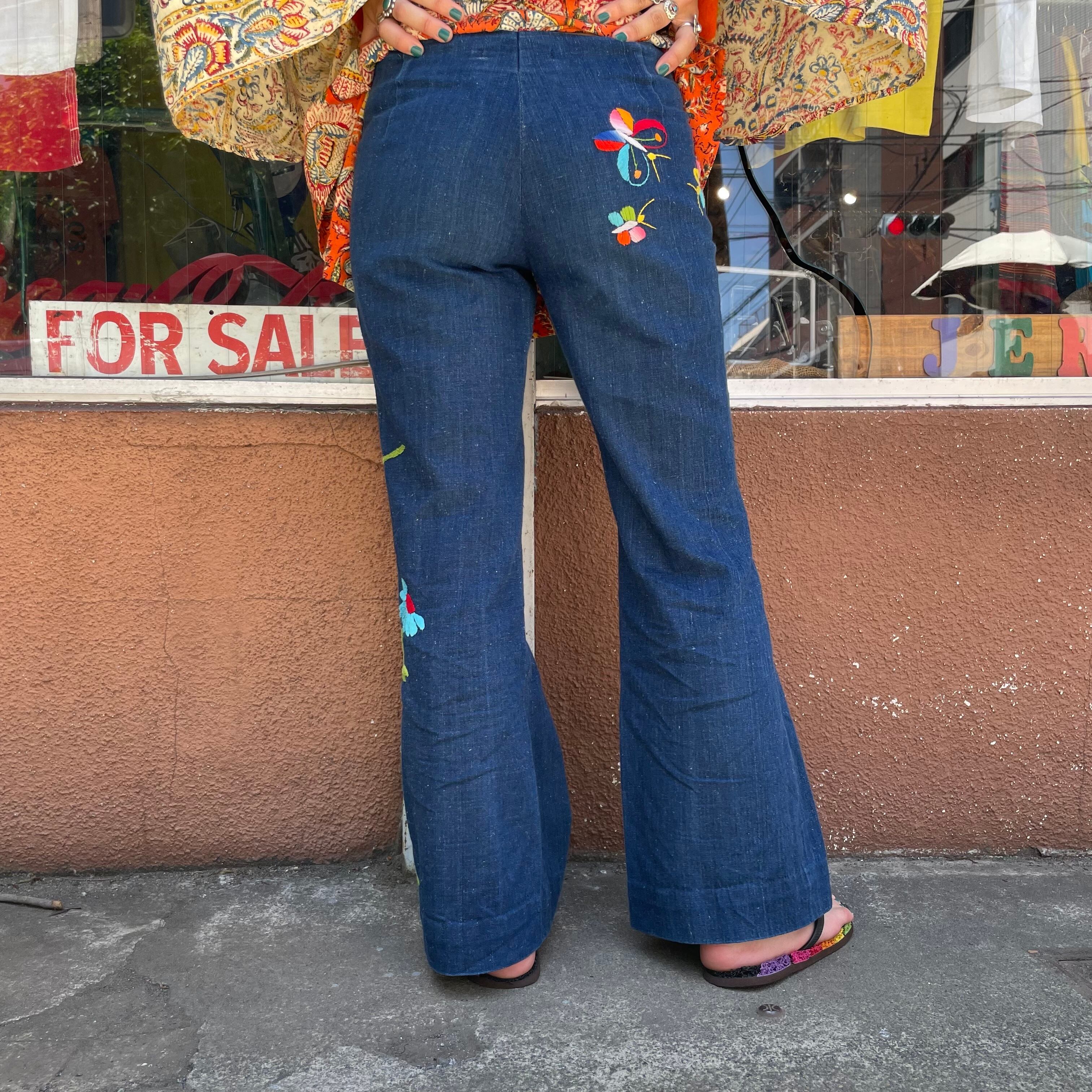 お花と蝶々の手刺繍がとてもかわいいフレアデニムパンツです。おそらく70年代頃のものだと思われます。