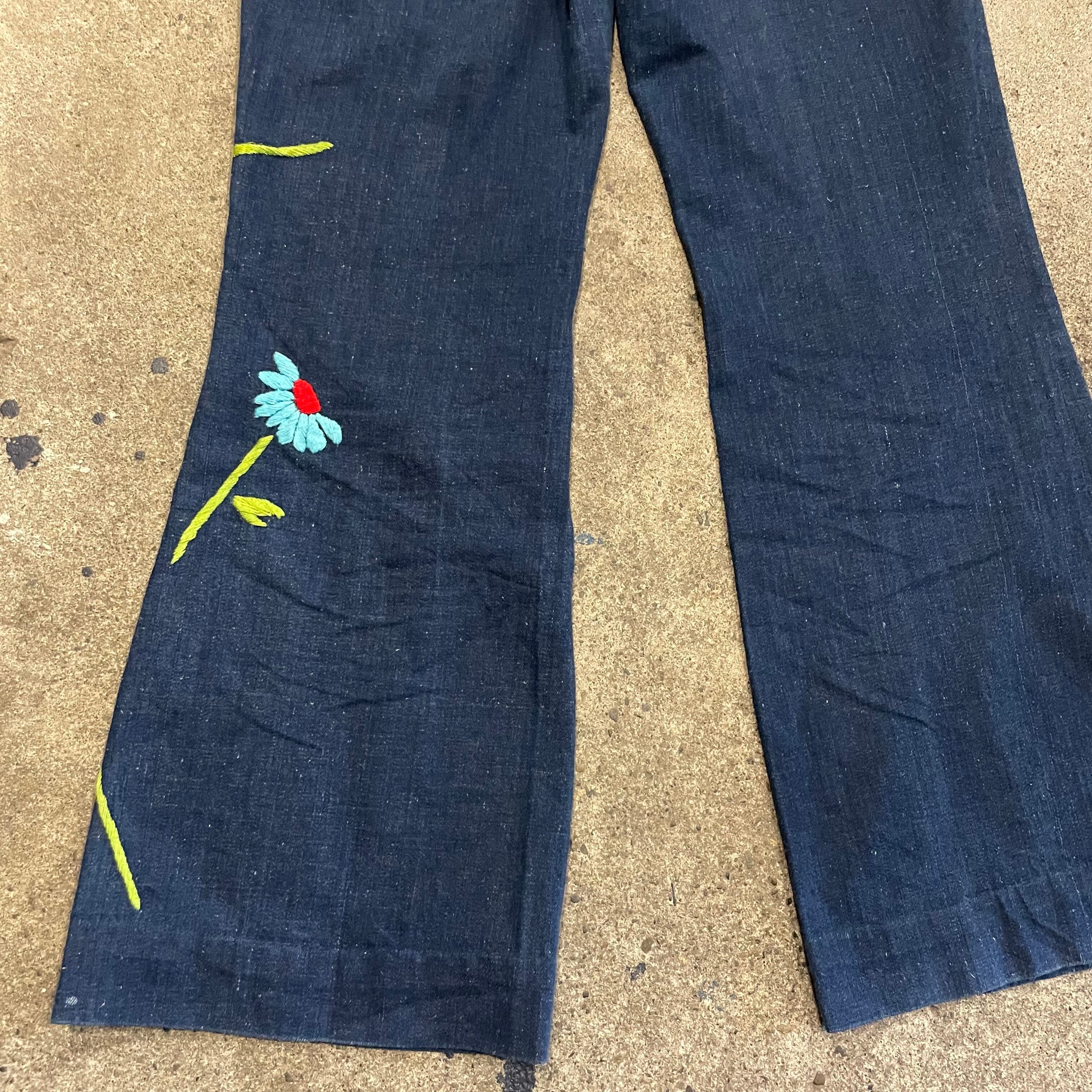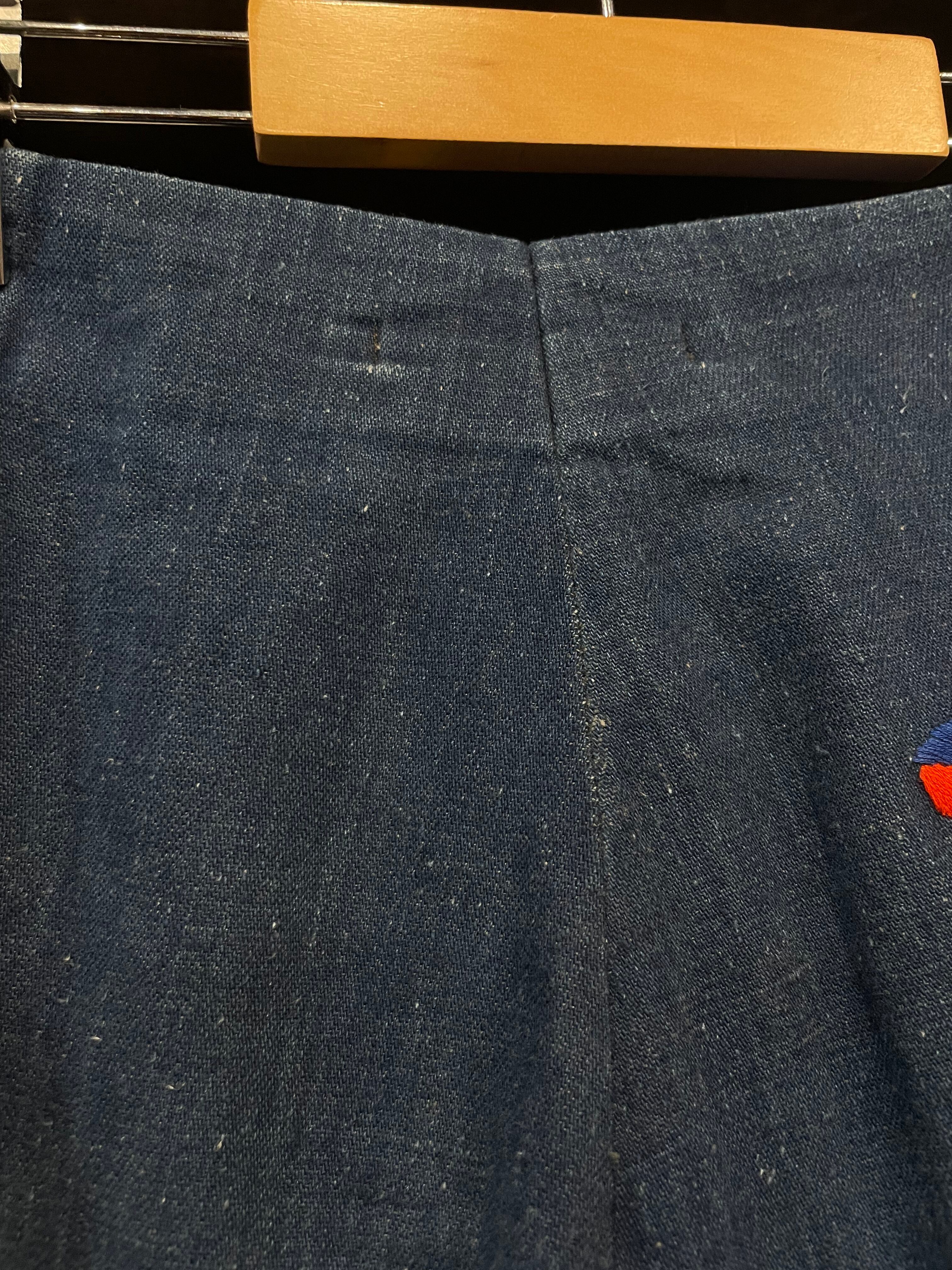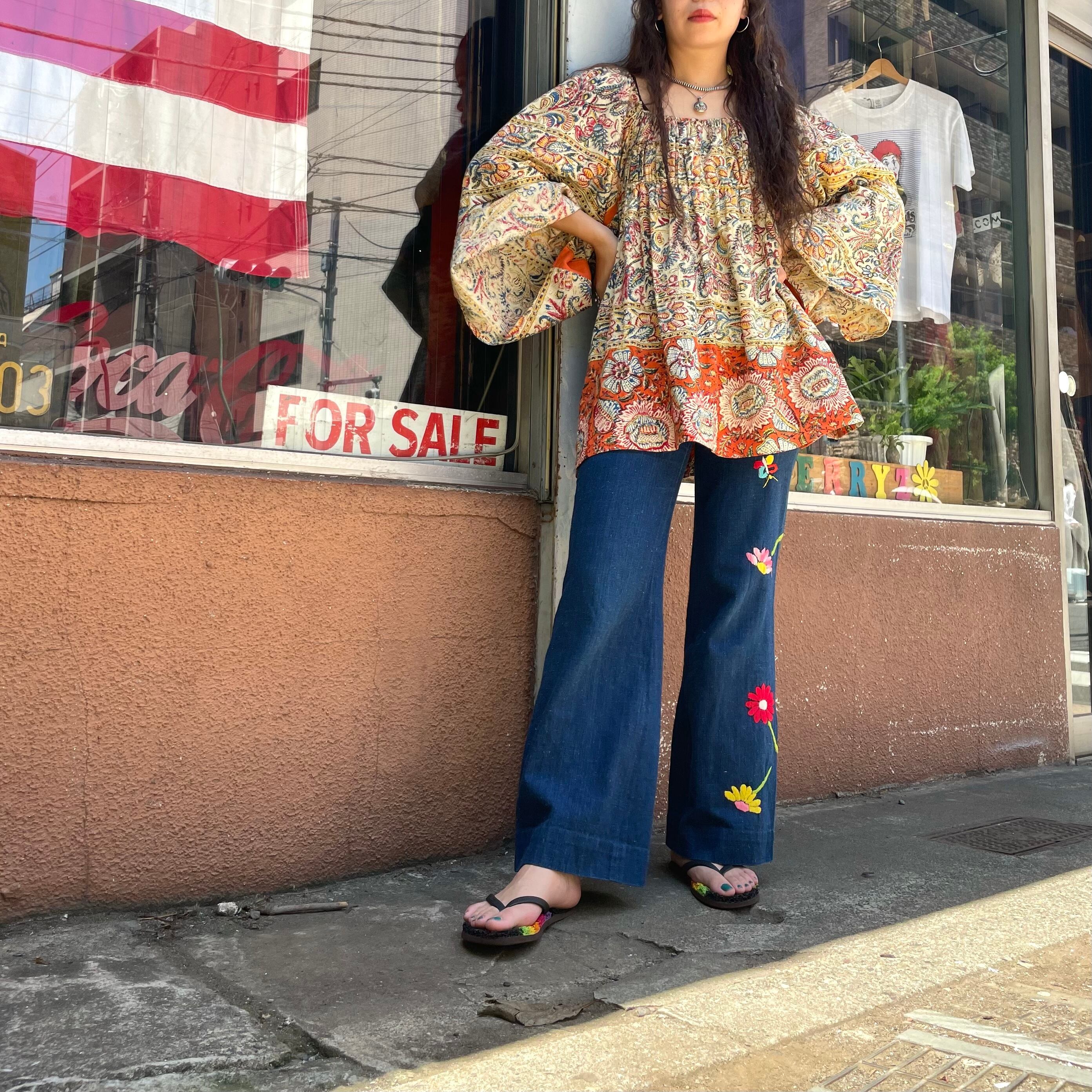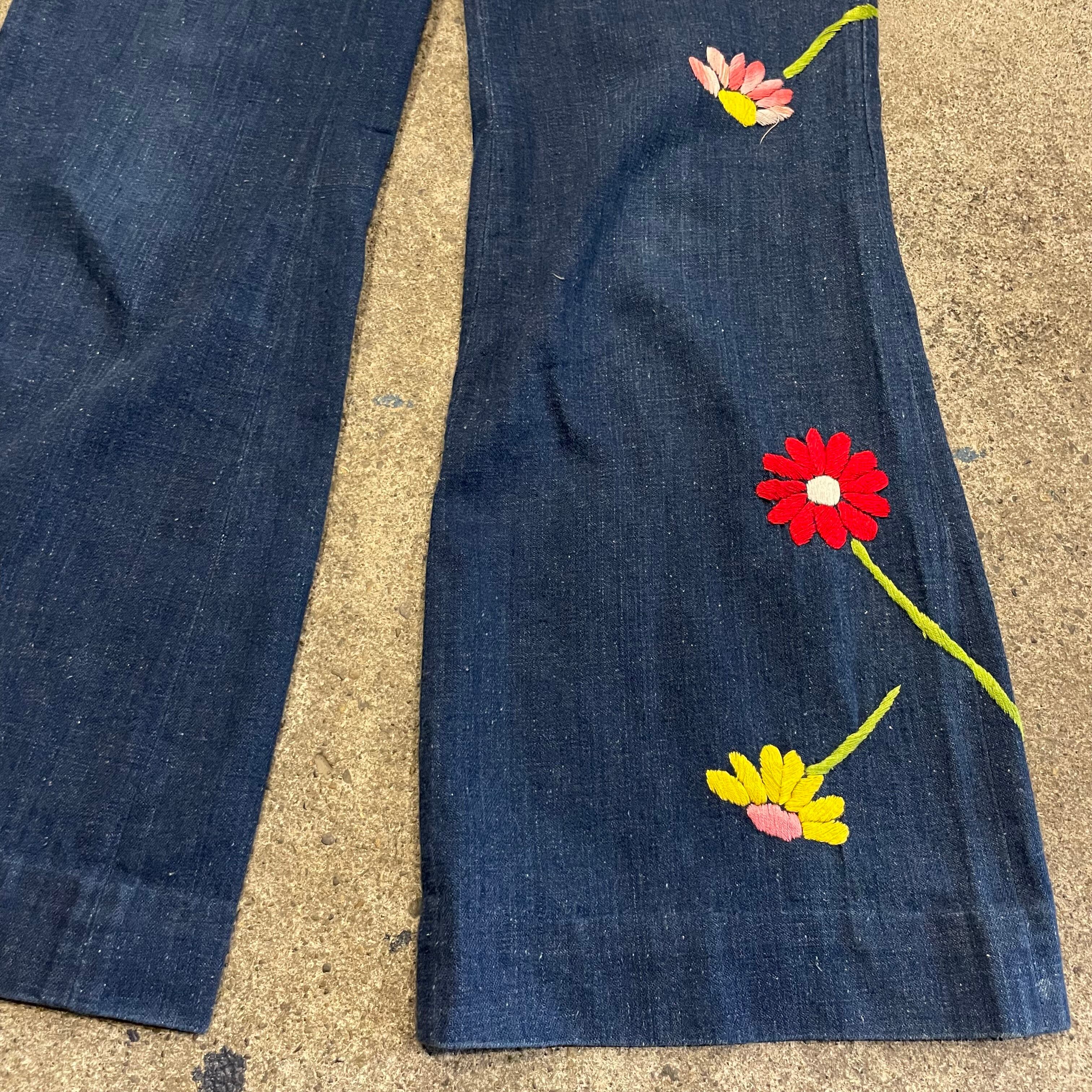お花と蝶々の手刺繍がとてもかわいいフレアデニムパンツです。おそらく70年代頃のものだと思われます。