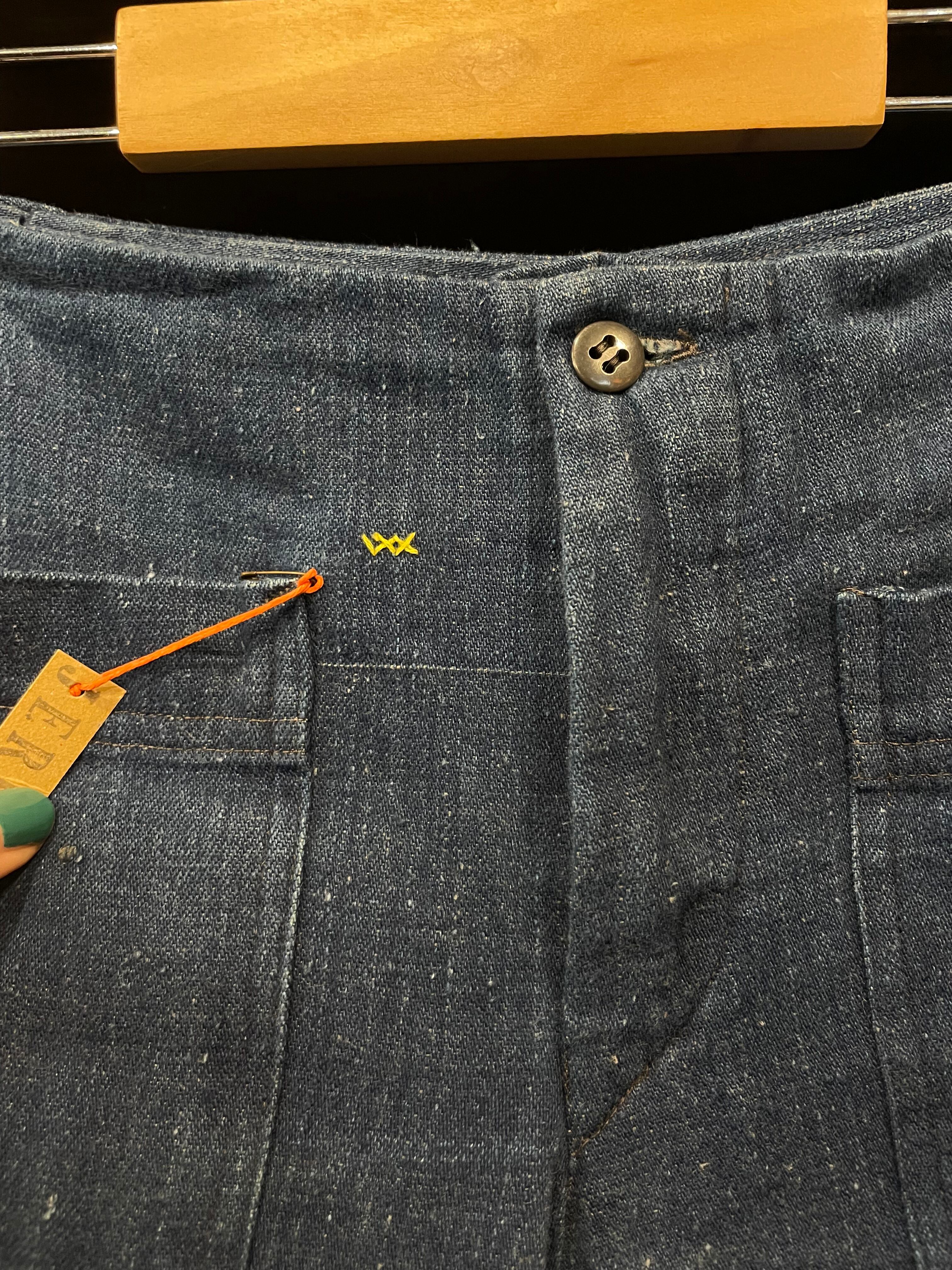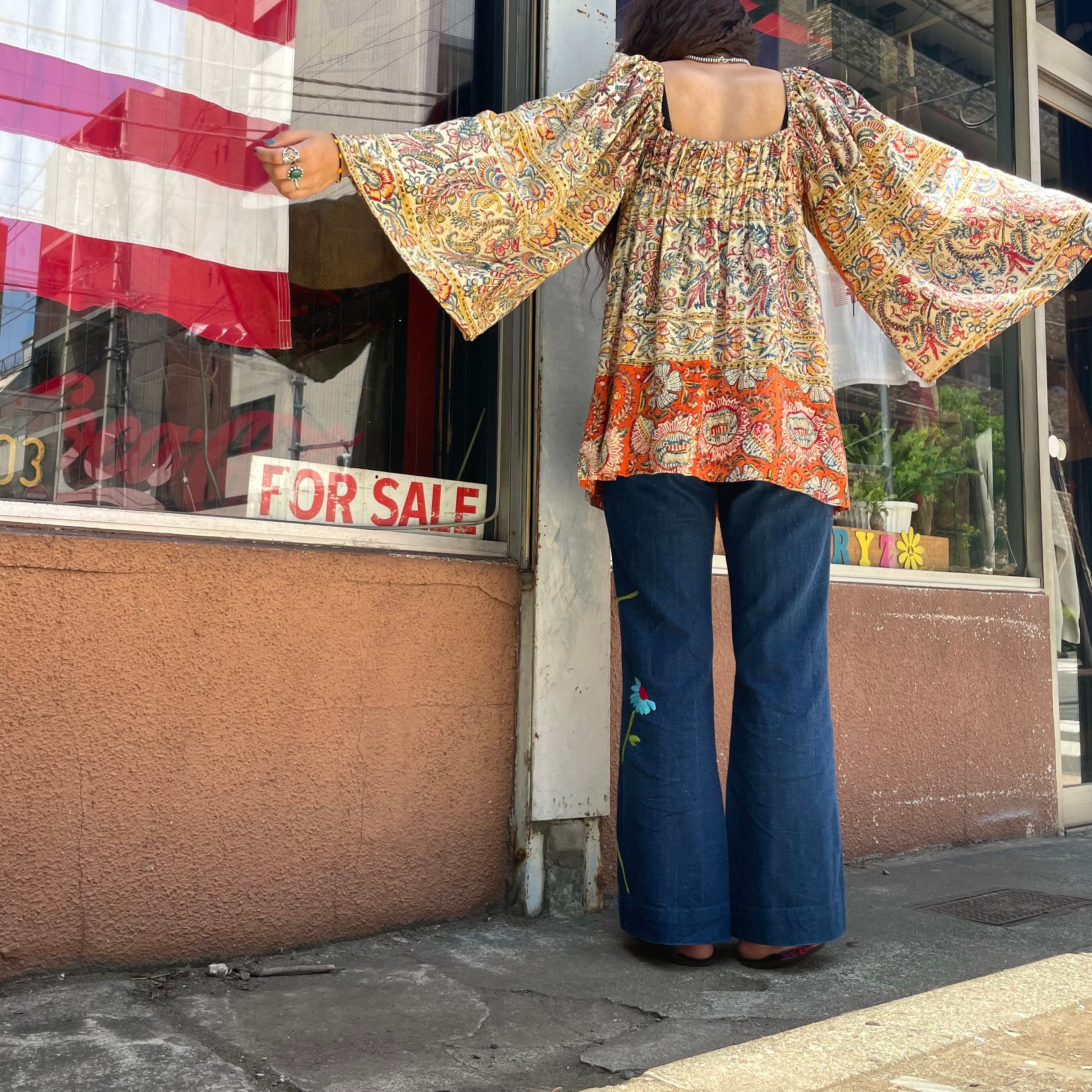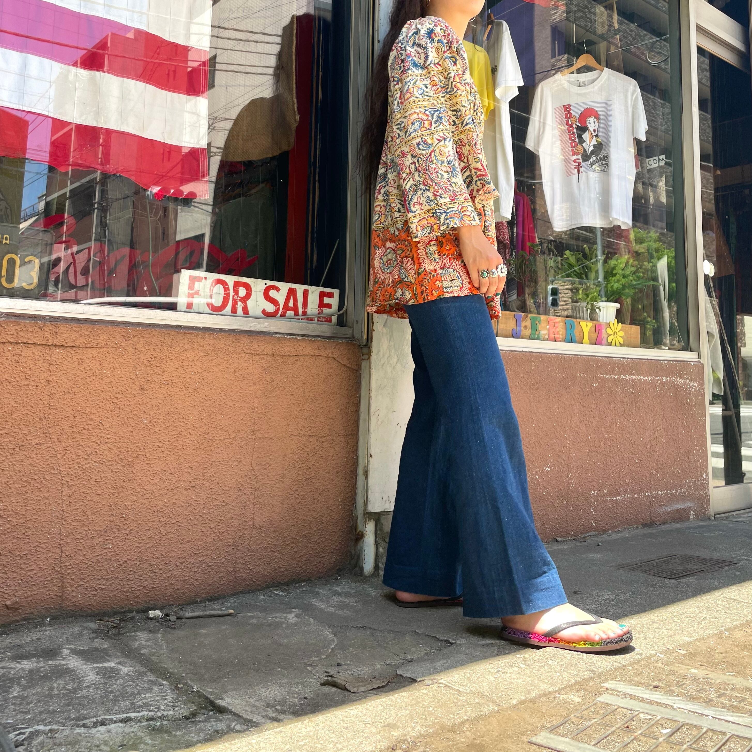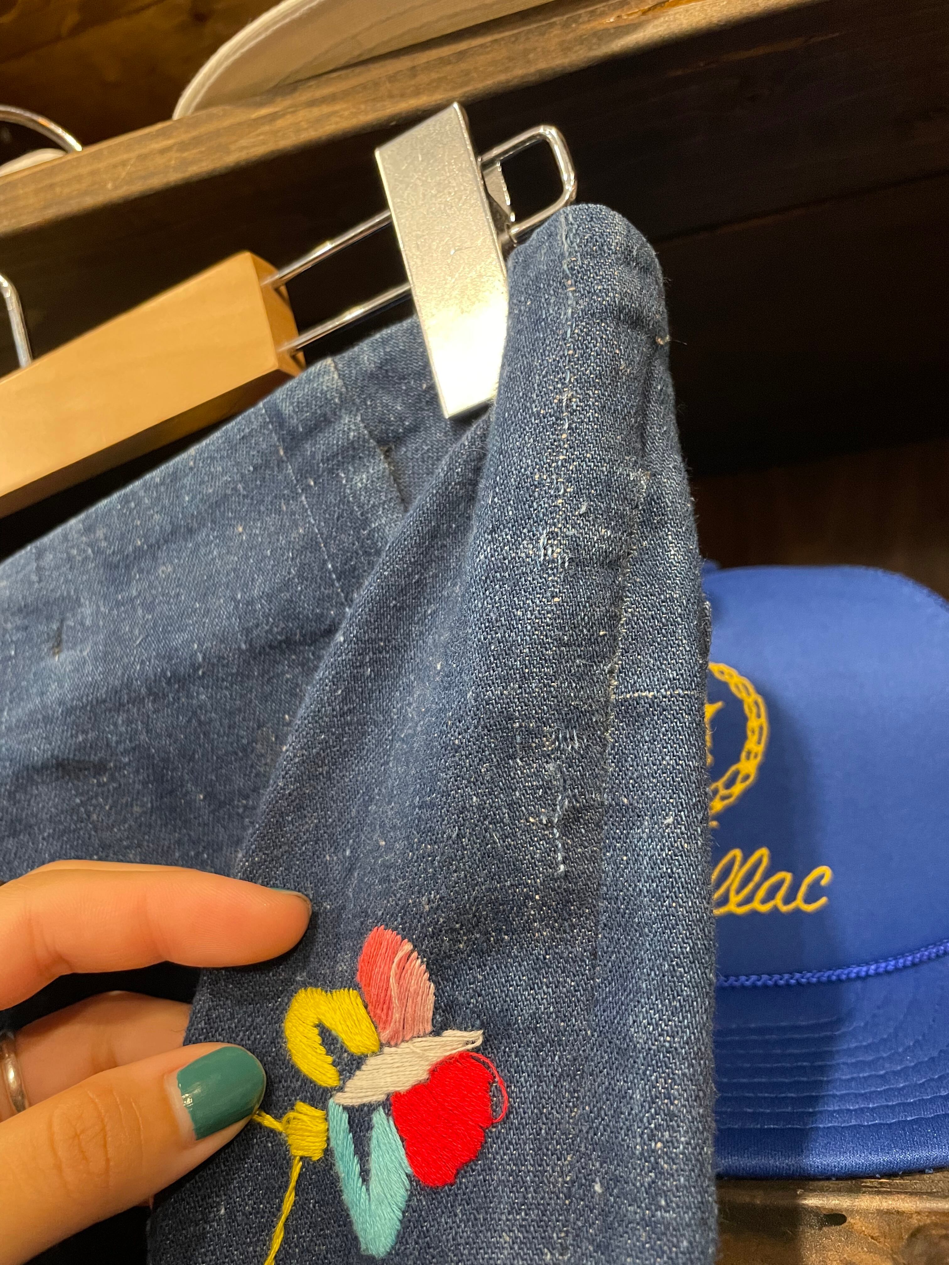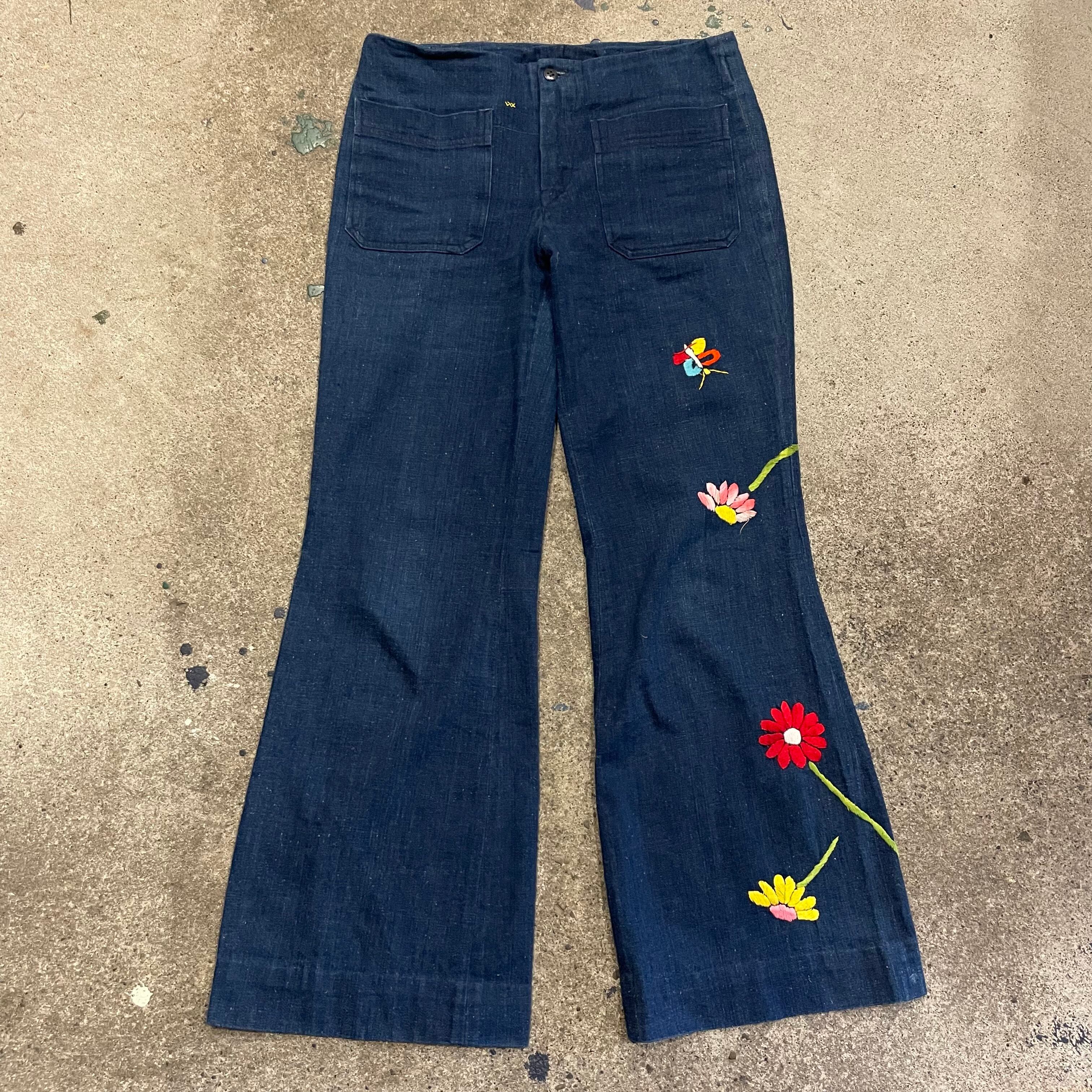 お花と蝶々の手刺繍がとてもかわいいフレアデニムパンツです。おそらく70年代頃のものだと思われます。