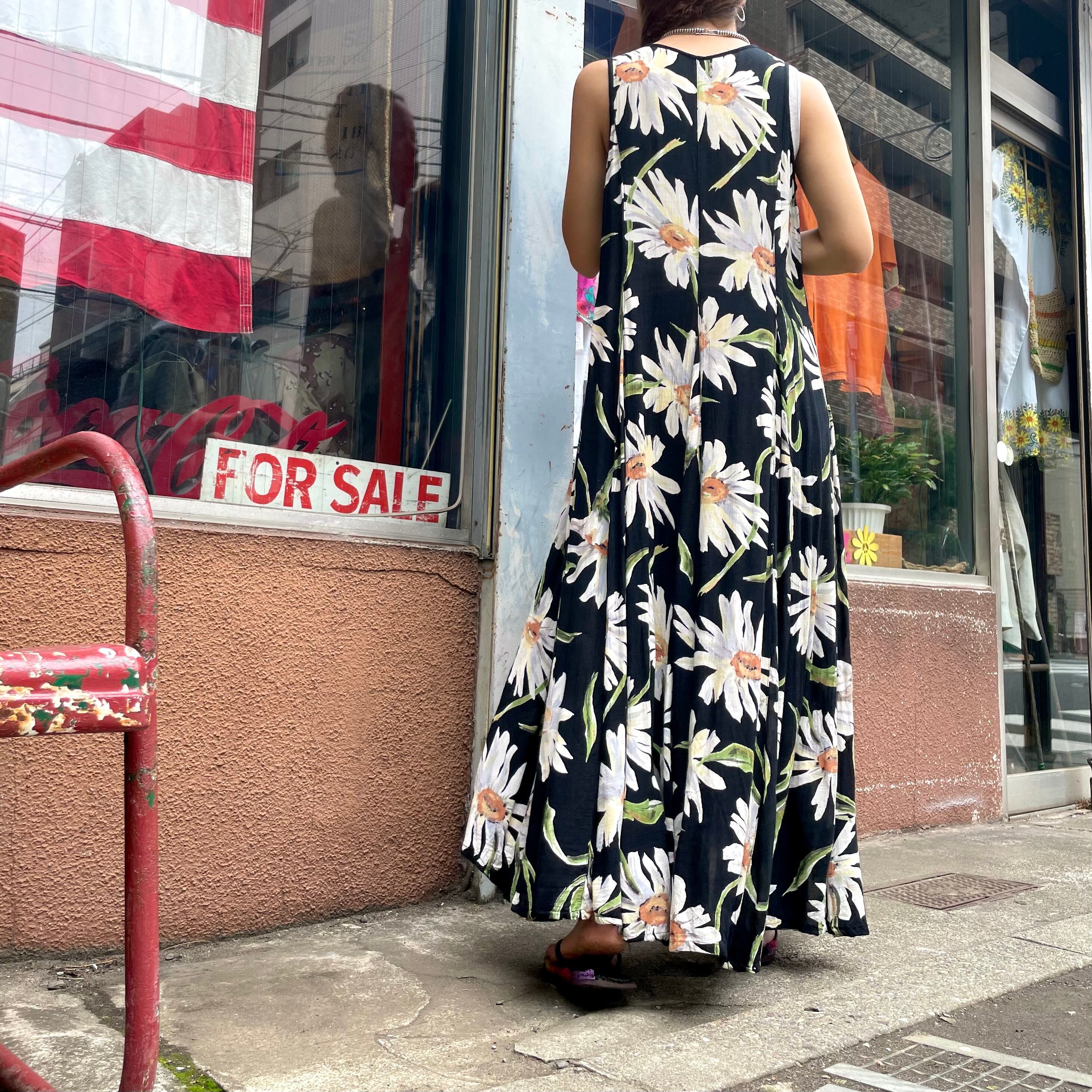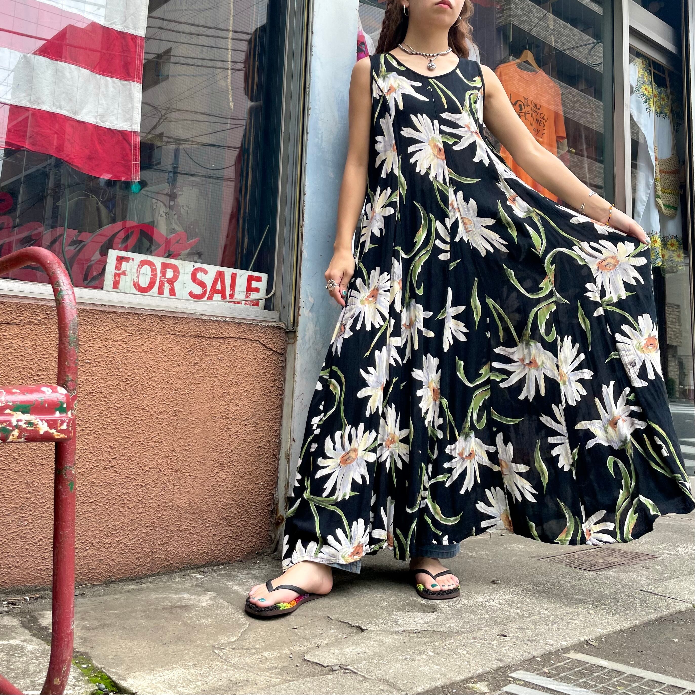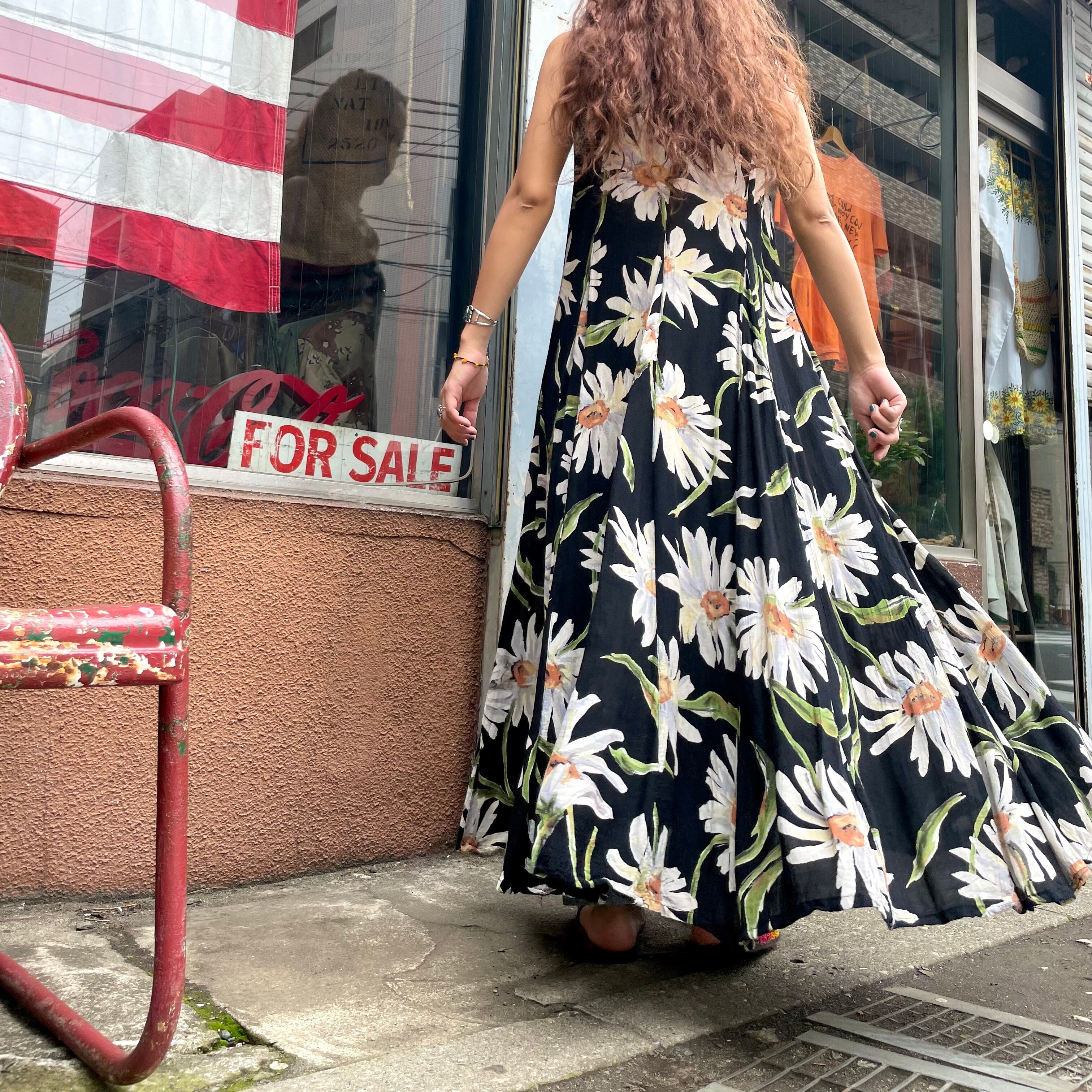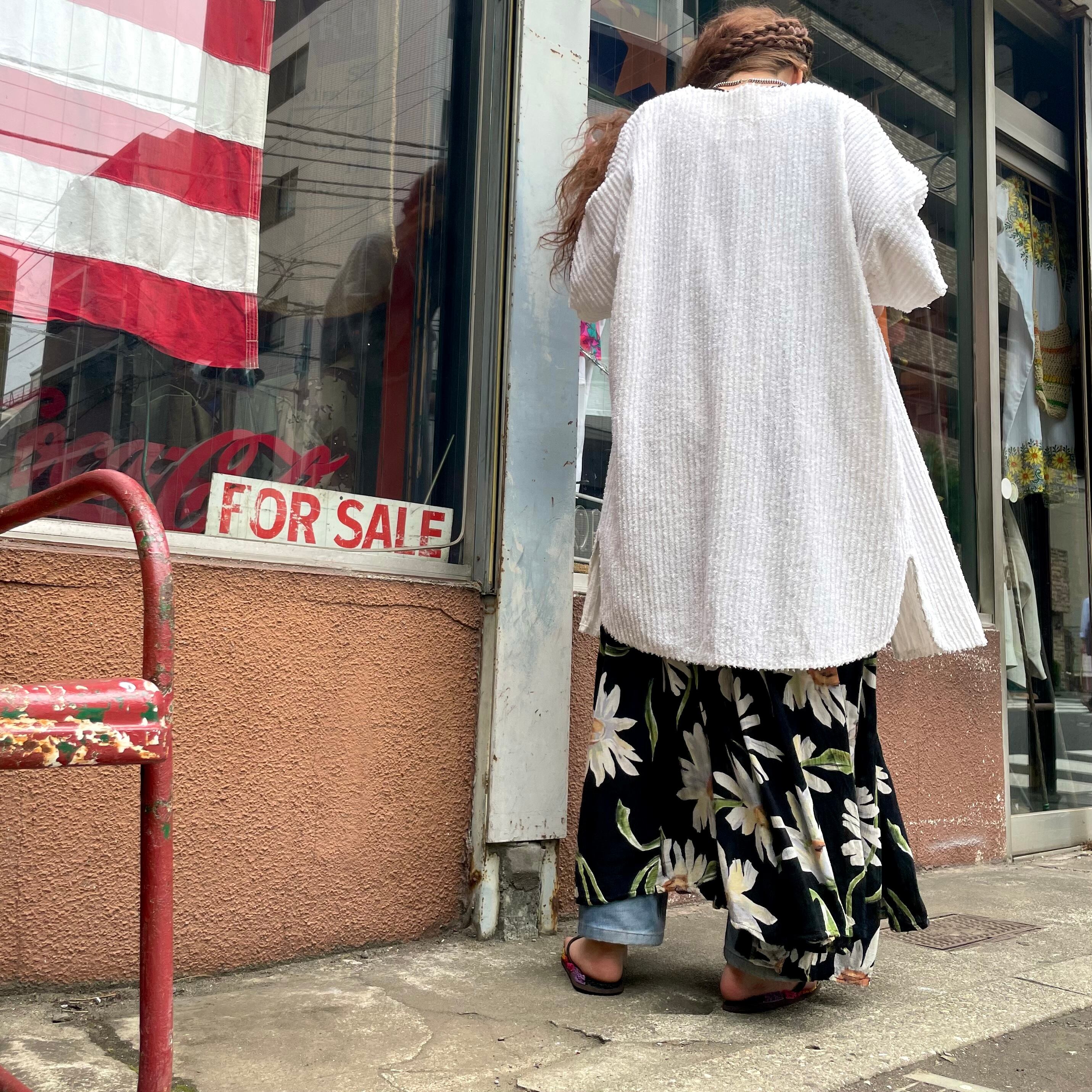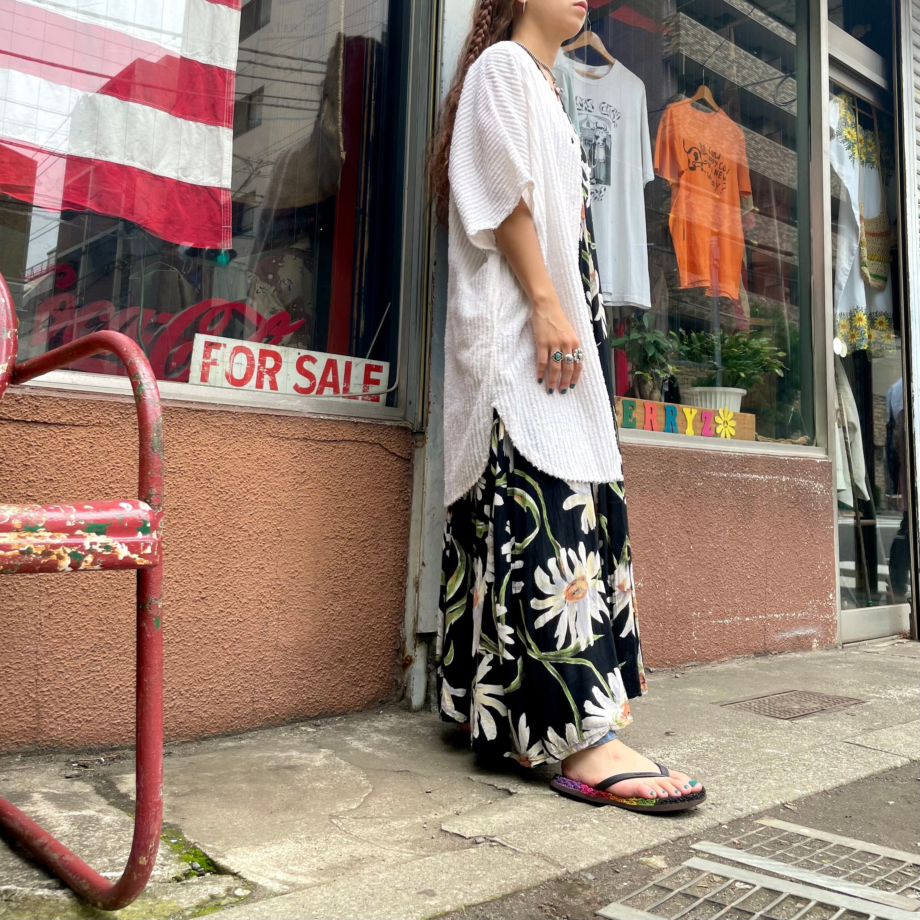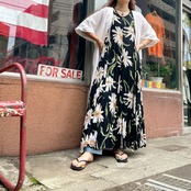 黒地ですがとても華やかで大人っぽい雰囲気も良いですね。黄色いパンプスや白い帽子を合わせたり、中にTシャツを合わせてもかわいいと思います。