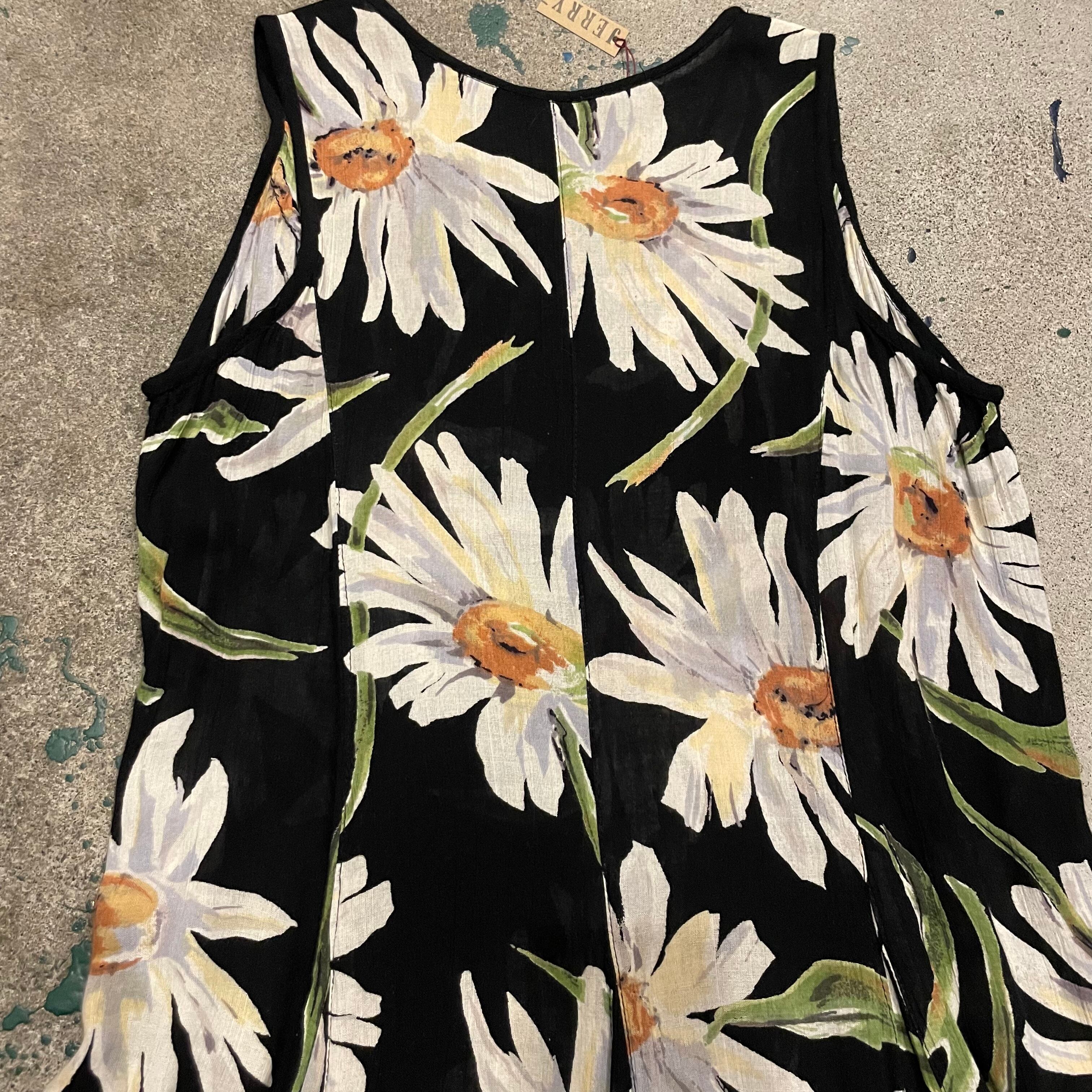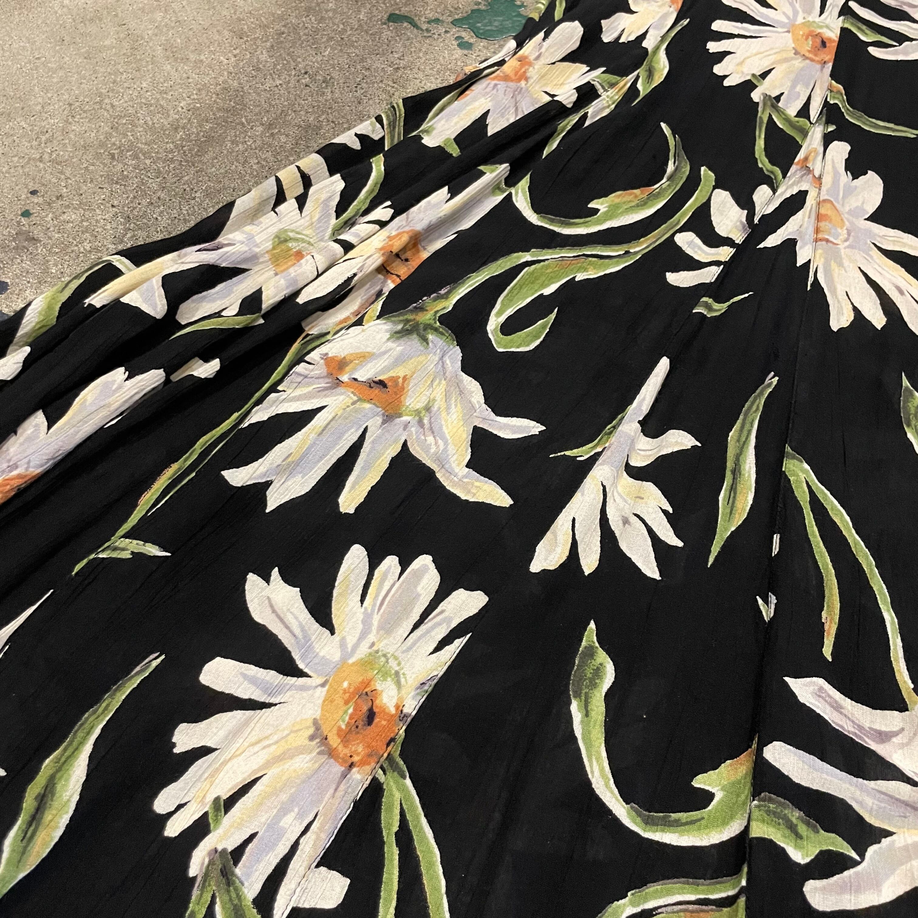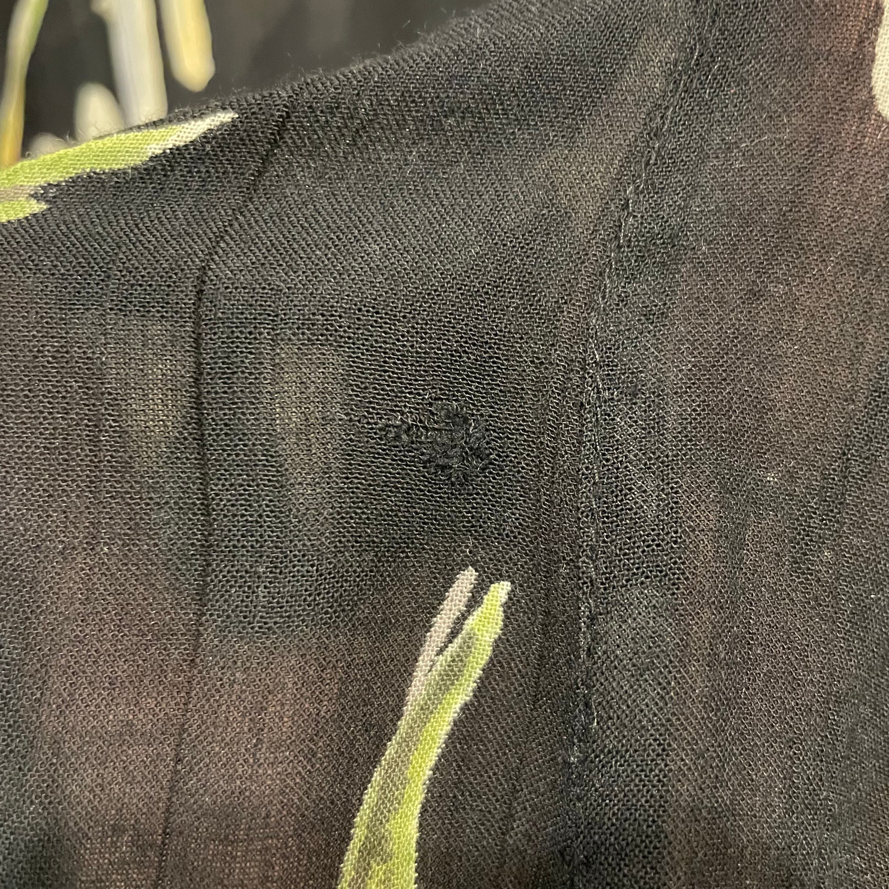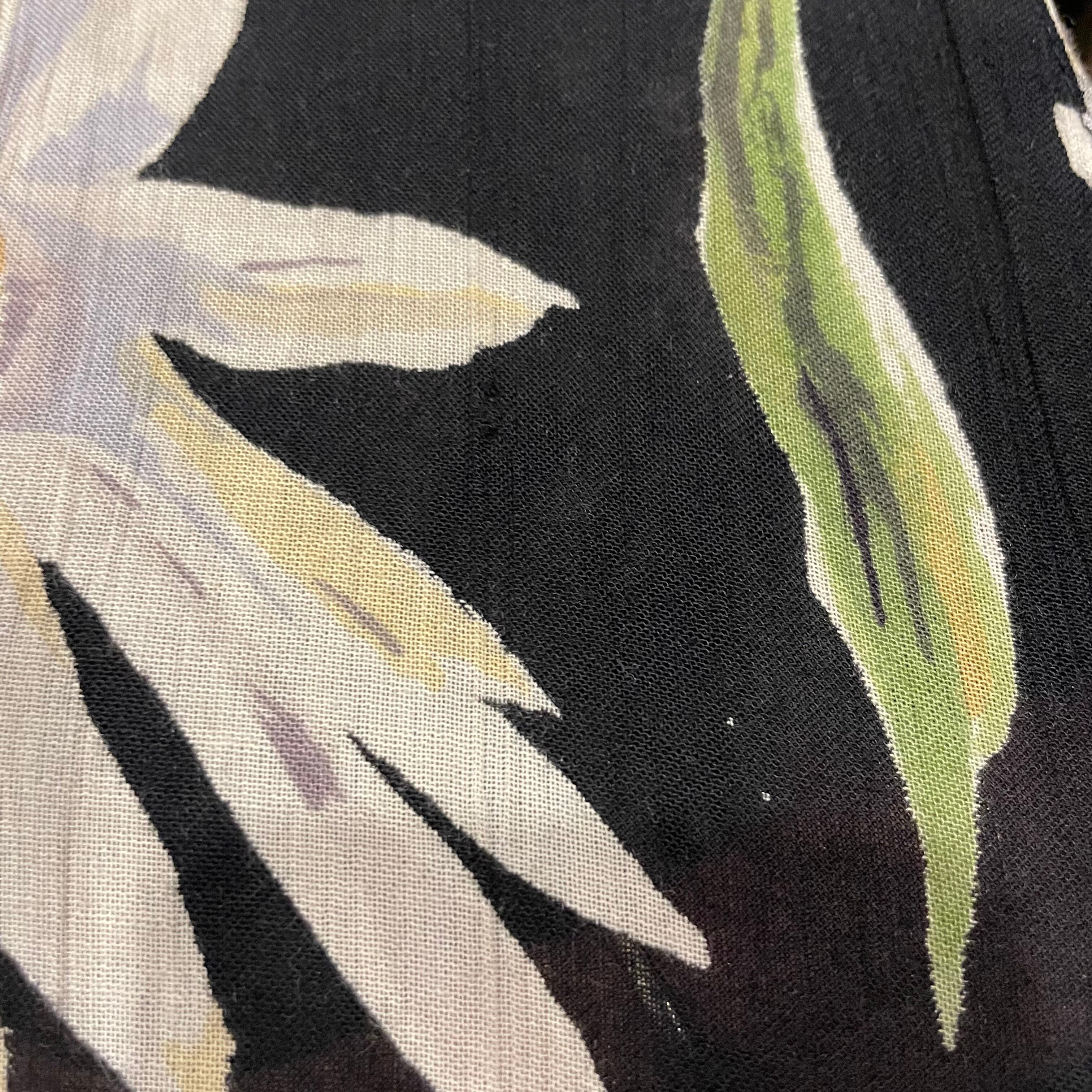 黒地ですがとても華やかで大人っぽい雰囲気も良いですね。黄色いパンプスや白い帽子を合わせたり、中にTシャツを合わせてもかわいいと思います。