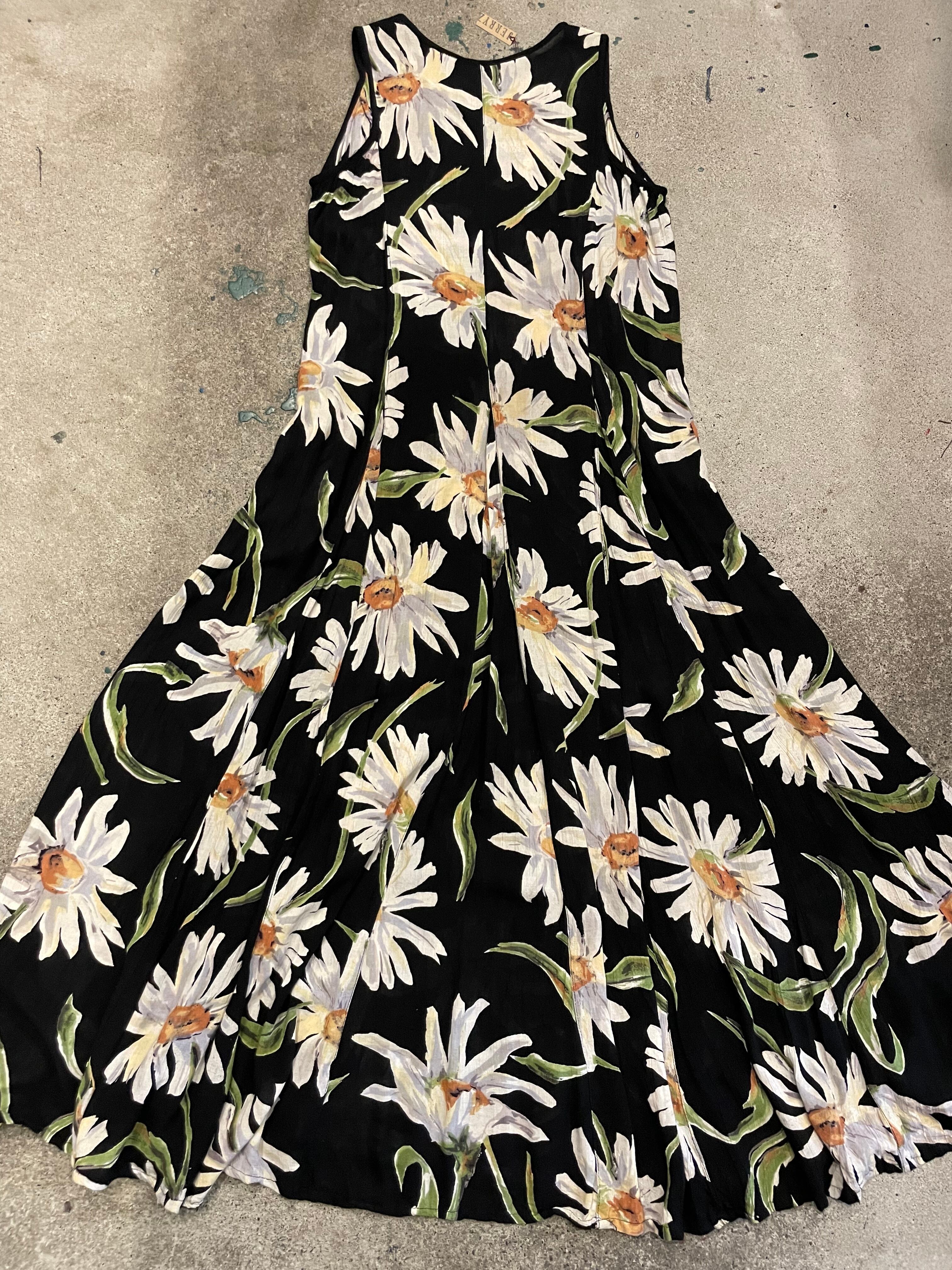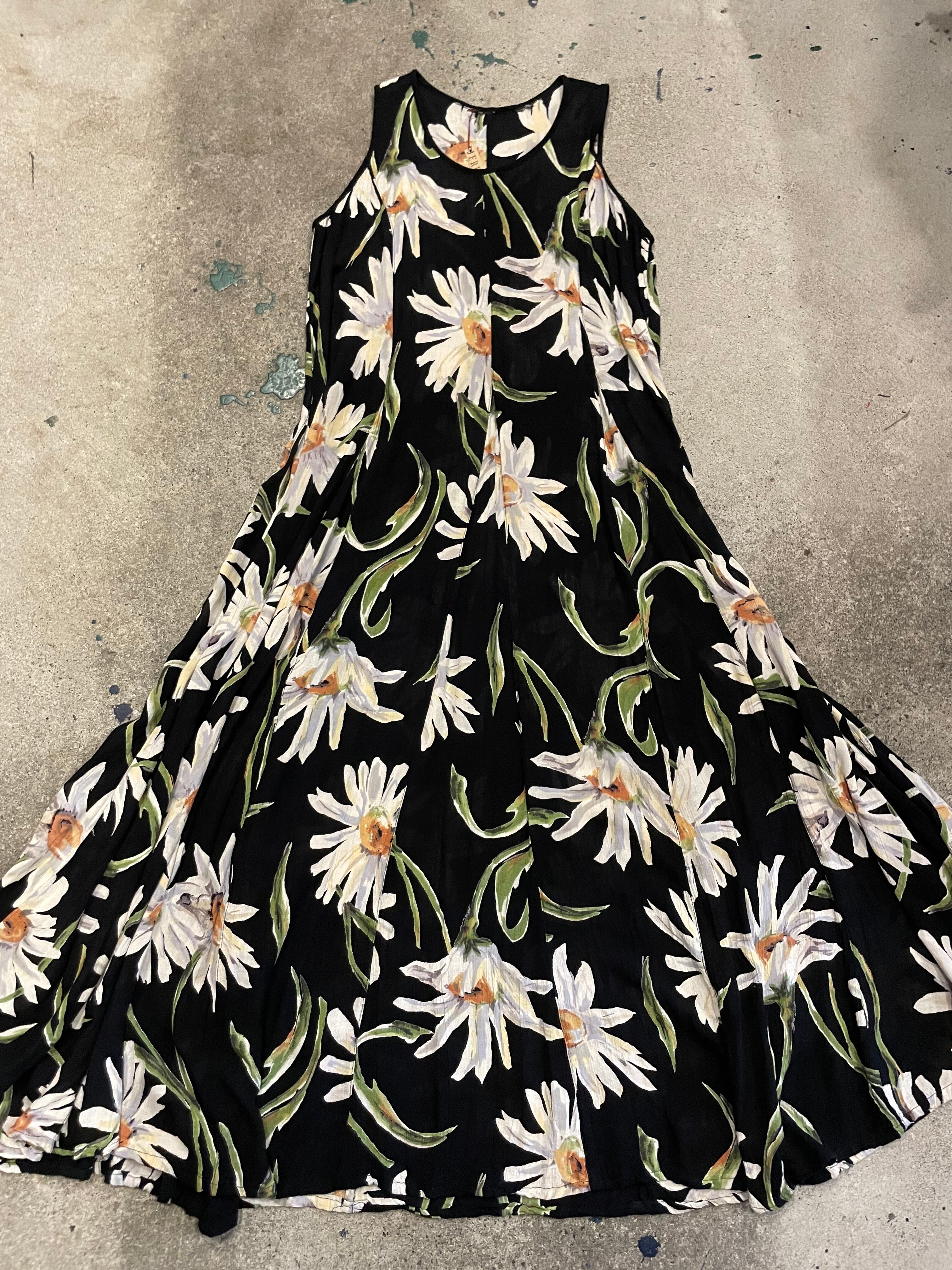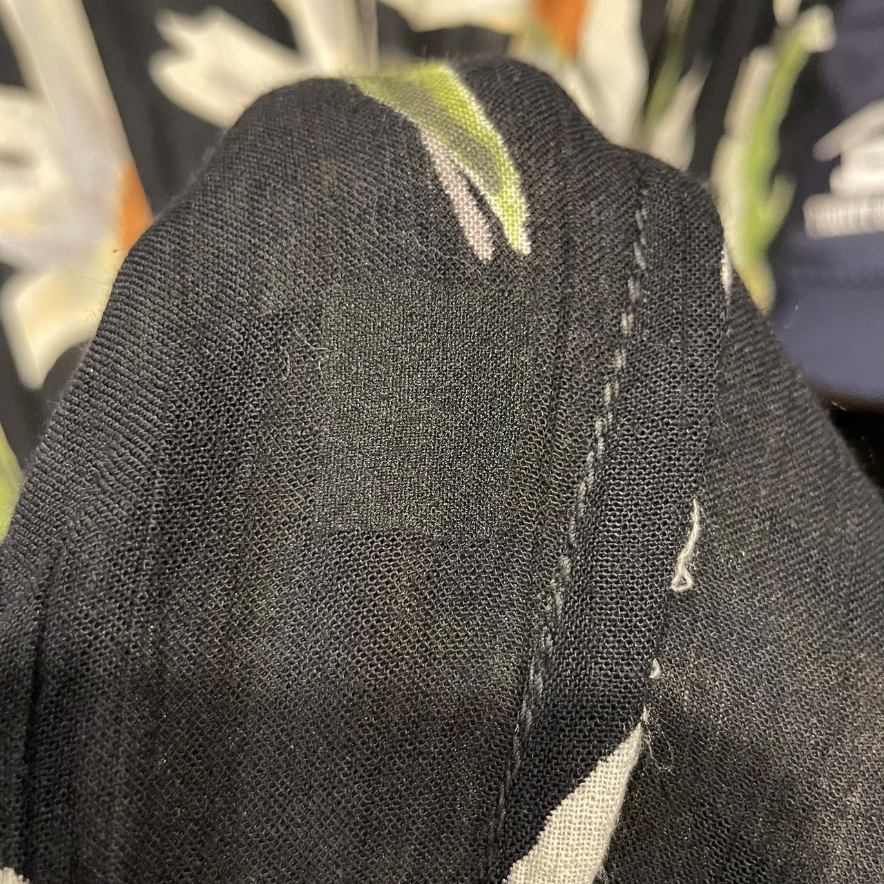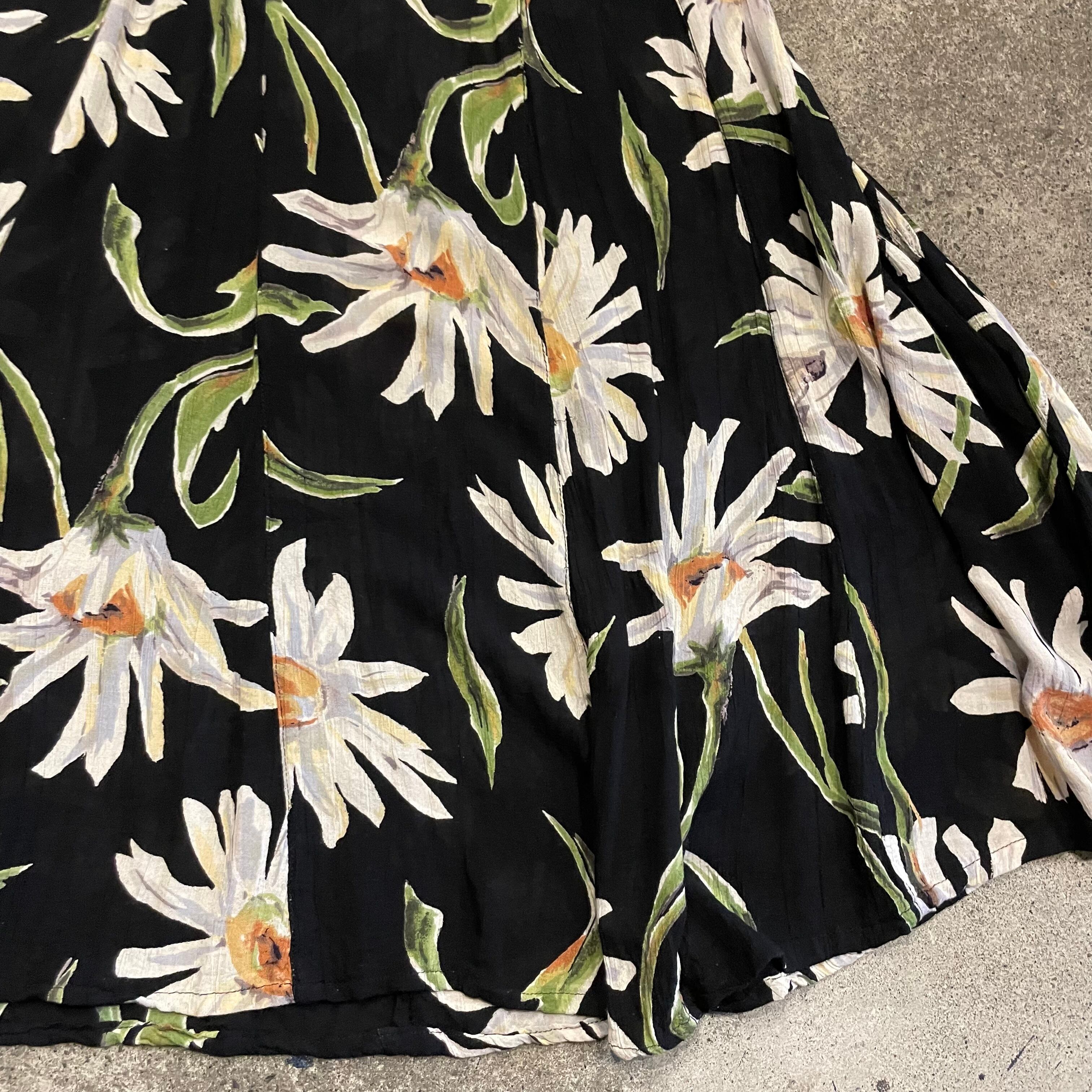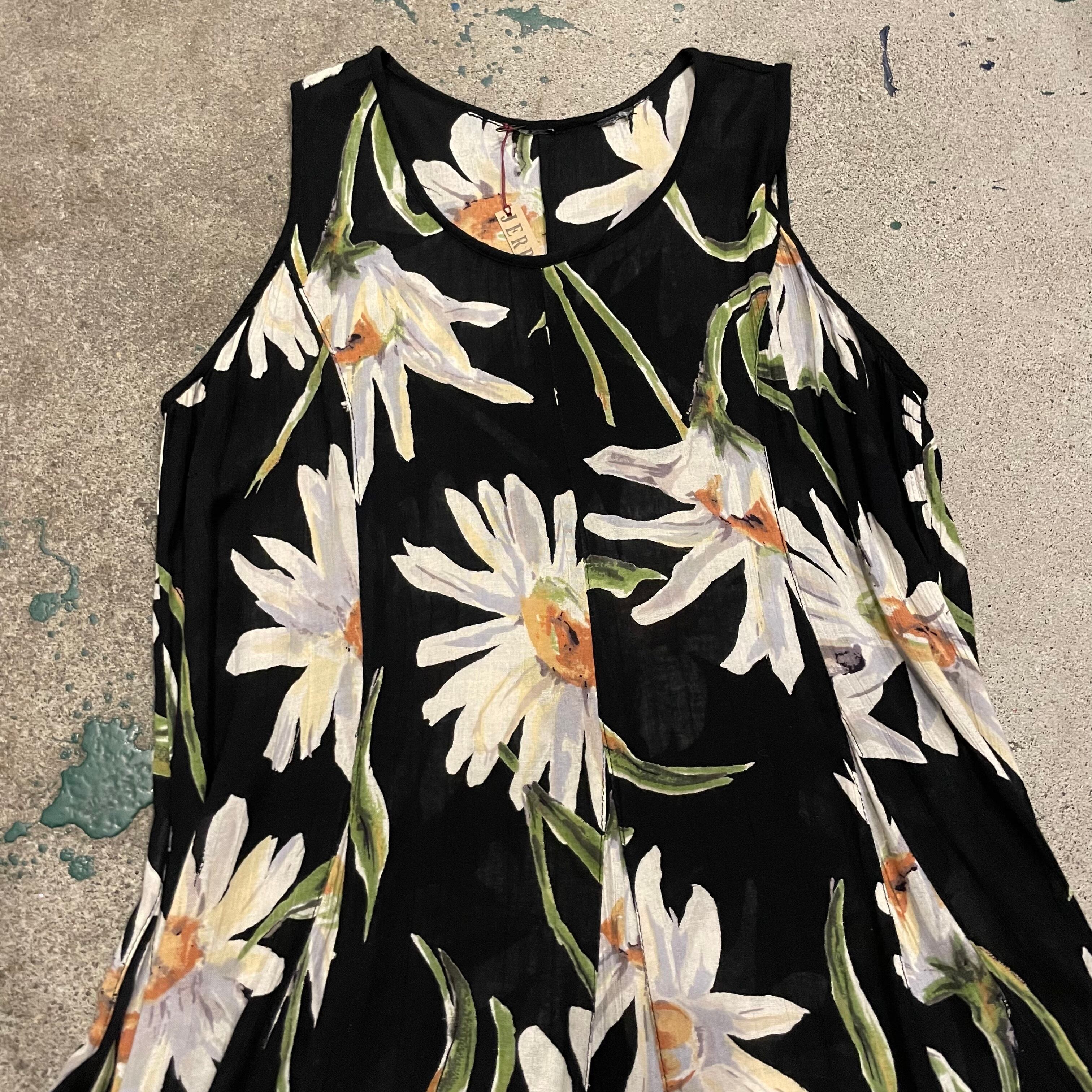 黒地ですがとても華やかで大人っぽい雰囲気も良いですね。黄色いパンプスや白い帽子を合わせたり、中にTシャツを合わせてもかわいいと思います。