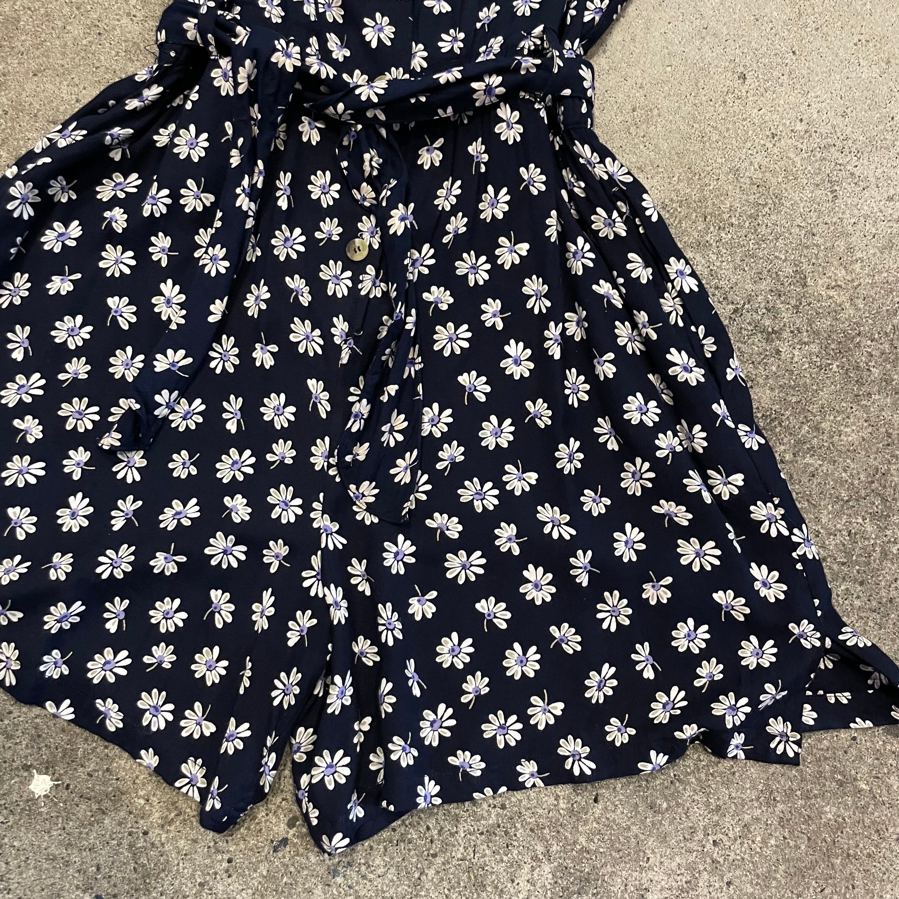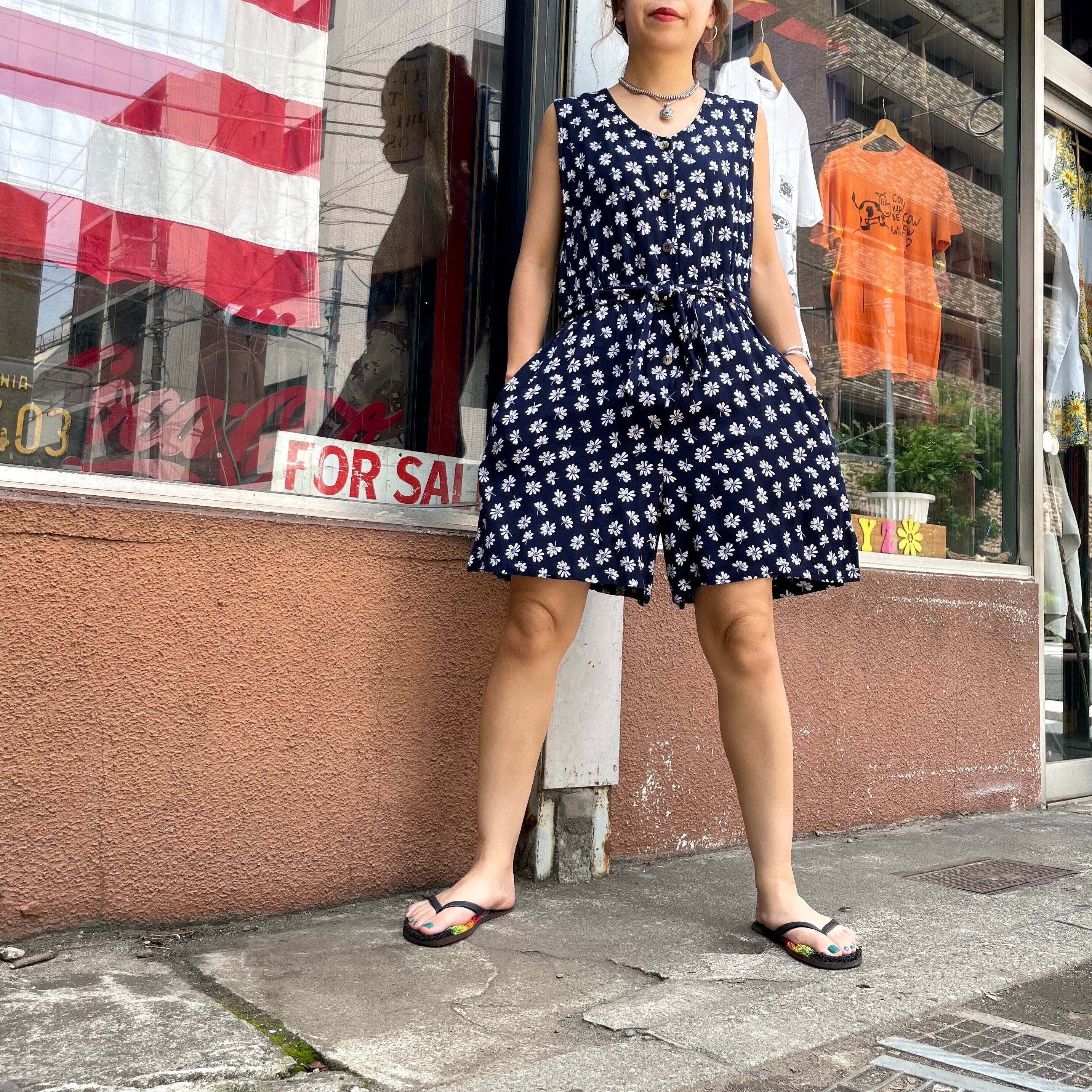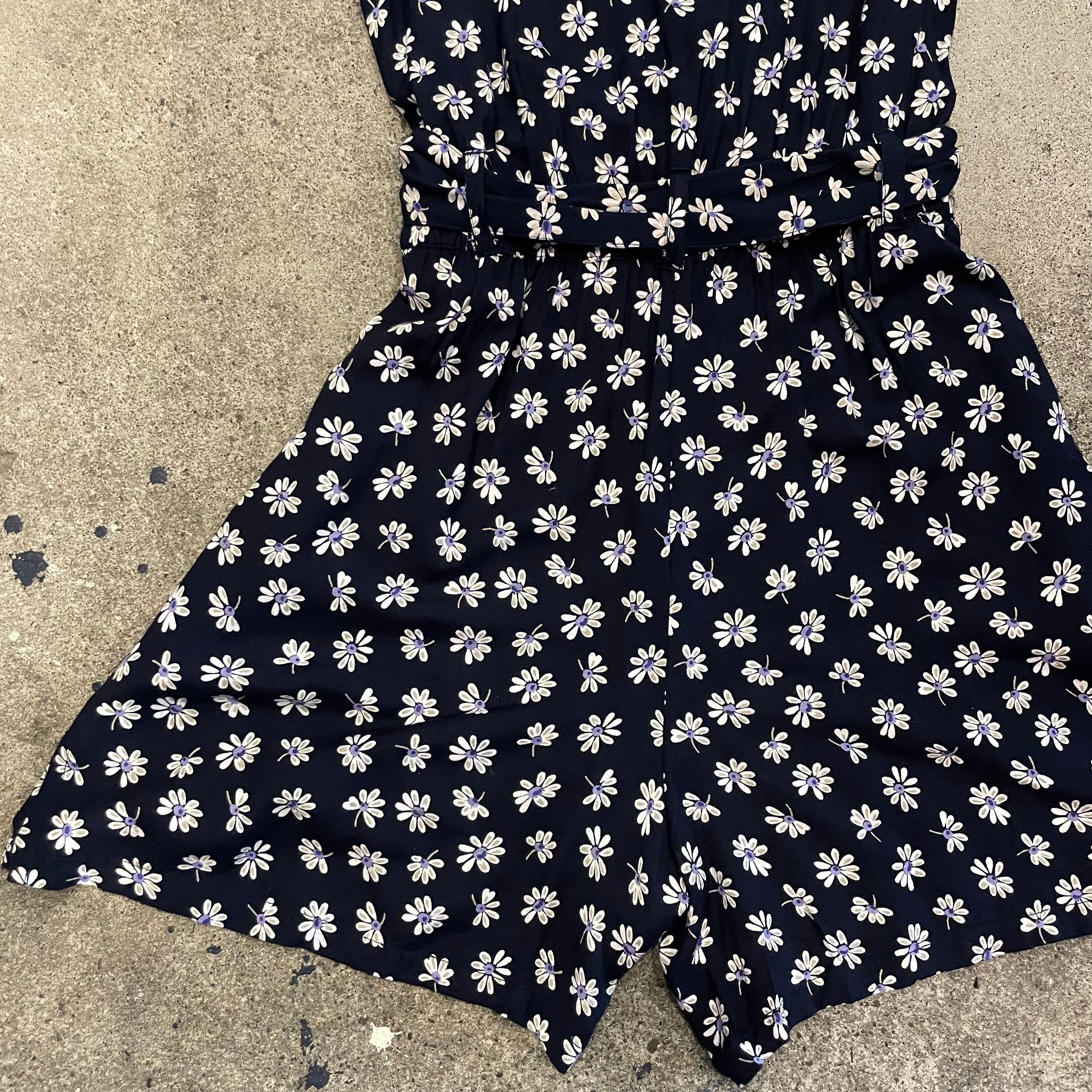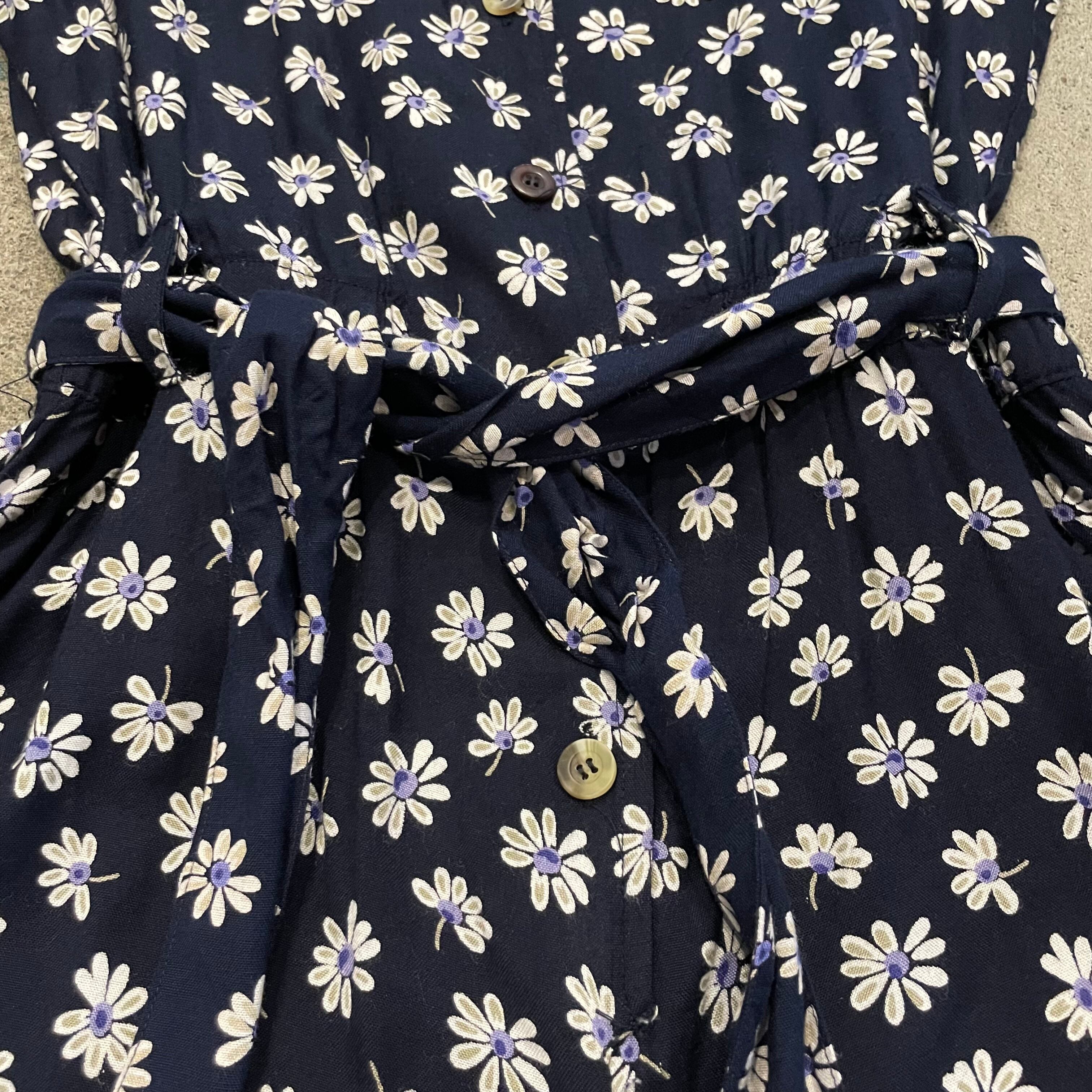ネイビー地に白い花柄がかわいいノーカラーシャツとサロペットのセットアップです。