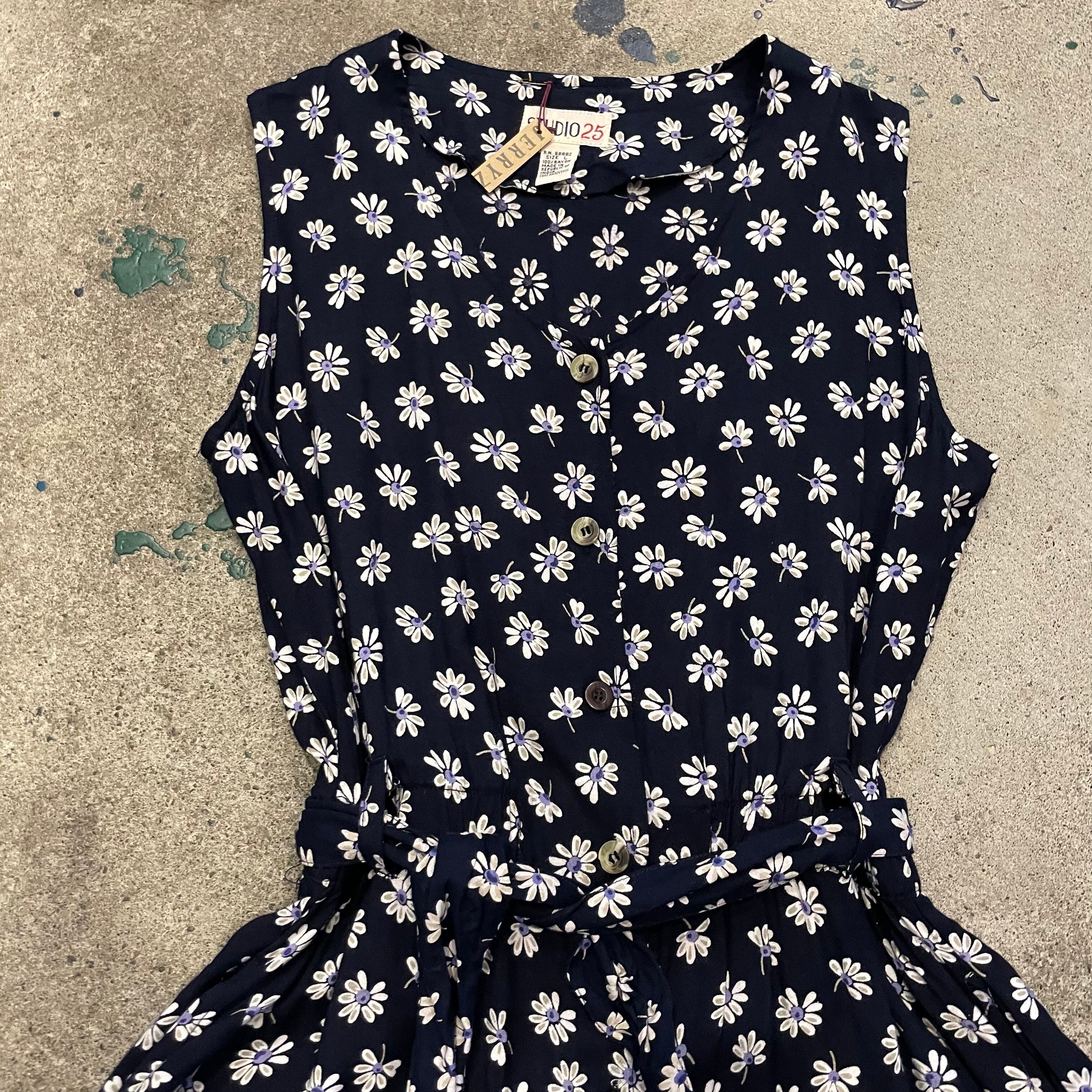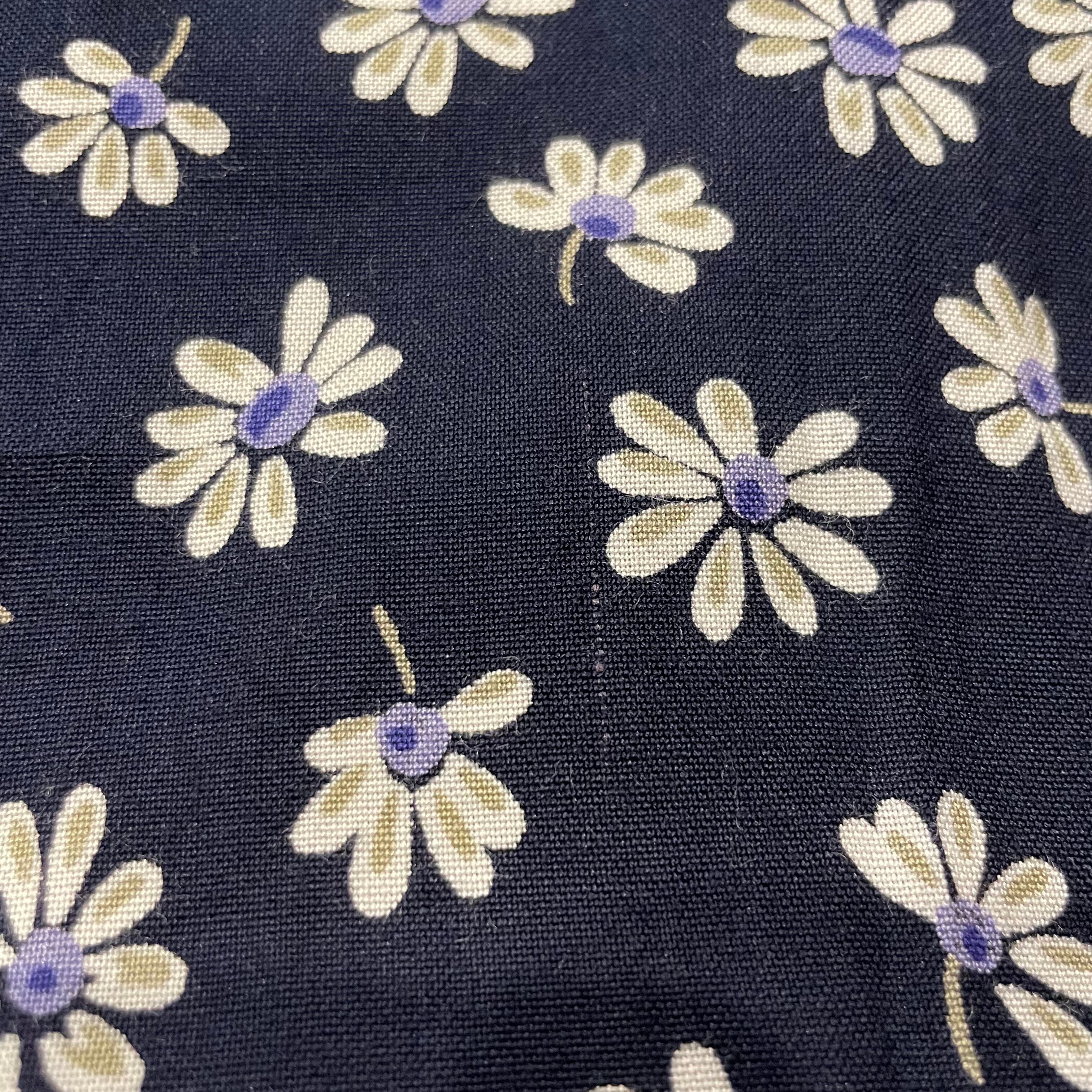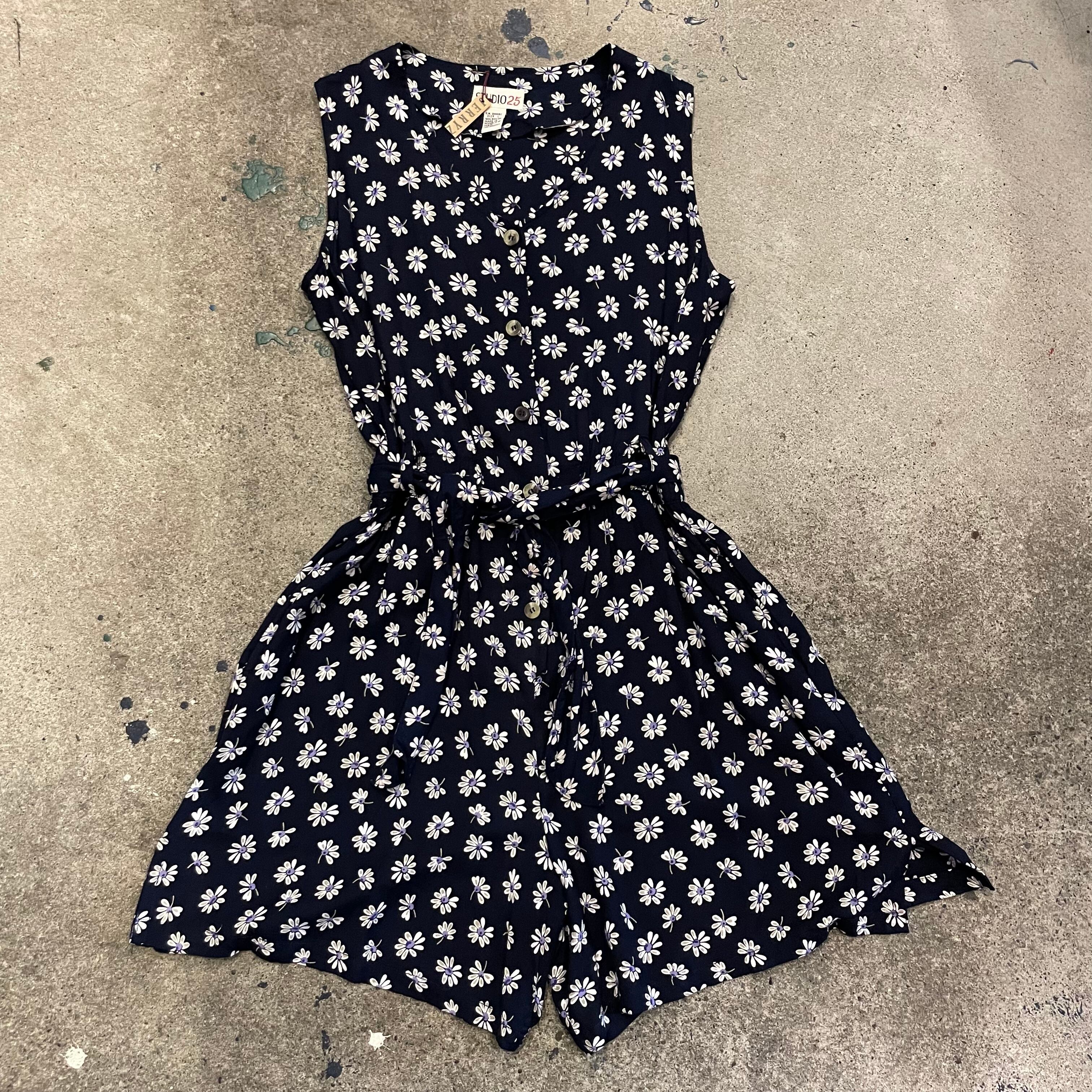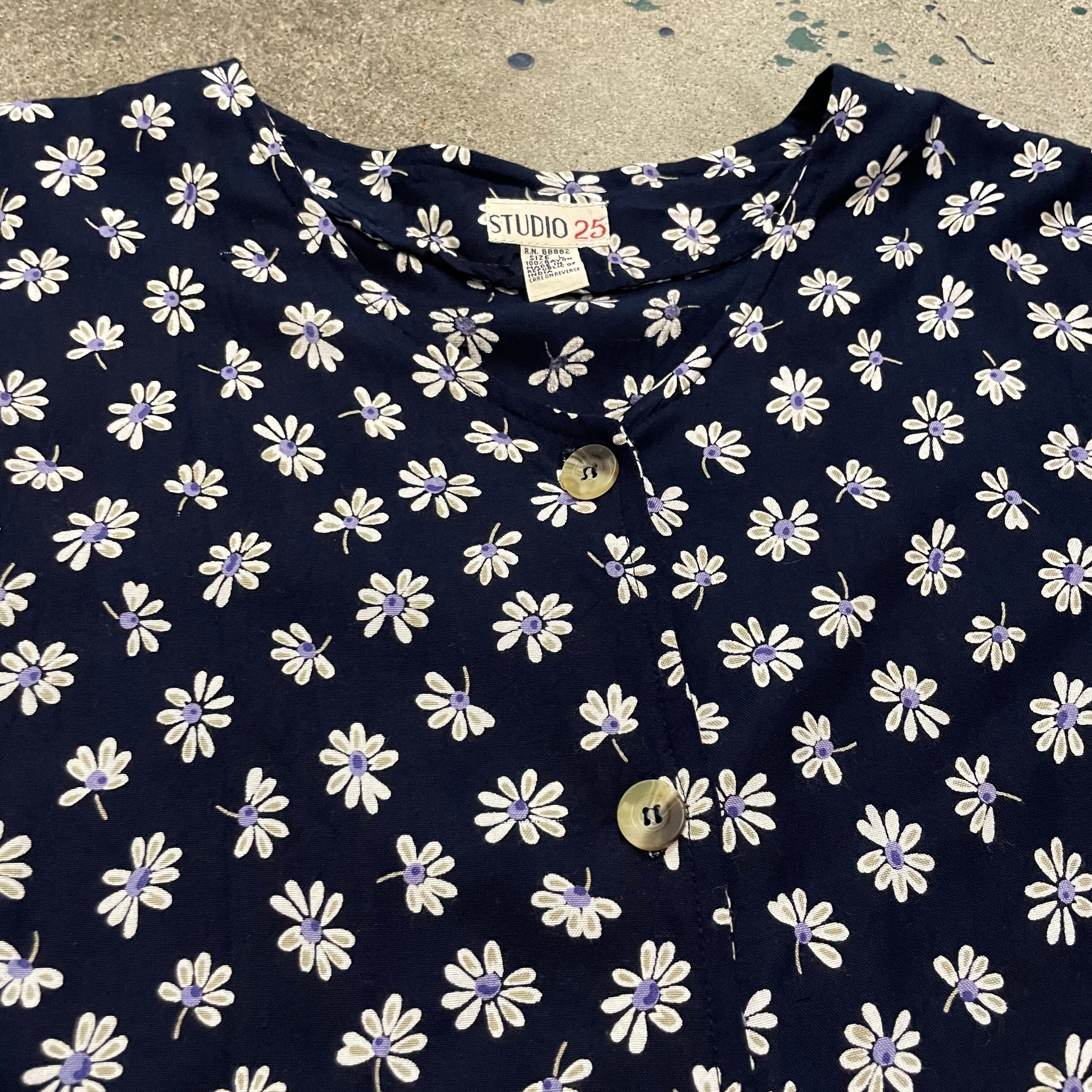 ネイビー地に白い花柄がかわいいノーカラーシャツとサロペットのセットアップです。