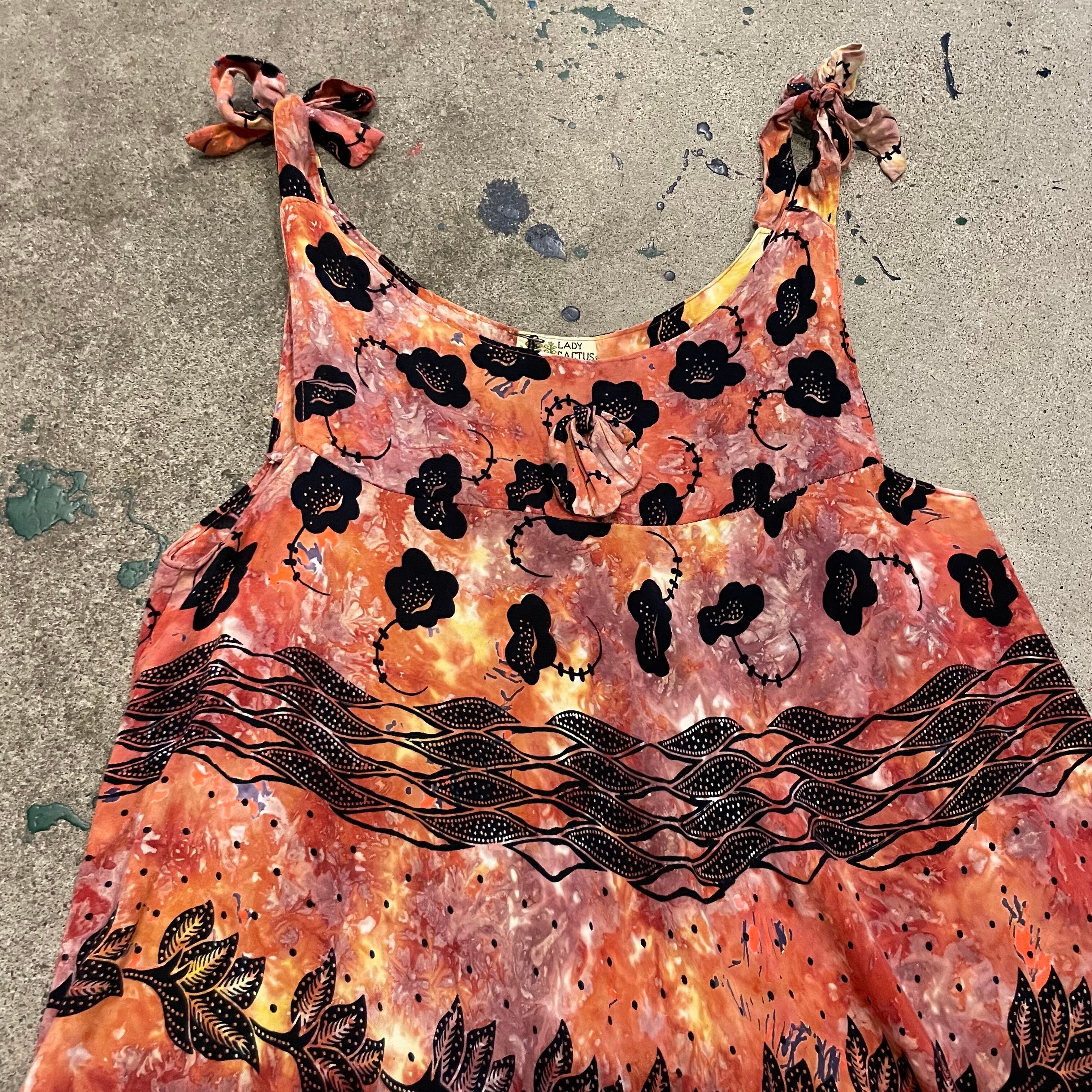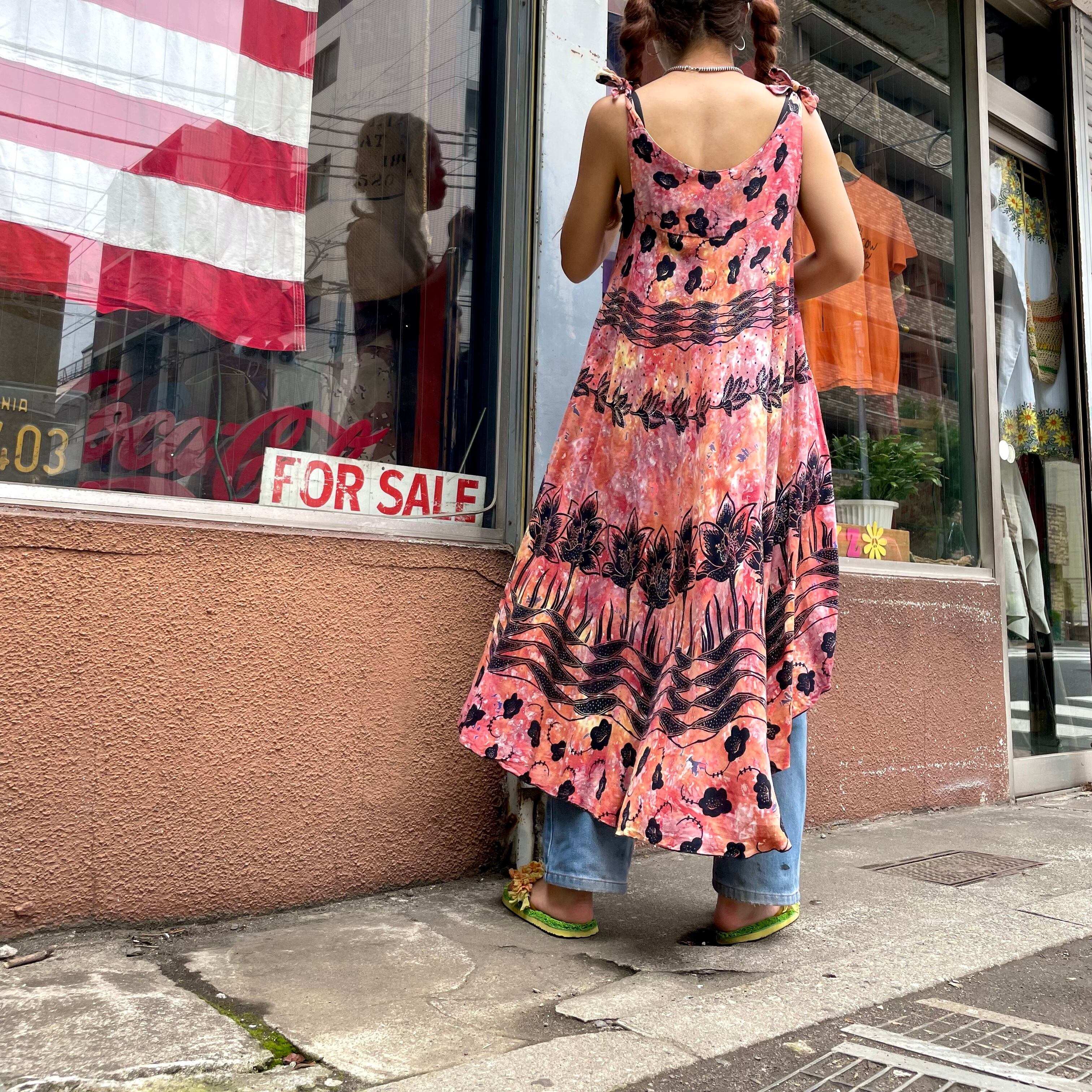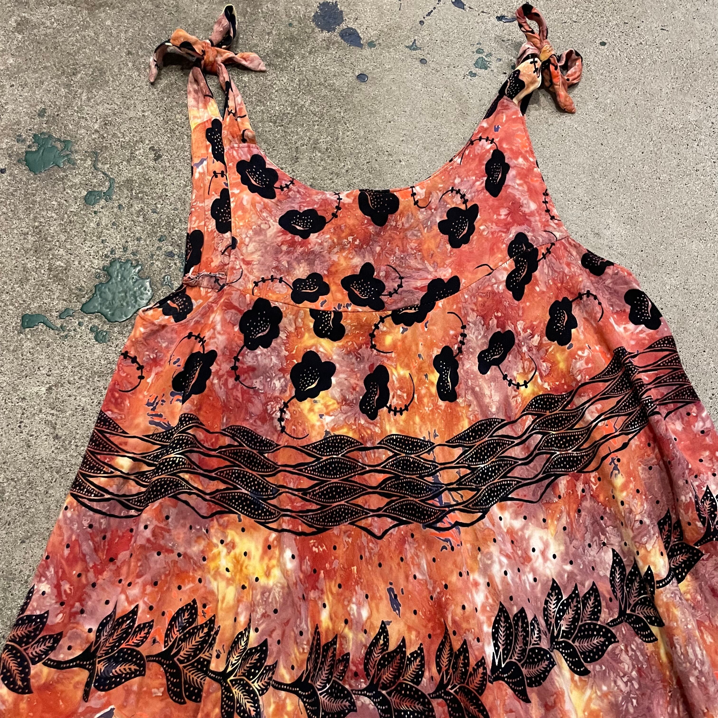 独特の雰囲気のあるお花の模様と、タイダイのようなムラのある染めがとても素敵なワンピースです。肩で結ぶタイプのキャミソールってかわいいですよね。
