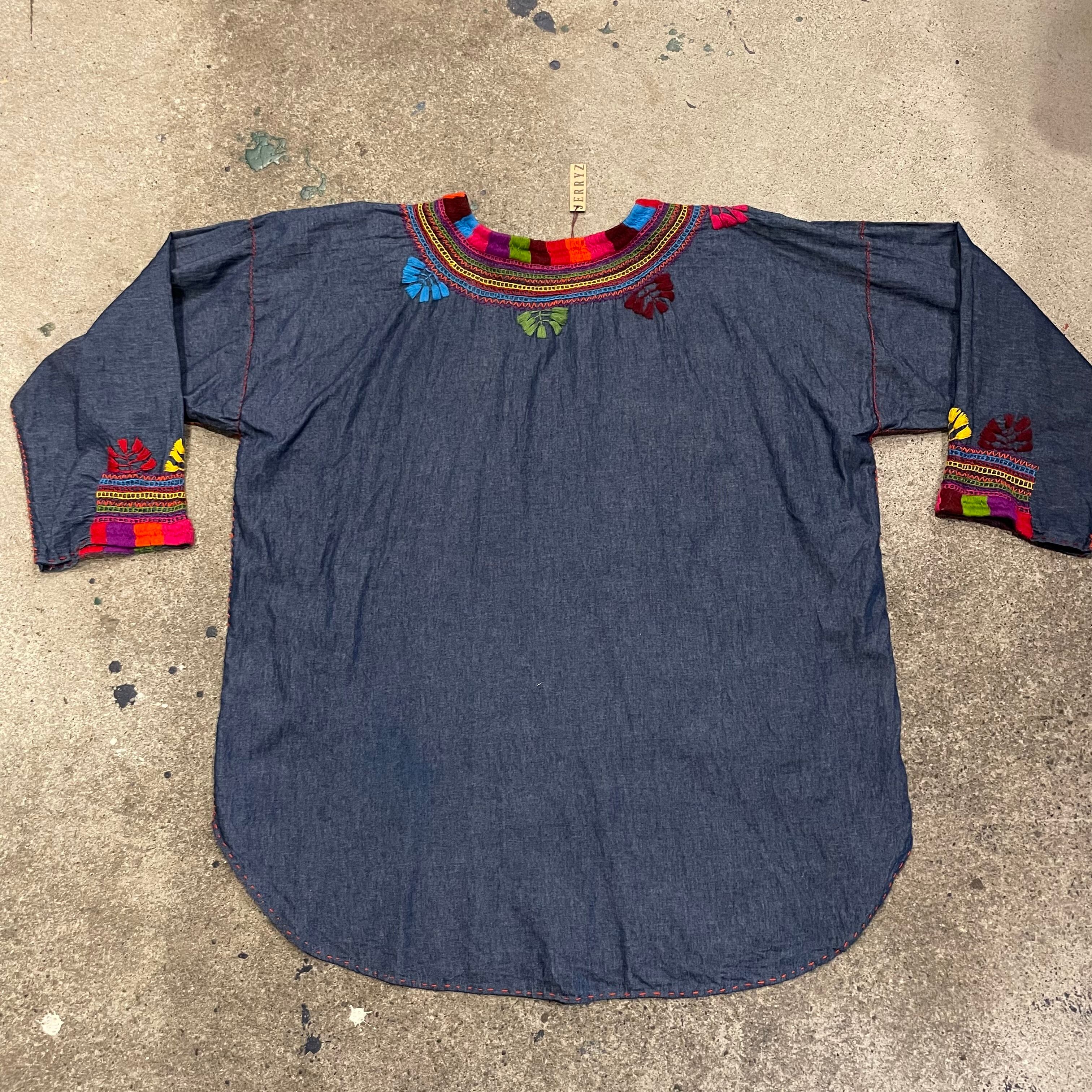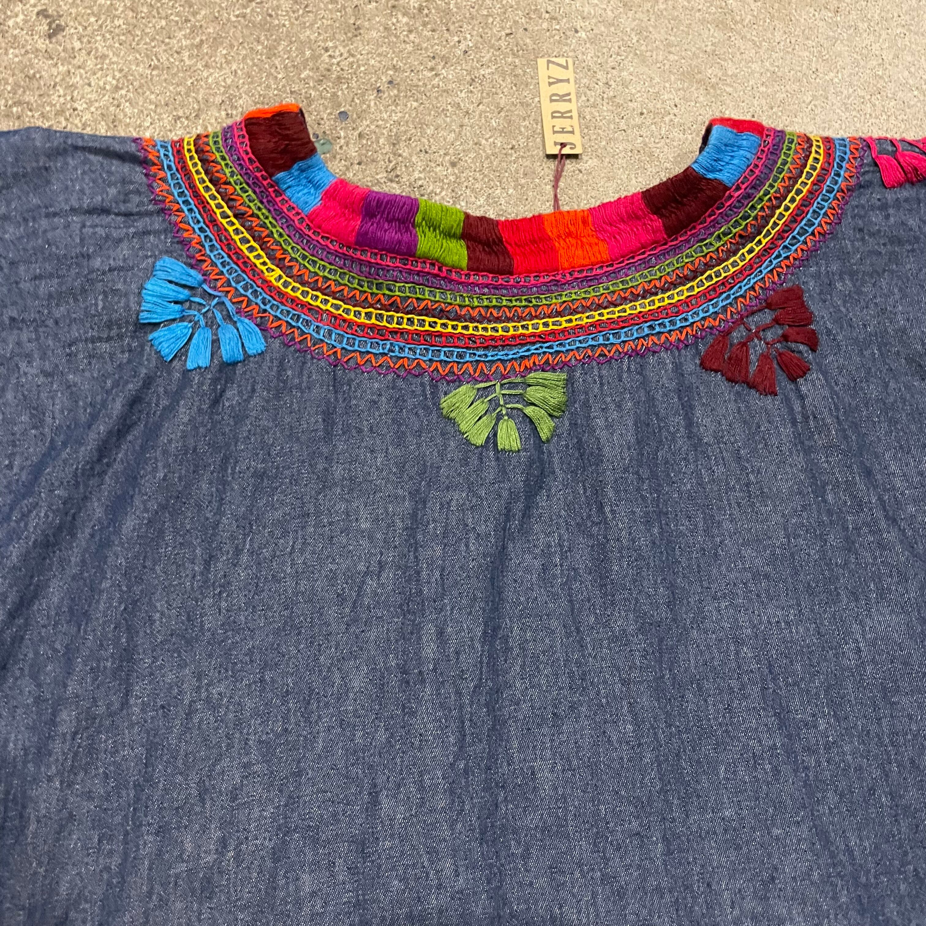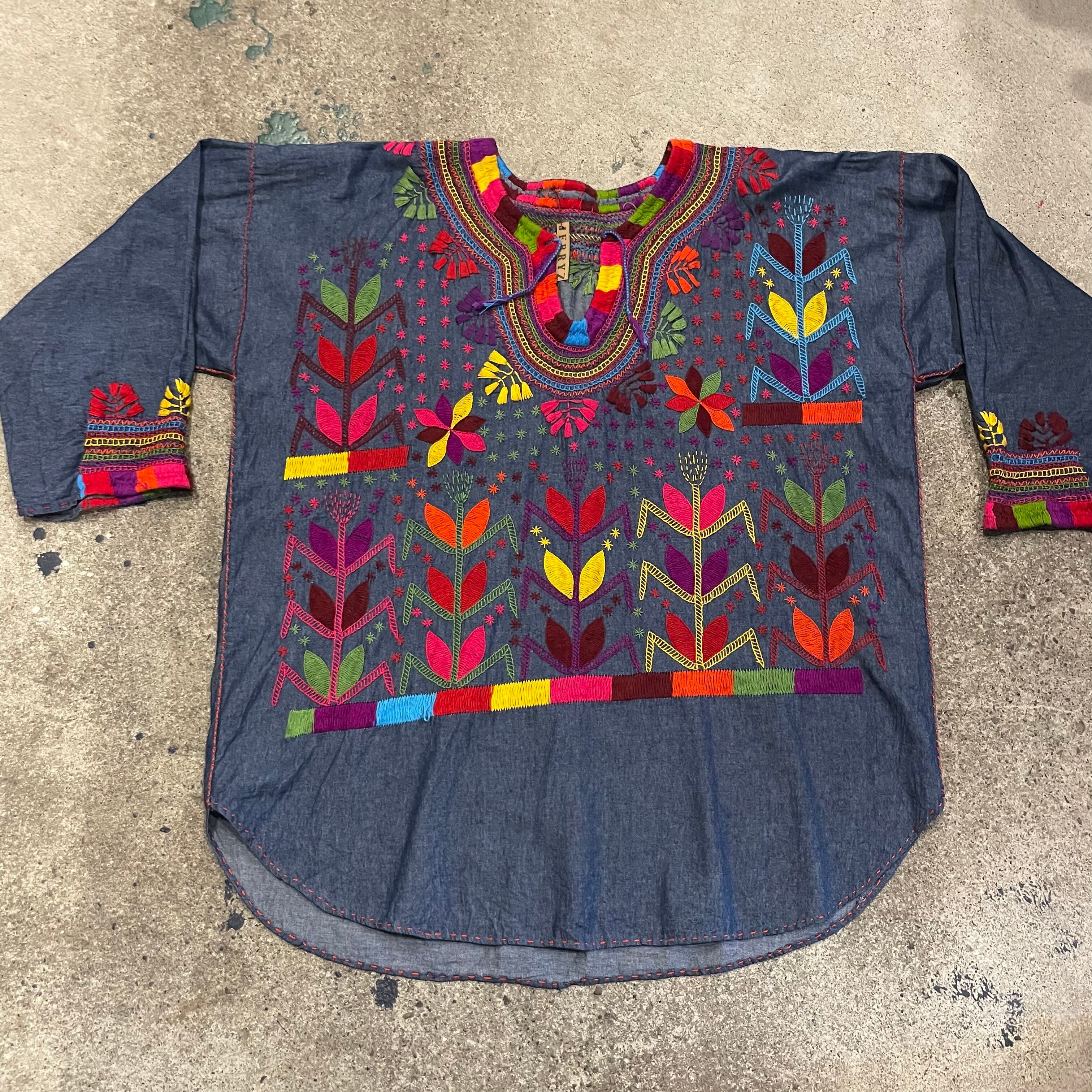 カラフルな手刺繍がかわいいシャンブレーっぽい素材のトップスです。