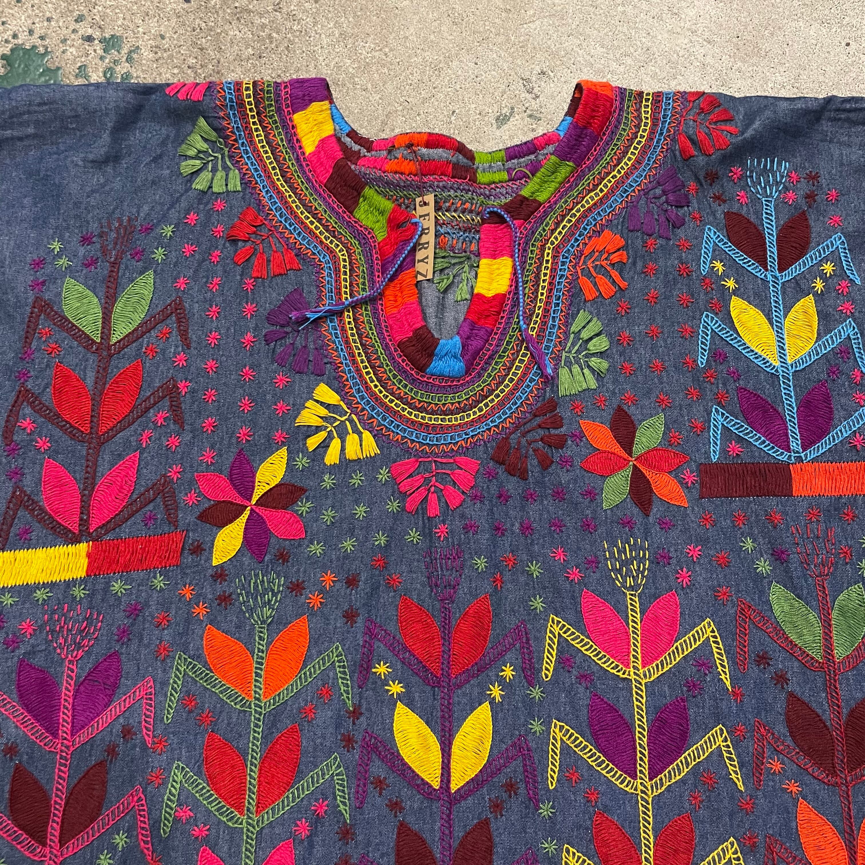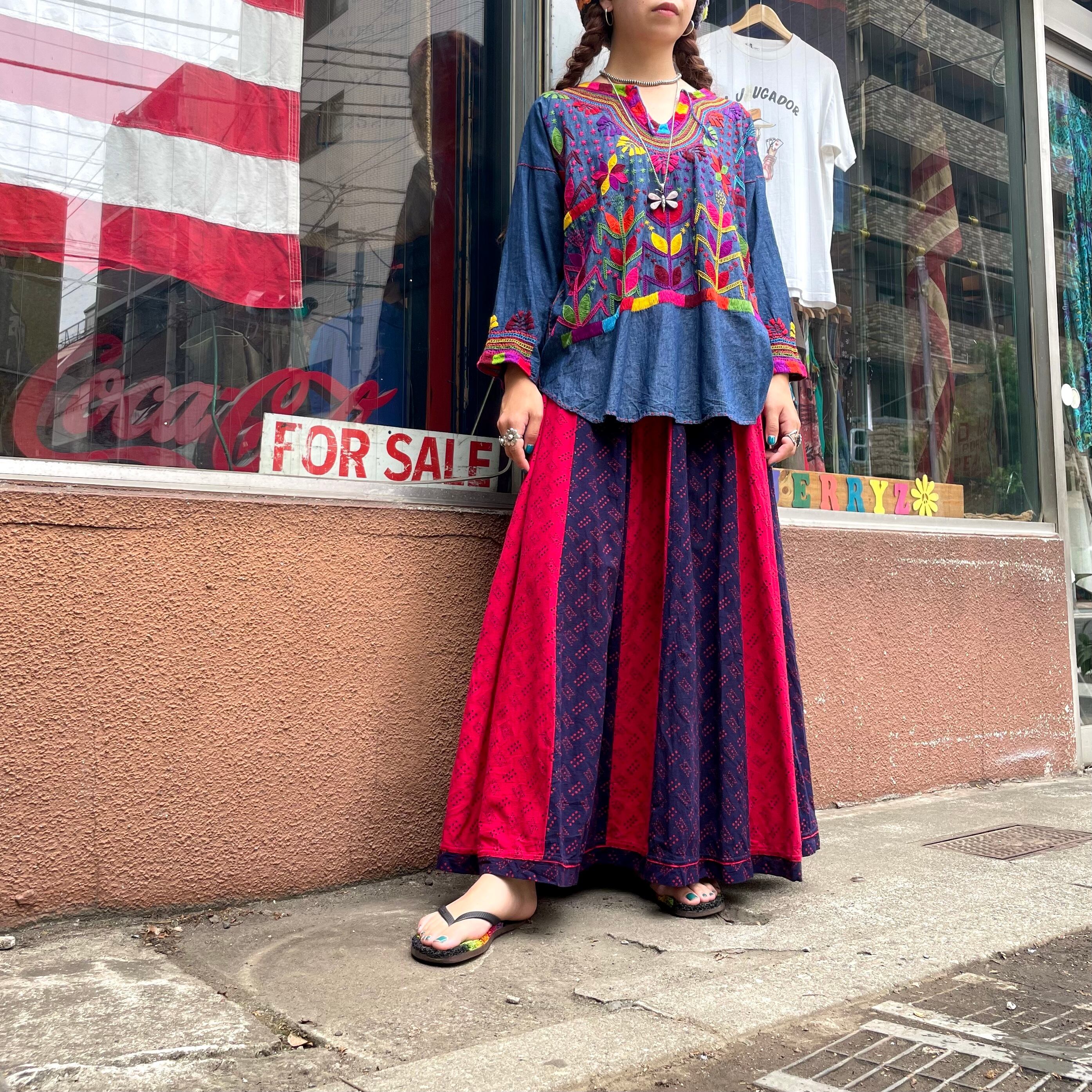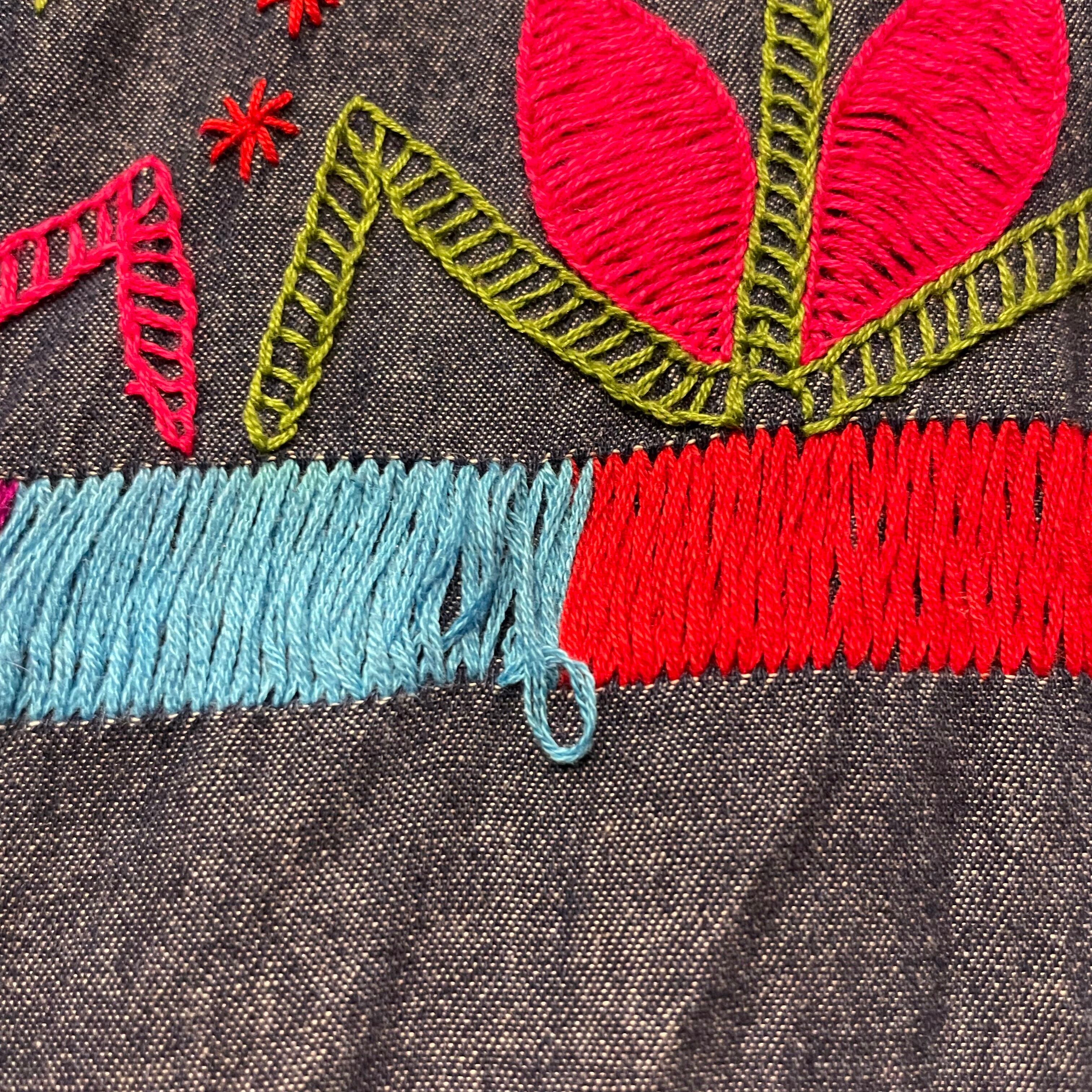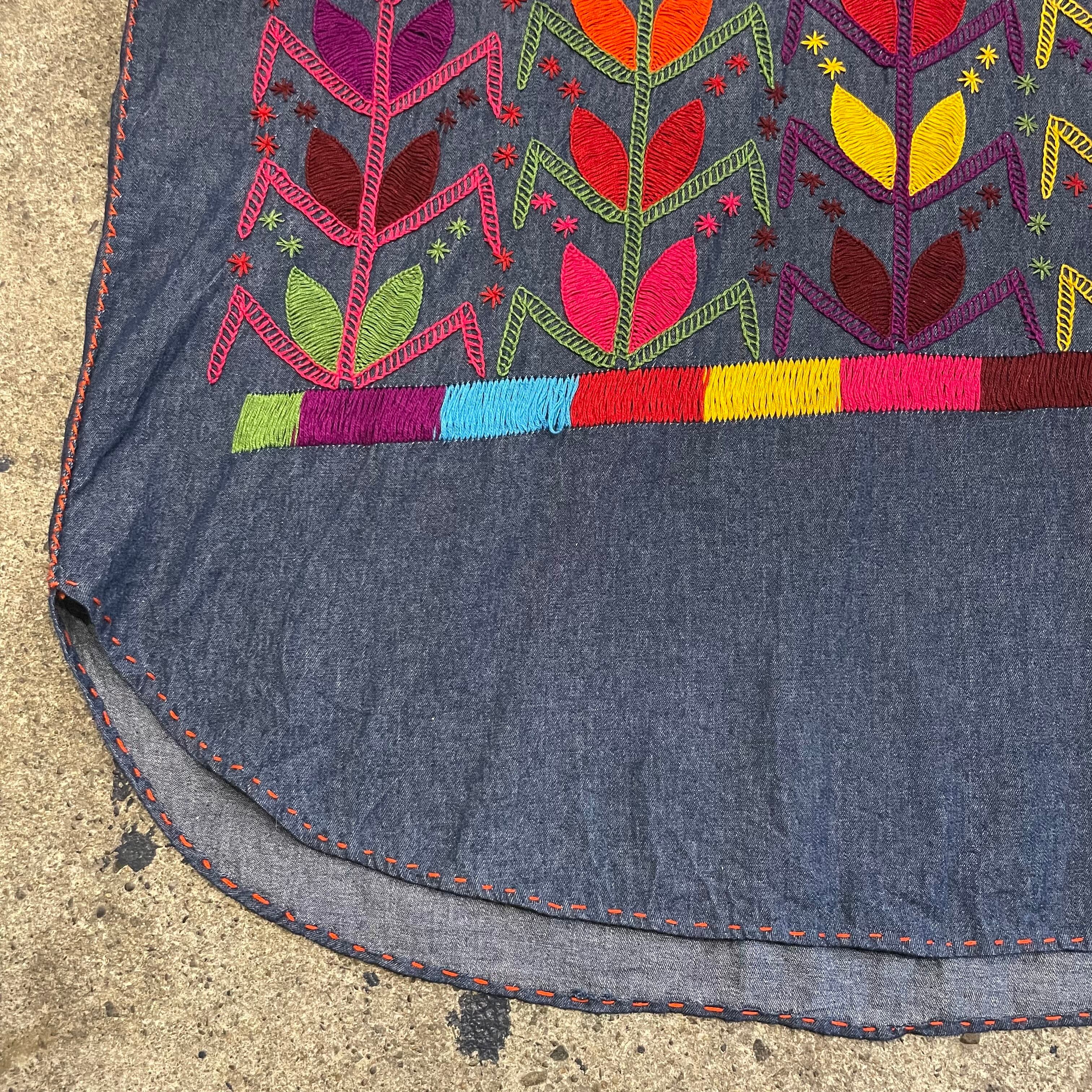 カラフルな手刺繍がかわいいシャンブレーっぽい素材のトップスです。