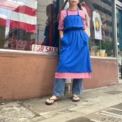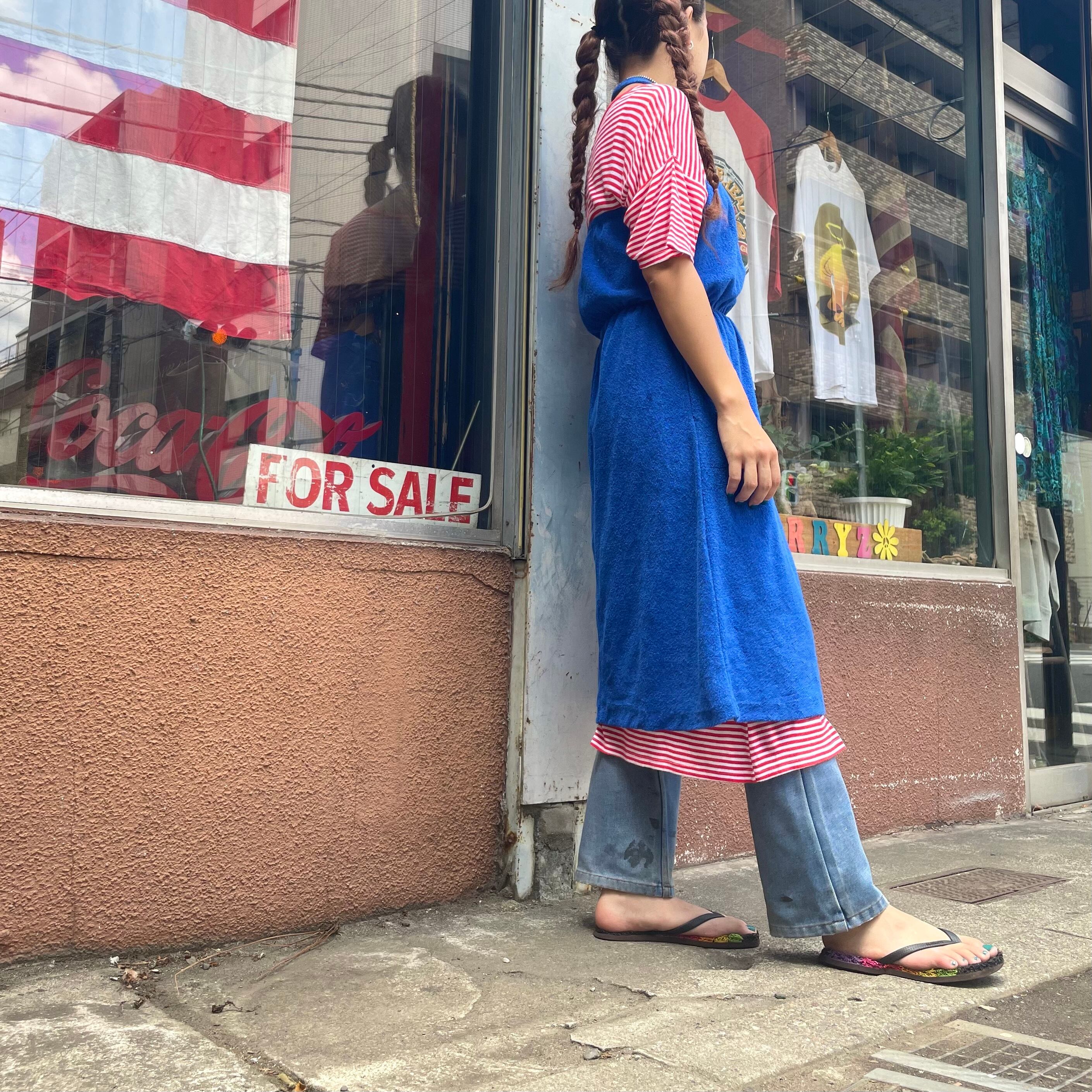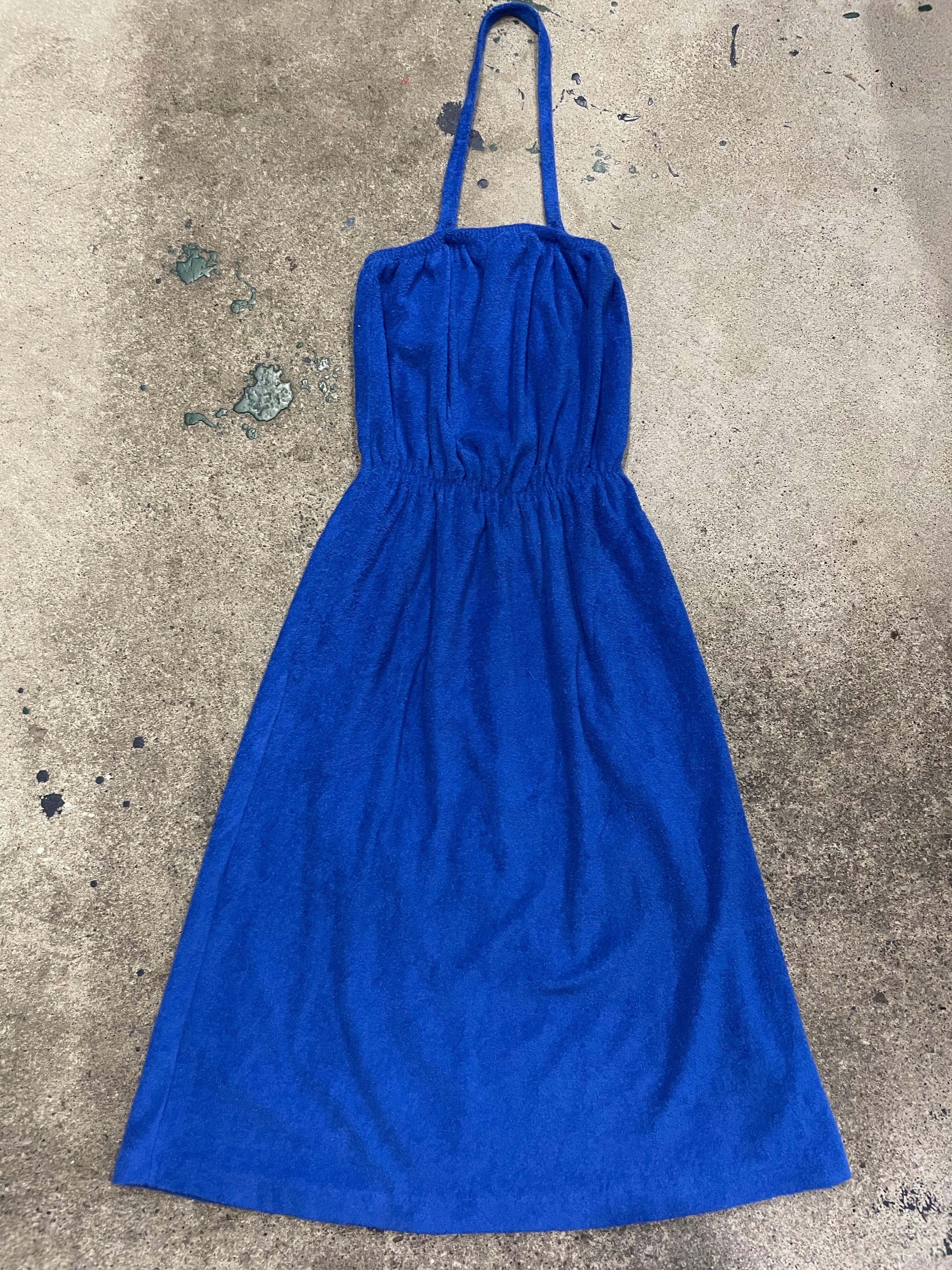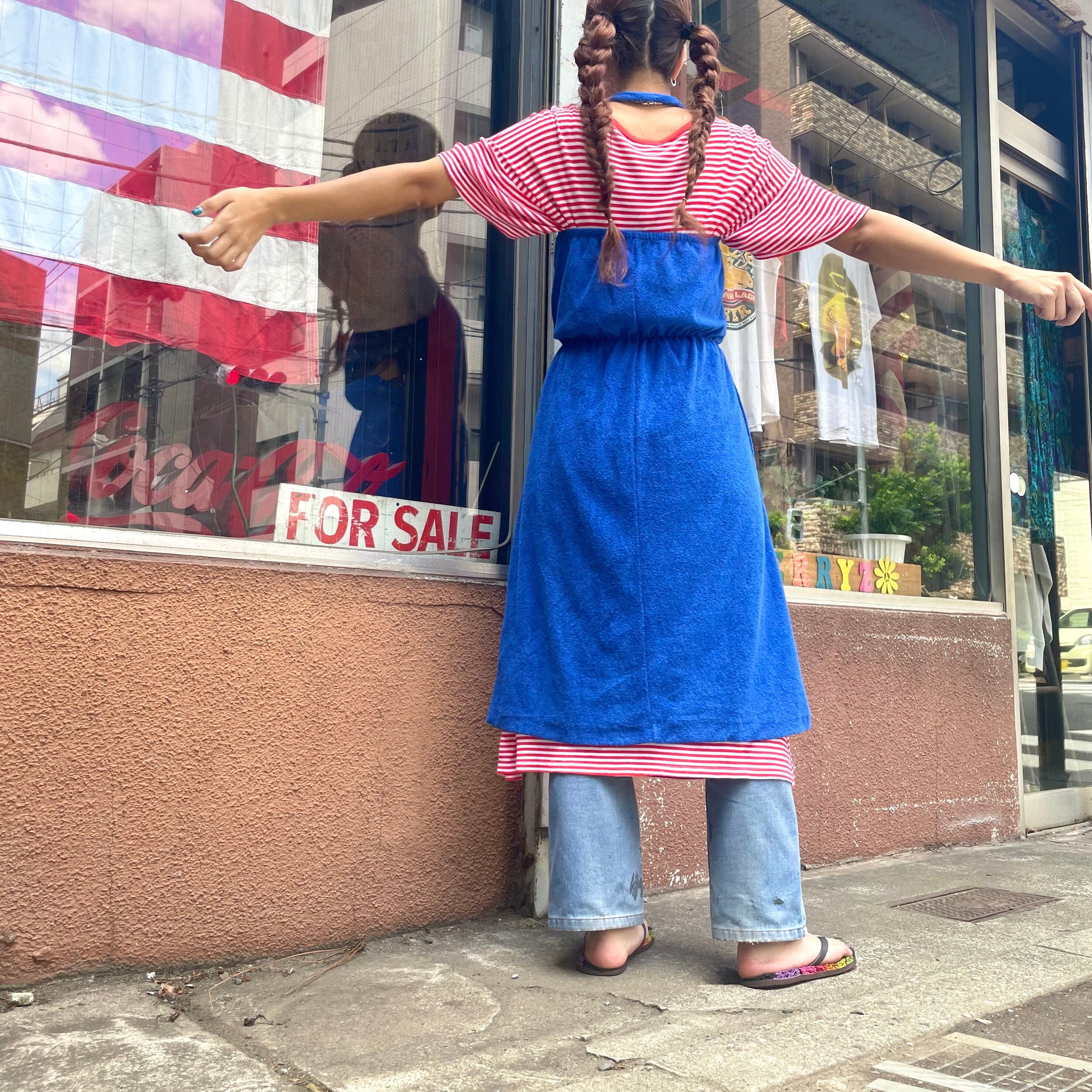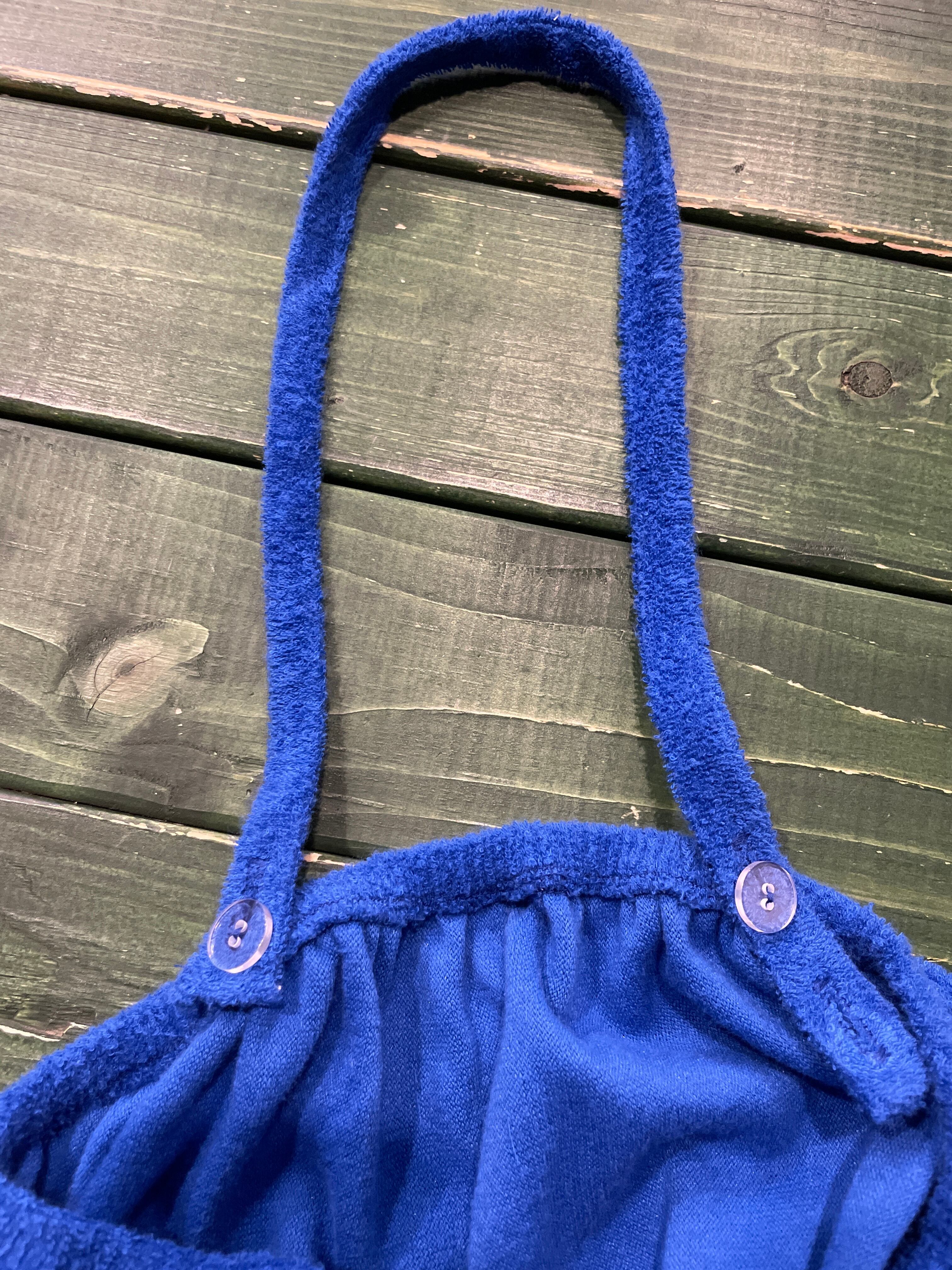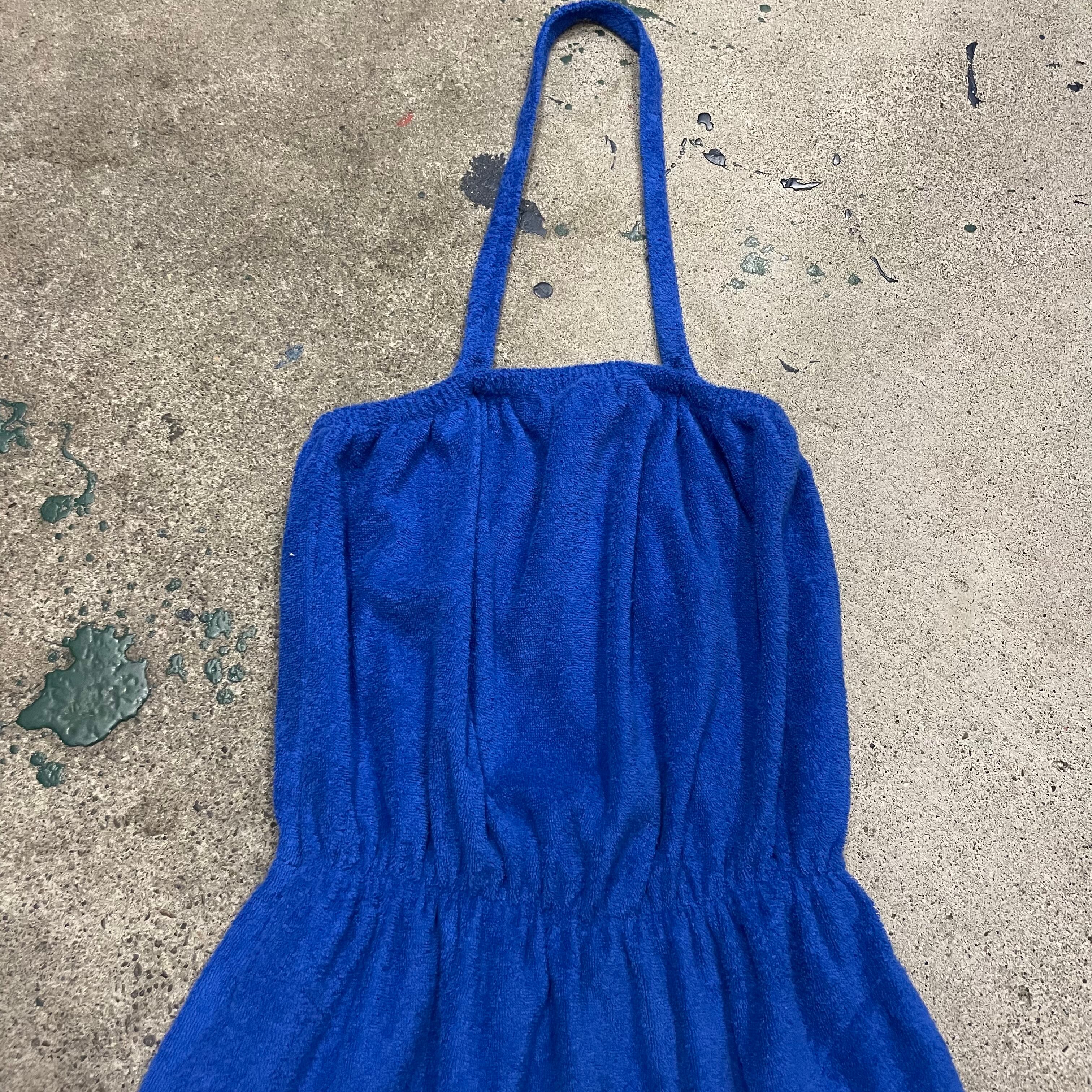 真っ青なパイル地がかわいいホルターネックワンピースです。紐の部分はボタンで取り外し可能ですので、ベアトップにも出来ます。