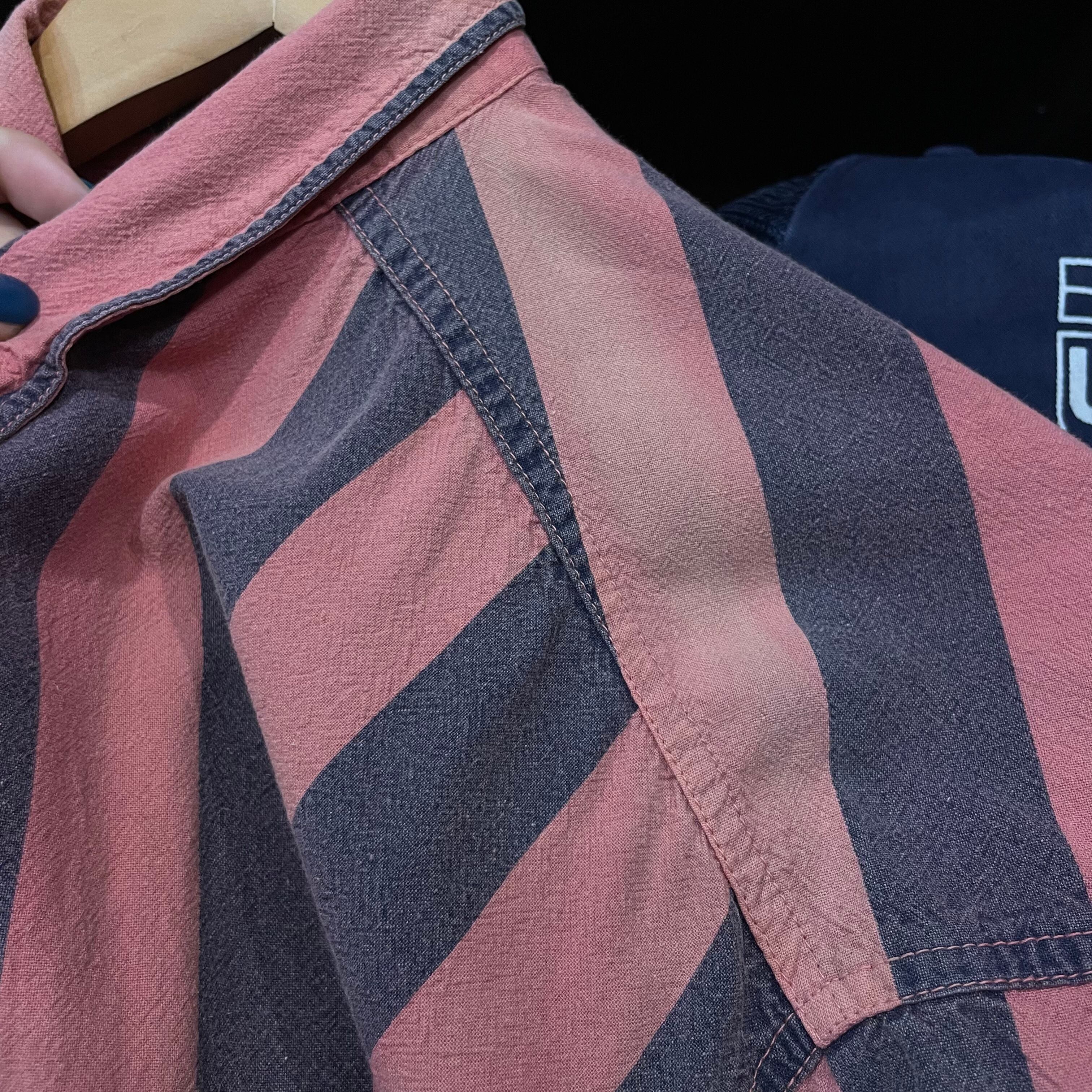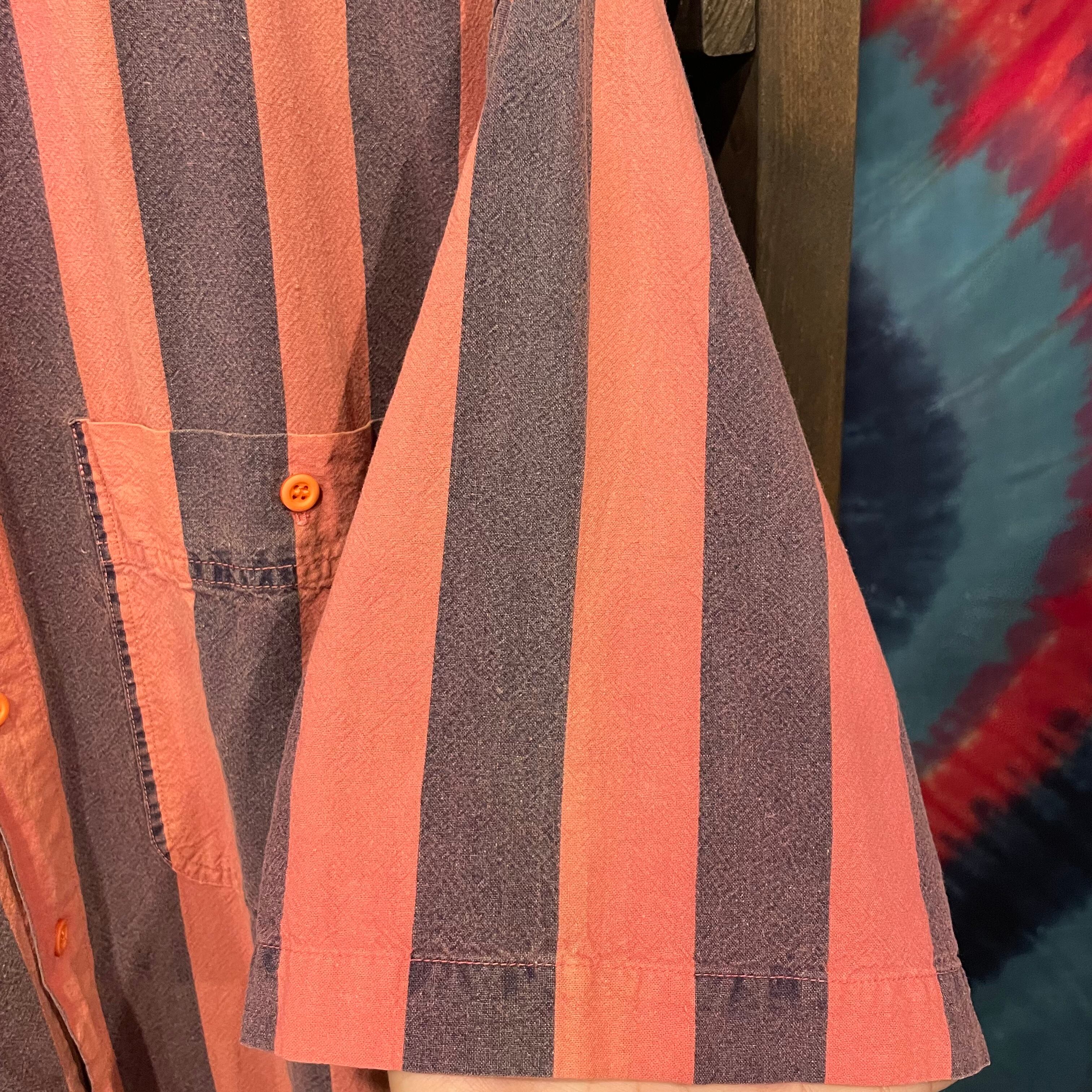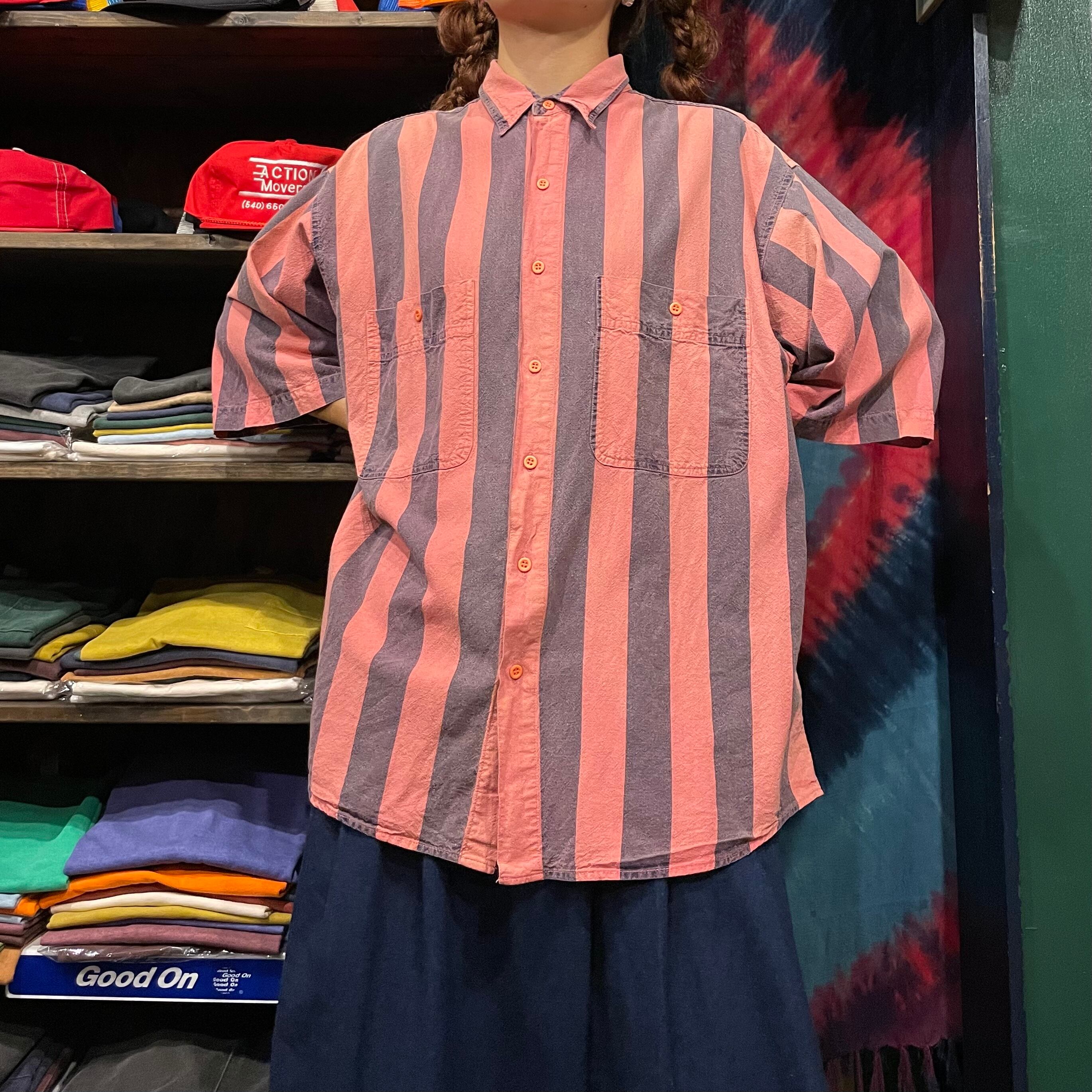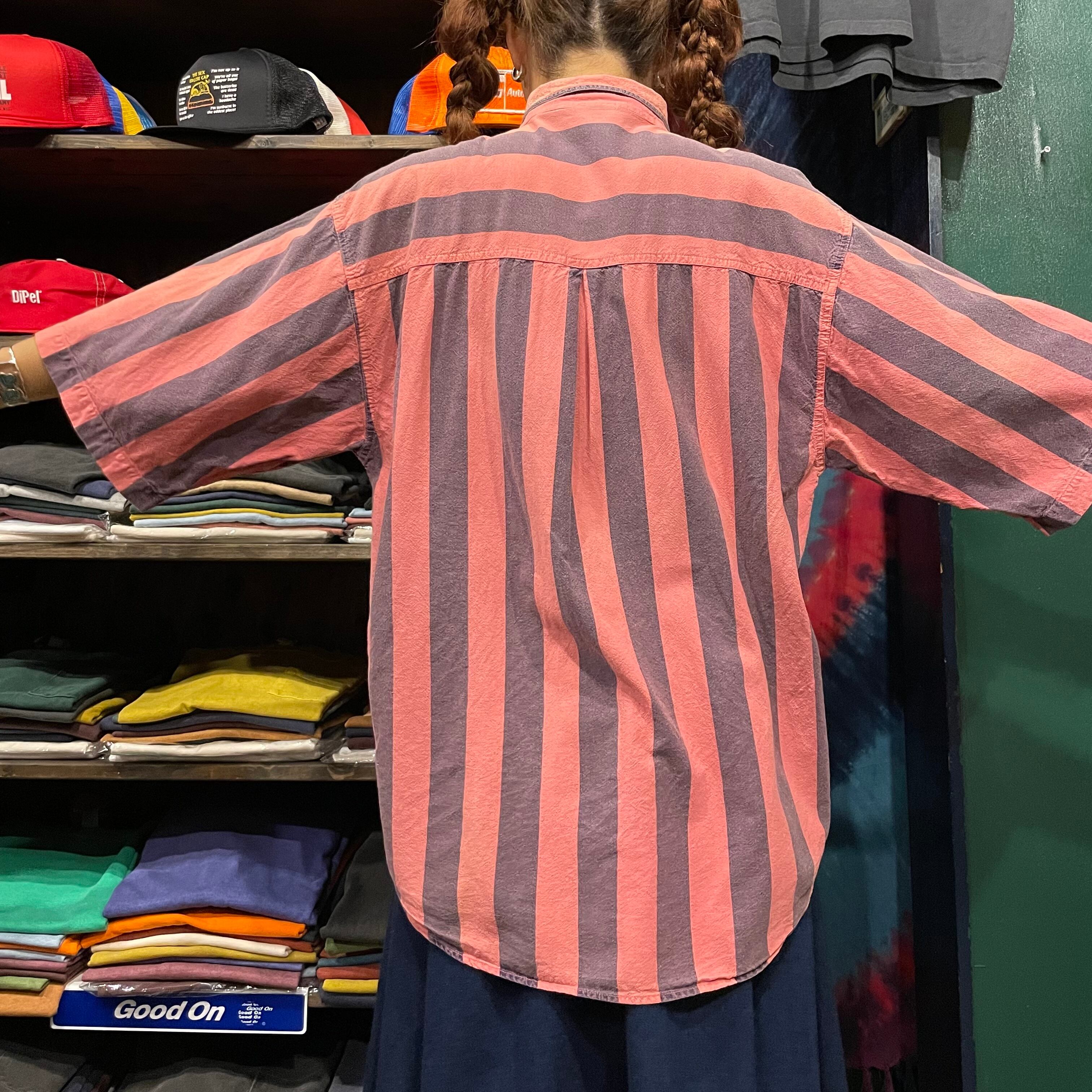 グレーとくすんだピンクの太いピッチのストライプがボーイッシュでかわいい半袖シャツです。