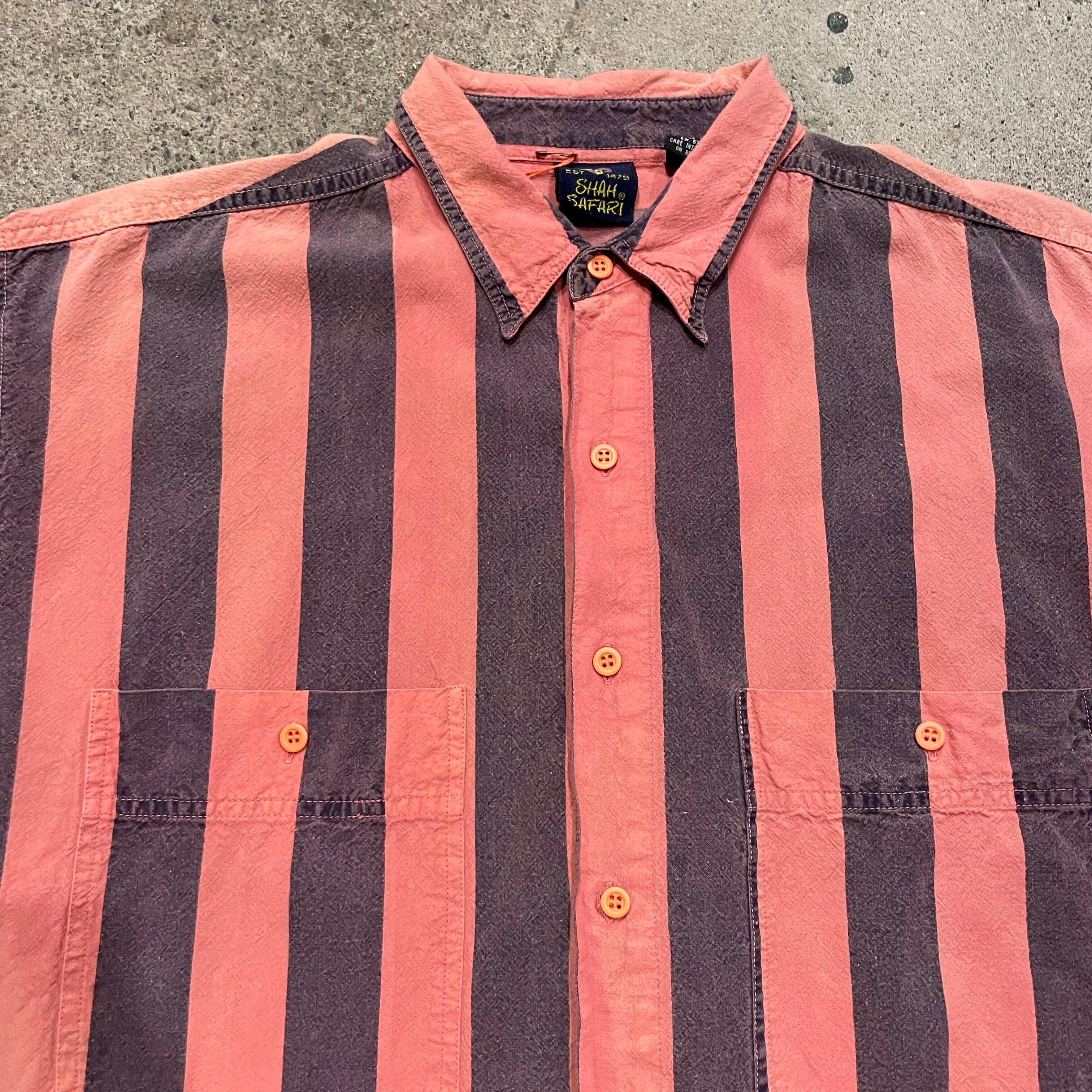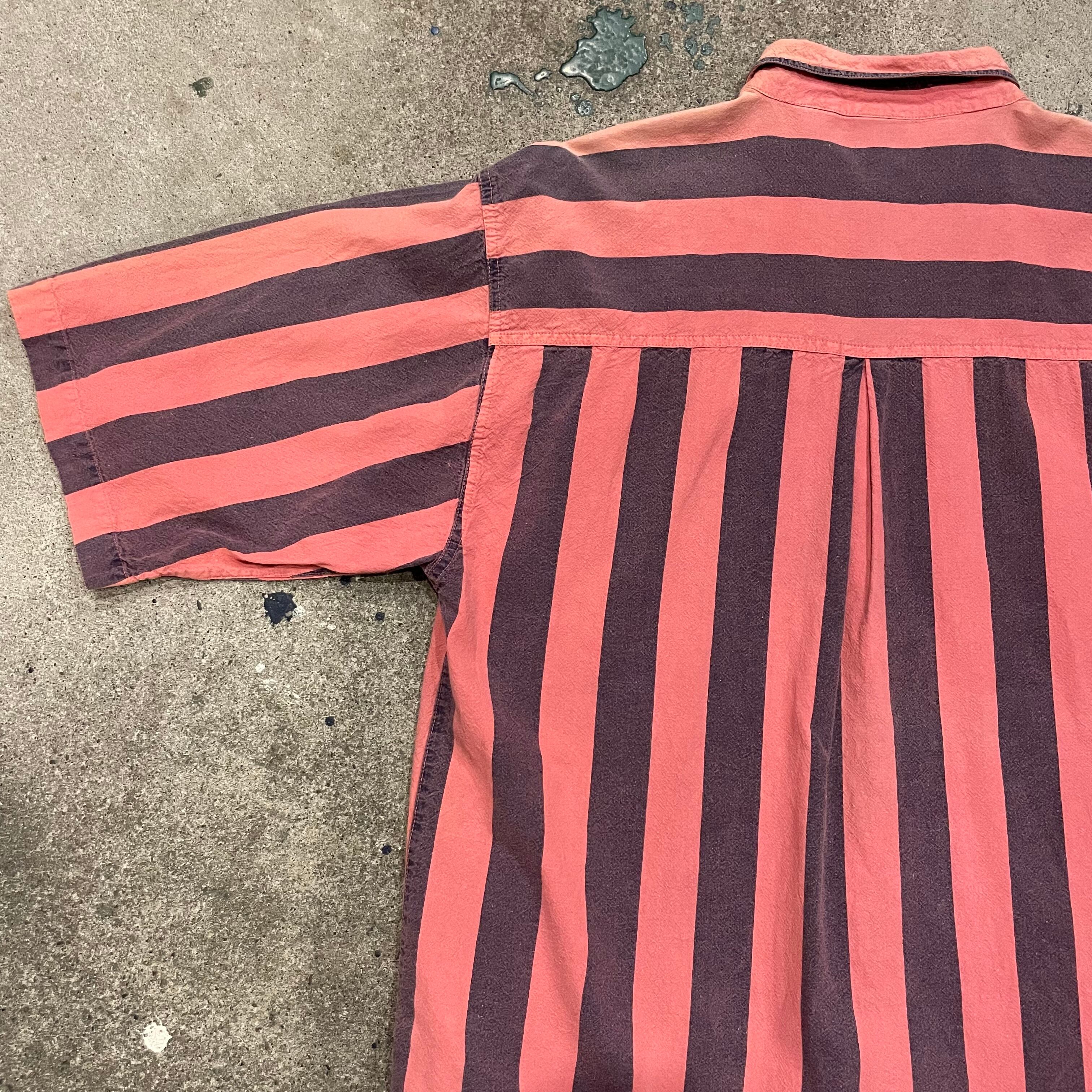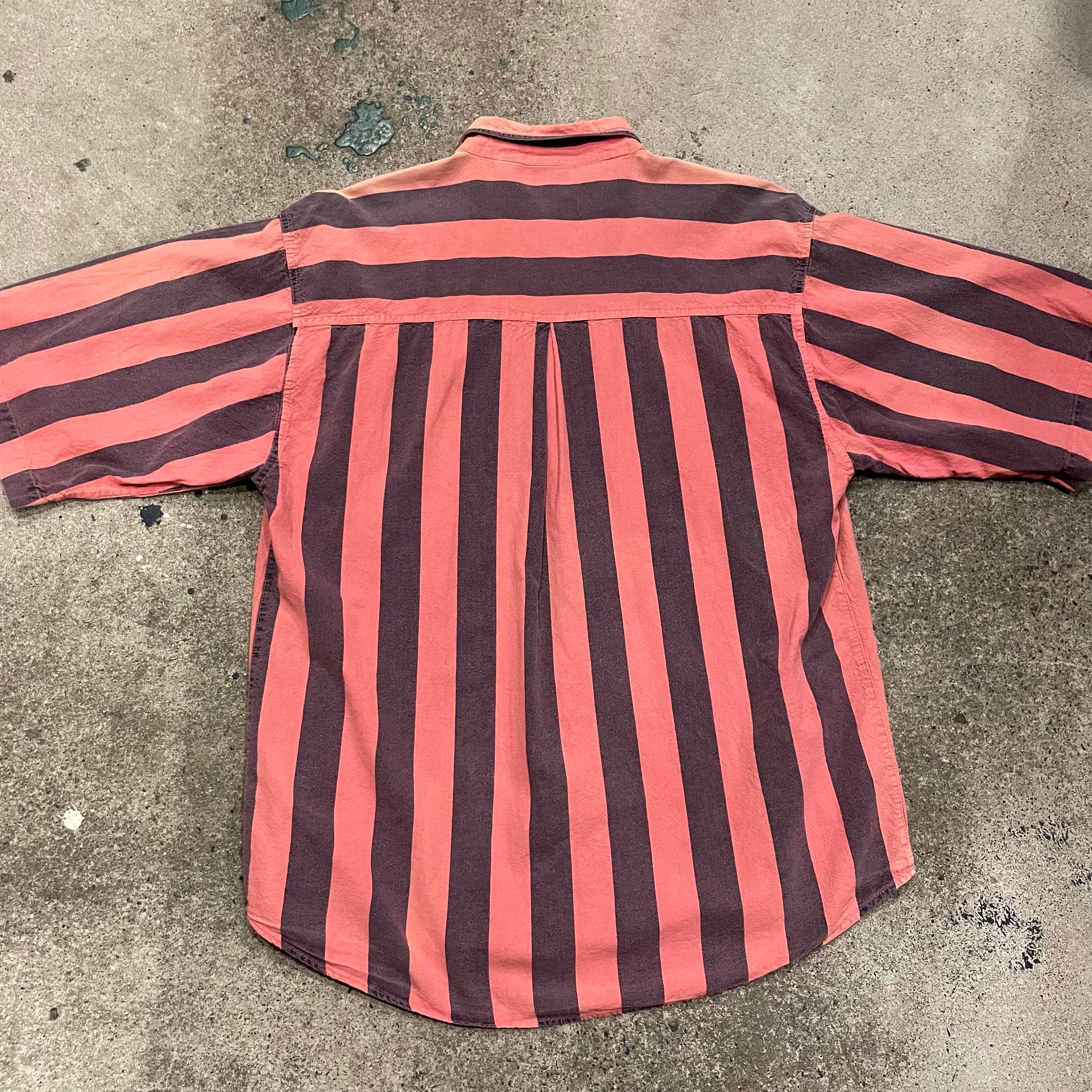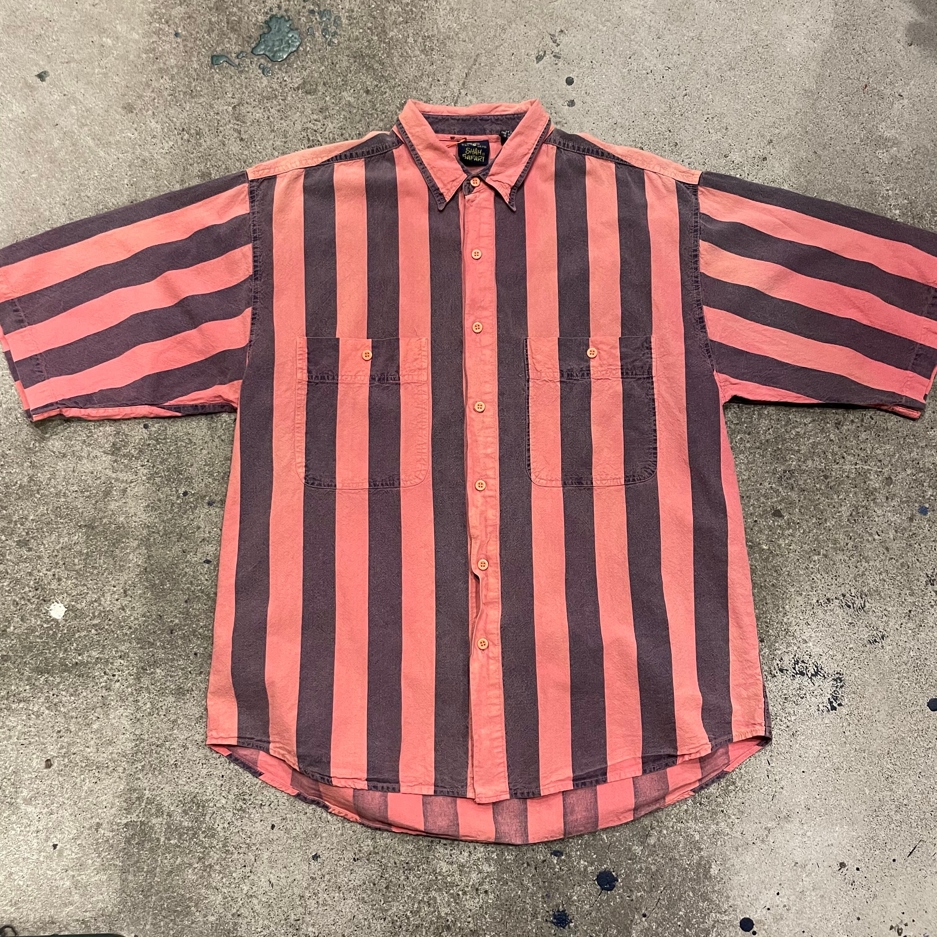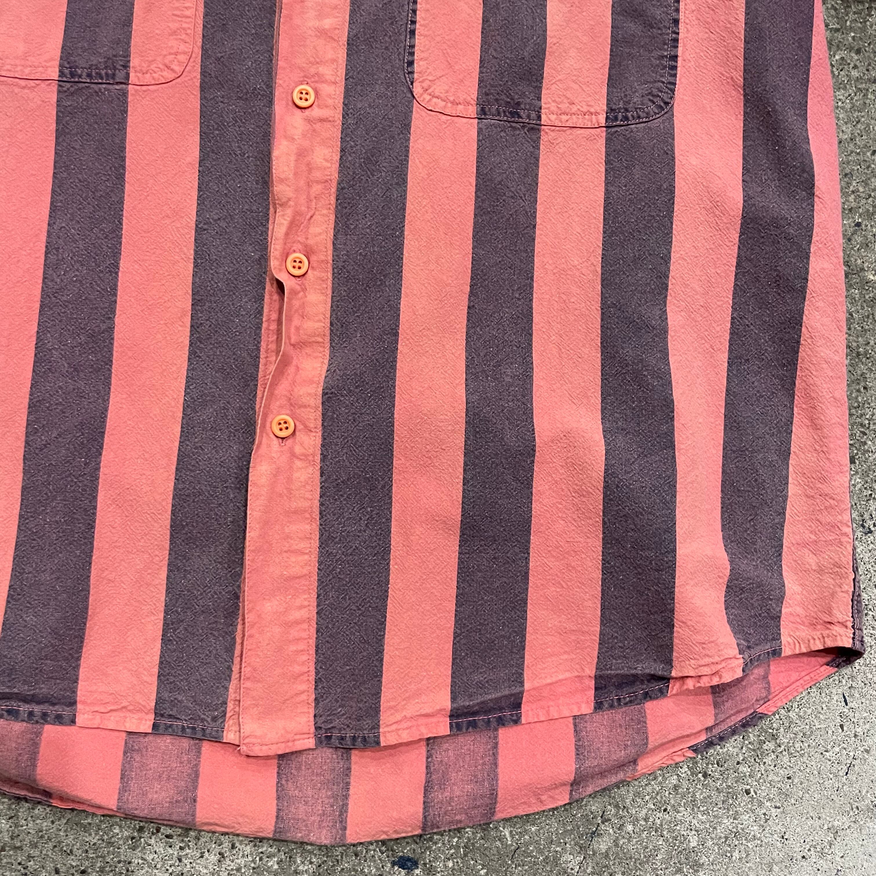 グレーとくすんだピンクの太いピッチのストライプがボーイッシュでかわいい半袖シャツです。