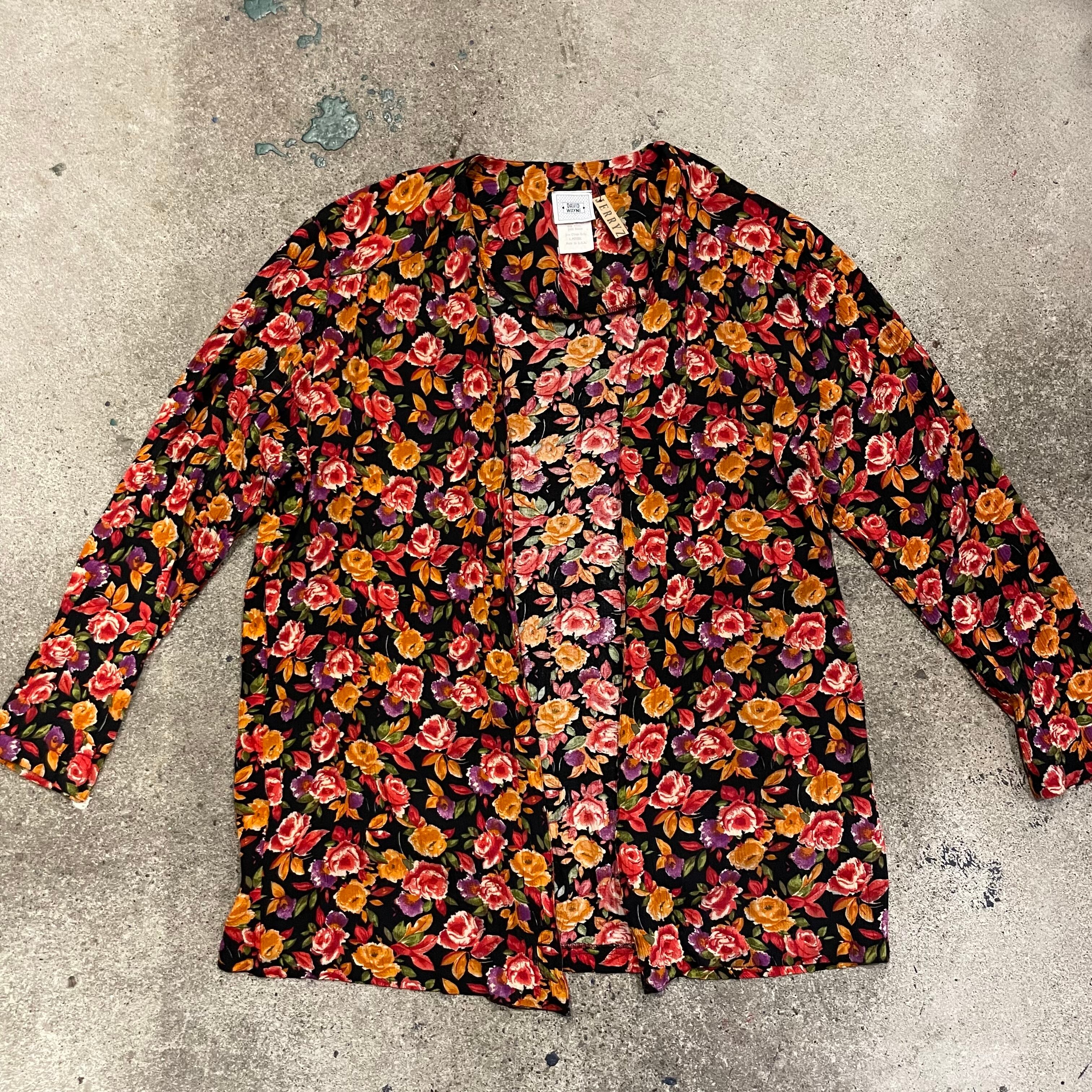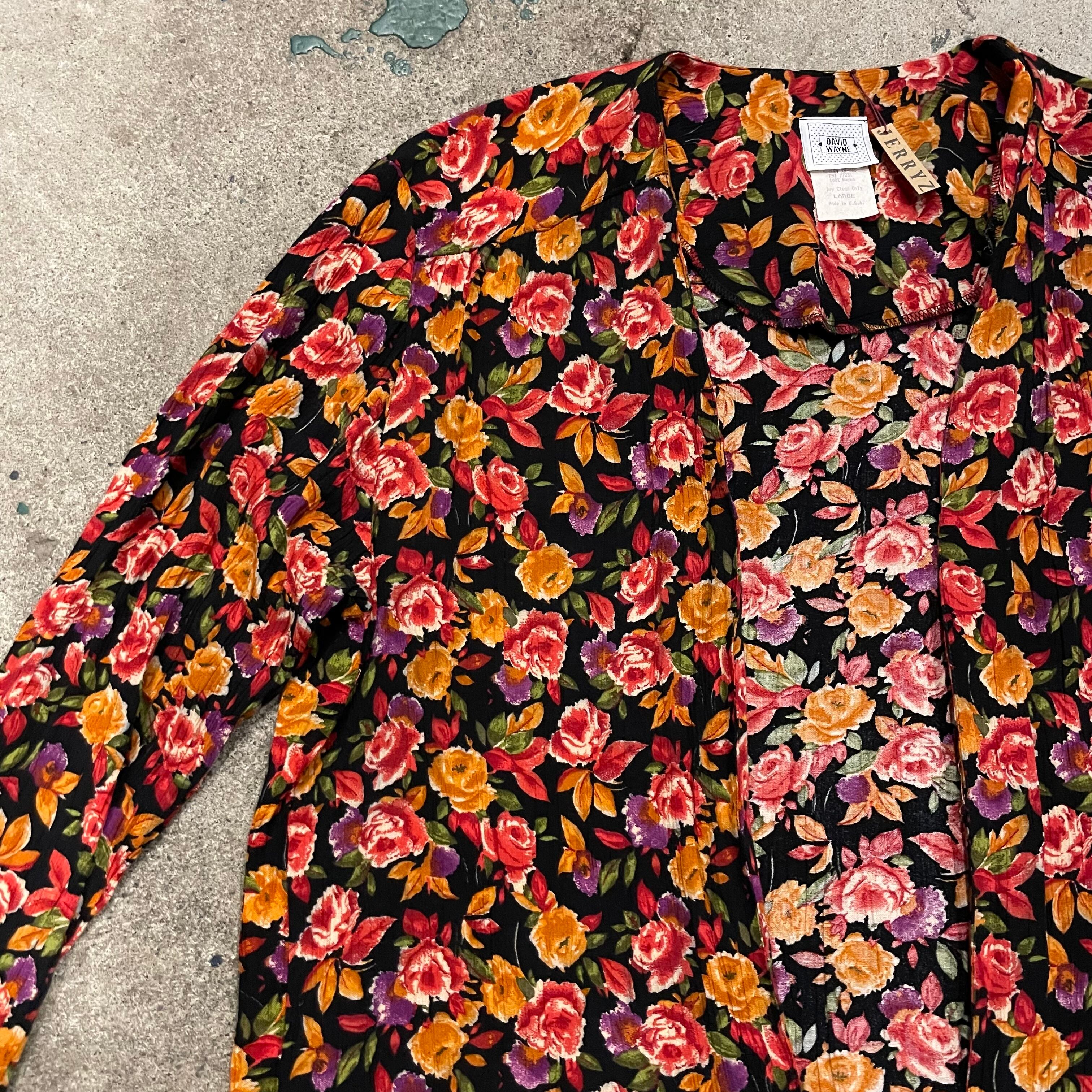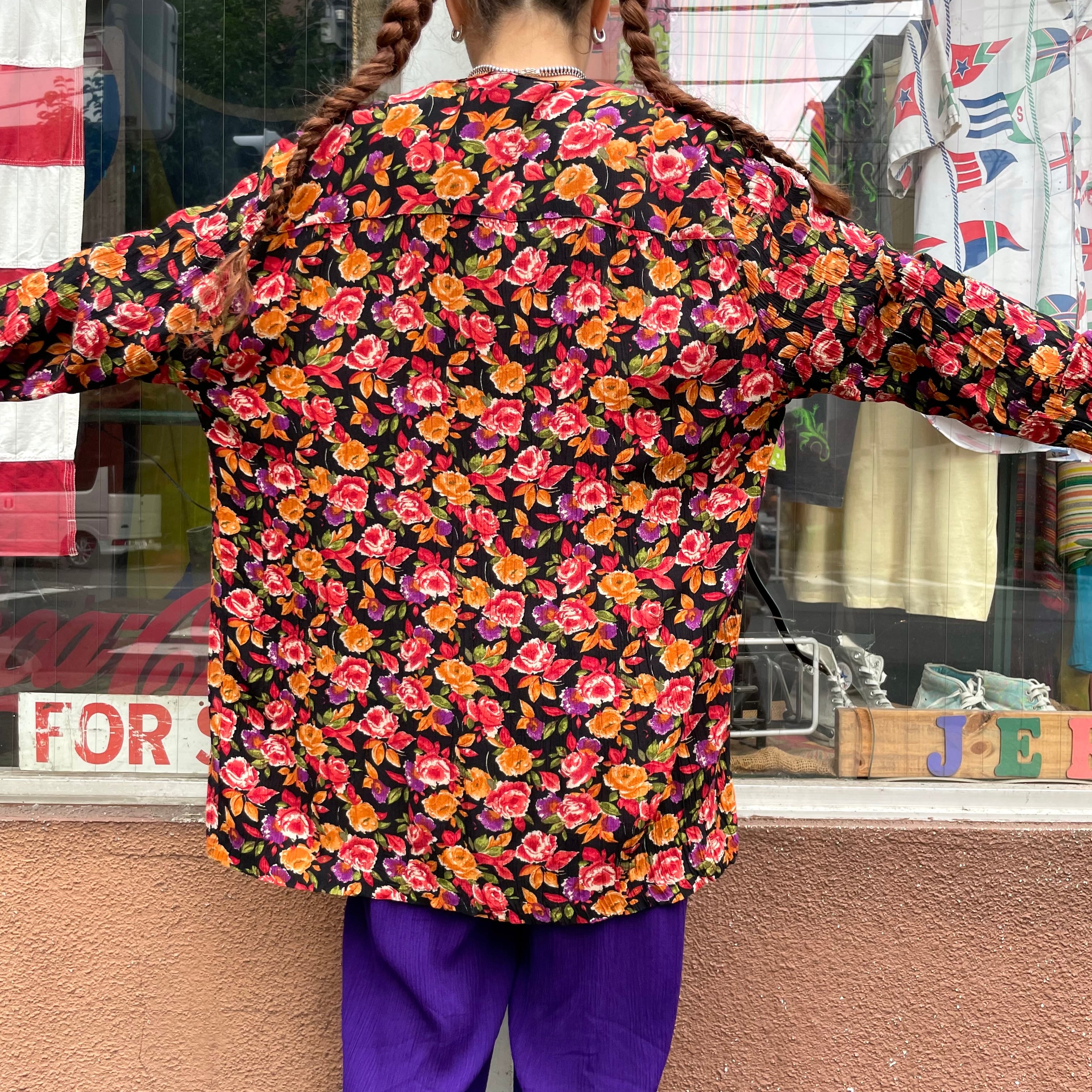 黒地に暖色系の花柄がかわいいレーヨン素材の羽織りです。