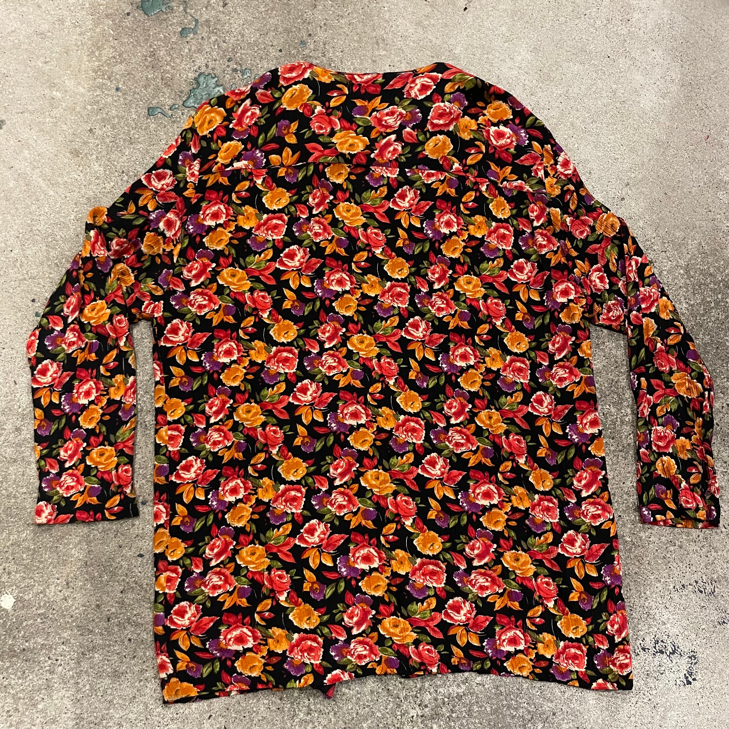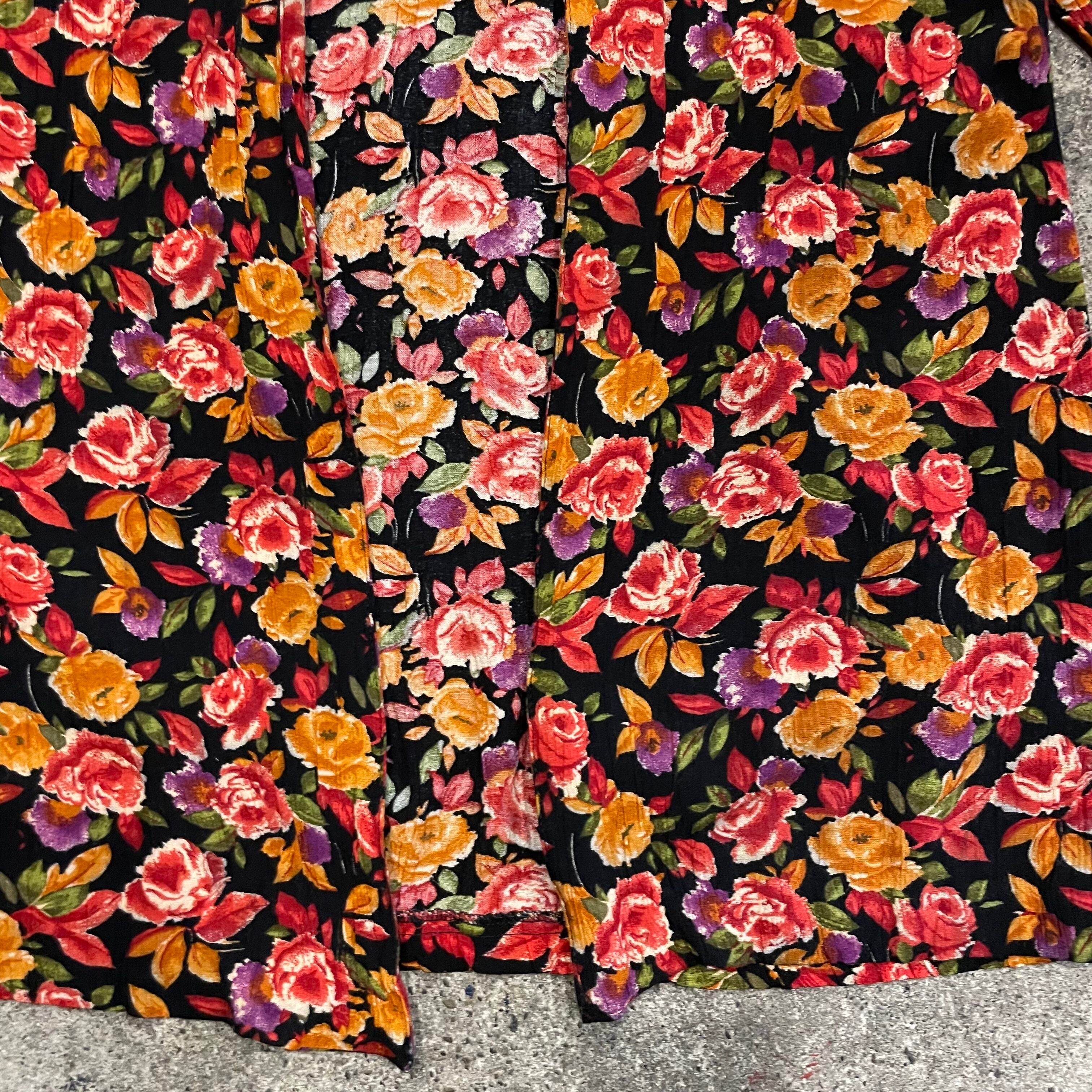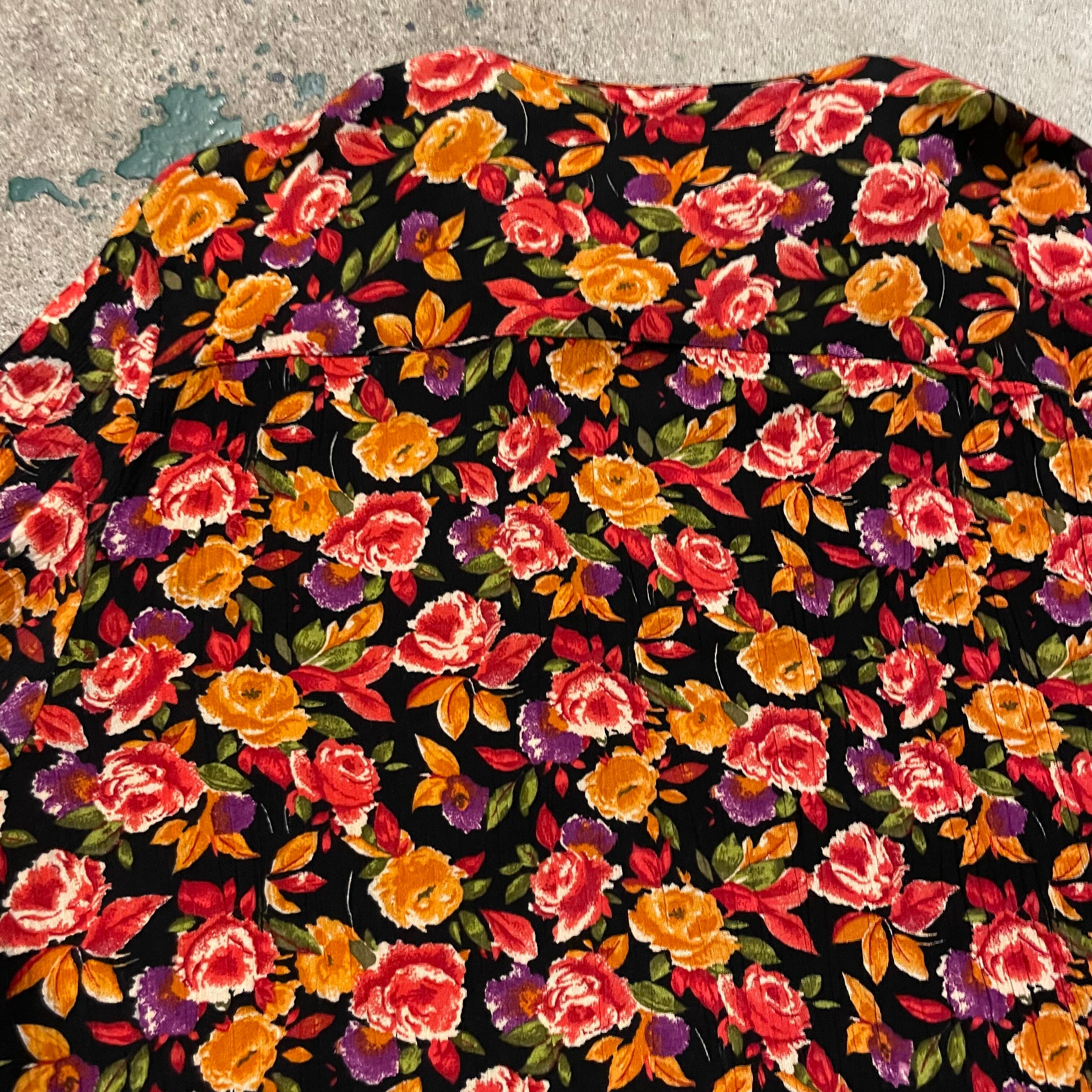 黒地に暖色系の花柄がかわいいレーヨン素材の羽織りです。