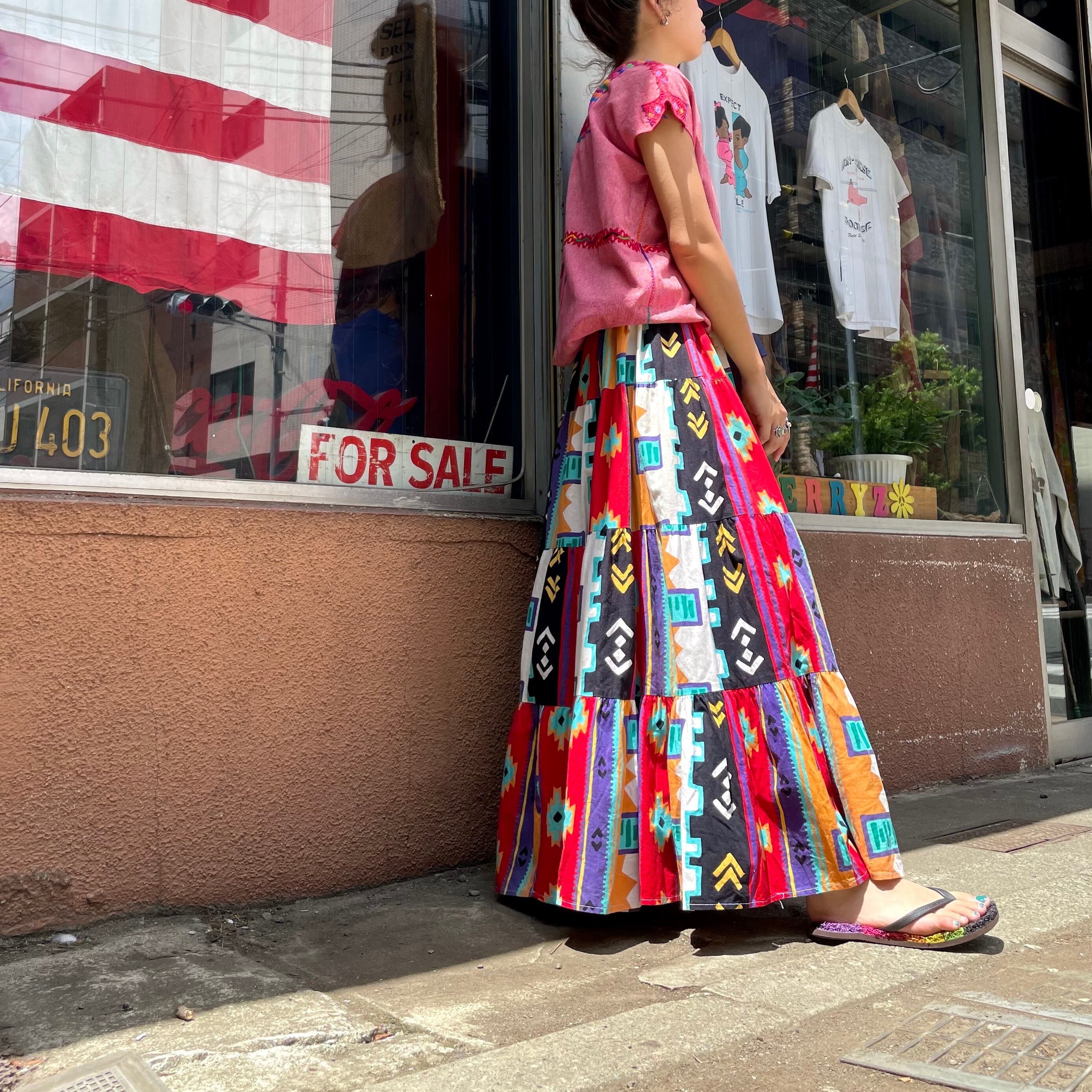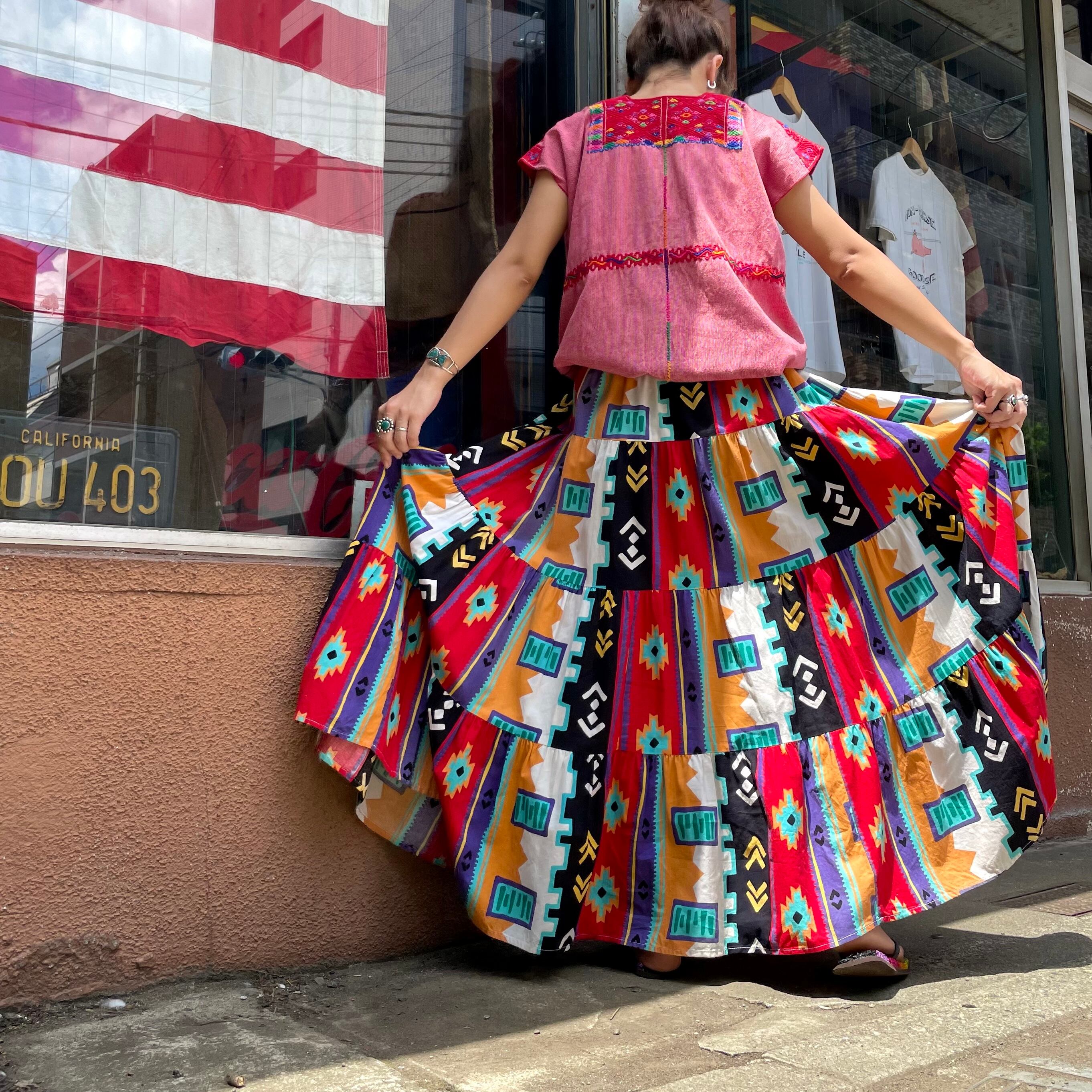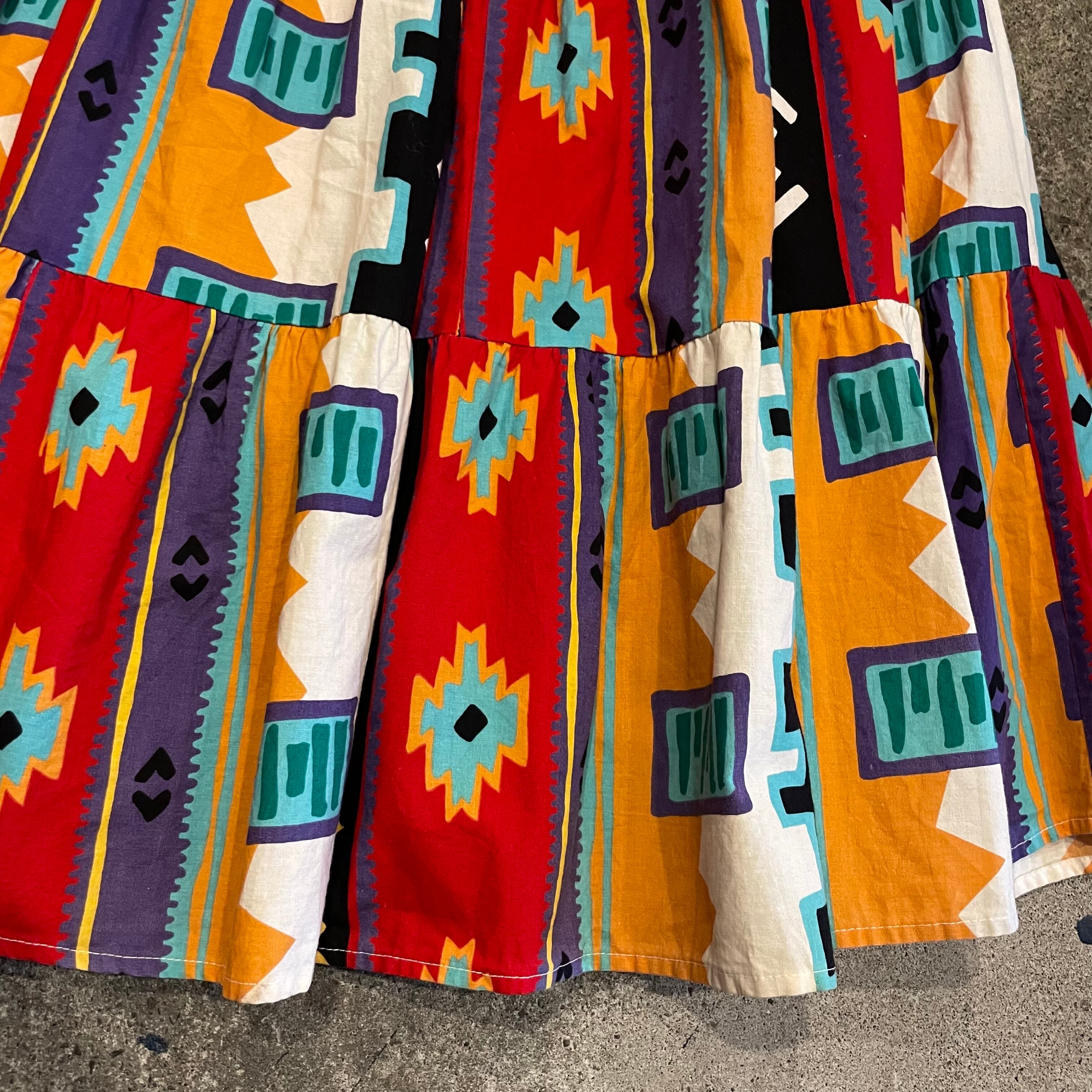 ポップなネイティブ柄がかわいいですし、しっかりめのコットン素材でこのボリューム感はAラインシルエットがきれいに出てかっこいいです。