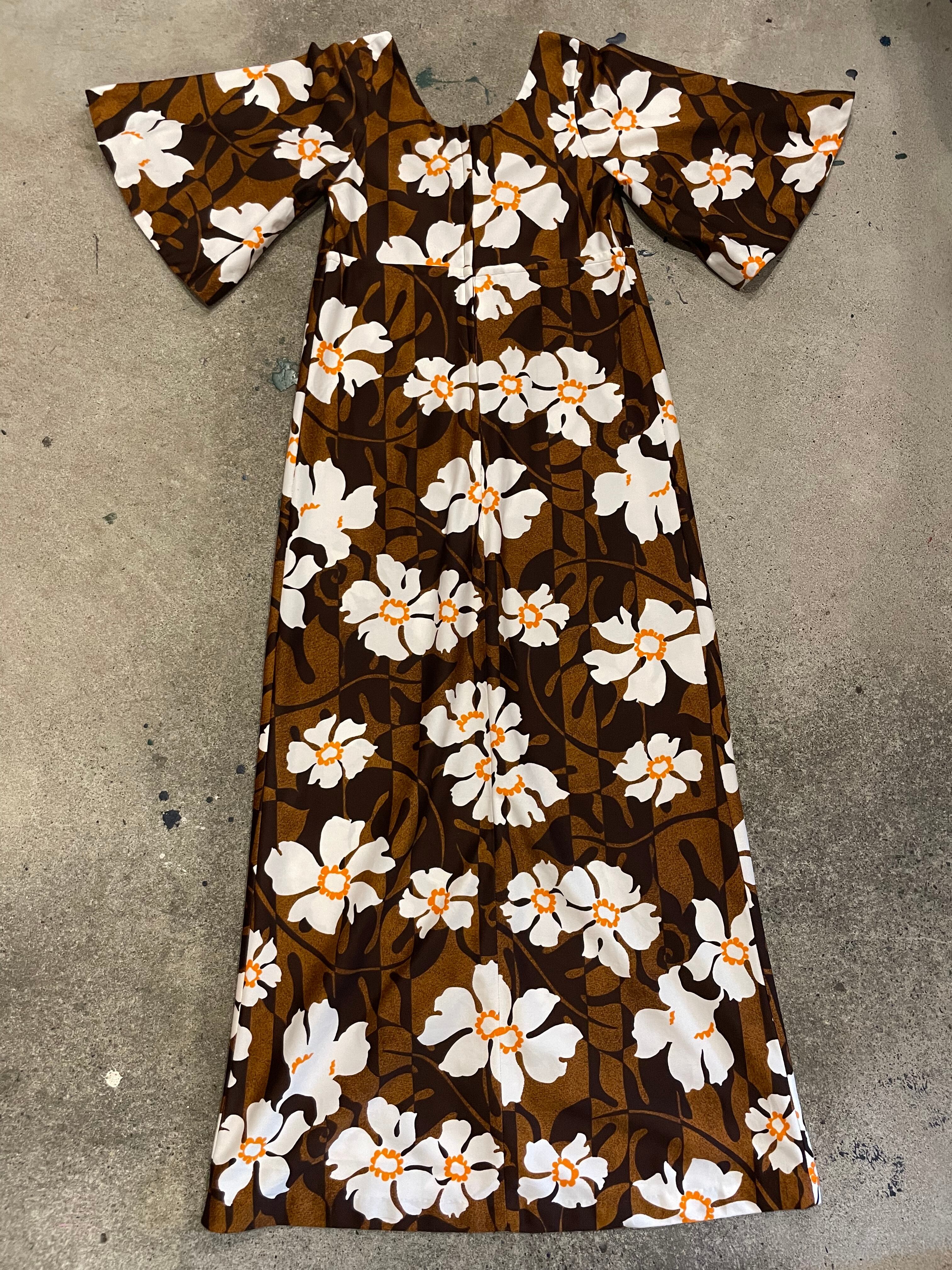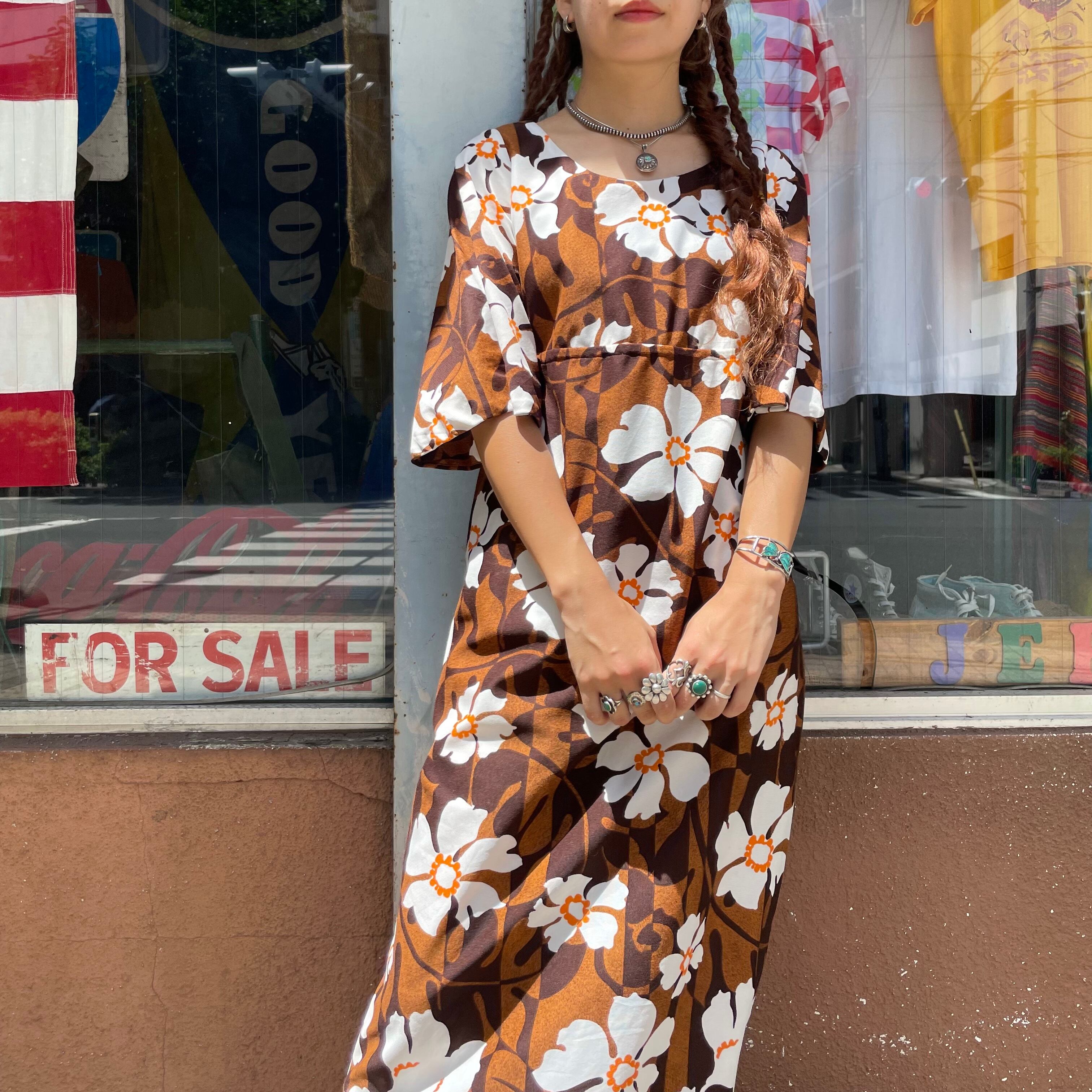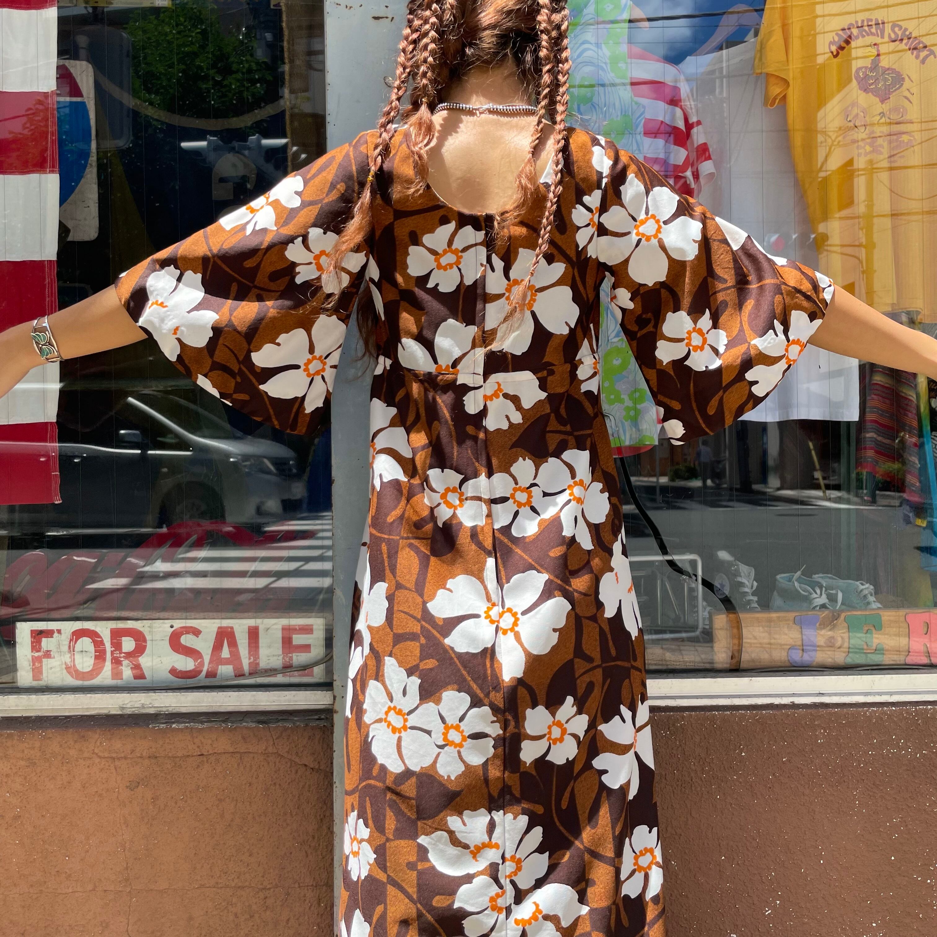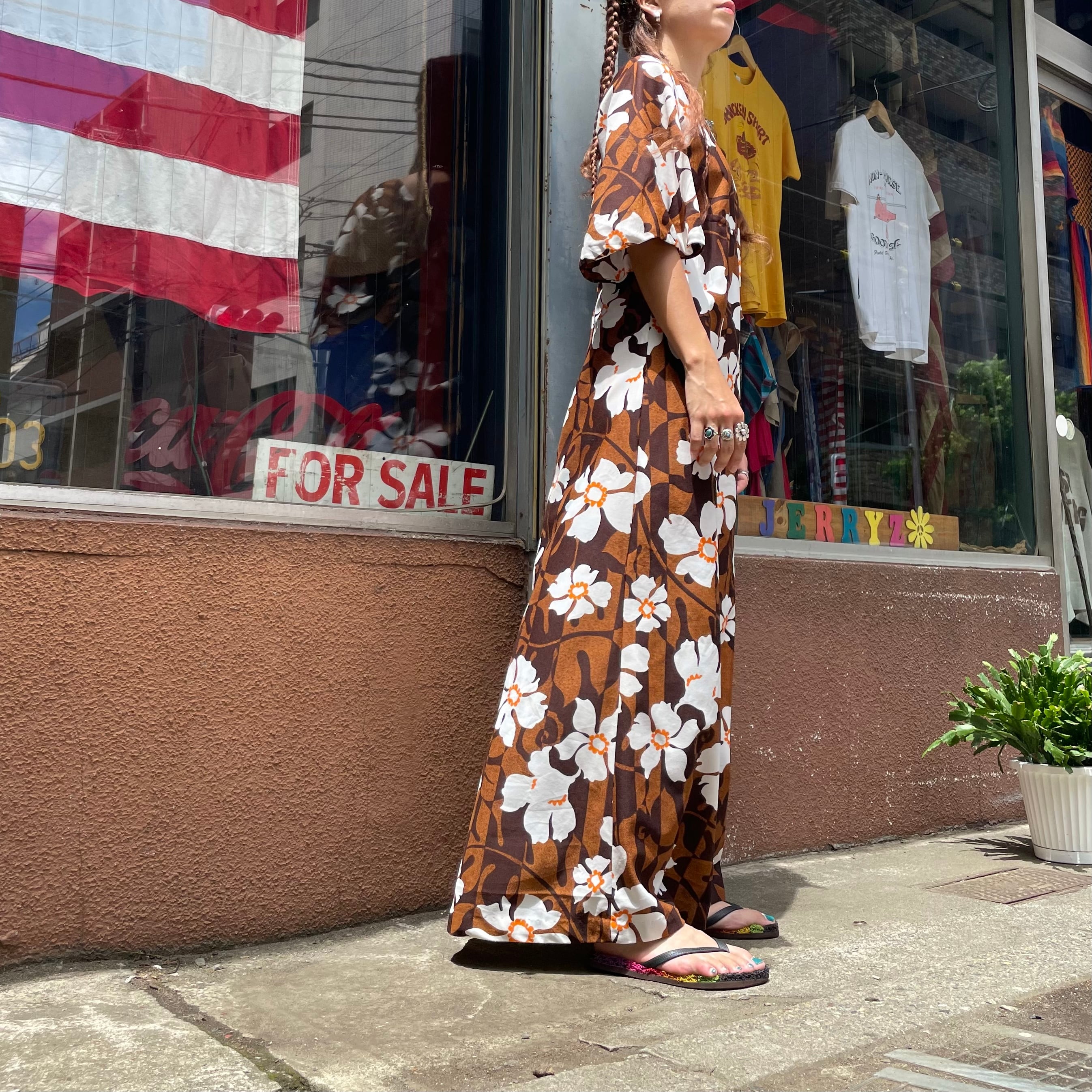 茶色ベースで大人っぽい雰囲気の70年代のハワイアンドレスです。