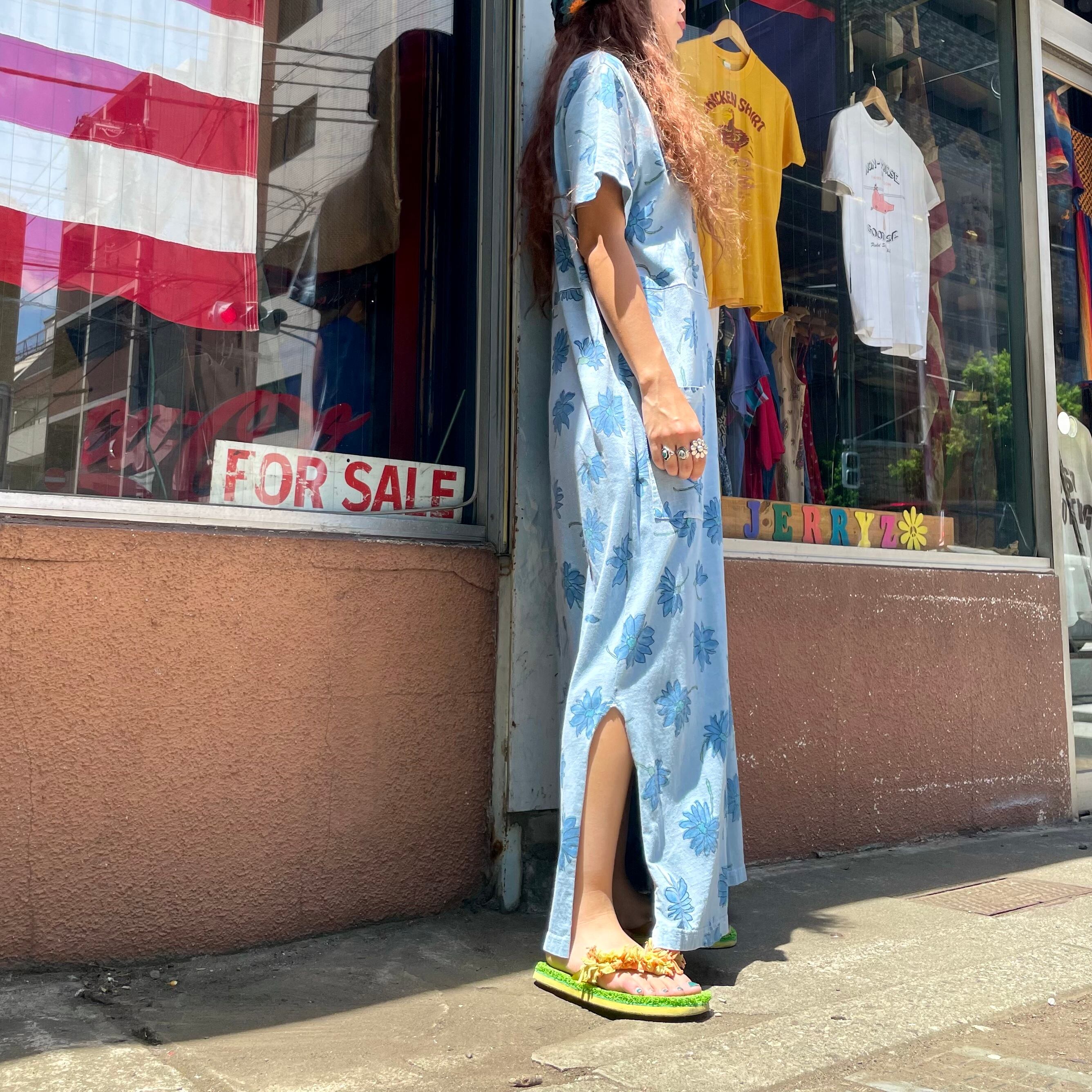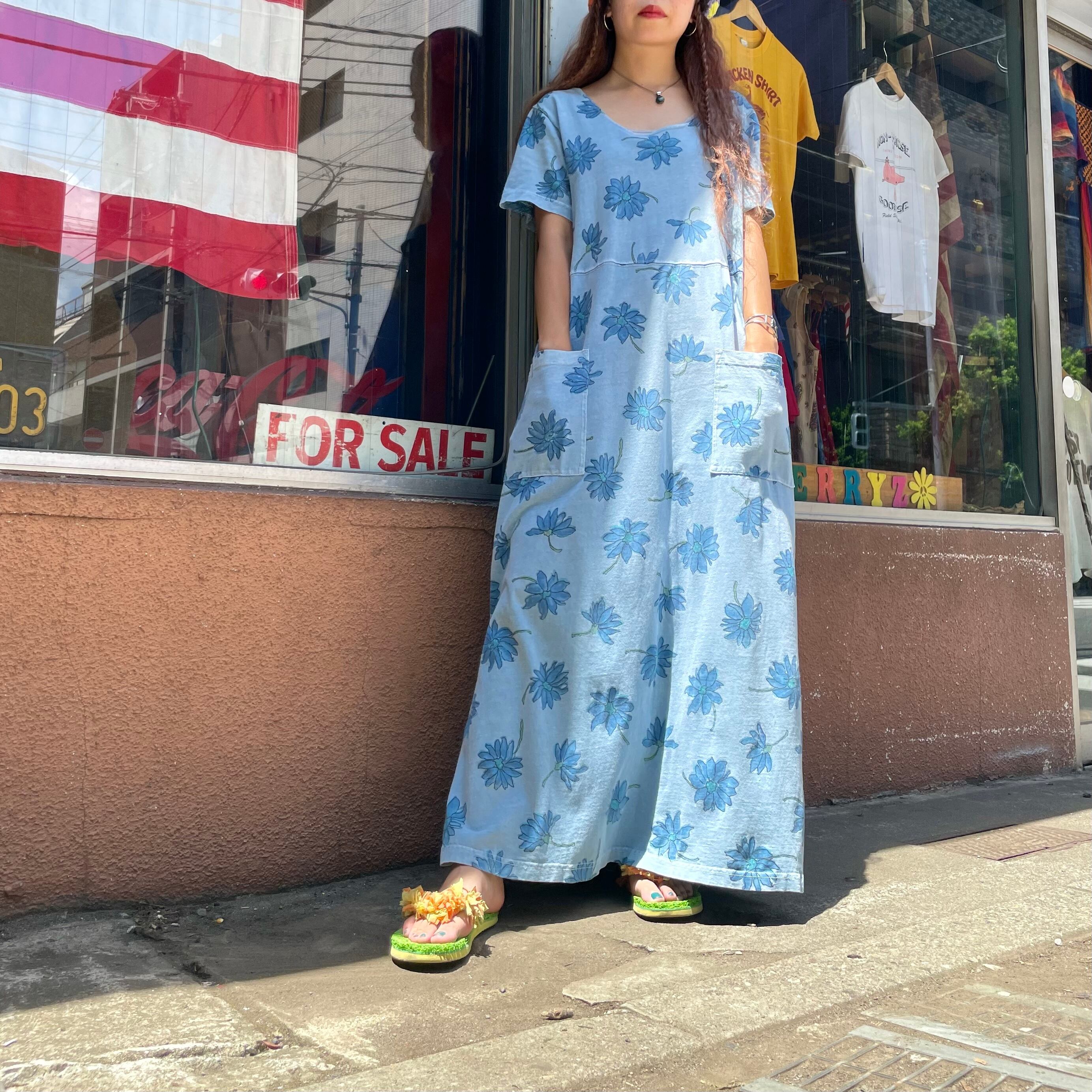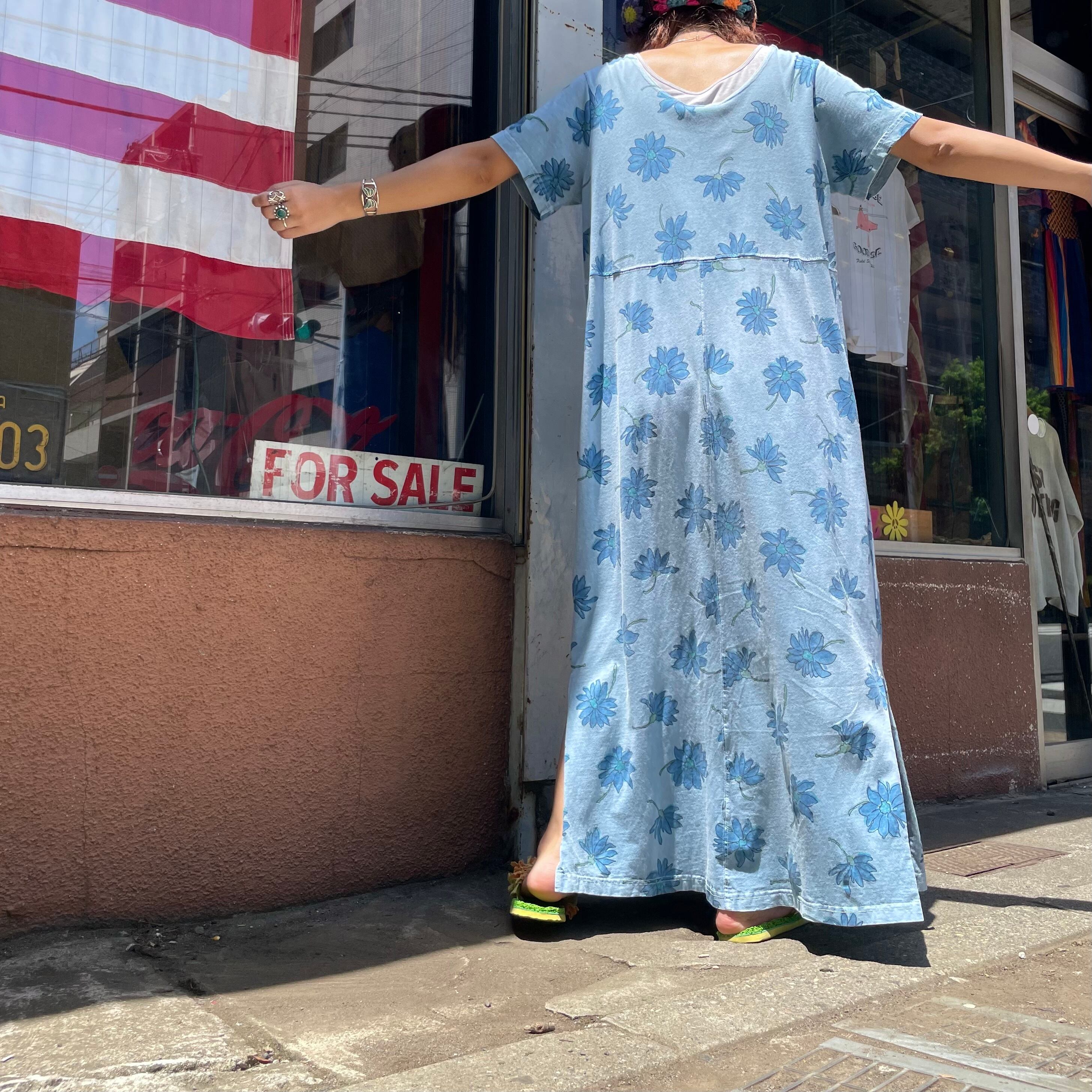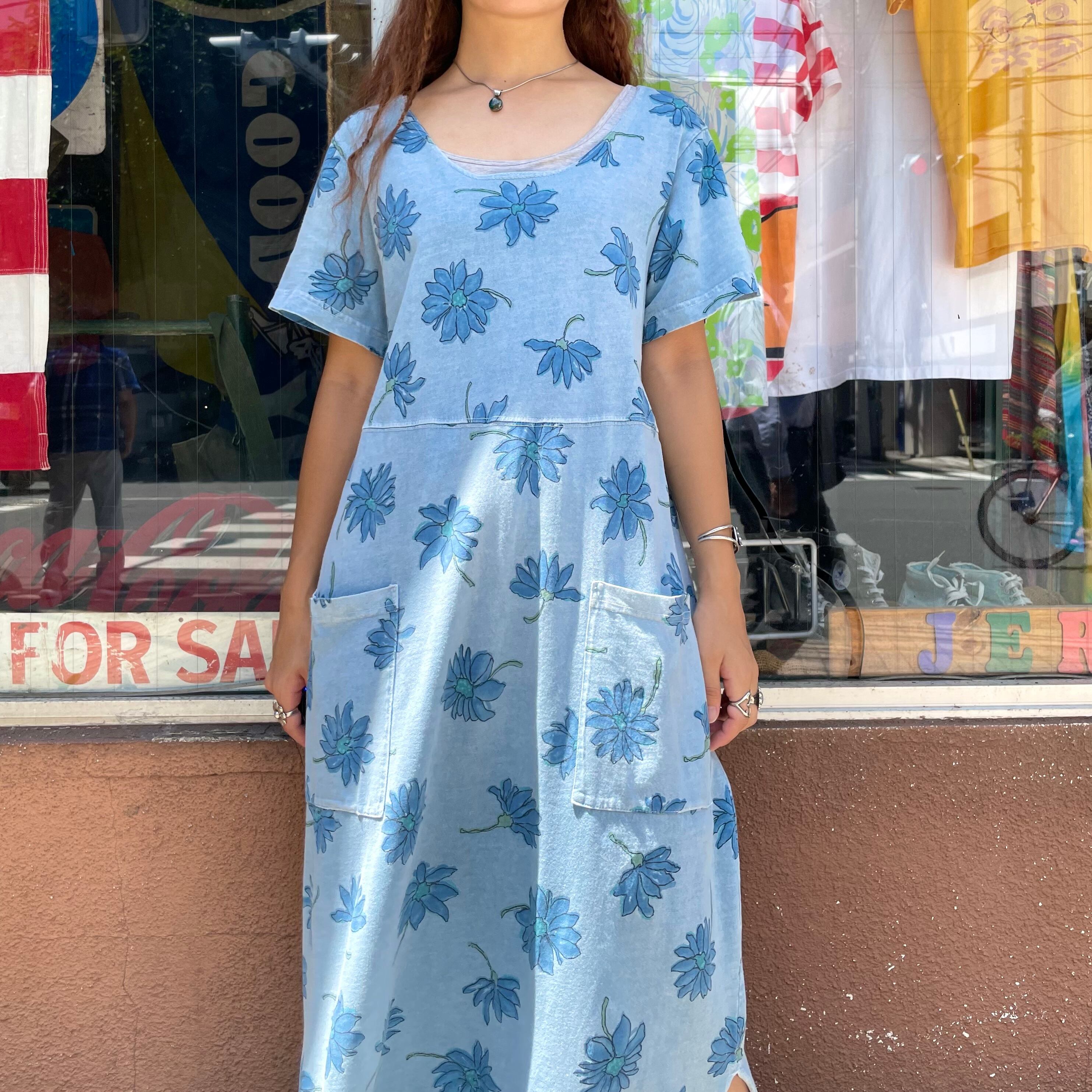 青地にに青い花の模様がかわいいワンピースです。襟ぐりが広めに開いていて、身幅もゆったり、コットンの優しい肌触りと、スリットもポケットもあり、どこまでも楽ちんでかわいい一枚です。