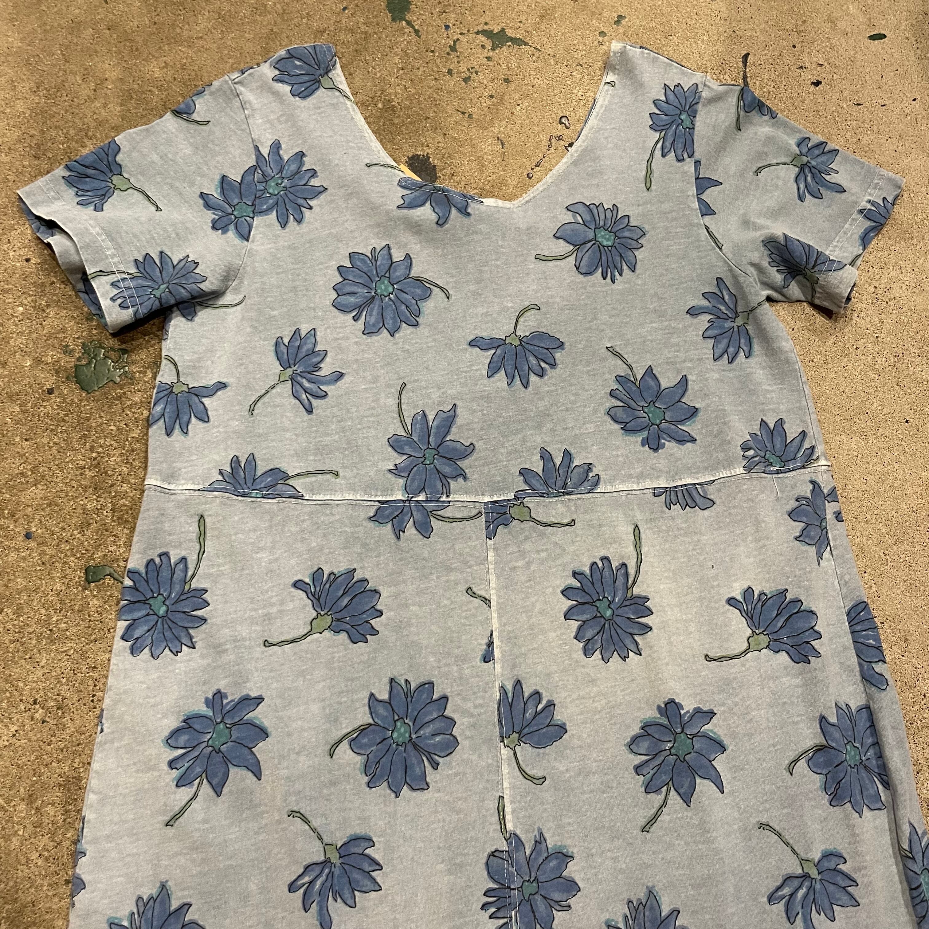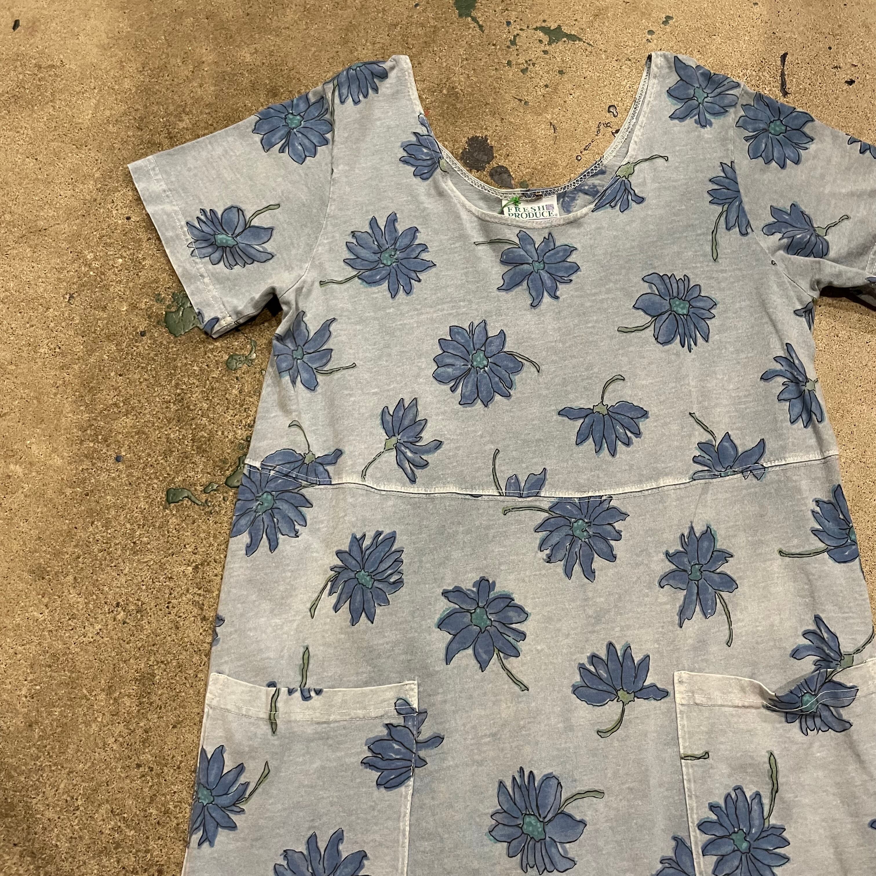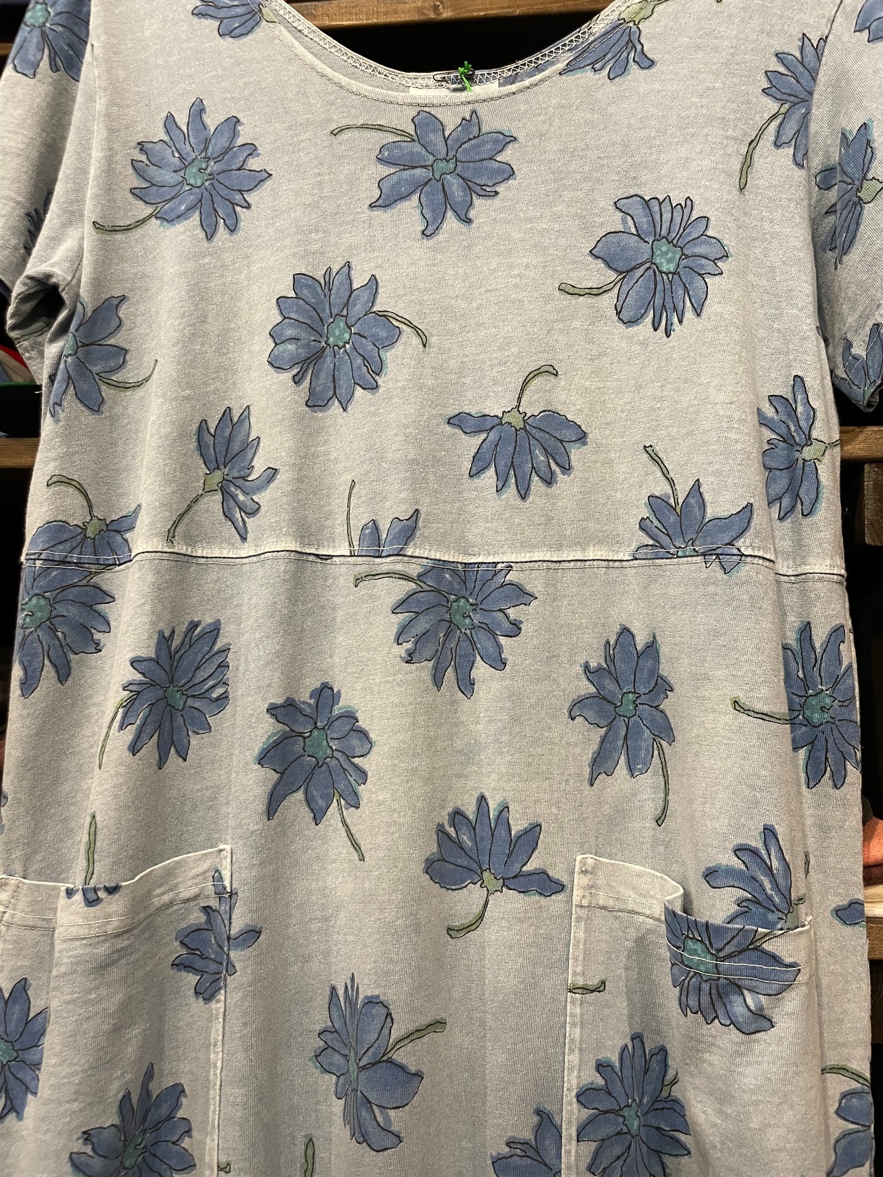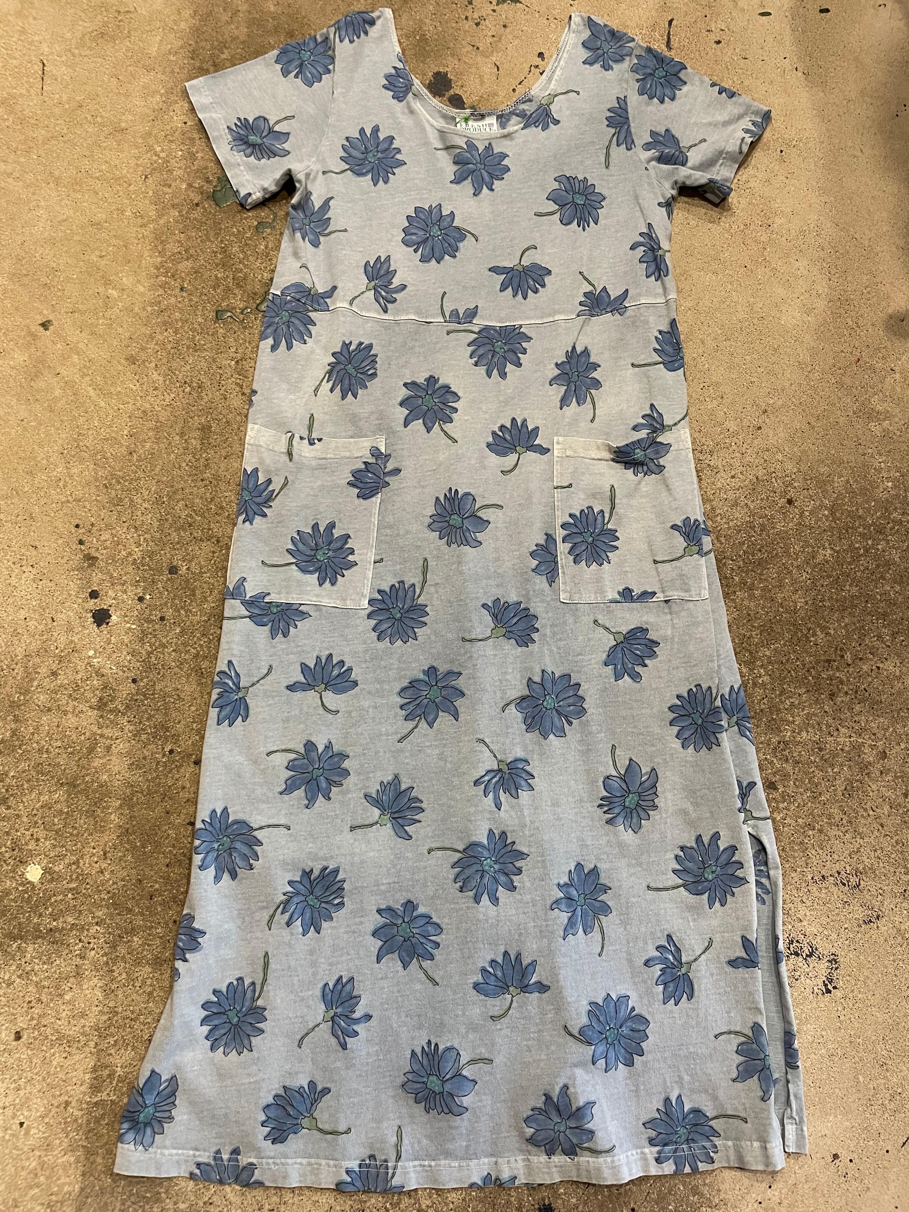 青地にに青い花の模様がかわいいワンピースです。襟ぐりが広めに開いていて、身幅もゆったり、コットンの優しい肌触りと、スリットもポケットもあり、どこまでも楽ちんでかわいい一枚です。